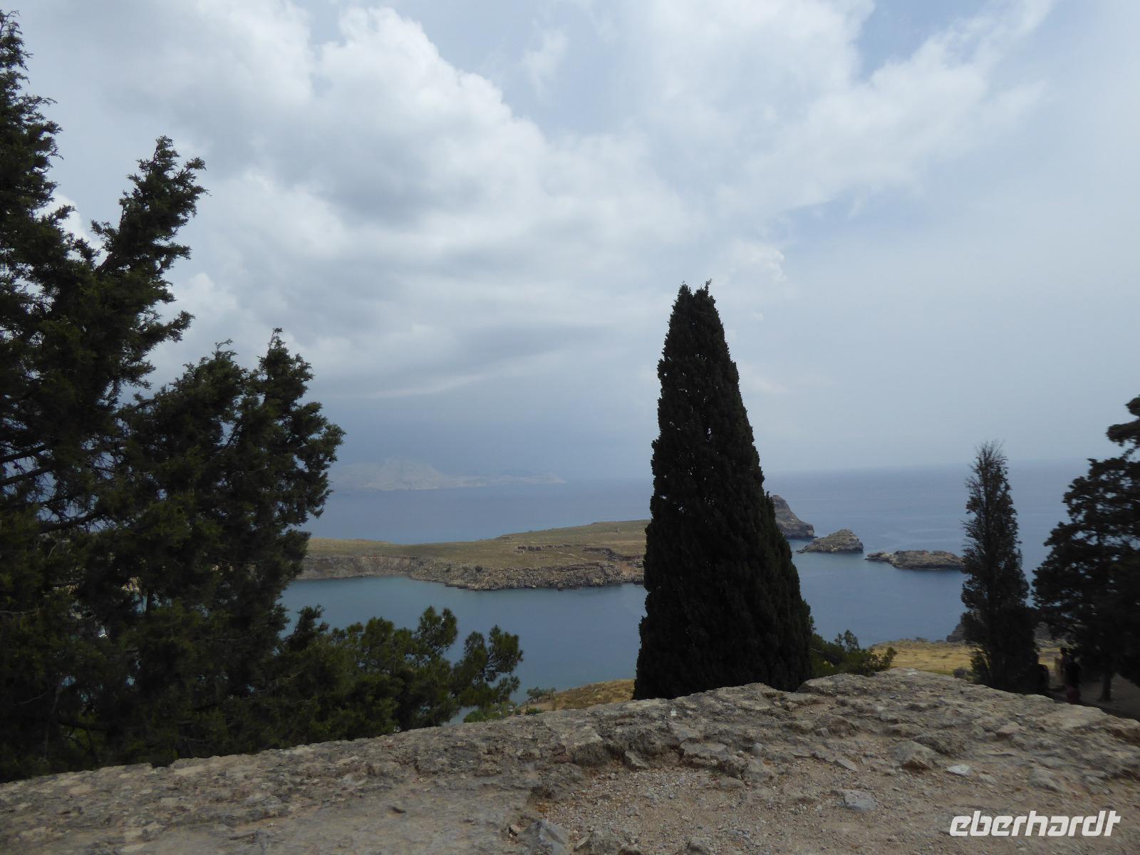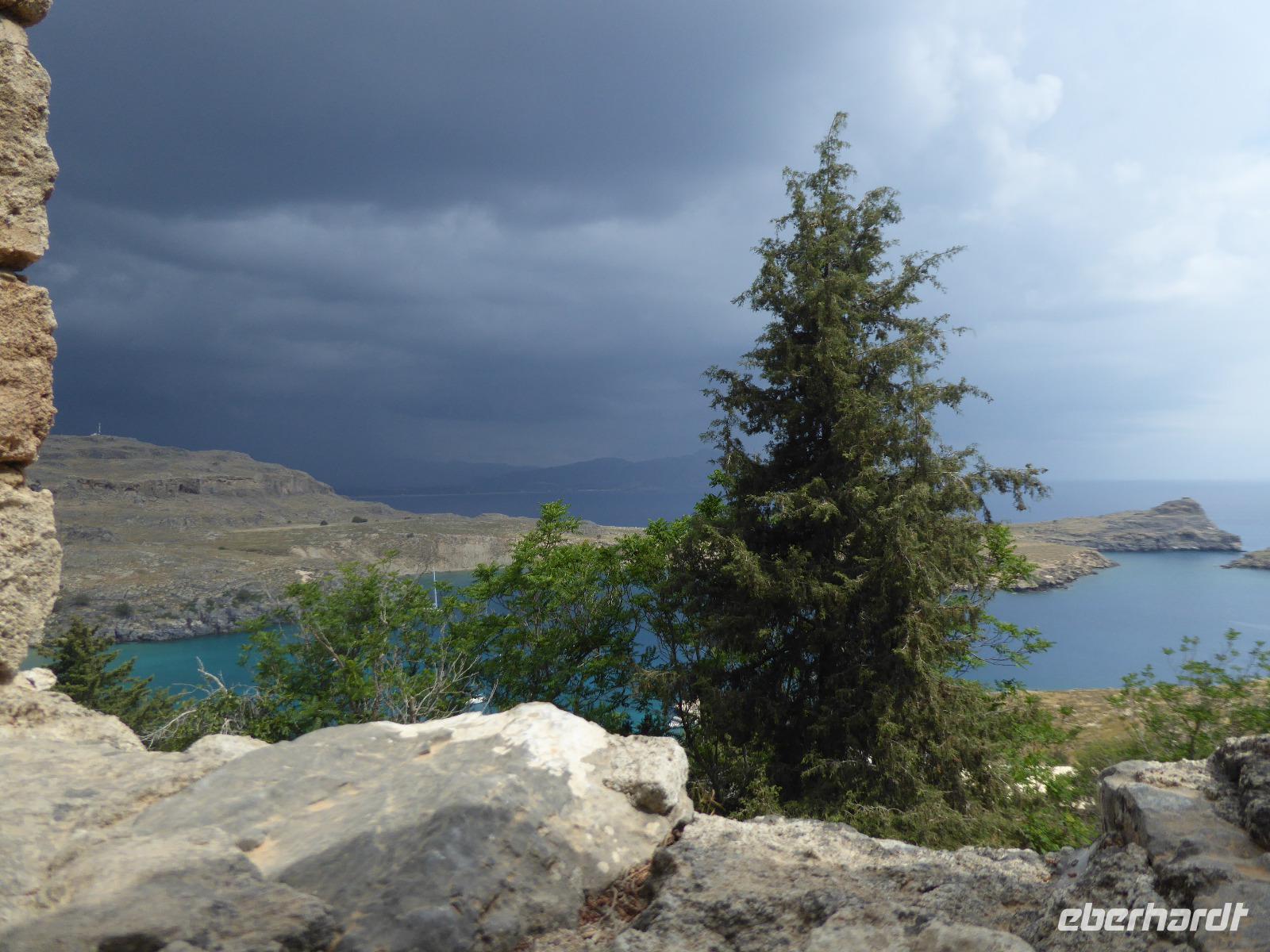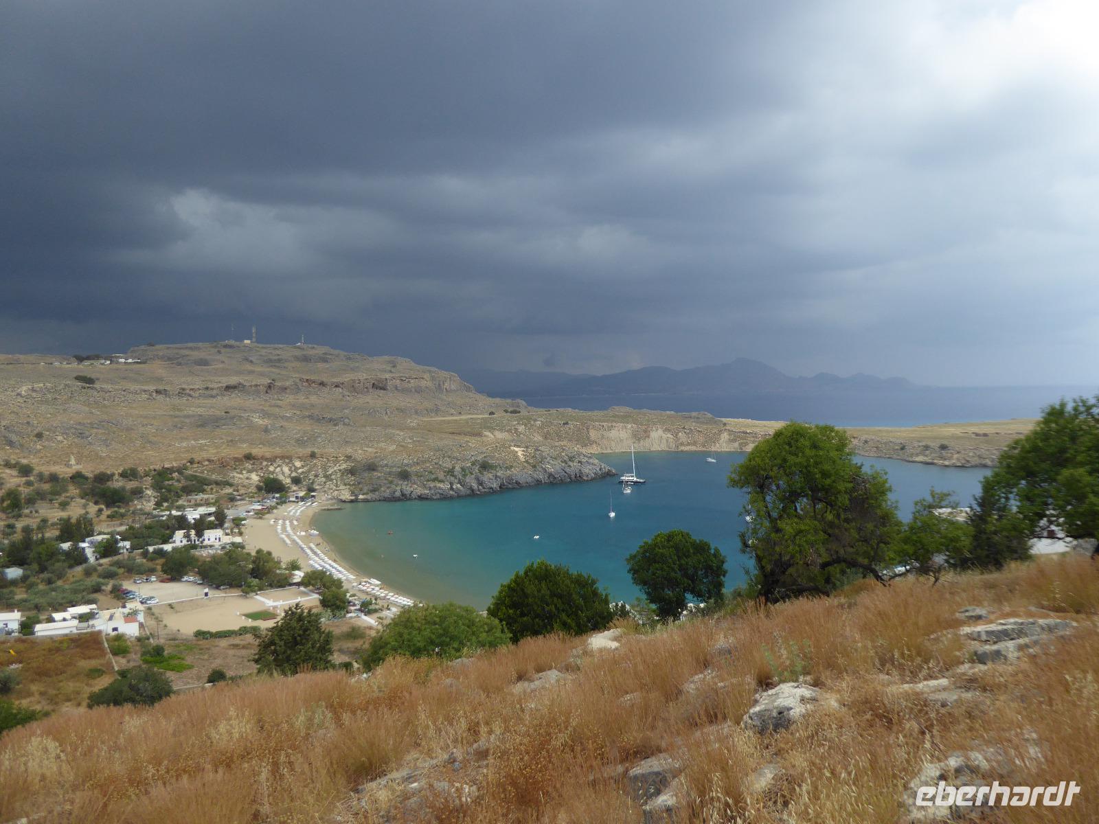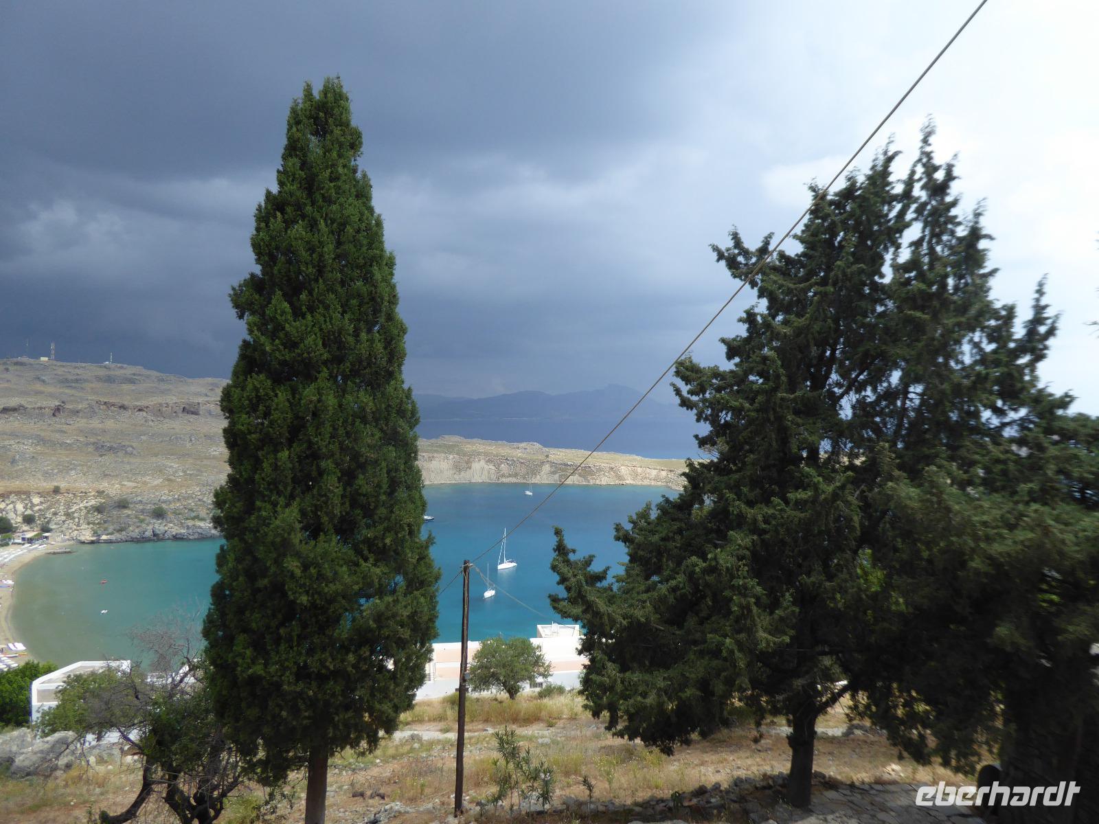 Wir starten wiederum um Neun. Immer an der Ostküste entlang geht es Richtung Süden. Lindos befindet sich in der trockensten und unfruchtbarsten Gegend der Insel. Dafür haben die Bewohner etwas anderes entdeckt, um ihren Lebensunterhalt zu bestreiten - den Tourismus. Mit Eseln können sich laufmüde Touris zur Akropolis bringen lassen, die Gassen sind voller Läden und Tavernen. Lange vor unserer Zeit war Lindos eine Seemacht, hier wurden Schiffe gebaut und Kolonien gegründet. Die Menschen, die dies fertig brachten waren die Dorer. Und dorische Säulen zierten auch den Tempel der Akropolis. Der Tempel ist zerstört, die schöne Aussicht geblieben. Heute gezeichnet von dunklen Wolken, aus denen Donner grollt und in denen Blitze zucken. Wir haben ausreichend Zeit, die schöne Stadt zu erobern. Mittags geht es weiter. Wir besuchen eine Keramik-Werkstatt und die Thermen von Kalithea. Später fahren wir nochmal nach Rhodos Stadt und besichtigen den Großmeisterpalast von innen, das hatten wir gestern irgendwie verpasst. Zum leckeren Abendbuffet sind wir zurück im Hotel. Ein schöner Tag geht zu Ende.