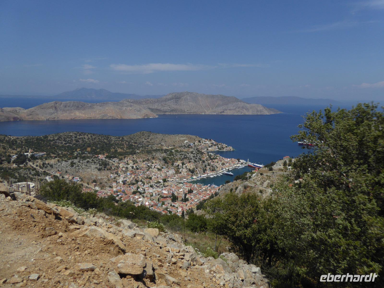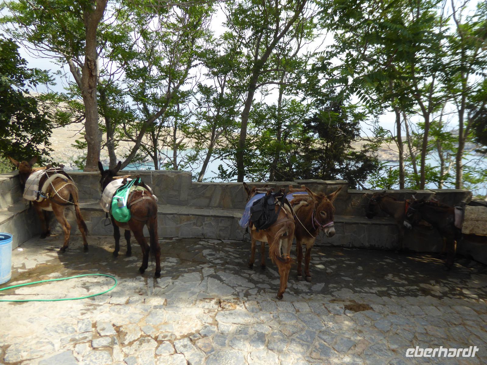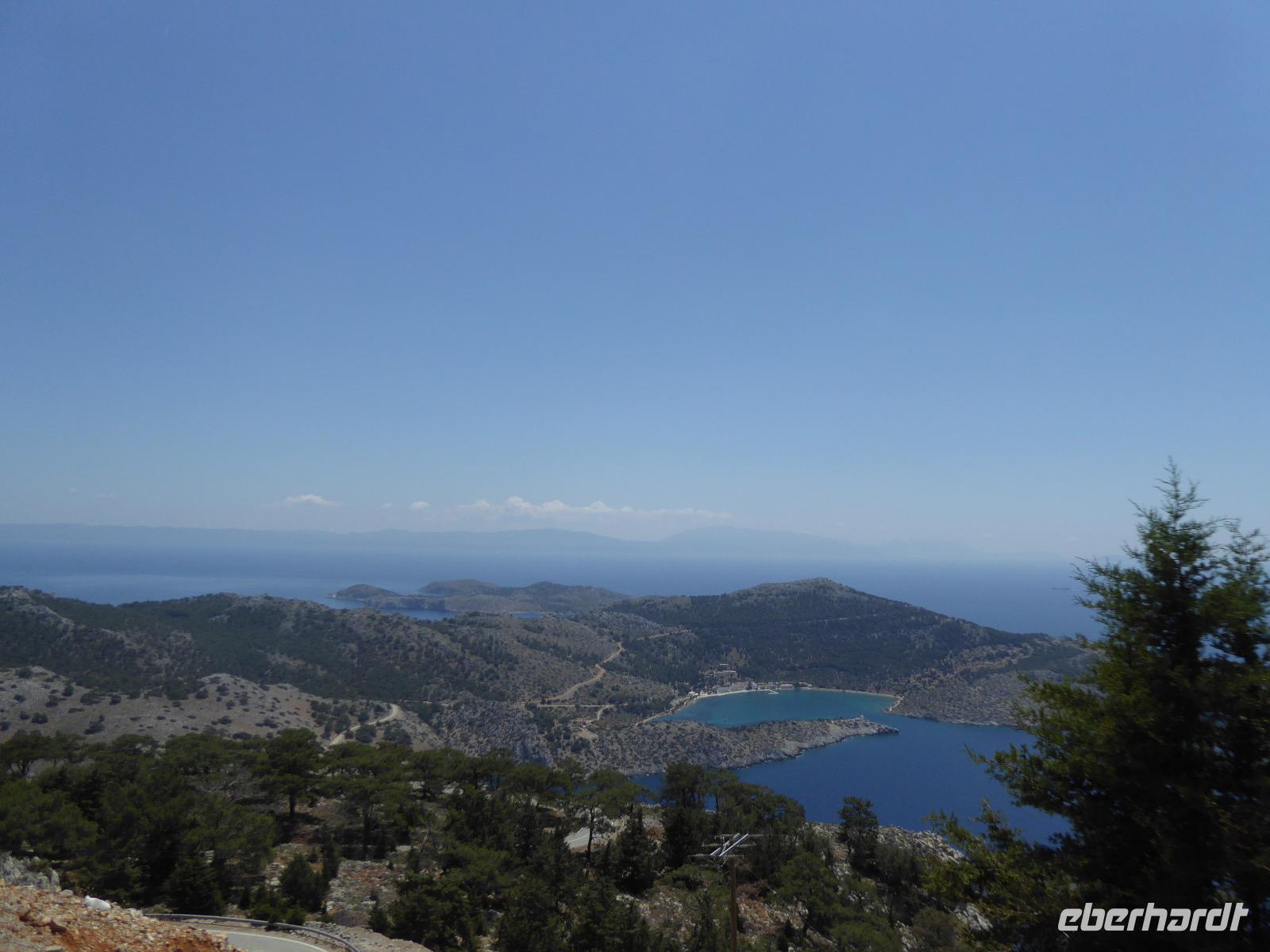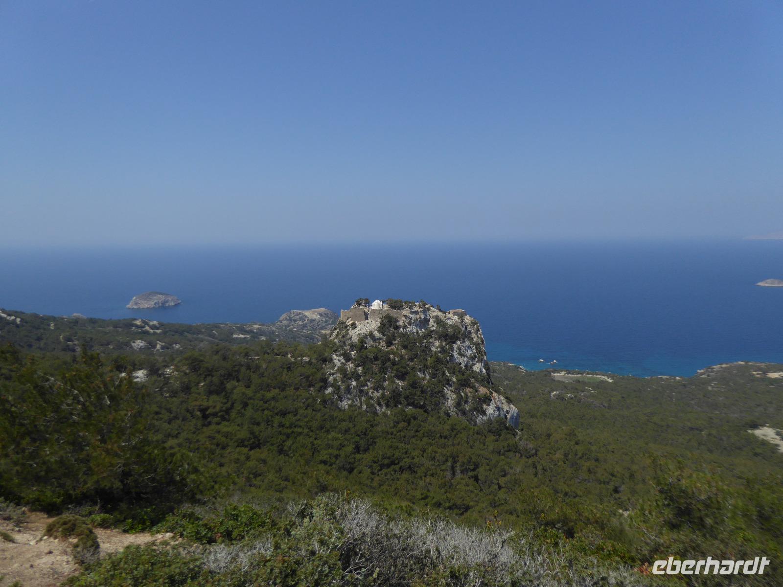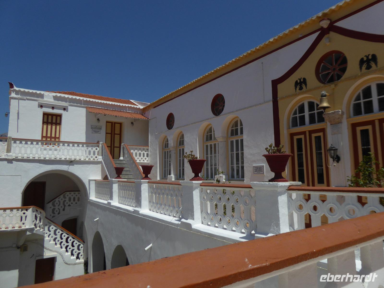 Nach einer guten halben Stunde erreichen wir das Kloster Panormitis, den Ort der Wunder. Heute sind wir hier ganz allein, im Gegensatz zu anderen Tagen, an denen sich hier tausende Besucher durch die schmalen Gänge schlängeln. Das Kloster wurde an einer Stelle errichtet, an der vor langer Zeit eine Frau eine Ikone des Heiligen Michael fand. Sie nahm diese mit in ihr Haus, doch wie durch ein Wunder kehrte die Ikone an die Fundstelle zurück. Nachdem sich diese Prozedur ein paar Mal wiederholt hatte, beschlossen die Menschen, für die Ikone eine Kapelle zu bauen. Schnell sprach es sich herum, dass der Heilige Michael hier Wunder vollbringt. So wurde die Kapelle zu klein und ein Kloster errichtet. Noch heute widmet man sich hier wohltätigen Zwecken, zum Beispiel werden Studenten kostenlos Zimmer zur Verfügung gestellt.