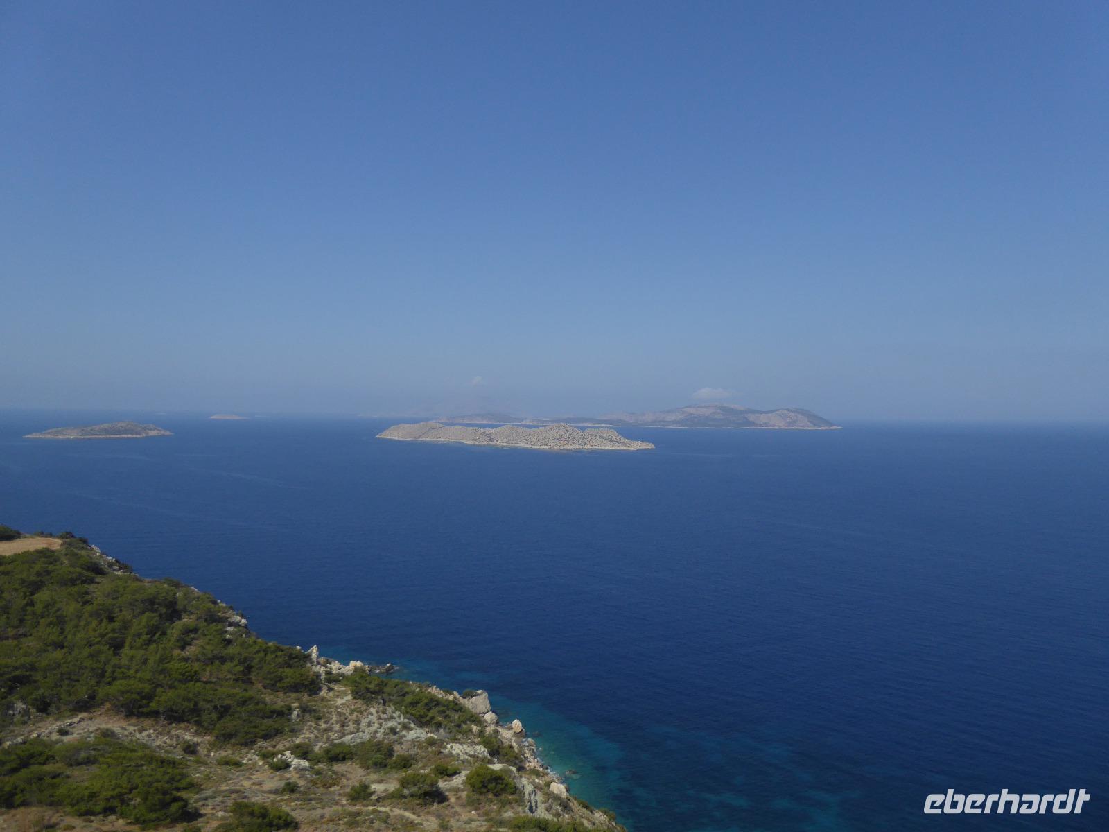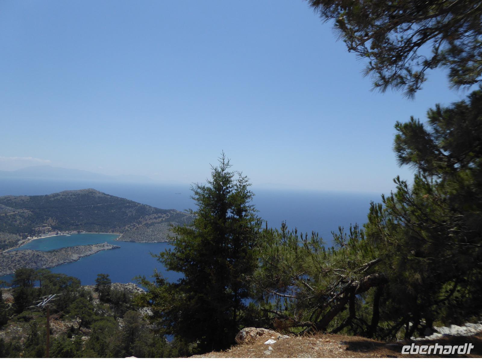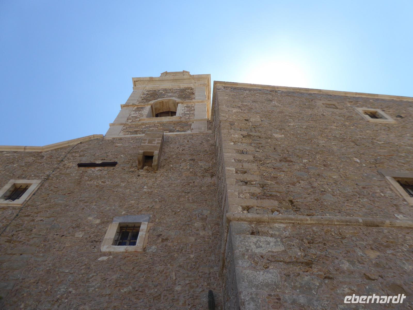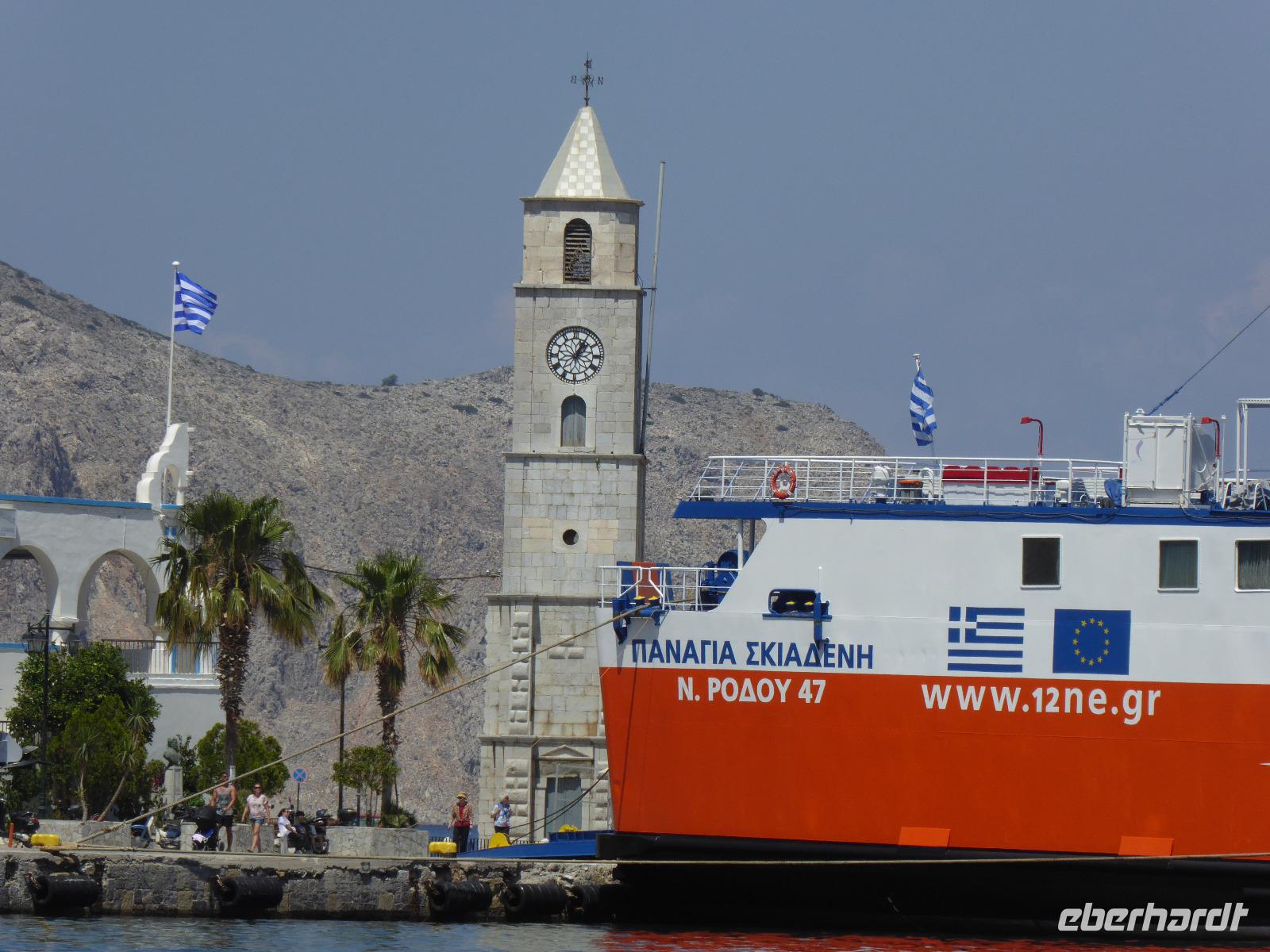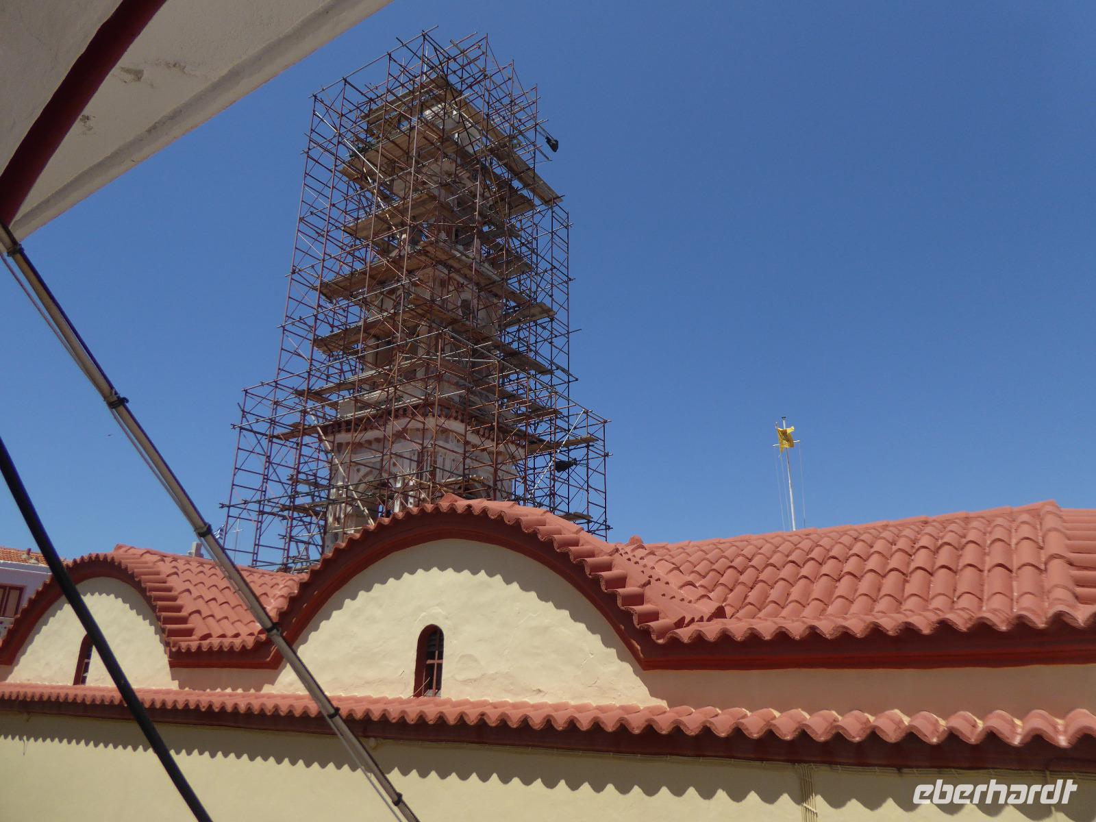 Nach einer guten halben Stunde erreichen wir das Kloster Panormitis, den Ort der Wunder. Heute sind wir hier ganz allein, im Gegensatz zu anderen Tagen, an denen sich hier tausende Besucher durch die schmalen Gänge schlängeln. Das Kloster wurde an einer Stelle errichtet, an der vor langer Zeit eine Frau eine Ikone des Heiligen Michael fand. Sie nahm diese mit in ihr Haus, doch wie durch ein Wunder kehrte die Ikone an die Fundstelle zurück. Nachdem sich diese Prozedur ein paar Mal wiederholt hatte, beschlossen die Menschen, für die Ikone eine Kapelle zu bauen. Schnell sprach es sich herum, dass der Heilige Michael hier Wunder vollbringt. So wurde die Kapelle zu klein und ein Kloster errichtet. Noch heute widmet man sich hier wohltätigen Zwecken, zum Beispiel werden Studenten kostenlos Zimmer zur Verfügung gestellt.