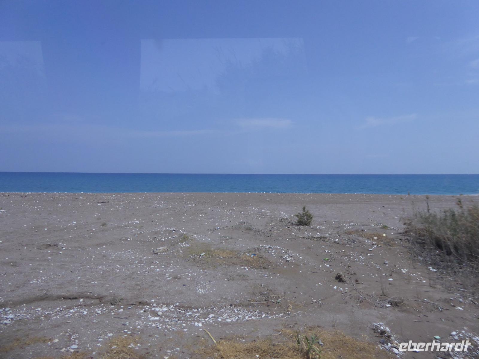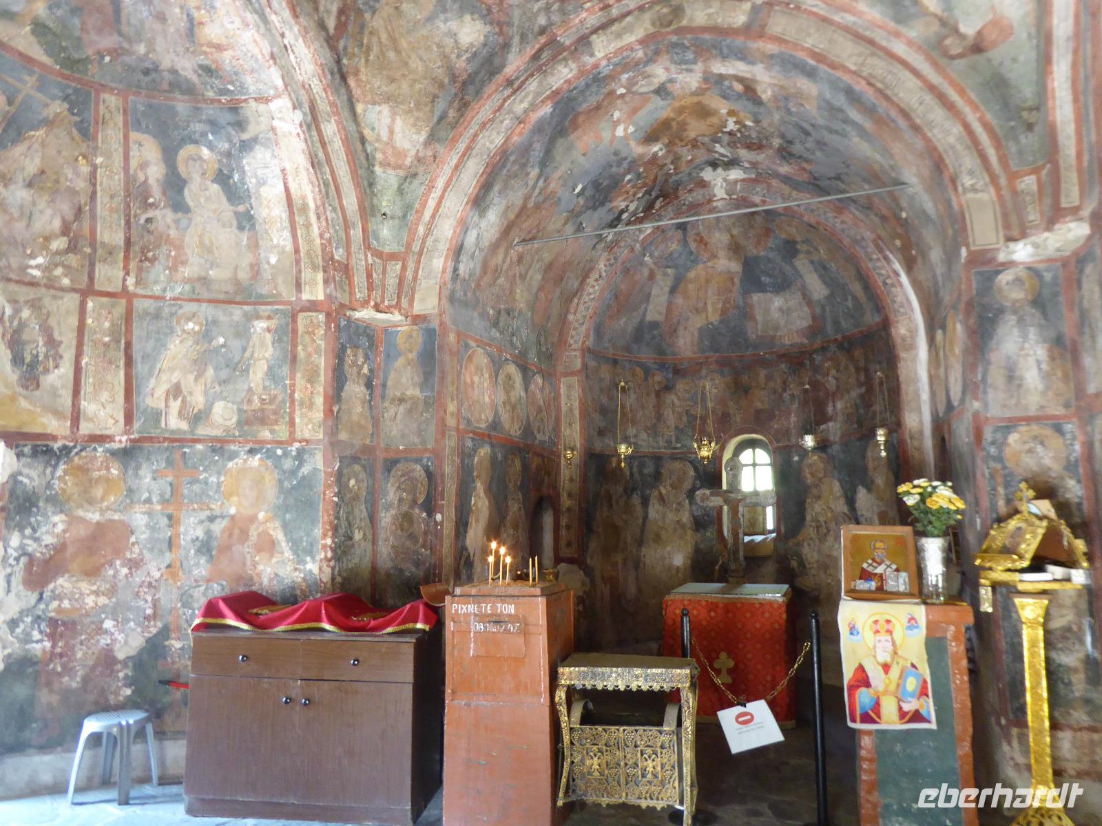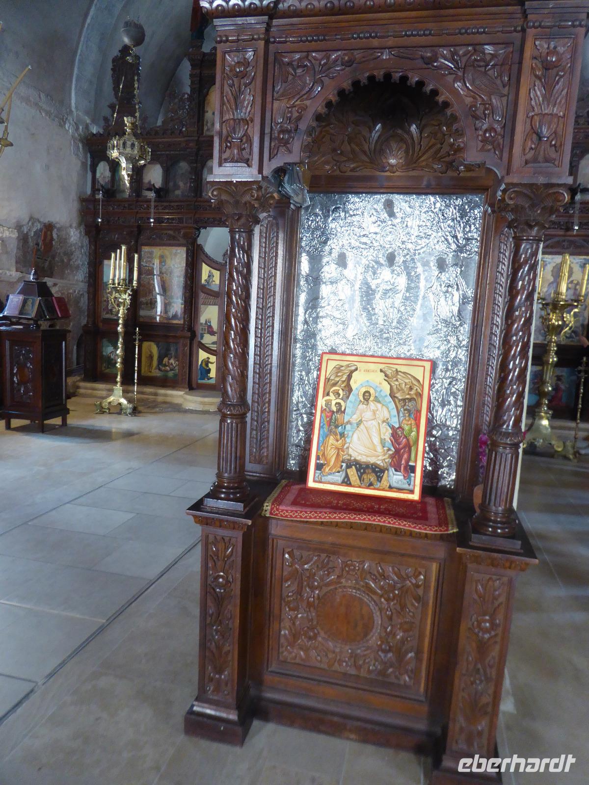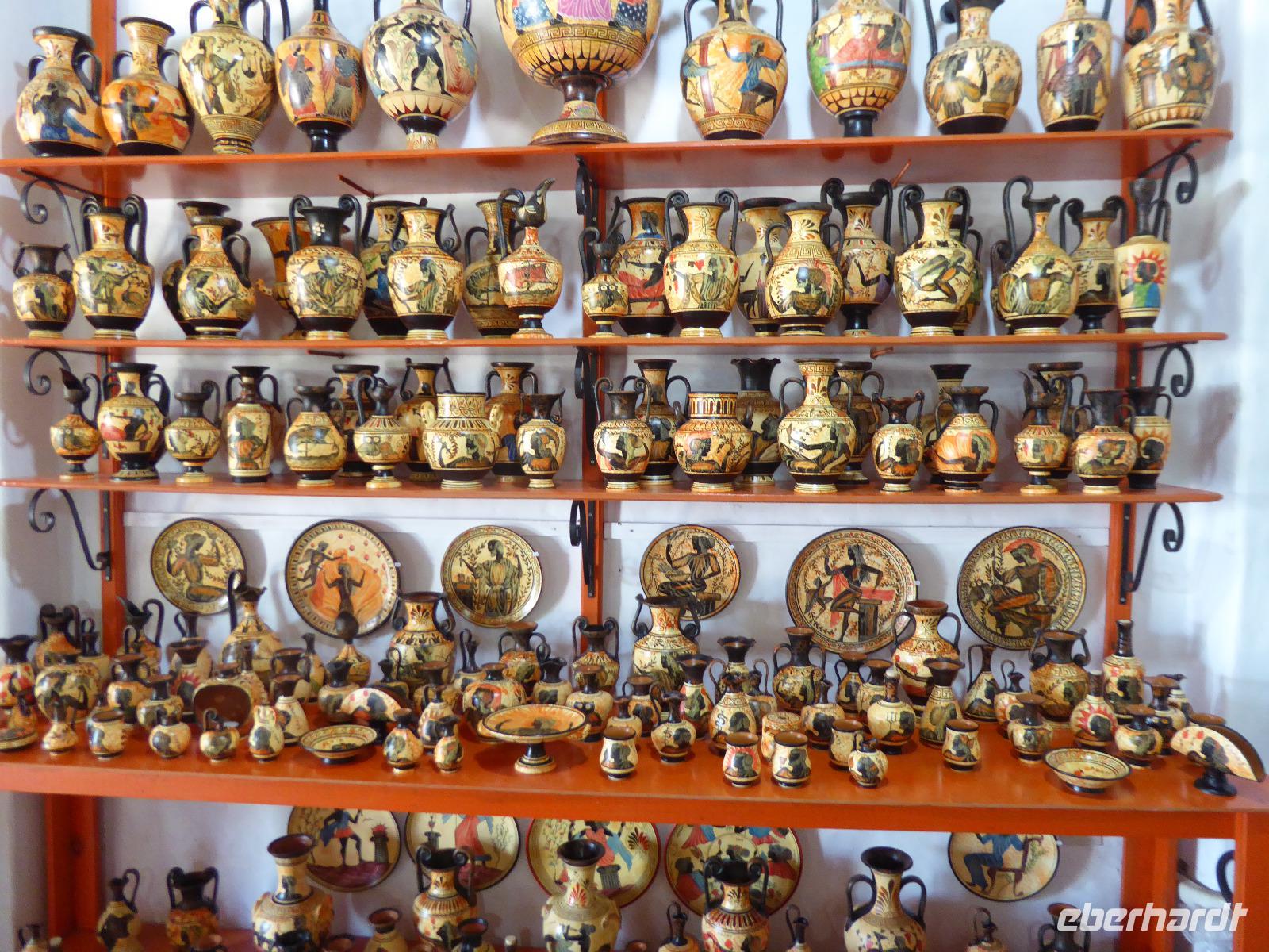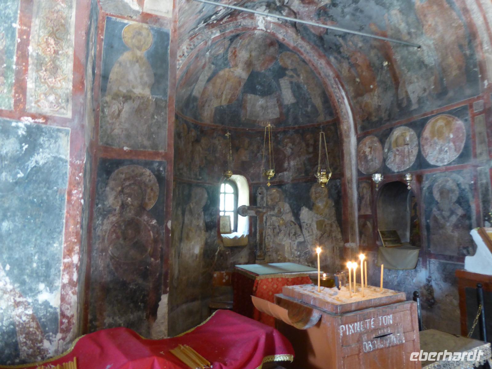Den ersten Fotostopp legen wir bei Gournia ein. Hierbei handelt es sich um eine der am vollständigsten freigelegten Siedlungskomplexe der minoischen Epoche. Die Ausgrabungen fanden zu Beginn des 20. Jahrhunderts statt. Details sind für uns nicht wirklich zu erkennen, dafür sind wir zu weit weg. Im schönen Urlauberort Sitia unternehmen wir einen kleinen Spaziergang bevor wir zum Kloster Toplou fahren. Das Kloster wurde in seiner Geschichte mehrmals zerstört, aber immer wieder aufgebaut. Eine Windmühle im Garten zeugt davon, dass die Mönche einst Selbstversorger waren. Im Innern des Klosters befindet sich eine bewunderswert schöne Ikone, auf der in Miniaturbildern die religiösen Gdeschichten dargestellt sind.