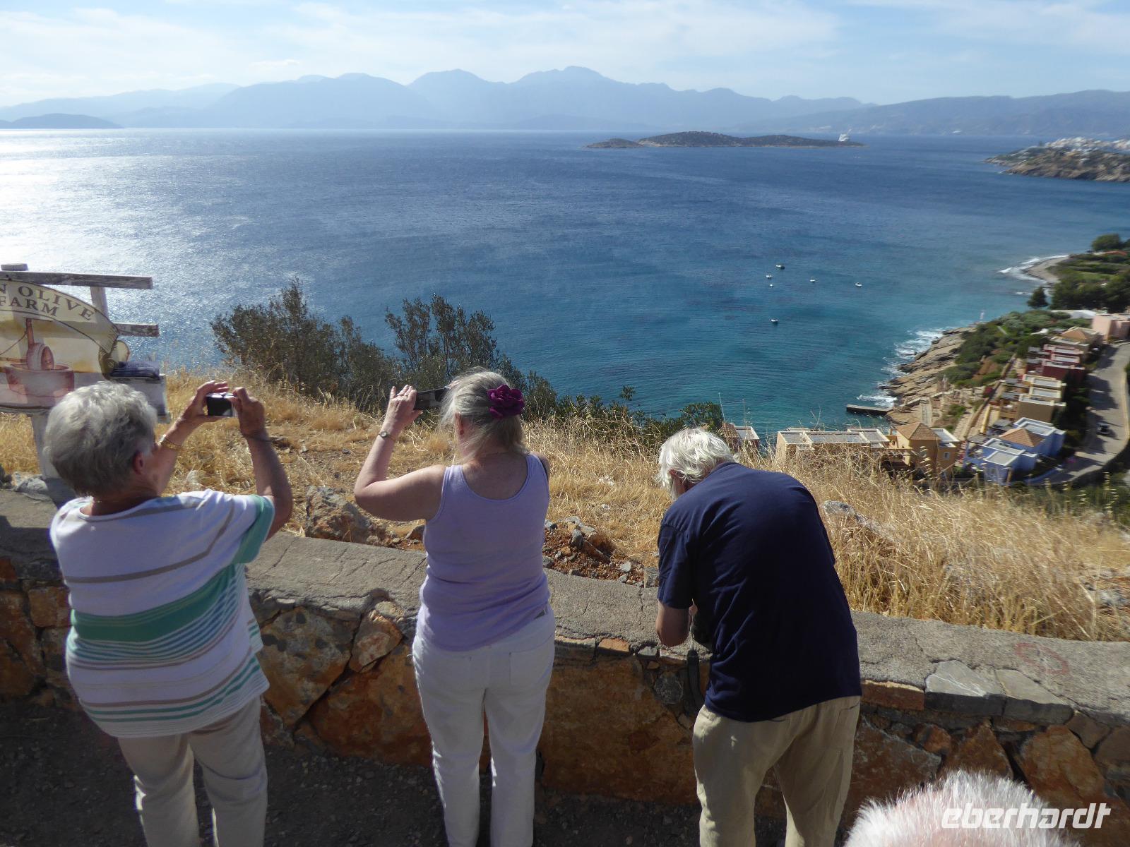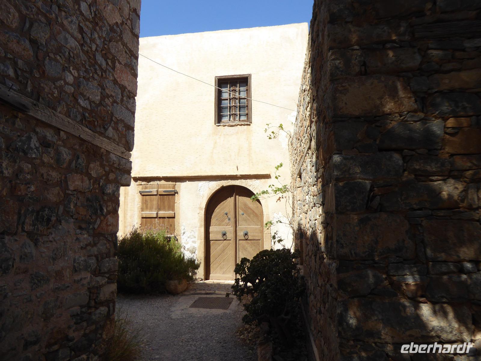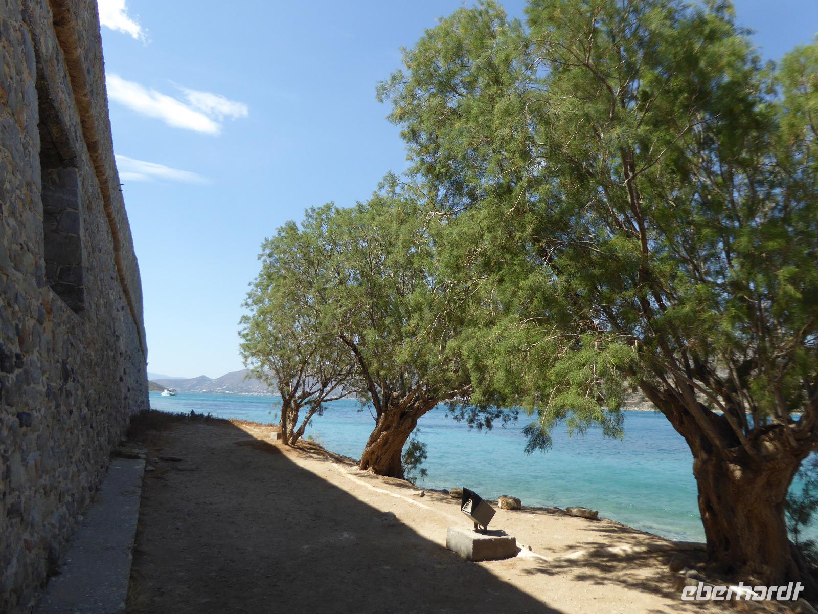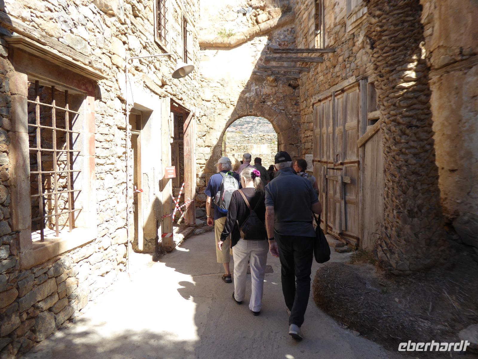 Heute ist Freizeit angesagt. Alternativ besteht die Möglichkeit, an einem Ausflug teilzunehmen. Mit unserem Reisebus fahren wir nach Elounda, wo wir gemeinsam mit einer anderen Eberhardt Reisegruppe ein Boot besteigen, dass uns in zwanzig Minuten auf die Insel Spinalonga bringt. Auf Spinalonga besichtigen wir die antike Festung der Venezianer aus dem 16. Jahrhundert. Gut erhalten sind die Zisternen, das Wachgebäude und die Agios-Nikolaos-Kirche. Pikant wird die Geschichte des Kastells, weil es über fünfzig Jahre als Unterbringung für Lepra-Kranke genutzt wurde. Diese armen kranken Menschen wurden auf Spinalonga isoliert festgehalten, um die Bevölkerung vor Ansteckung zu schützen. Heutzutage besuchen bis zu einer halben Million Menschen die kleine Insel. Zum Mittagessen kehren wir zurück aufs Festland und in Elounda in eine Taverne ein. Unser Reiseveranstalter Eberhardt TRAVEL lädt uns ein, die Köstlichkeiten der kretischen Küche zu verkosten. Es gibt griechischen Salat, Feta-Käse, Tsatsiki, gefüllte Weinlätter, eine eigenwillige Art von Omelett und natürlich griechischen Hauswein und zum Schluss einen Walnuss-Likör. Yamas!