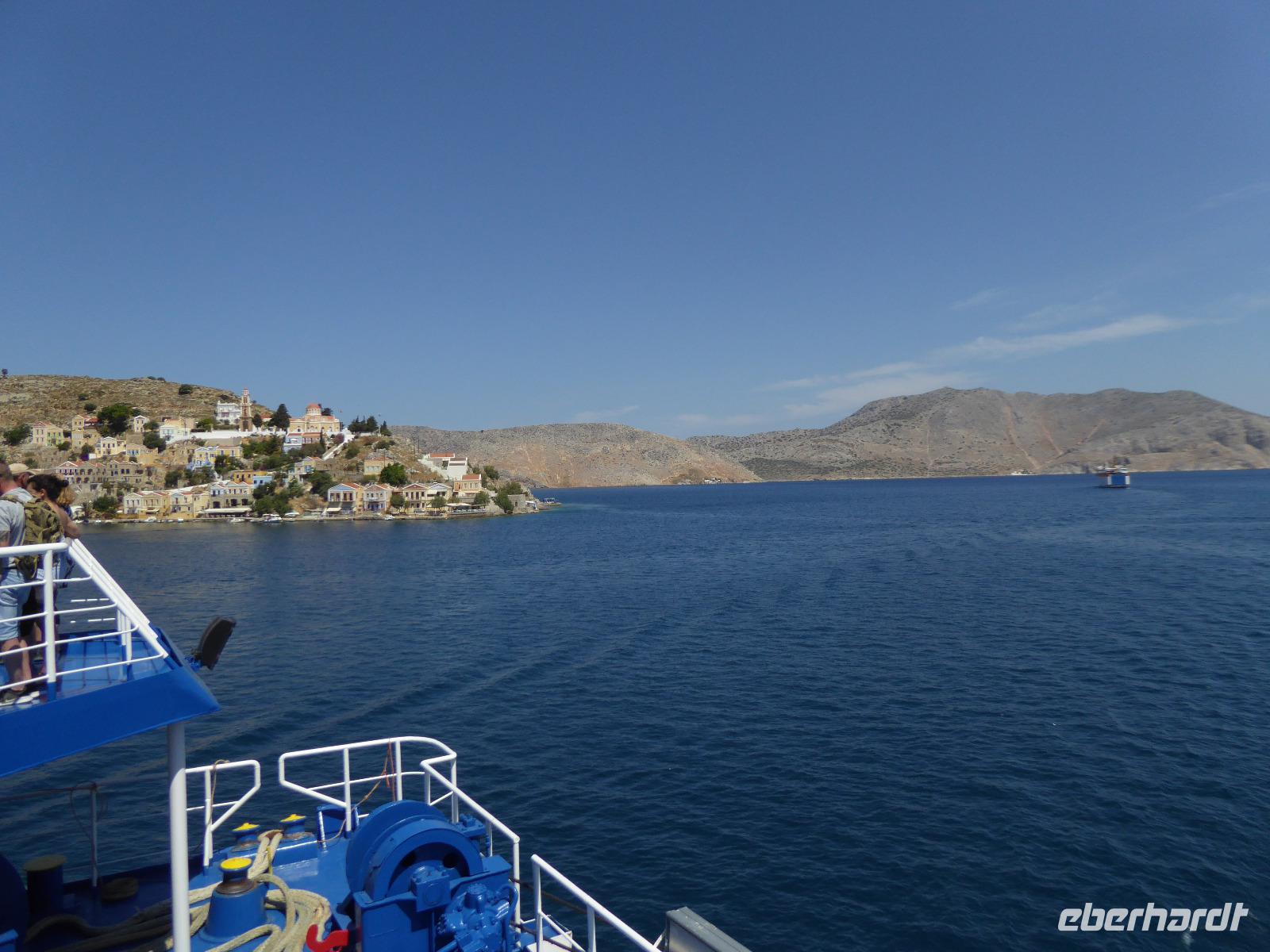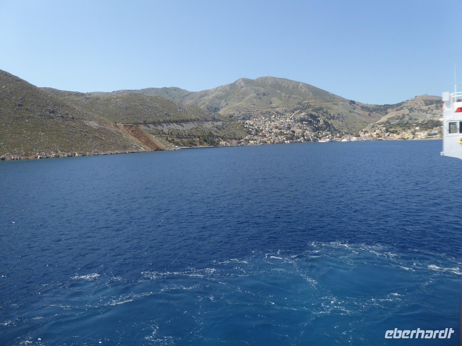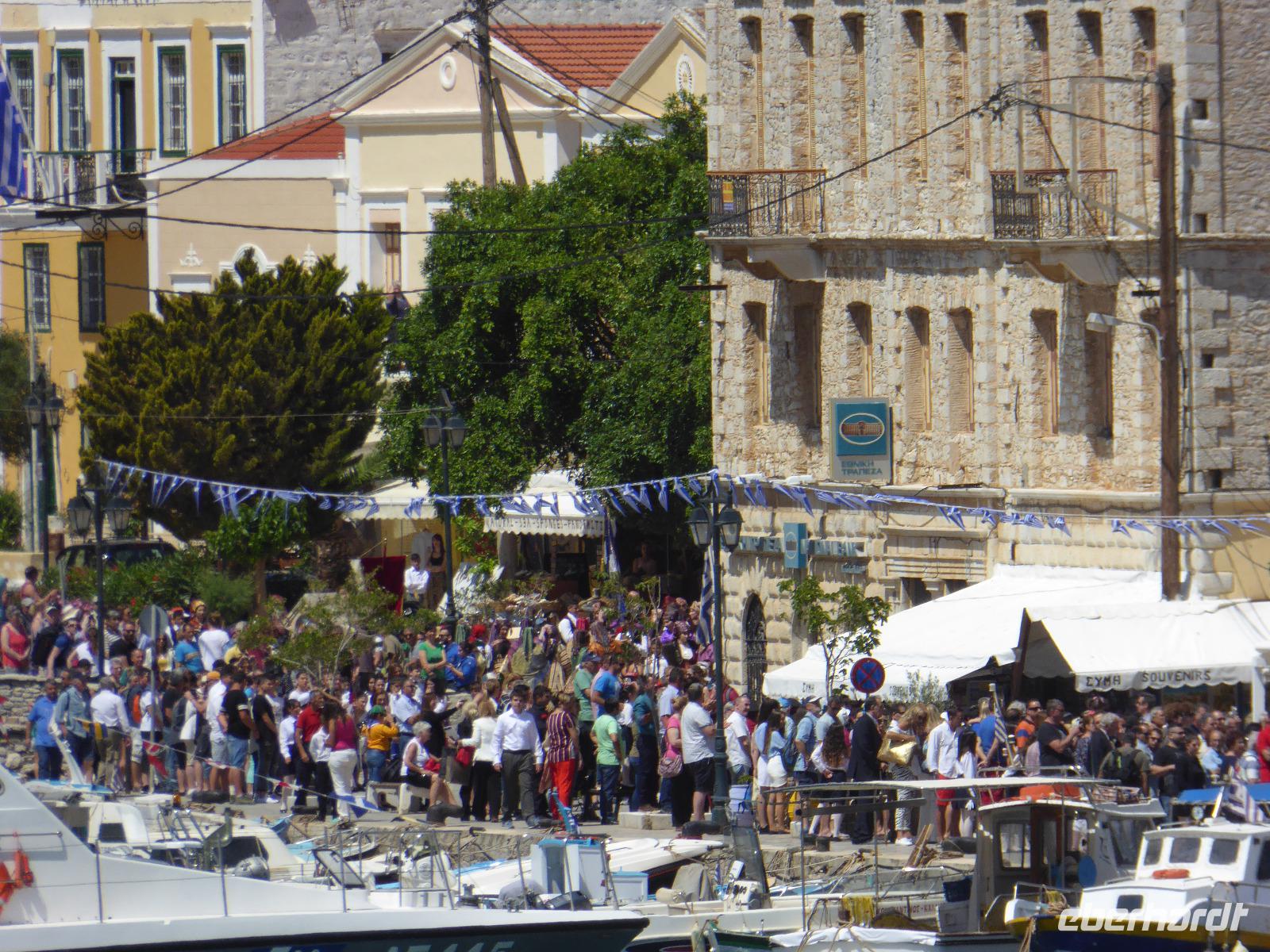 Mit dem Bus fahren wir zum Hafen von Rhodos, wo wir auf unserer Fähre nach Symi einchecken. Bei dem Schiff handelt es sich um einen riesigen Dampfer, auf dem wir die Wahl haben, uns vom Wind die Haare verstrubbeln zu lassen und die Sonne zu genießen oder aber im Inneren des Schiffes die Überfahrt zu genießen. Nach eineinhalb Stunden erreichen wir Symi. Heute, am 08. Mai, begehen die Einwohner einen Feiertag, denn 1945 wurde just an diesem Tag die Kapitulationsurkunde nach dem 2. Weltkrieg unterschrieben. Von Weitem sehen wir die Militärparade und die vielen Menschen, die dem Ereignis beiwohnen. Auf uns warten zwei Busse, die uns zum Kloster Panormitis bringen. Auf und ab geht es quer über die Insel auf der einzigen Autostraße, die es hier gibt. Man kann sich kaum vorstellen, dass Symi einst von 30.000 Menschen bewohnt wurde. Wo haben die bloß alle gewohnt? Im Mittelalter war Symi bekannt für seine schnellen Schiffe und für seine hervorragenden Seemänner. Vor allem für den Abbau von natürlichem Schwamm wurden Schiffe und Besatzung benötigt. Die Schwämme wurden in der ganzen Welte verkauft und auf dem Rückweg brachten die Schiffe Waren aller Art mit, wie Gewürze, Stoffe u.s.w., die dann wiederum in Symi reißenden Absatz fanden. So lebte es sich gut auf der Insel, aber auch schwer. Ende Mai fuhren noch Anfang des 20. Jahrhunderts bis zu 400 Lastschiffe (für die Schwämme), 200 Schiffe für die Taucher und 50 Schiffe fürs Equipment aufs Meer. In Zweierreihen verließen die Schiffe den Hafen, begleitet vom Glockengeläut der Kirchen und ihren winkenden Frauen und Kindern, die zurückblieben. Haben Sie die Häuser gesehen? Alle haben einen Balkon zum Meer. Auf diesen Balkonen saßen die Kinder und hielten Ausschau nach ihren Vätern. Nicht alle kamen zurück.