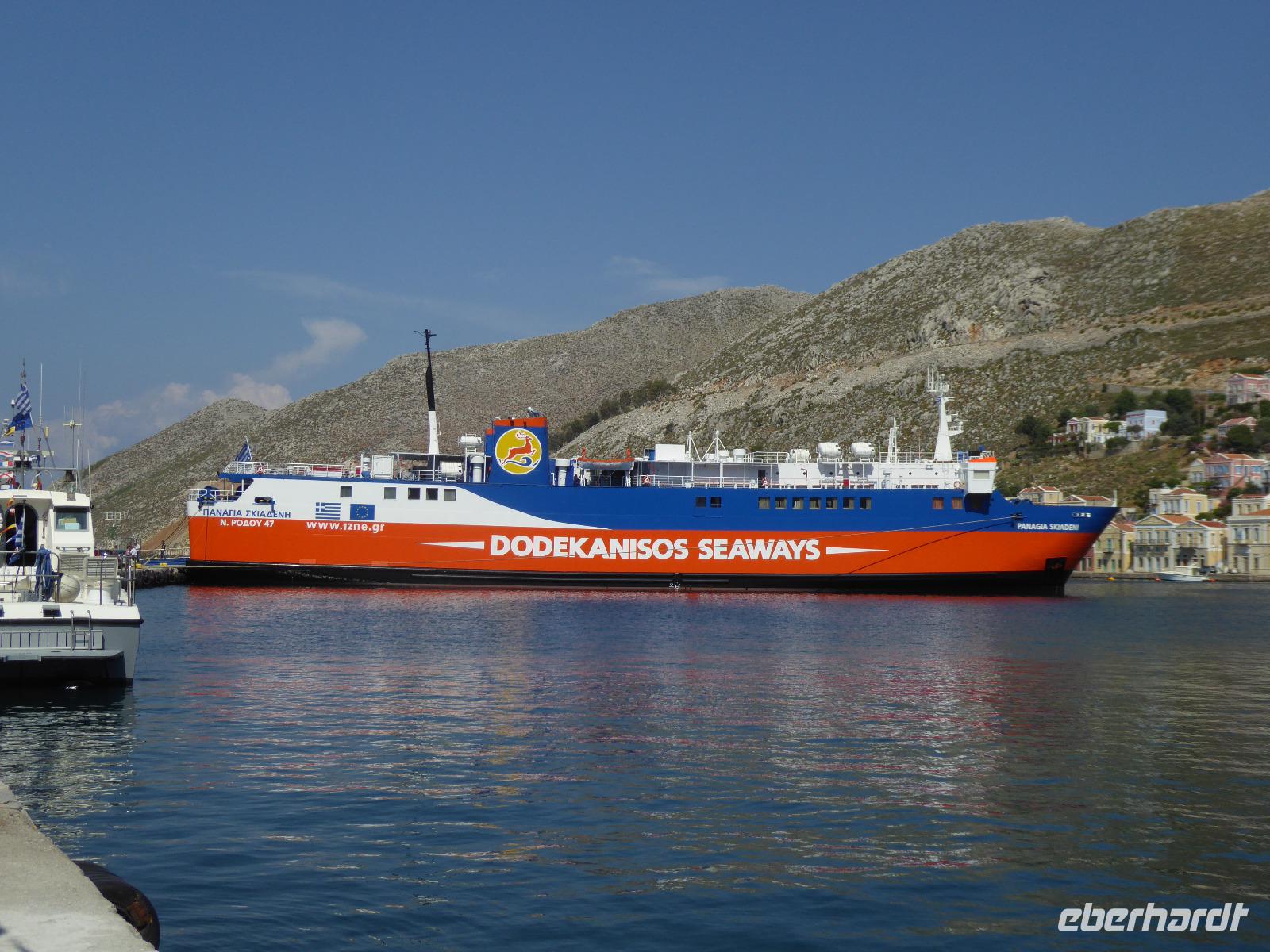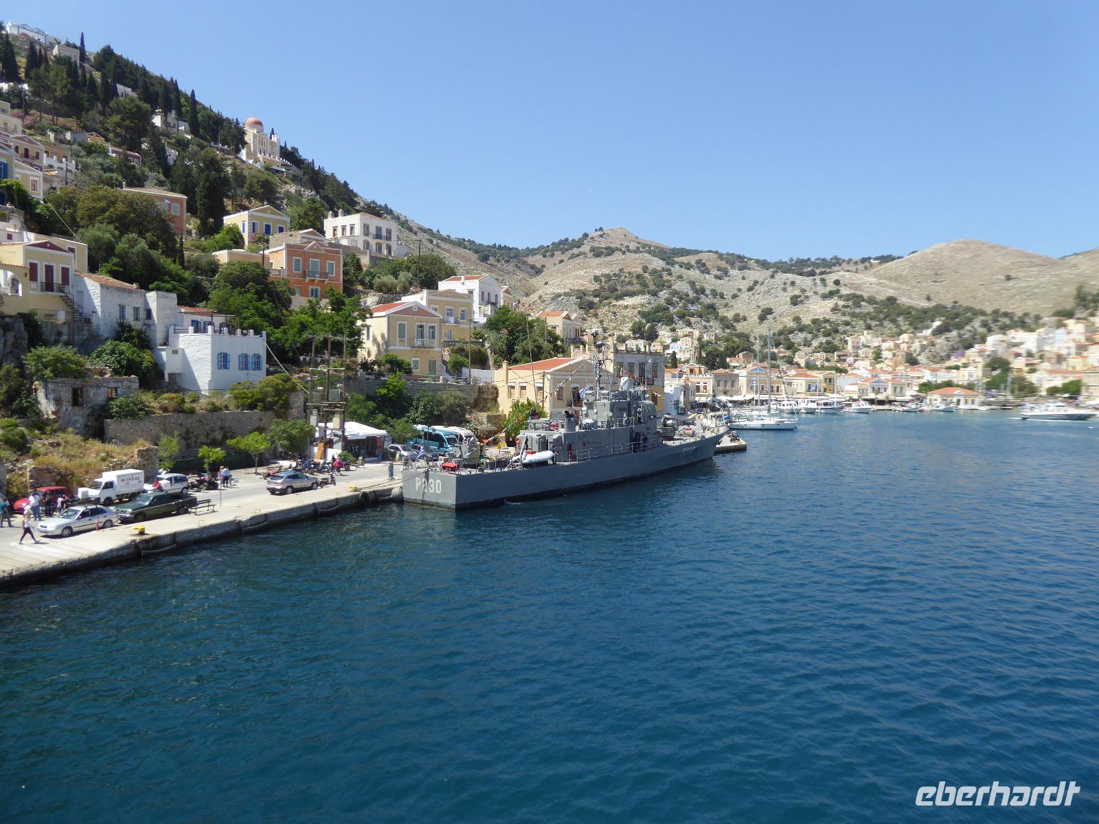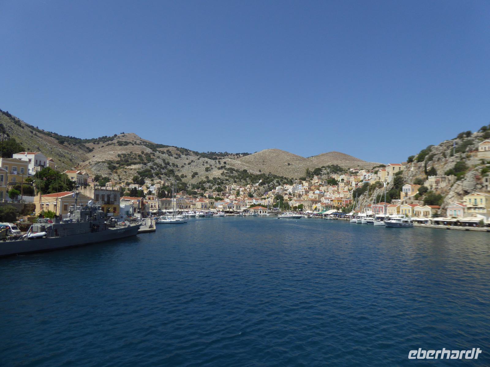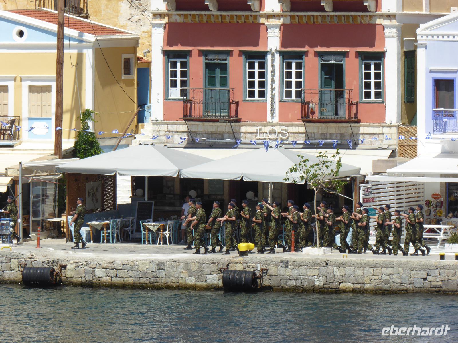 Mit dem Bus fahren wir zum Hafen von Rhodos, wo wir auf unserer Fähre nach Symi einchecken. Bei dem Schiff handelt es sich um einen riesigen Dampfer, auf dem wir die Wahl haben, uns vom Wind die Haare verstrubbeln zu lassen und die Sonne zu genießen oder aber im Inneren des Schiffes die Überfahrt zu genießen. Nach eineinhalb Stunden erreichen wir Symi. Heute, am 08. Mai, begehen die Einwohner einen Feiertag, denn 1945 wurde just an diesem Tag die Kapitulationsurkunde nach dem 2. Weltkrieg unterschrieben. Von Weitem sehen wir die Militärparade und die vielen Menschen, die dem Ereignis beiwohnen. Auf uns warten zwei Busse, die uns zum Kloster Panormitis bringen. Auf und ab geht es quer über die Insel auf der einzigen Autostraße, die es hier gibt. Man kann sich kaum vorstellen, dass Symi einst von 30.000 Menschen bewohnt wurde. Wo haben die bloß alle gewohnt? Im Mittelalter war Symi bekannt für seine schnellen Schiffe und für seine hervorragenden Seemänner. Vor allem für den Abbau von natürlichem Schwamm wurden Schiffe und Besatzung benötigt. Die Schwämme wurden in der ganzen Welte verkauft und auf dem Rückweg brachten die Schiffe Waren aller Art mit, wie Gewürze, Stoffe u.s.w., die dann wiederum in Symi reißenden Absatz fanden. So lebte es sich gut auf der Insel, aber auch schwer. Ende Mai fuhren noch Anfang des 20. Jahrhunderts bis zu 400 Lastschiffe (für die Schwämme), 200 Schiffe für die Taucher und 50 Schiffe fürs Equipment aufs Meer. In Zweierreihen verließen die Schiffe den Hafen, begleitet vom Glockengeläut der Kirchen und ihren winkenden Frauen und Kindern, die zurückblieben. Haben Sie die Häuser gesehen? Alle haben einen Balkon zum Meer. Auf diesen Balkonen saßen die Kinder und hielten Ausschau nach ihren Vätern. Nicht alle kamen zurück.
