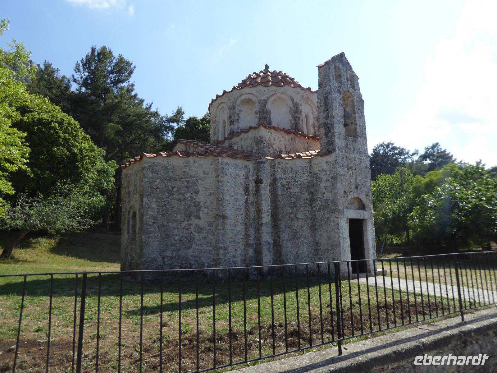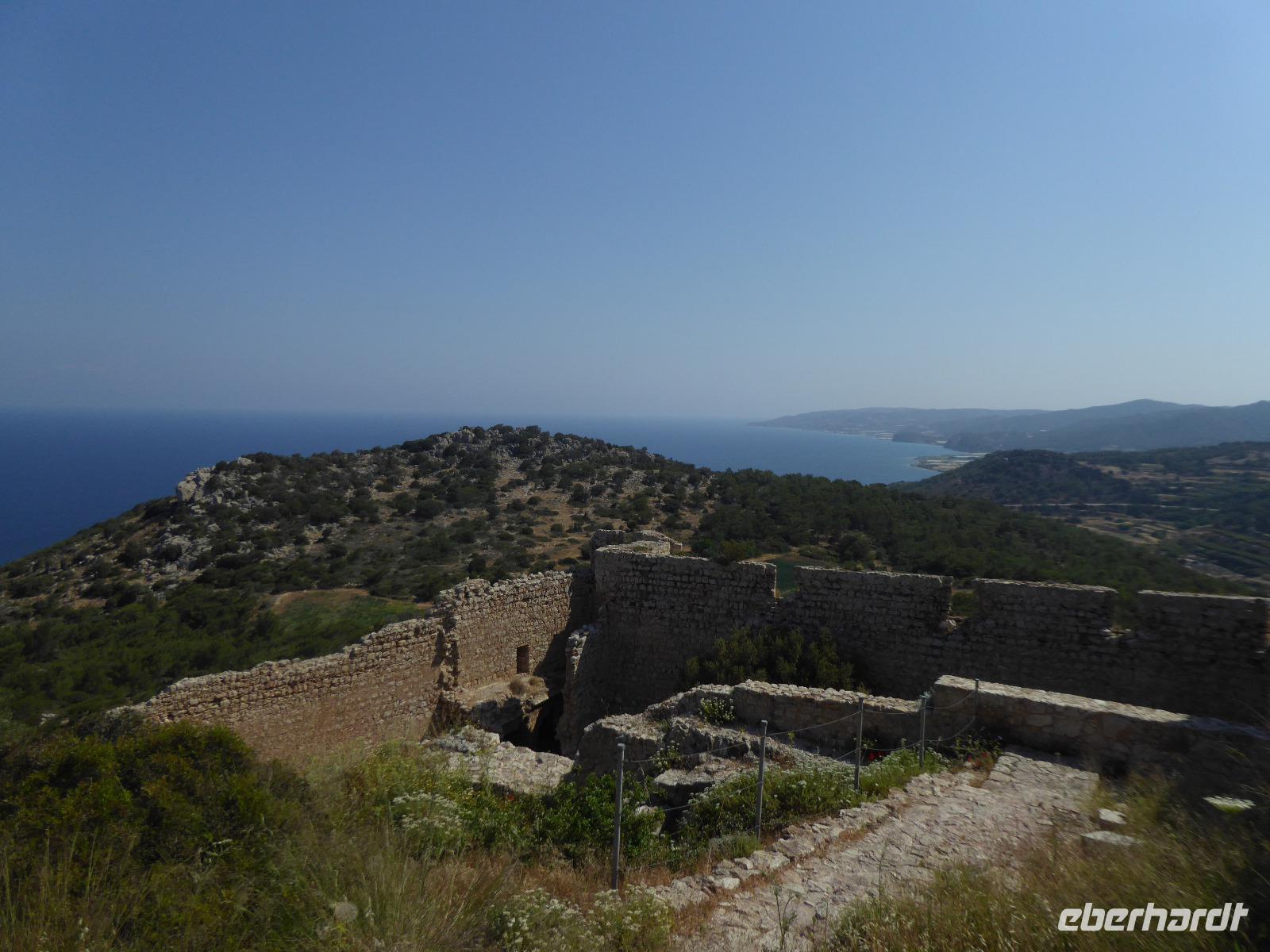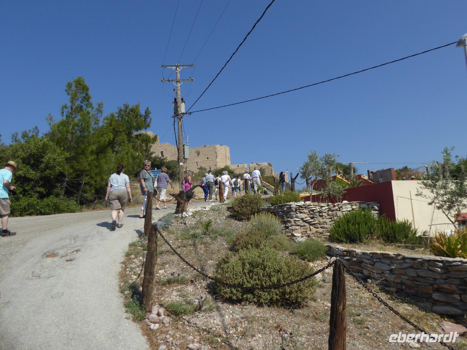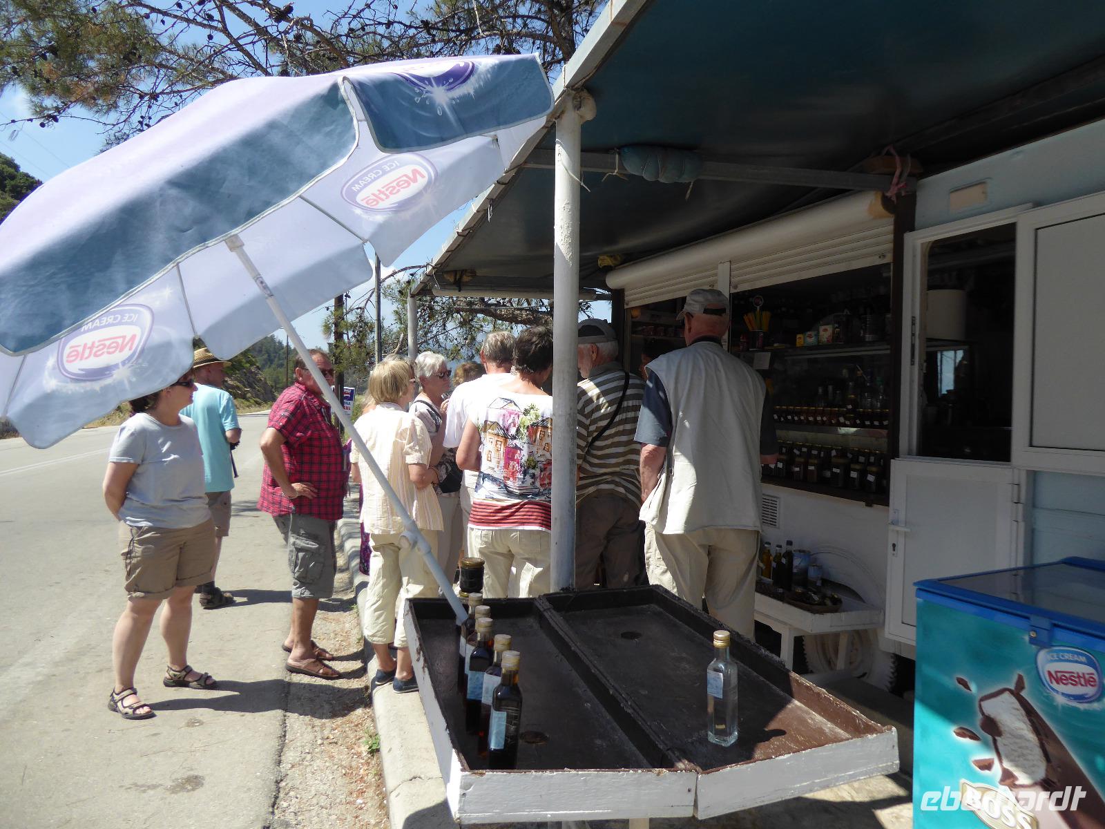 Wir besuchen eine der besterhaltenen Johanniterburgen auf Rhodos - Kritnia. Von oben haben wir eine fantastische Aussicht auf das türkisblaue Meer. Am Fuße der Burg gibt es in einem hübschen Café frisch gepressten Orangensaft. Weiter führt uns die Fahrt an der Westküste bis wir einen Stopp einlegen, um Kräuterschnaps und Honig zu verkosten und dann einzukaufen. Die nächste Johanniterburg Monolithos betrachten wir von oben. Am Aussichtspunkt werden frische Aprikosen, Nüsse, Öl und wieder Schnaps angeboten. Schon ist es Mittag und wir kehren in Embona, dem höchst gelegenen Ort von Rhodos, in eine Taverne ein. Hier gibt es köstliche griechische Speisen und Getränke. Gut gestärkt besuchen wir nun den Weinkeller von Ebona. Naja, wie ein Weinkeller sieht es hier nicht aus, eher wie ein kleiner Laden. Die junge Inhaberin ist auf uns vorbereitet und bietet uns fünf verschiedene Weine zum Kosten an. Vom trockenen Weißwein über samtigen Rotwein erreicht unseren Gaumen letztendlich ein weißer Dessertwein. An den gut gefüllten Tüten, die der eine oder andere nun unter dem Arm trägt, ist zu erkennen, dass der Wein gut war. Unsere kulinarische Reise führt uns jetzt zum Elafos Hotel, wo wir in einem gediegenen Café Kaffee trinken oder uns im Garten zu einem Pläuschchen treffen. Den Abschluss unseres tollen Tages bildet der Besuch einer kleinen byzantinischen Kapelle mit einer tragischen Geschichte. Ein Elternpaar hatte drei Kinder an eine Seuche verloren. Zur Erinnerung an ihre Kinder ließen sie die Kapelle errichten. Noch heute sind die wunderschönen Fresken zu erkennen. Ein ereignisreicher, aber dennoch erholsamer Tag geht zu Ende. Danke Petra, für die vielen interessanten Geschichten.