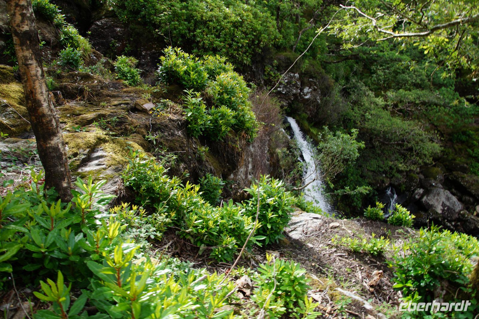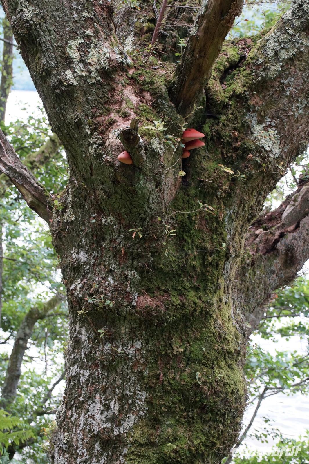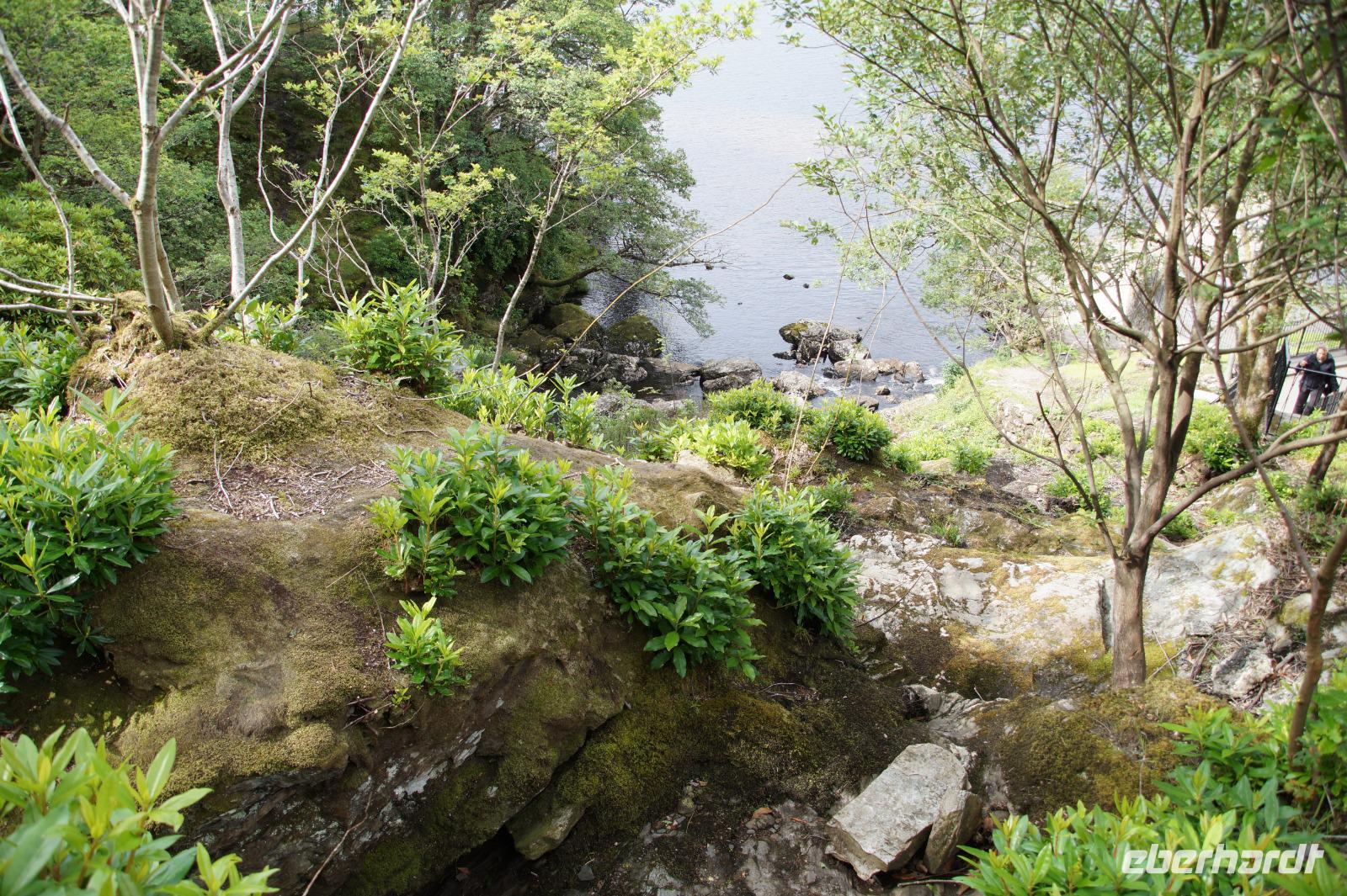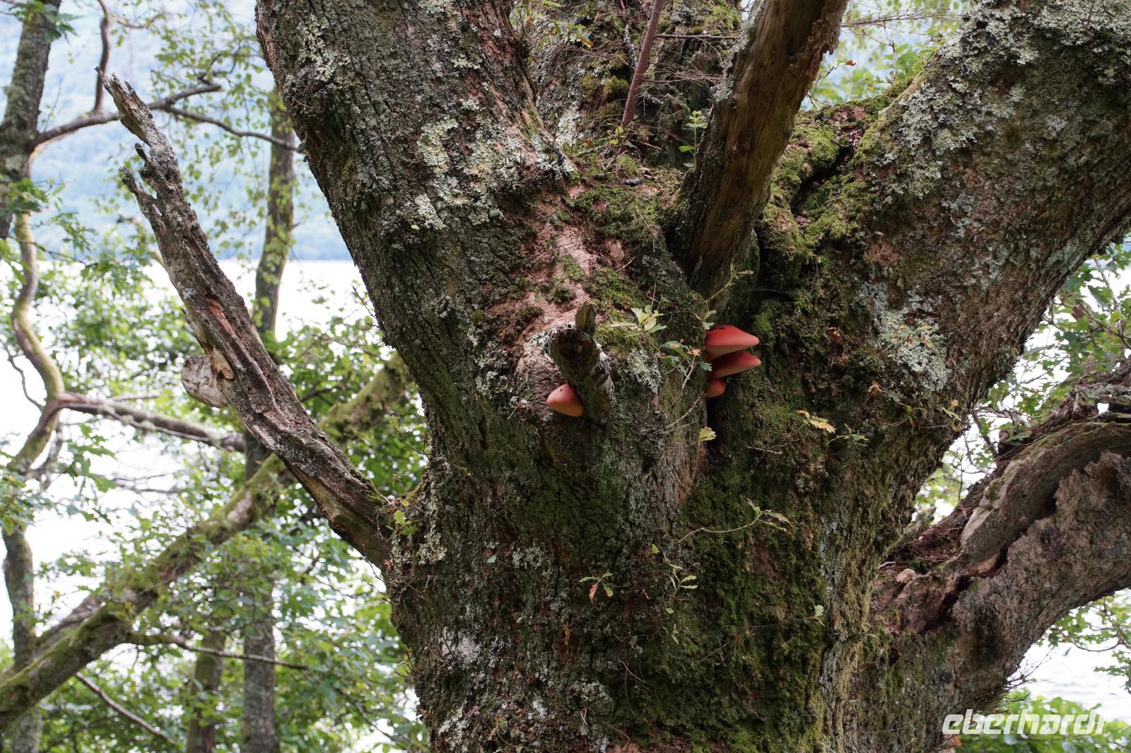 Dort starteten wir unsere Wanderung. Es fing ganz malerisch mit dem von jungen Rhodondendren umstandenen Inversnaid-Wasserfall an, dann ging es, immer am Seeufer entlang, in einem Auf und Ab den West Highland-Wanderweg in Richtung Süden. An einem breiten Kiesstrand machten wir Mittag. Wir kamen vorbei an malerisch mit Moos bewachsenen Felsen und Hausruinen, womöglich denen des bekannten Viehdiebs und Widerstandskämpfers Rob Roy McGregor, wir sahen interessante Baumpilze und das Gebirgspanorama des Loch Lomonds und der westlich davon liegenden Berge, wie etwa den bizarr geformten Ben Arthur.