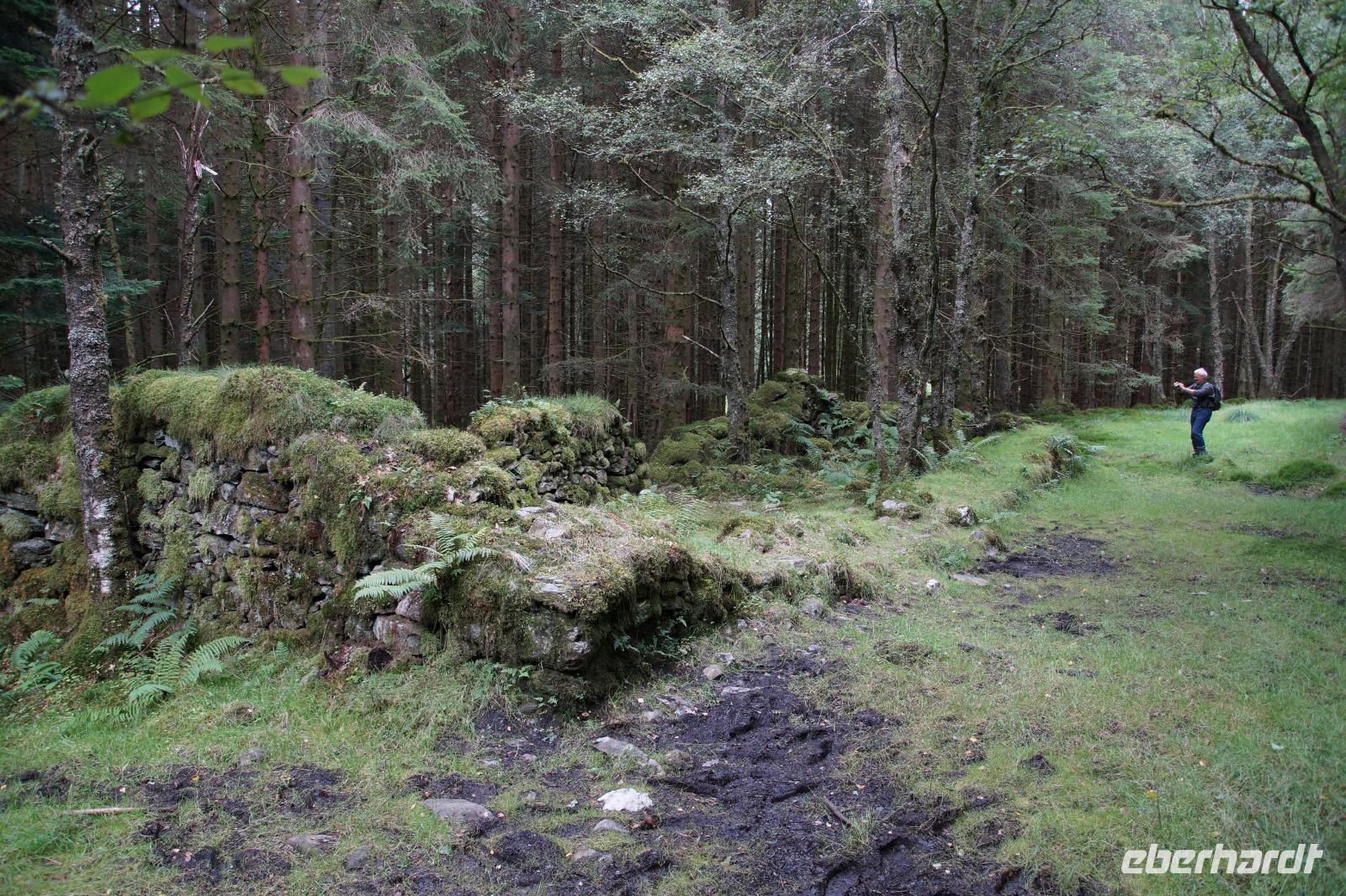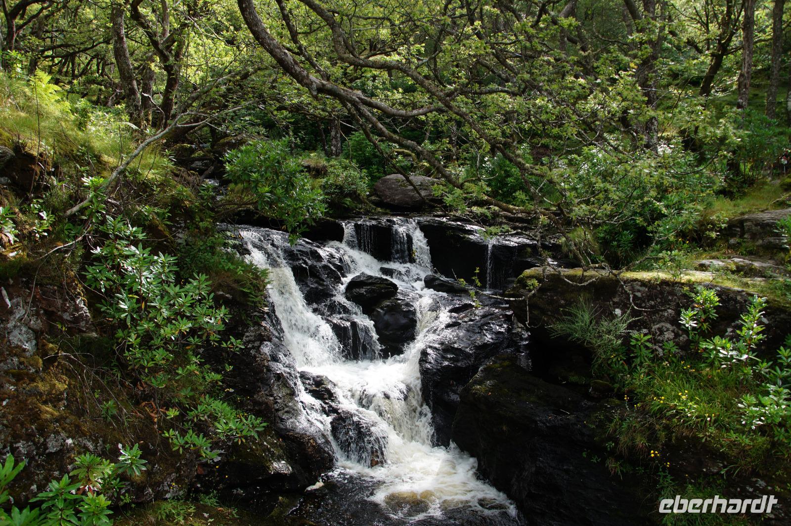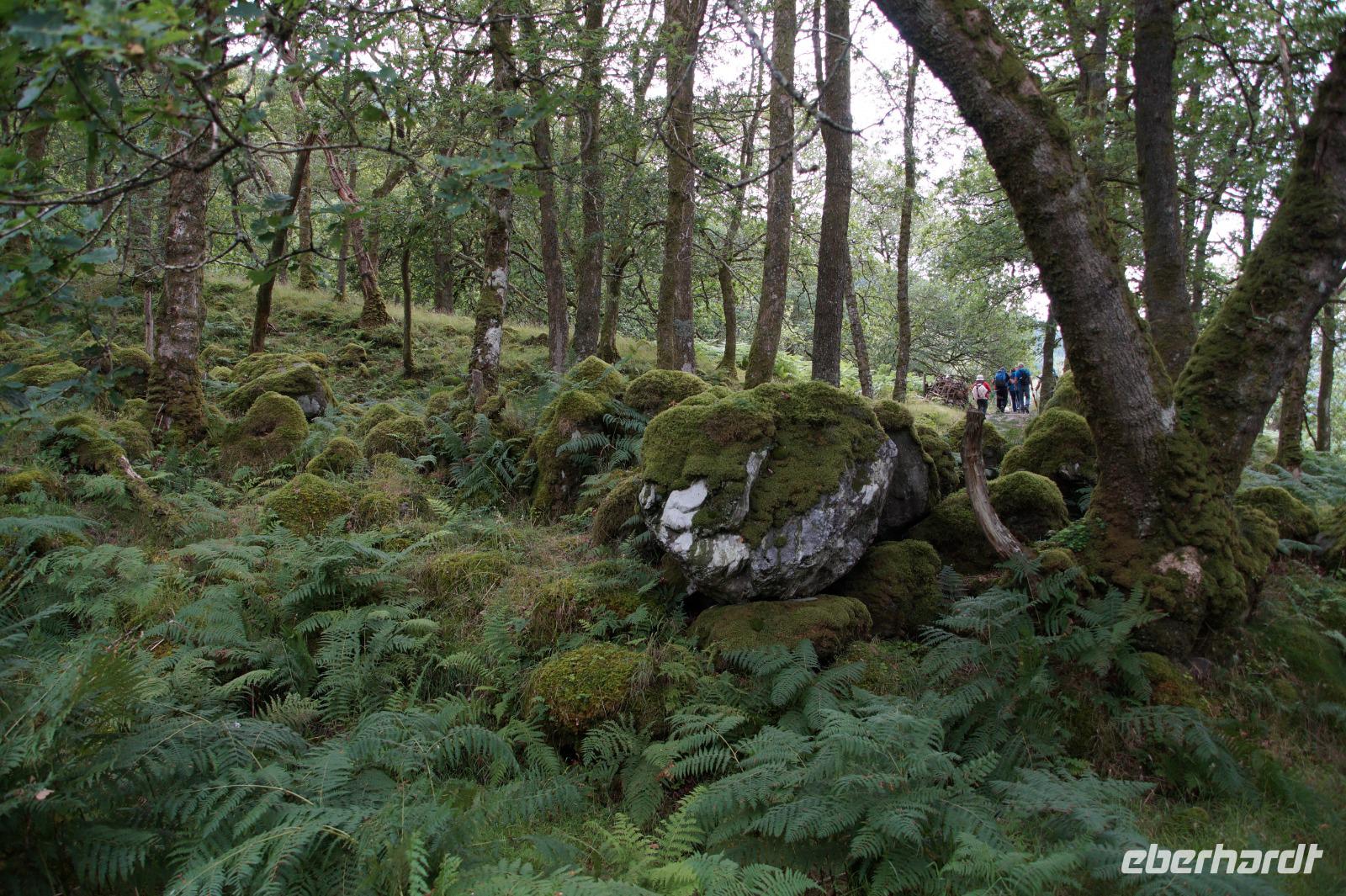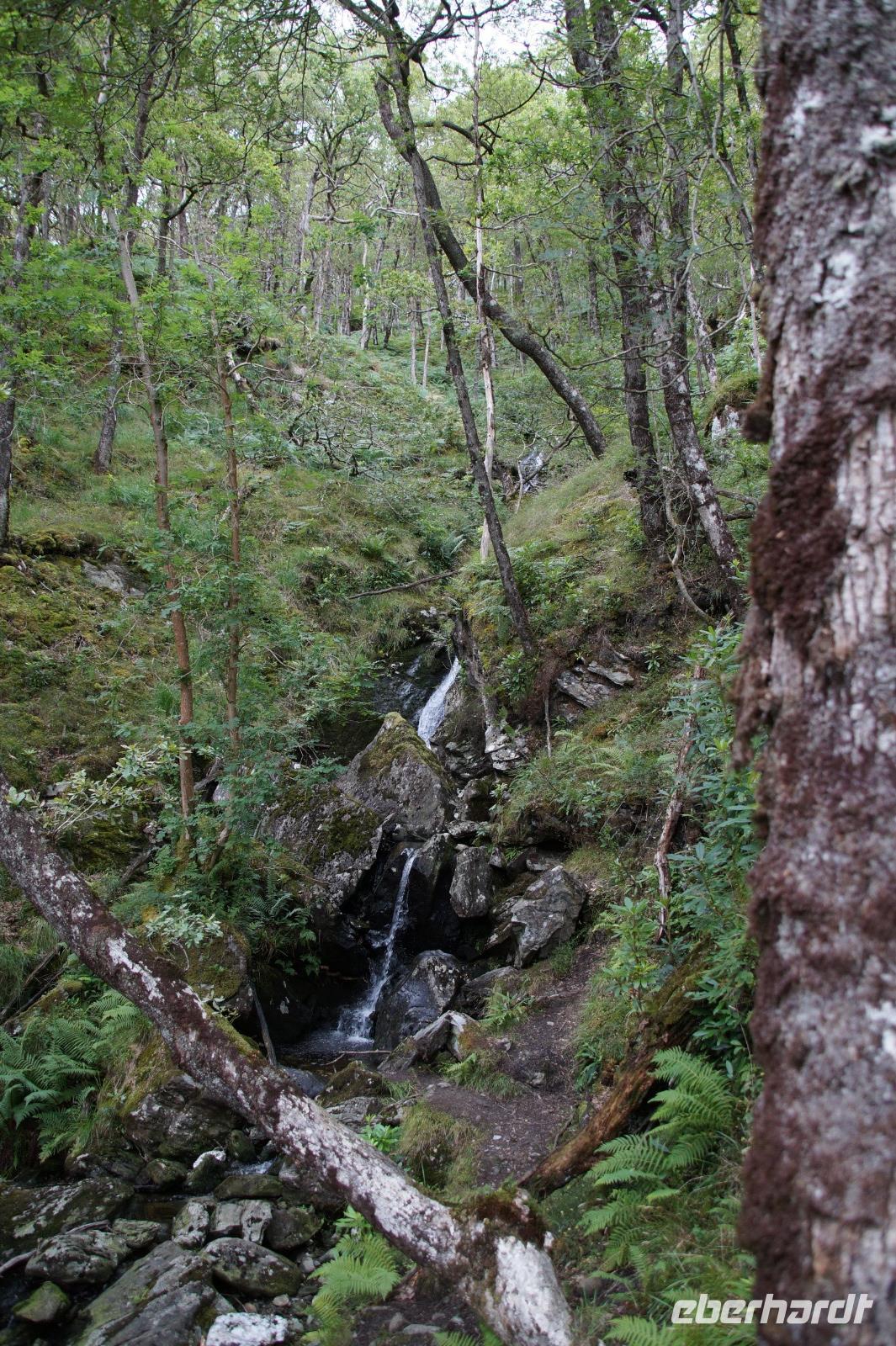 Dort starteten wir unsere Wanderung. Es fing ganz malerisch mit dem von jungen Rhodondendren umstandenen Inversnaid-Wasserfall an, dann ging es, immer am Seeufer entlang, in einem Auf und Ab den West Highland-Wanderweg in Richtung Süden. An einem breiten Kiesstrand machten wir Mittag. Wir kamen vorbei an malerisch mit Moos bewachsenen Felsen und Hausruinen, womöglich denen des bekannten Viehdiebs und Widerstandskämpfers Rob Roy McGregor, wir sahen interessante Baumpilze und das Gebirgspanorama des Loch Lomonds und der westlich davon liegenden Berge, wie etwa den bizarr geformten Ben Arthur.
