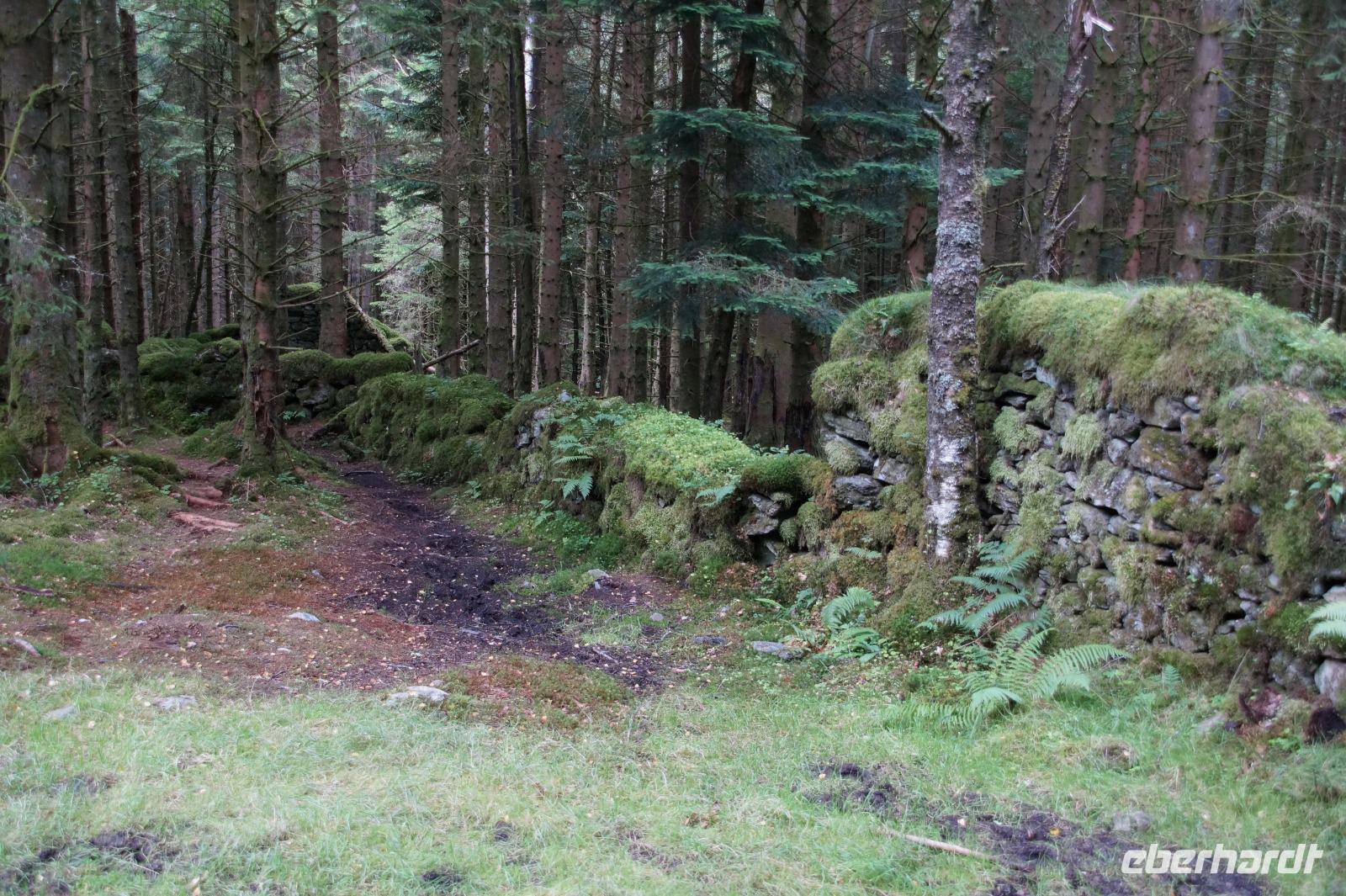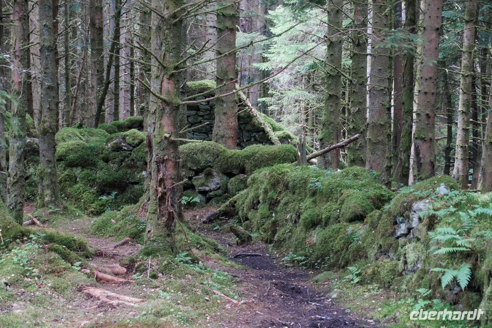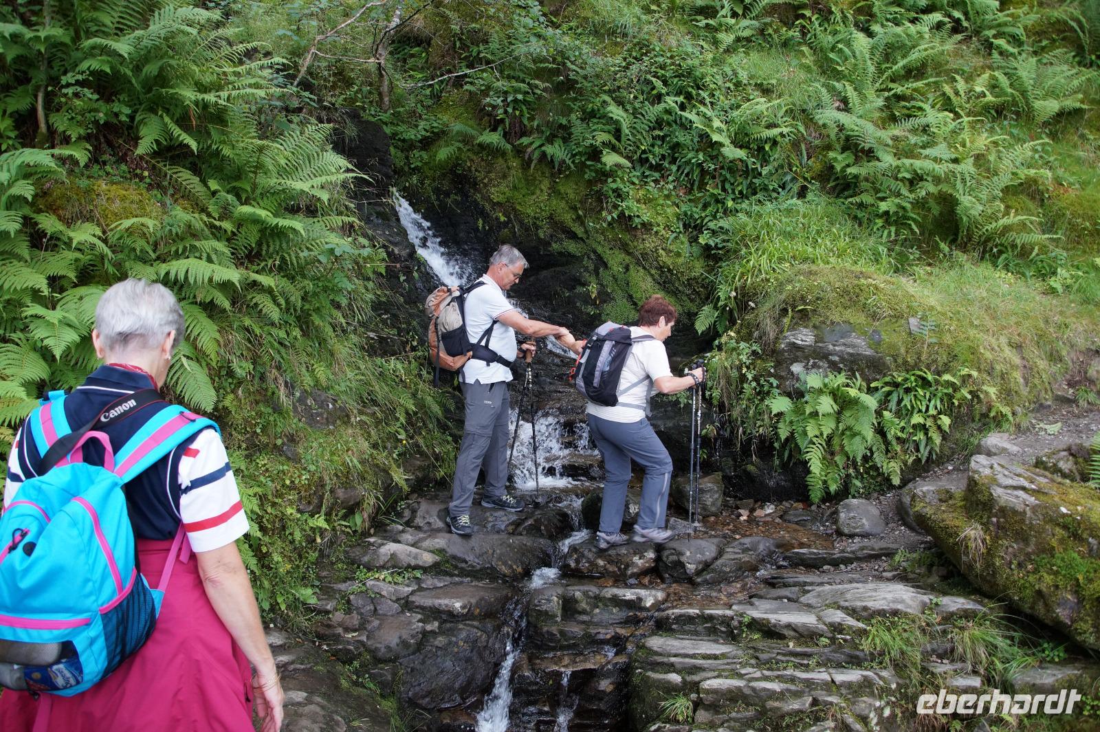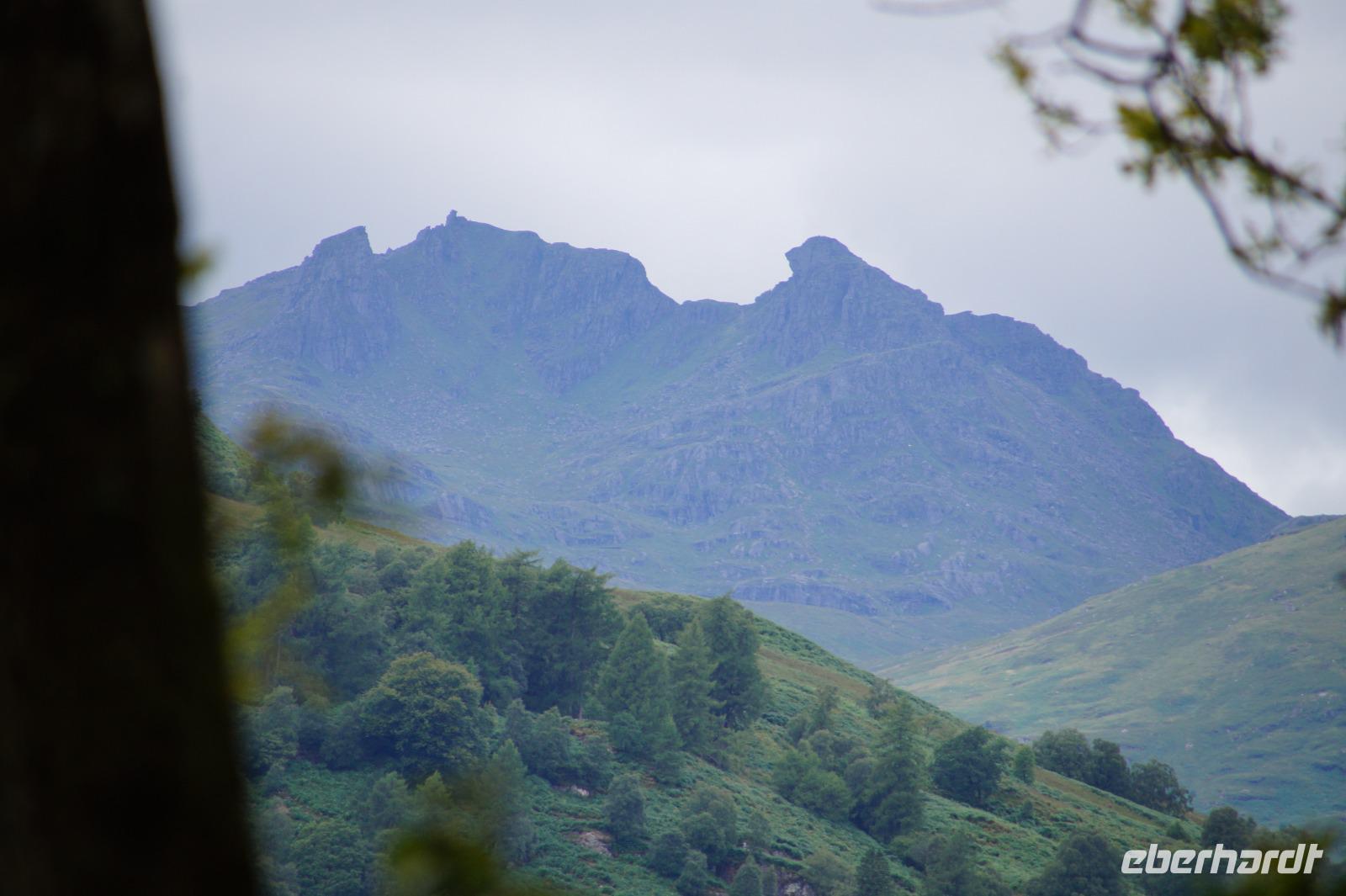 Dort starteten wir unsere Wanderung. Es fing ganz malerisch mit dem von jungen Rhodondendren umstandenen Inversnaid-Wasserfall an, dann ging es, immer am Seeufer entlang, in einem Auf und Ab den West Highland-Wanderweg in Richtung Süden. An einem breiten Kiesstrand machten wir Mittag. Wir kamen vorbei an malerisch mit Moos bewachsenen Felsen und Hausruinen, womöglich denen des bekannten Viehdiebs und Widerstandskämpfers Rob Roy McGregor, wir sahen interessante Baumpilze und das Gebirgspanorama des Loch Lomonds und der westlich davon liegenden Berge, wie etwa den bizarr geformten Ben Arthur.