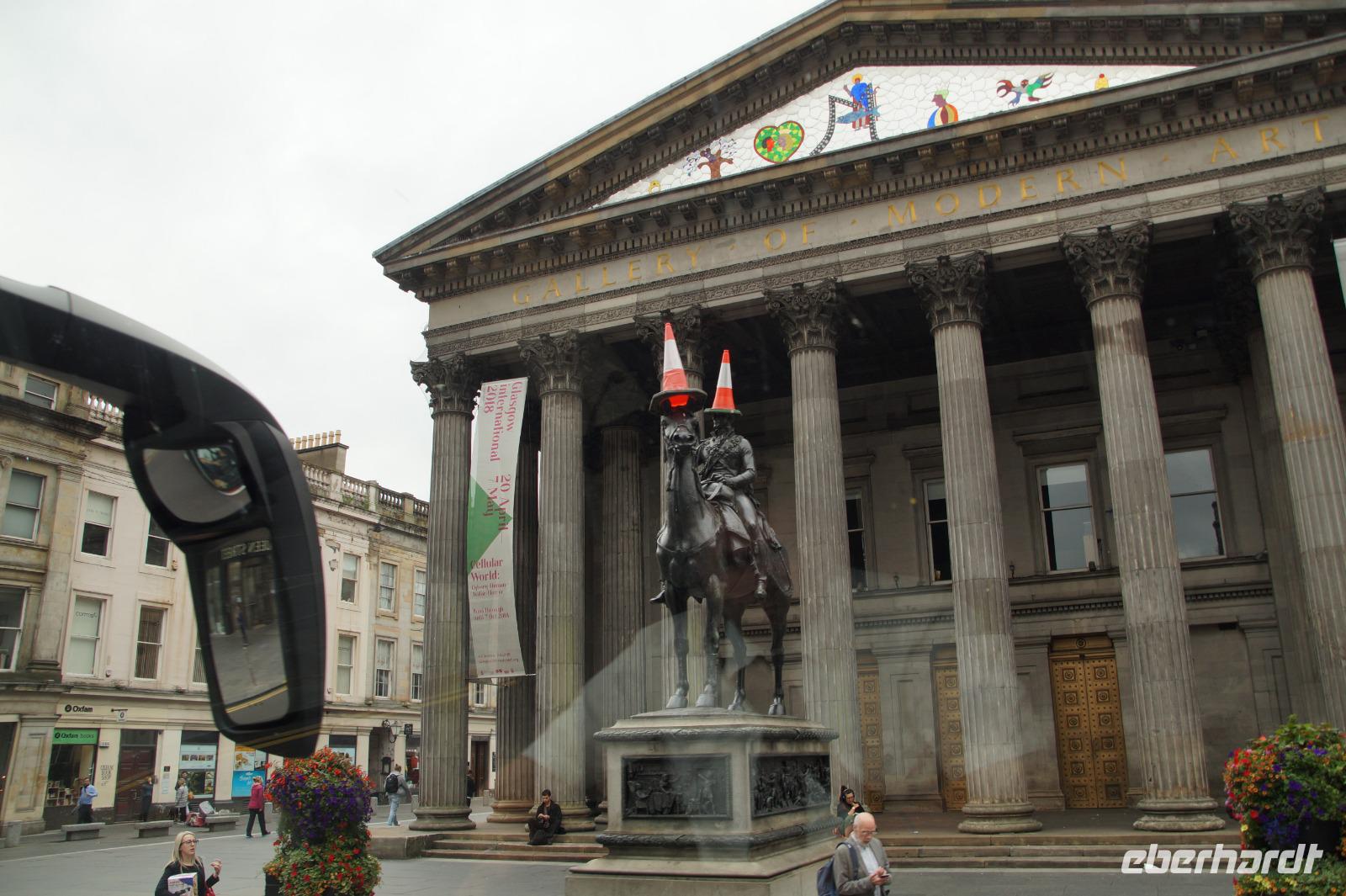Am Nachmittag kehrten wir über Glasgows Innenstadt, wo wir am für den Verkehr weiterhin gesperrten George Square und am Wellingtondenkmal vorbeifuhren, nach Erskine zurück. Wellington, sonst nur mit einer Pilone geschmückt (die von der Polizei regelmäßig entfernt wird), teilte sein Schicksal diesmal auch mit seinem Pferd, welches ebenfalls eine Pilone auf den Kopf gesetzt bekommen hatte.