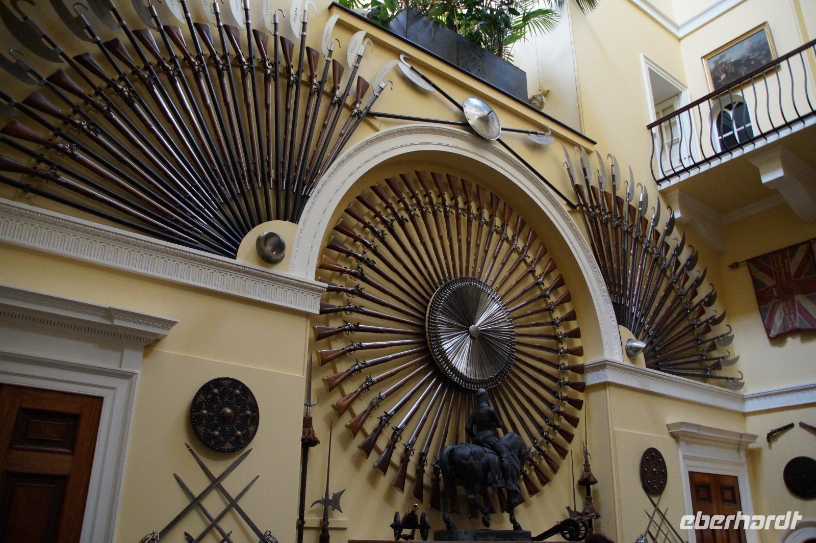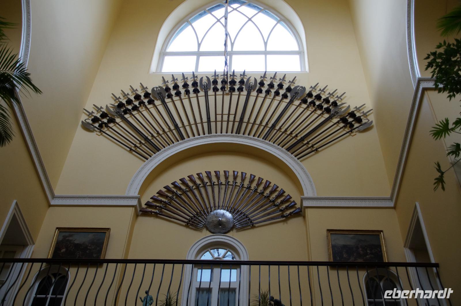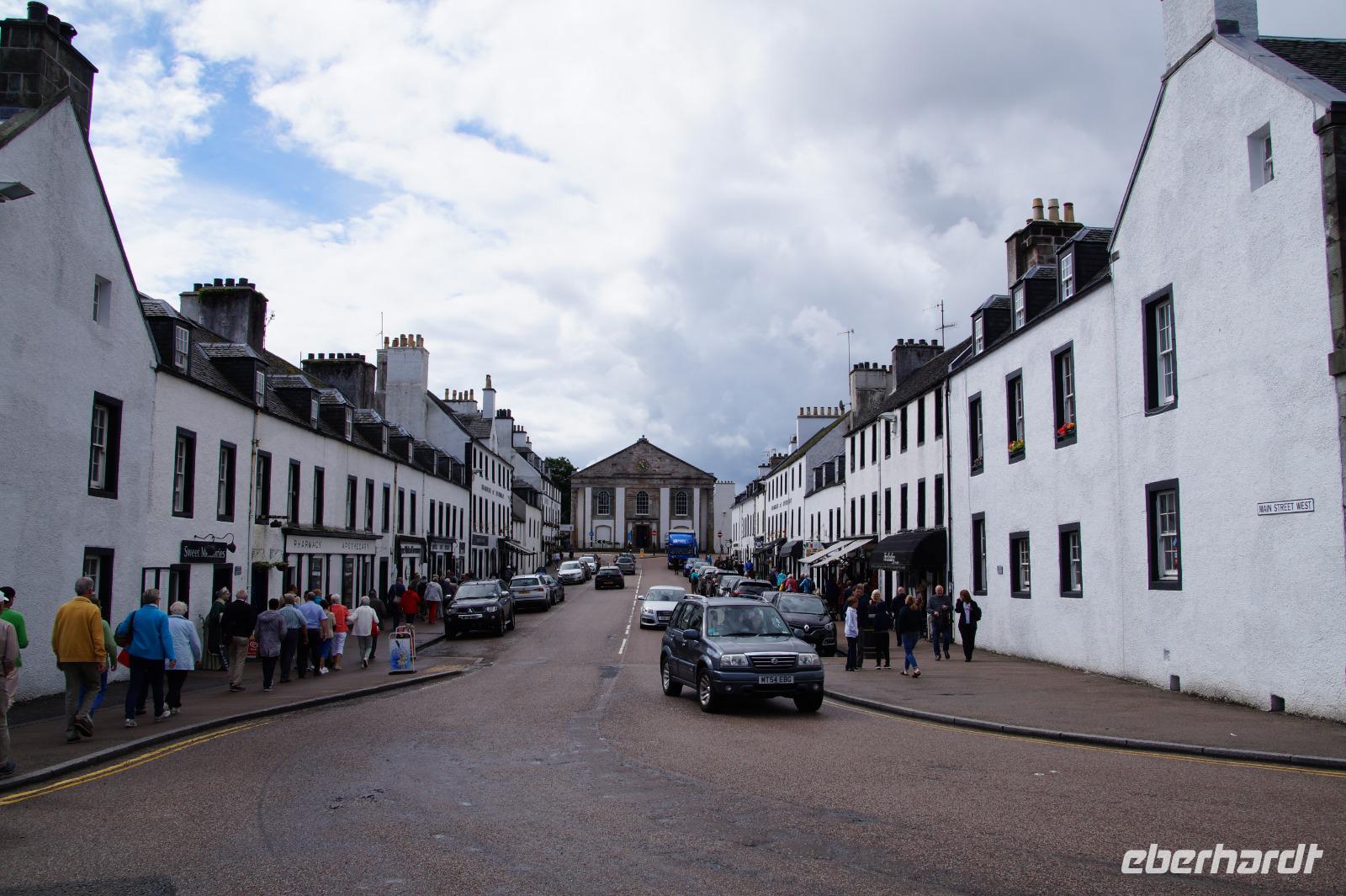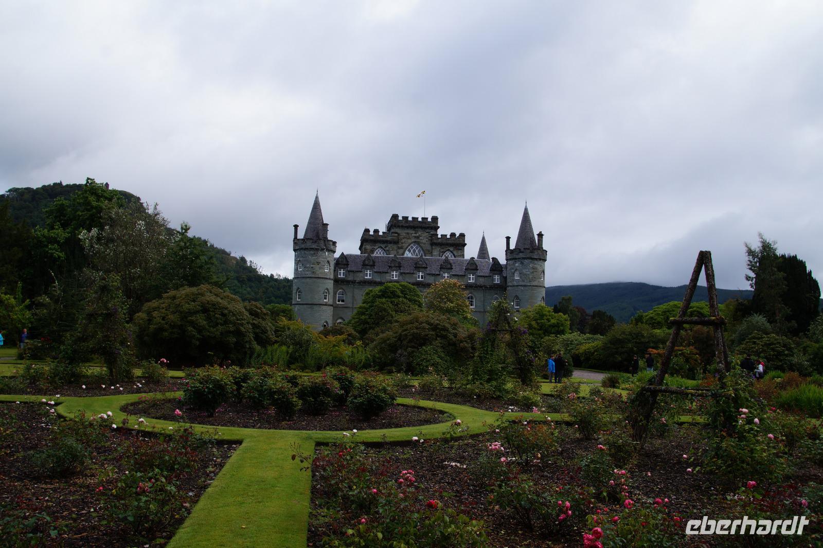 Zunächst ging es eine leicht hangaufwärtsteigende, eibenumstande Allee entlang bis zu einer kleinen Anhöhe, von der aus man aus nordöstlicher Richtung einen ersten Blick auf dieses wohl berühmteste Schloss der Highlands werfen konnte. Natürlich kommt Inveraray nicht an die Berühmtheit vom Dun Eileann Castle ("Highlander") oder vom Urquhardt Castle am Loch Ness heran, dieses sind aber Burgen und eben keine Schlösser. Wir schlugen einen kleinen Bogen und kamen schließlich von Nordwesten zum Schloss, welches wir kurz danach gemeinsam besichtigten. Im Garten bewunderten wir die Pflanzen und die Mammutbäume, danach hatten wir ein wenig Freizeit im gleichnamigen Dorf Inveraray. Das Dorf wurde bei dem Neubau des Schlosses in einer Mischung aus adeligem Dünkel und Aufgeklärtheit des 18. Jahrhunderts abgerissen und neu aufgebaut. Dünkel, weil der damalige Herzog die Hütten seiner Crofter aus dem Blickfeld haben wollte, Aufgeklärtheit, weil das Dorf nach den neuesten Errungenschaften der Aufklärung geordnet mit einer gemeinsamen Kirche für den gälisch- und englischsprachigen Teil der Bevölkerung versehen wurde, die durch eine Mauer in die beiden Hälften geteilt war.