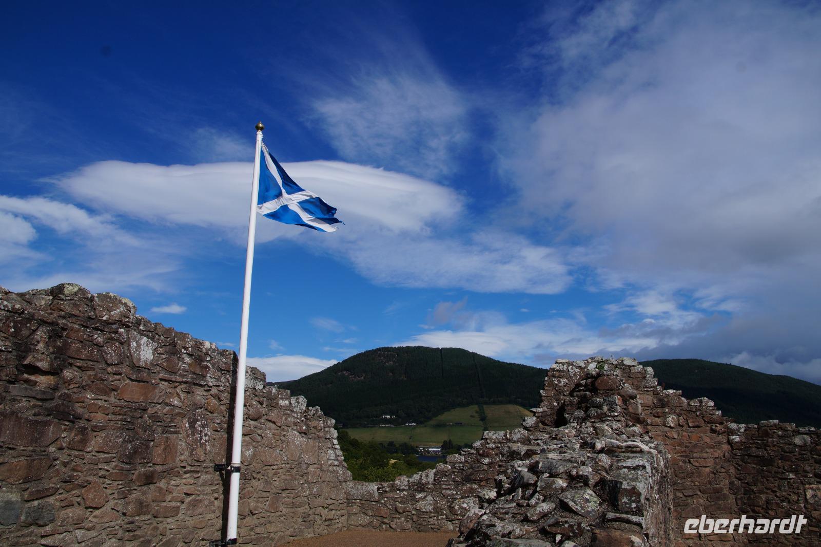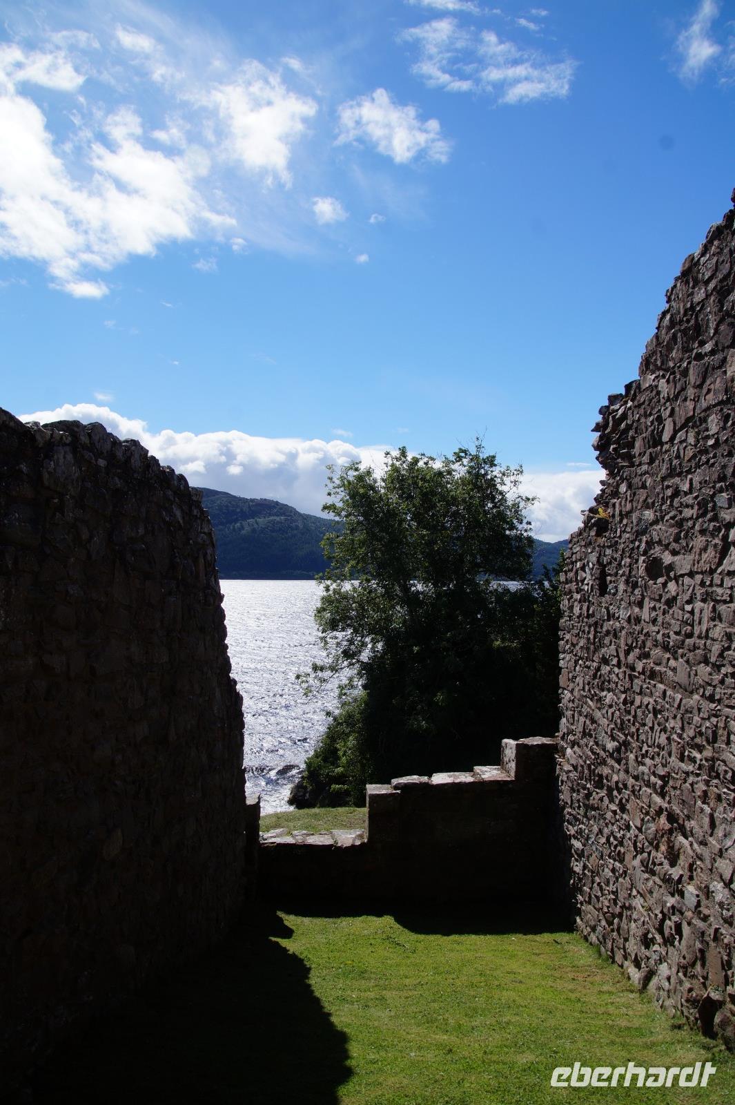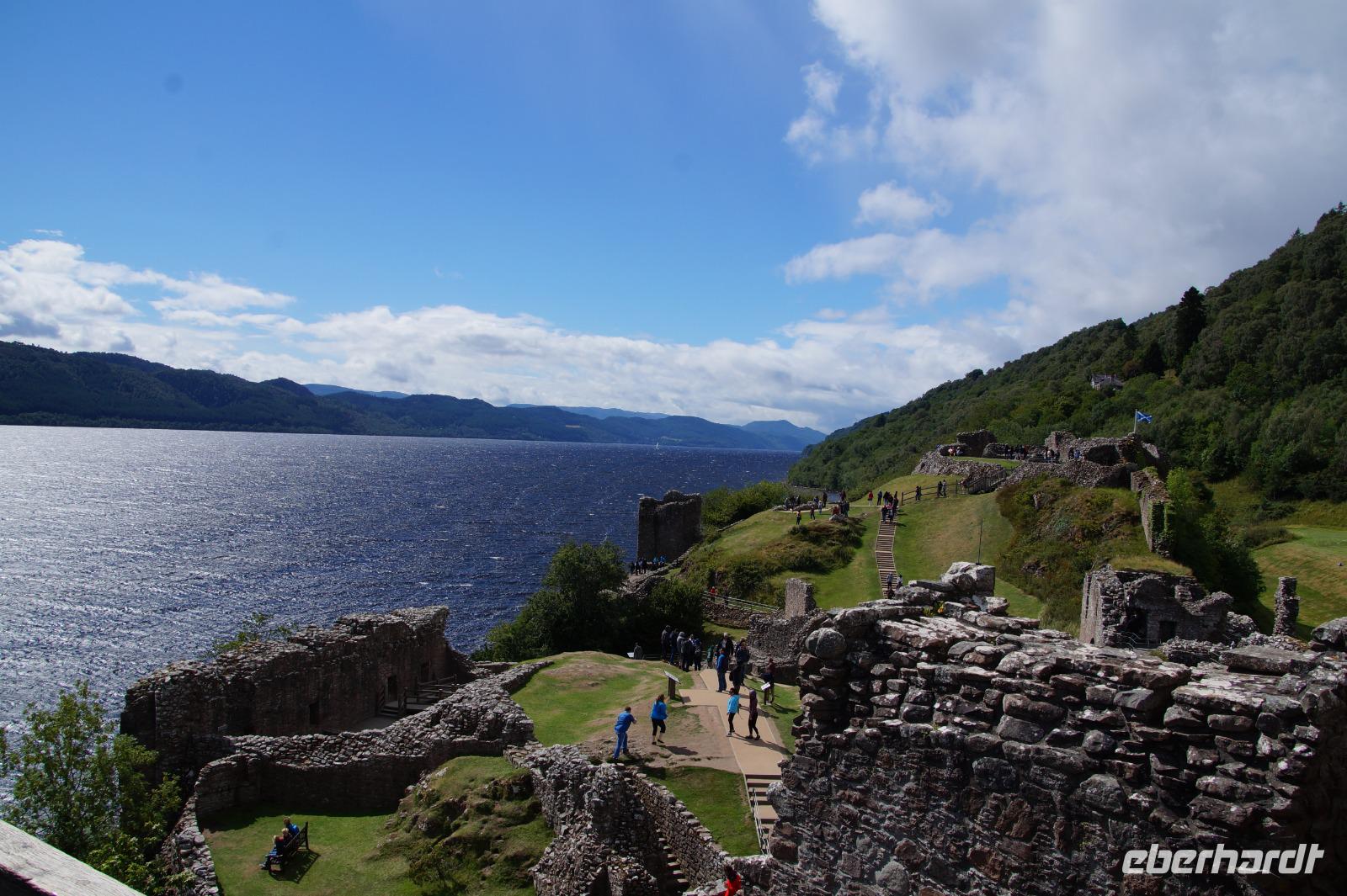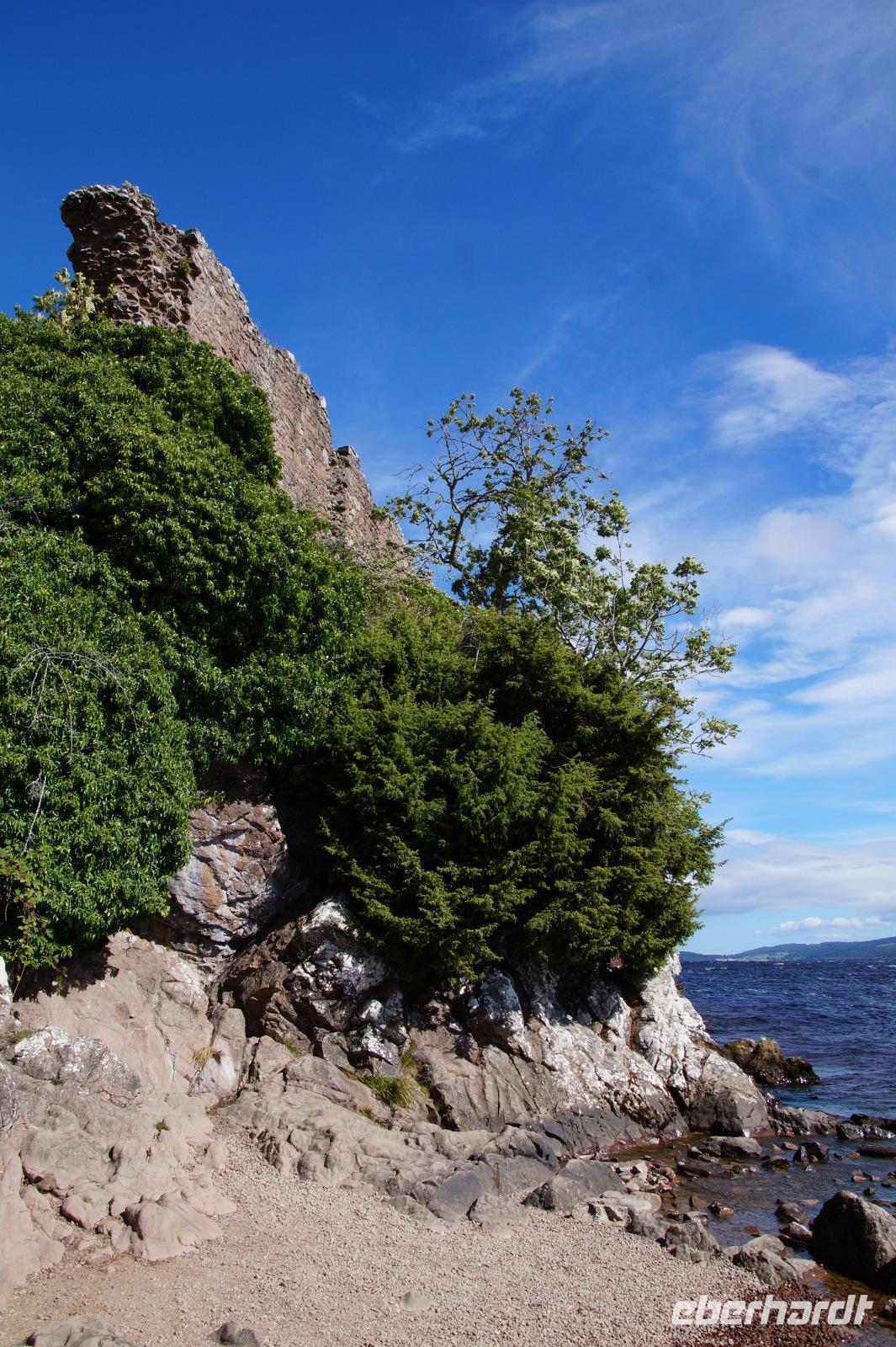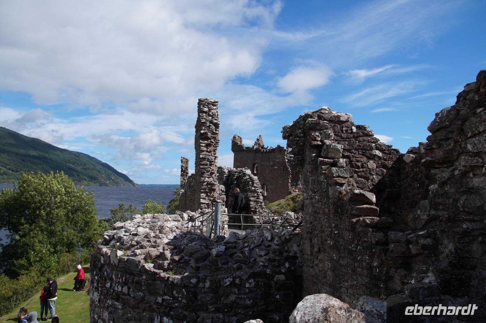 Urquhardt Castle ("Örk?t Ka:sl") ist der beliebteste Spot, um nach Nessie Ausschau zu halten. Die Burg selbst war bereits in vorchristlicher Zeit ein Siedlungspunkt, im Mittelalter wechselte sie mehrfach die Herrschaft, besonders in den schottischen Unabhängigkeitskriegen im 13. und 14. Jhdt. Im 17. Jhdt. sprengten britische Soldaten, als sie die Burg nach einer aufgehobenen jakobitischen Belagerung verließen, das Torhaus in die Luft, danach wurde die Anlage offen gelassen und verfiel zu Ruine.
