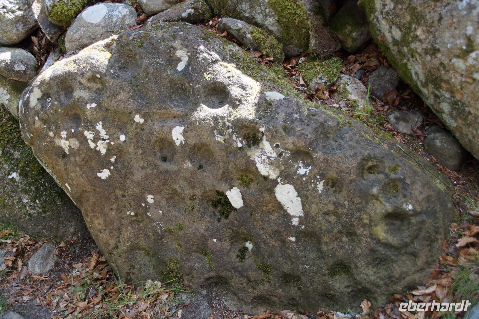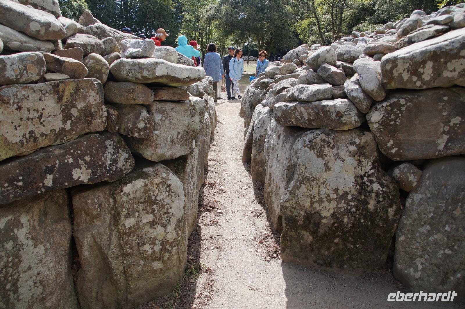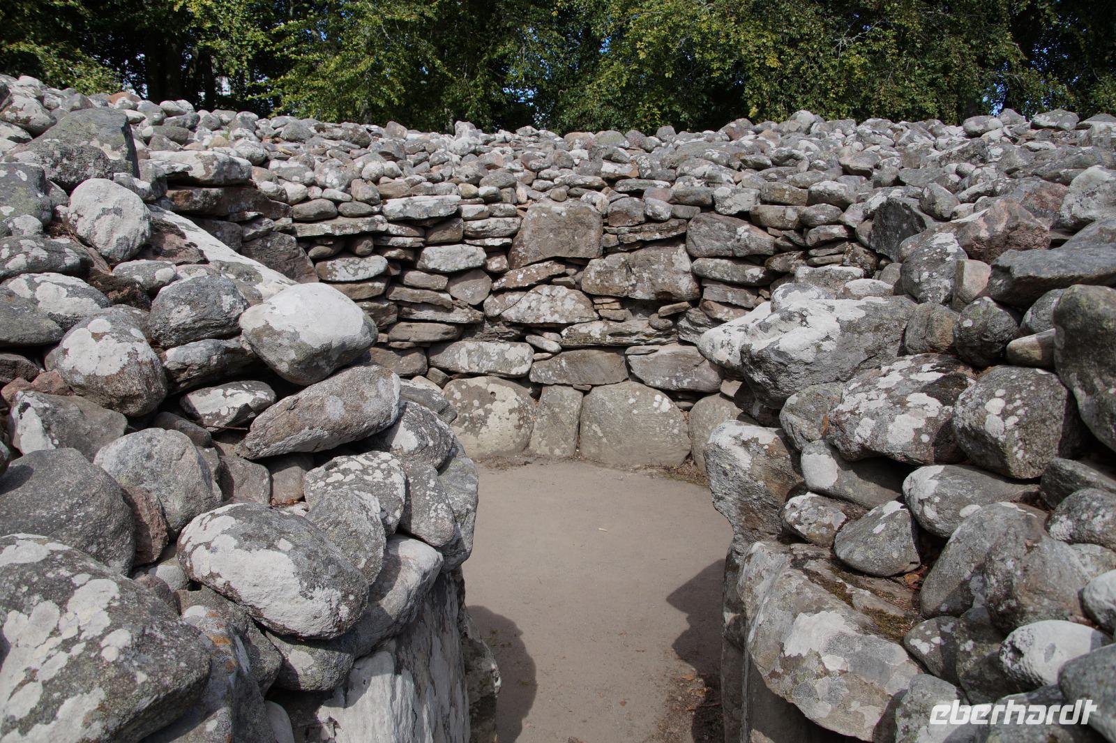 Ganz in der Nähe liegen die Clava Cairns. Der gälische Begriff Cairn (anglisiert) bedeutet zunächst einmal nichts anderes als 'Steinhaufen'. In der Prähistorik sind die Cairns aber auch eine sehr schottische, nichtmegalithische Variante der Megalithkultur. Also anstatt des Großstein- - Megalith - -grabes ein Grab aus einem Steinhaufen. Bzw. wir sehen es an dem Plural-S, mehrere davon, eingebettet in eine rituelle Landschaft mit Menhiren, einem davon dem durch Diana Gabaldons "Outlander" popularisierten Split Stone, der in der Fiktion unter gewissen Umständen das Zeitreisen ermöglichen soll. Die Clava Cairns aus der TV-Adaption sind allerdings nicht die originalen Clava Cairns.