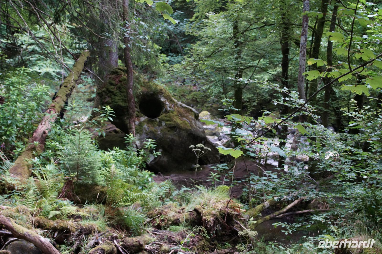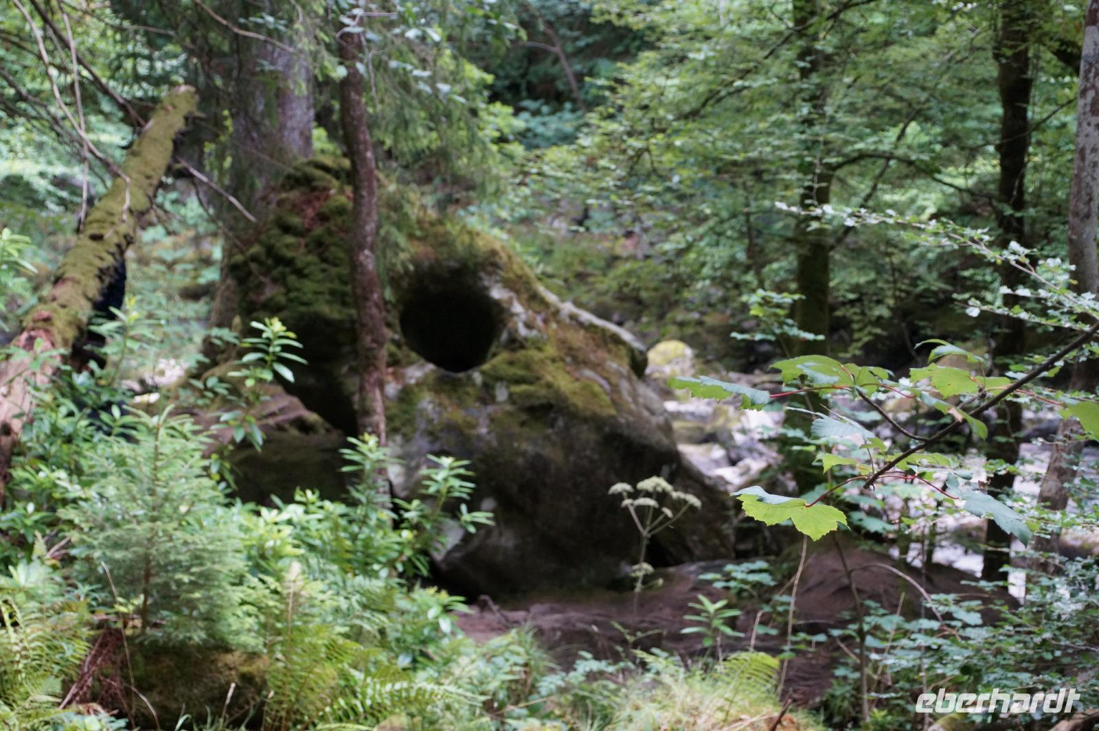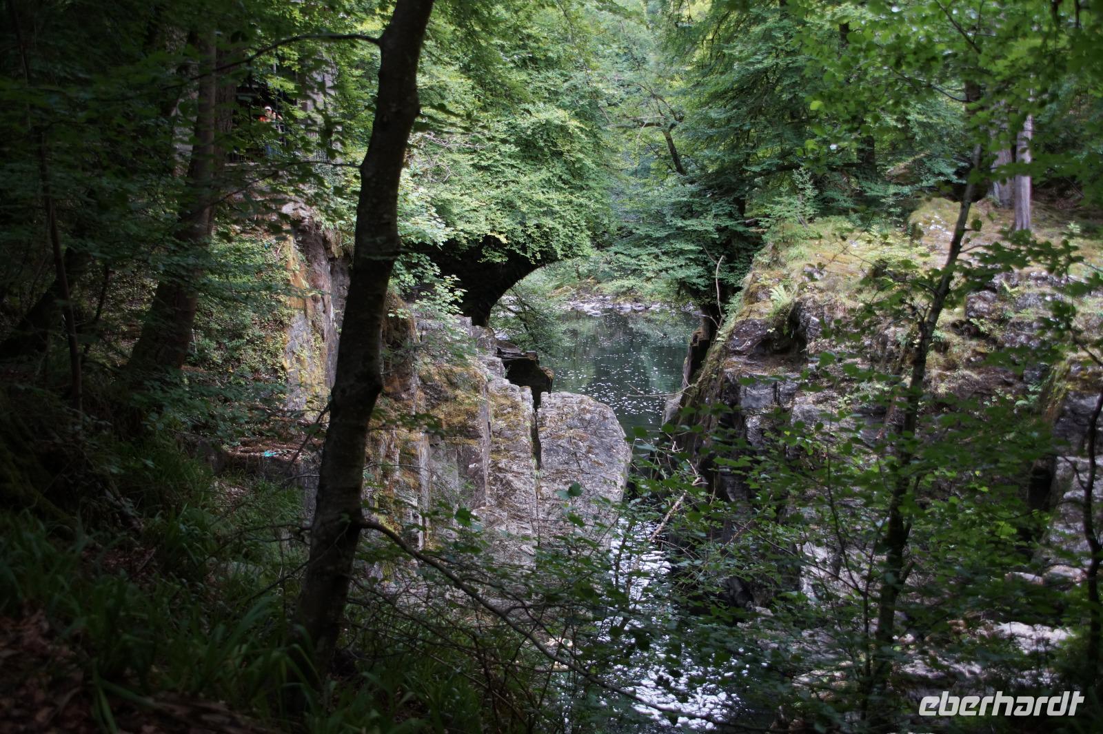 Auf der anderen Seite des Tay liegt die Mündung des Braan in den Tay. An dessen wildromantischen Ufern mit Stromschnellen und Wasserfällen liegt der als The Hermitage bekannte Wald, in dem sich Ossian's Cave und ~ Hall befinden. Ossian ist eine Erfindung des schottischen Schriftstellers James MacPherson (1736 - 1796), der behauptete, einen antiken gälischen Text, den er gefunden habe, ins Englische übersetzt zu haben.