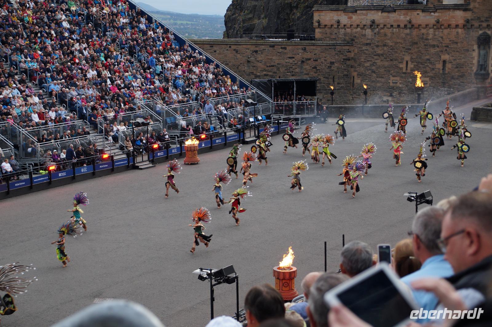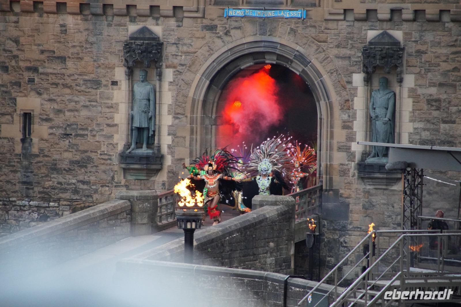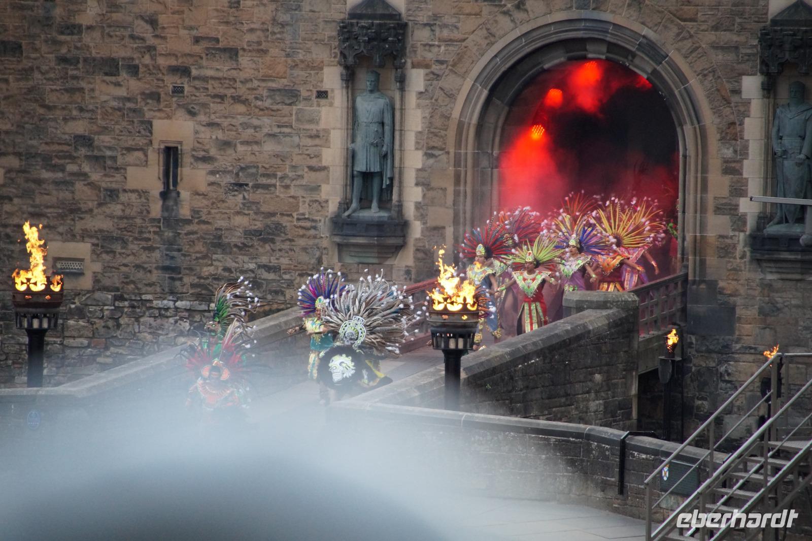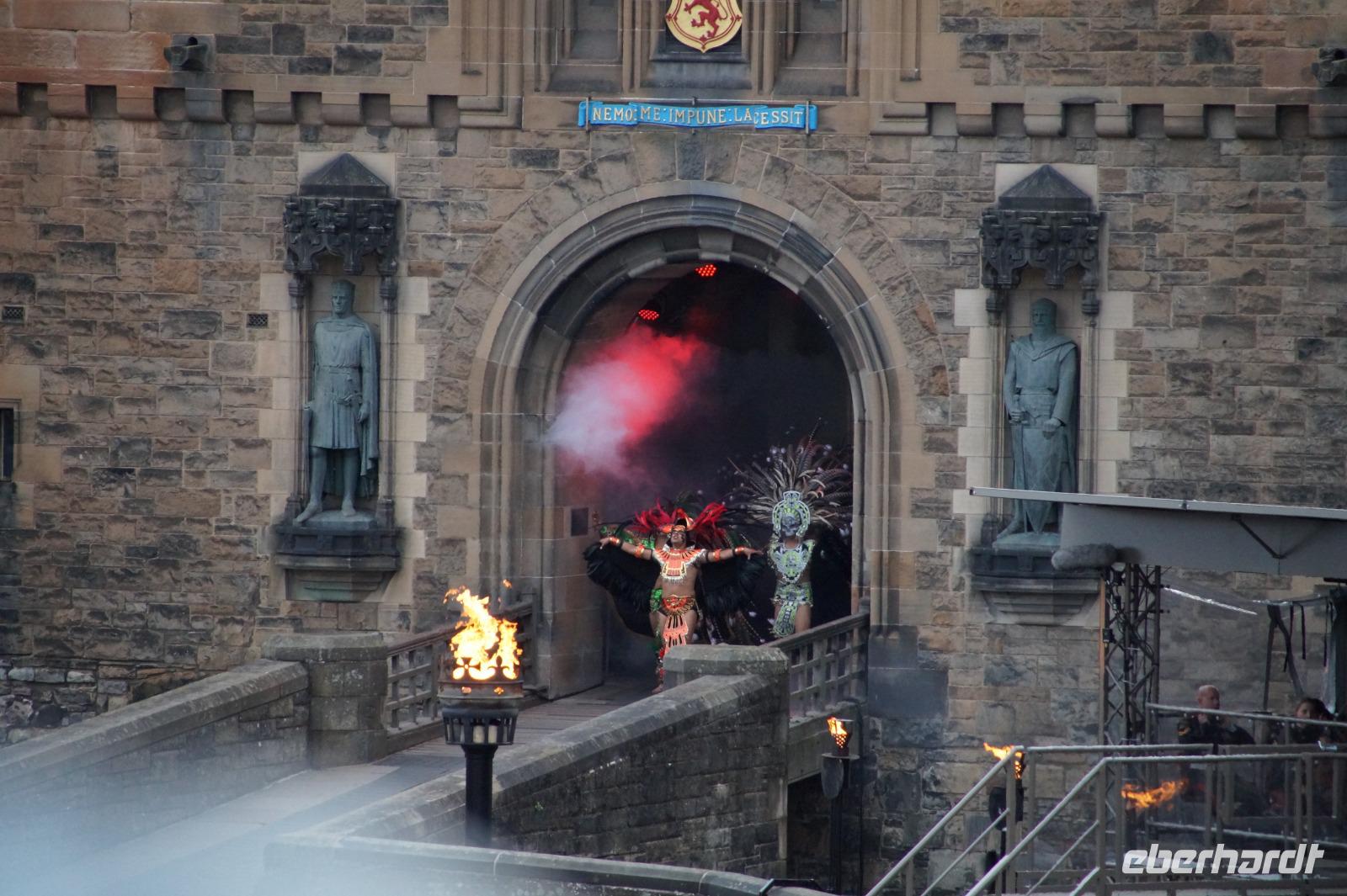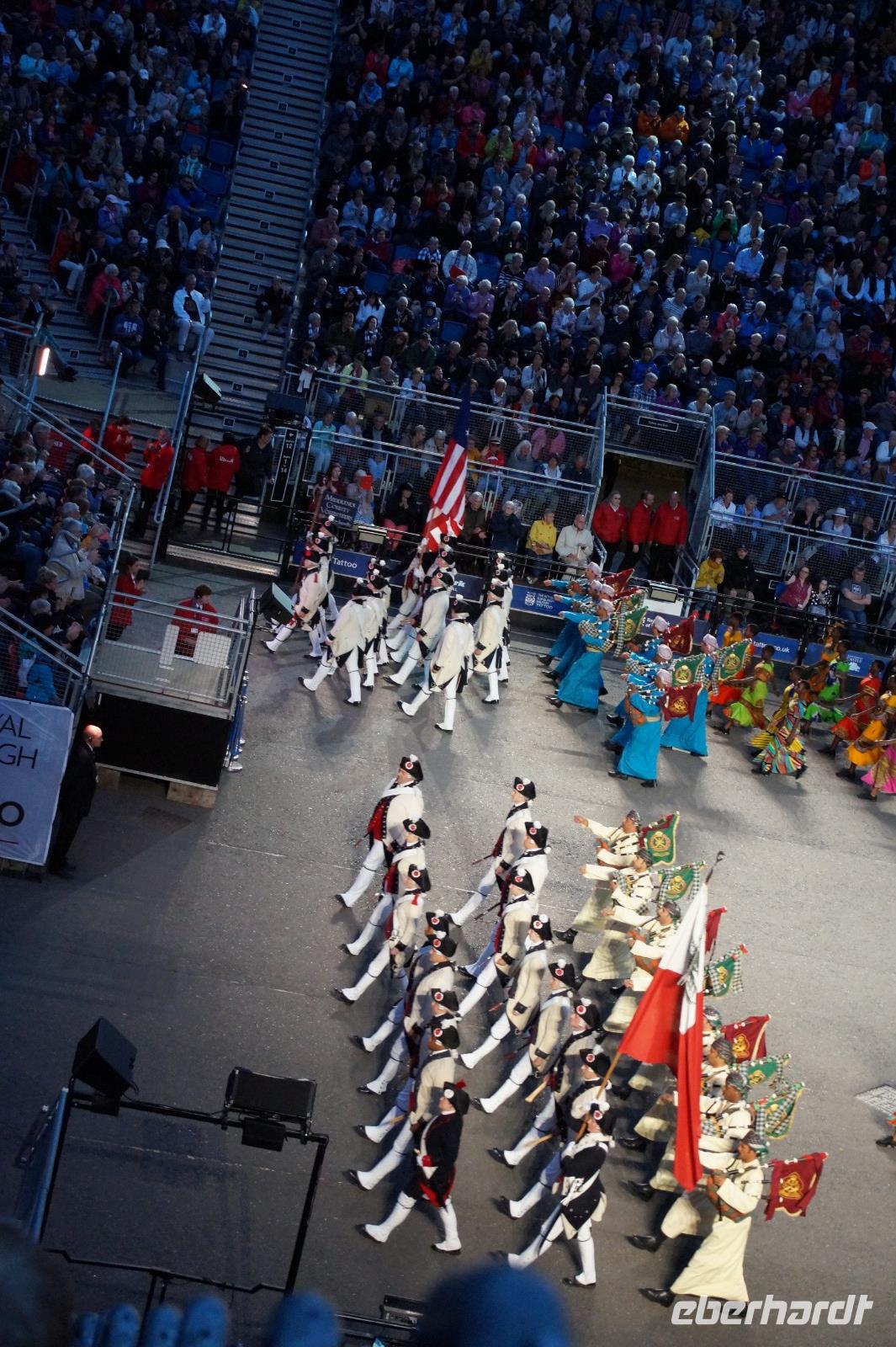 Das Royal Military Tattoo stand in diesem Jahr ganz im Zeichen des einhundertjährigen Bestehens der Royal Air Force und es kann und will seinen militärischen Charakter nicht verhehlen, wenn auch heute durchaus im Rahmen der Völkerverständigung. So waren neben einer malawischen Jugendgruppe, einem Freiwilligenregiment aus Middlesex County (Middlesex County Volunteers Fifes and Drums) auch wieder die Schweizer vom Top Secret Drum Corps dort, eine Militärkapelle aus dem Oman und aztekische Adlerkrieger verbreiteten mit ihrem Sturm auf das Exerzitiengelände Angst und Schrecken, bevor eine Mariachi-Band und eine Blaskapelle die Spannung mit Despacito auflösten. Äußerste Disziplin zeigte das Wachregiment der amerikanischen Luftwaffe. Am meisten Eindruck machten natürlich die verschiedenen Highlandregimenter mit ihren Bagpipes und Dudelsäcken, wegen denen kommt man in erster Linie zum Royal Military Tattoo nach Edinburgh. In der Endvorstellung tanzten schottische Tänzerinnen mit tschechischen, mexikanischen und malawischen Tänzerinnen und Tänzern zum Abschlussfeuerwerk. Danach zogen alle Mitwirkenden gemeinsam aus.