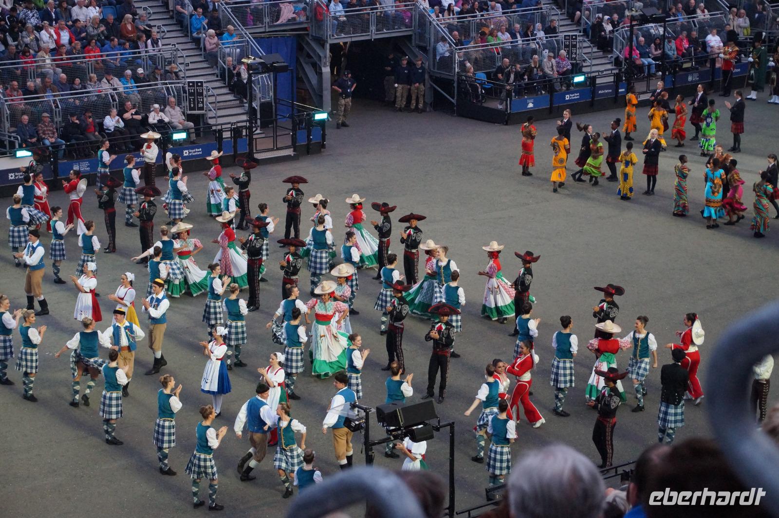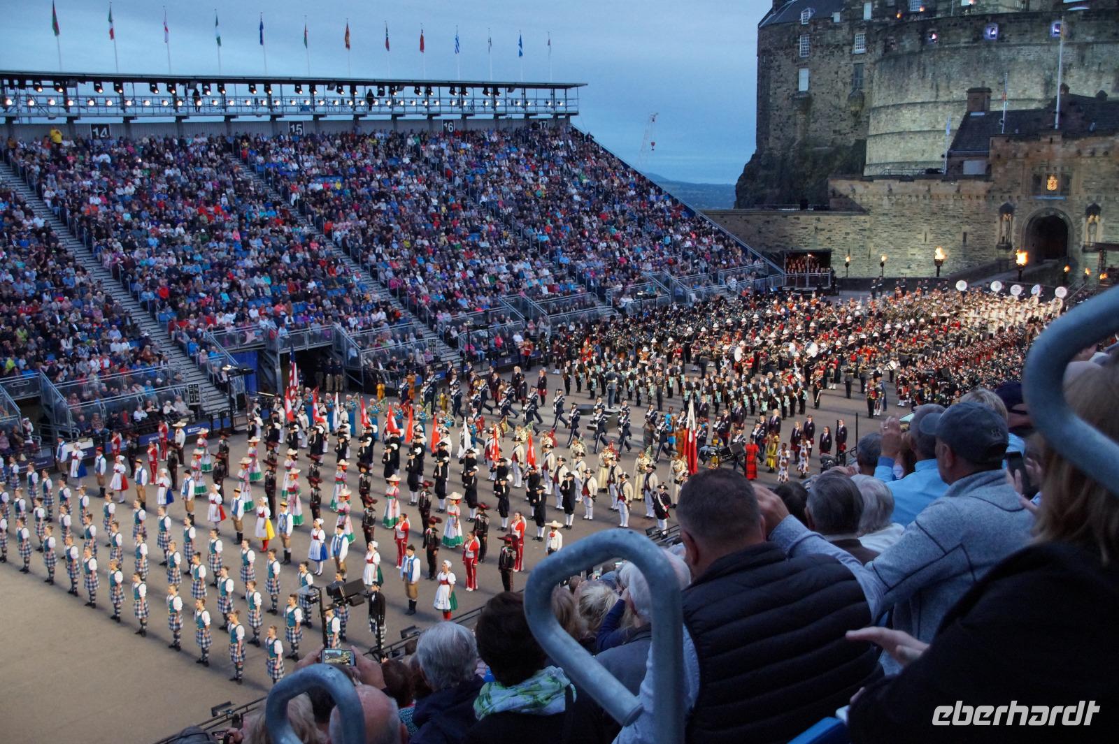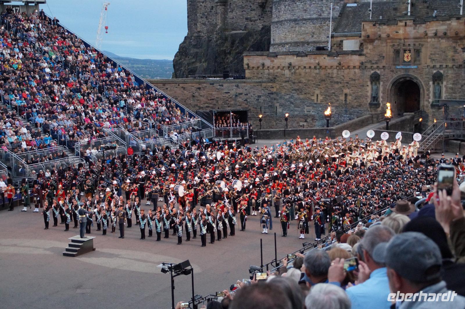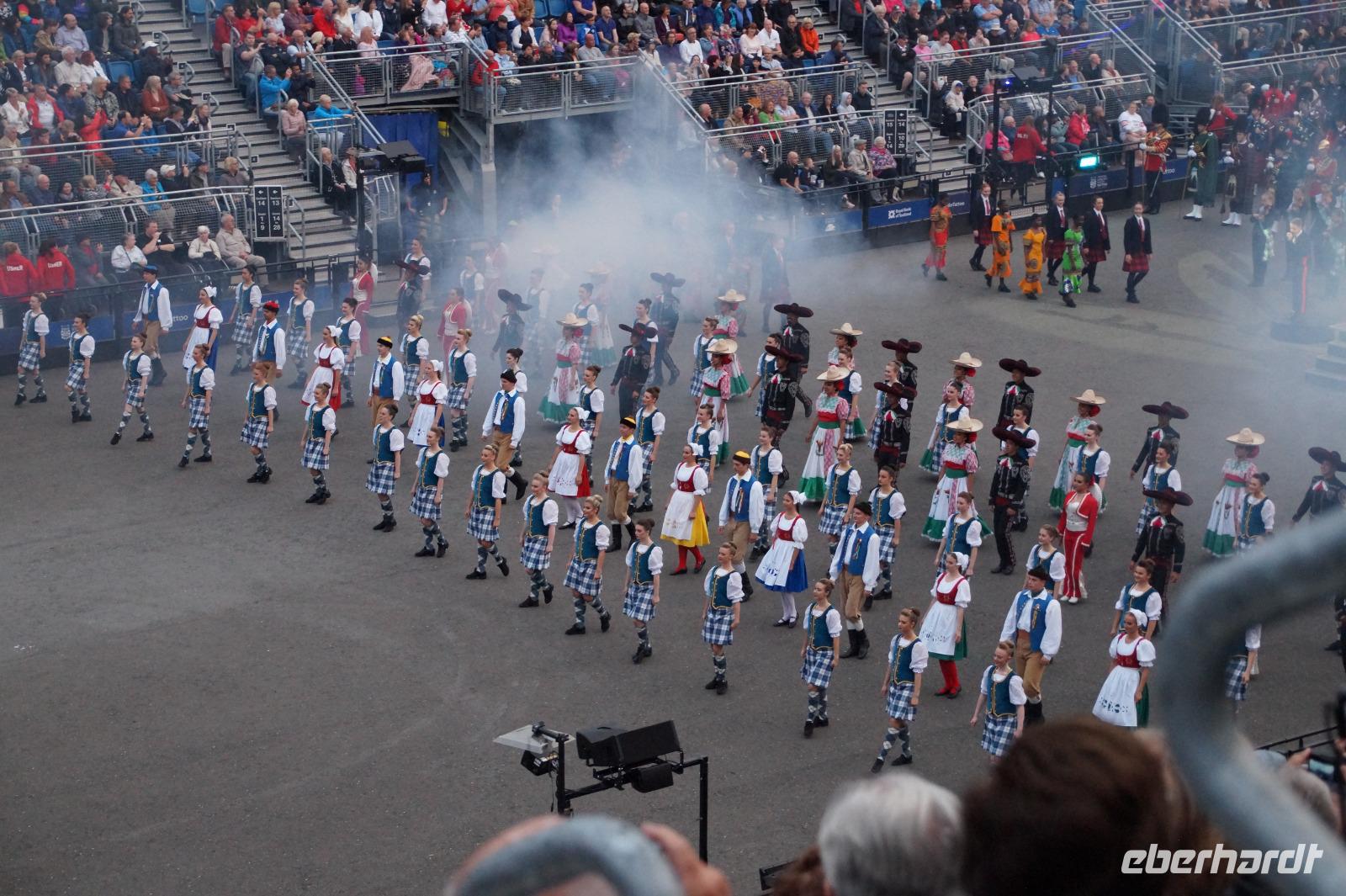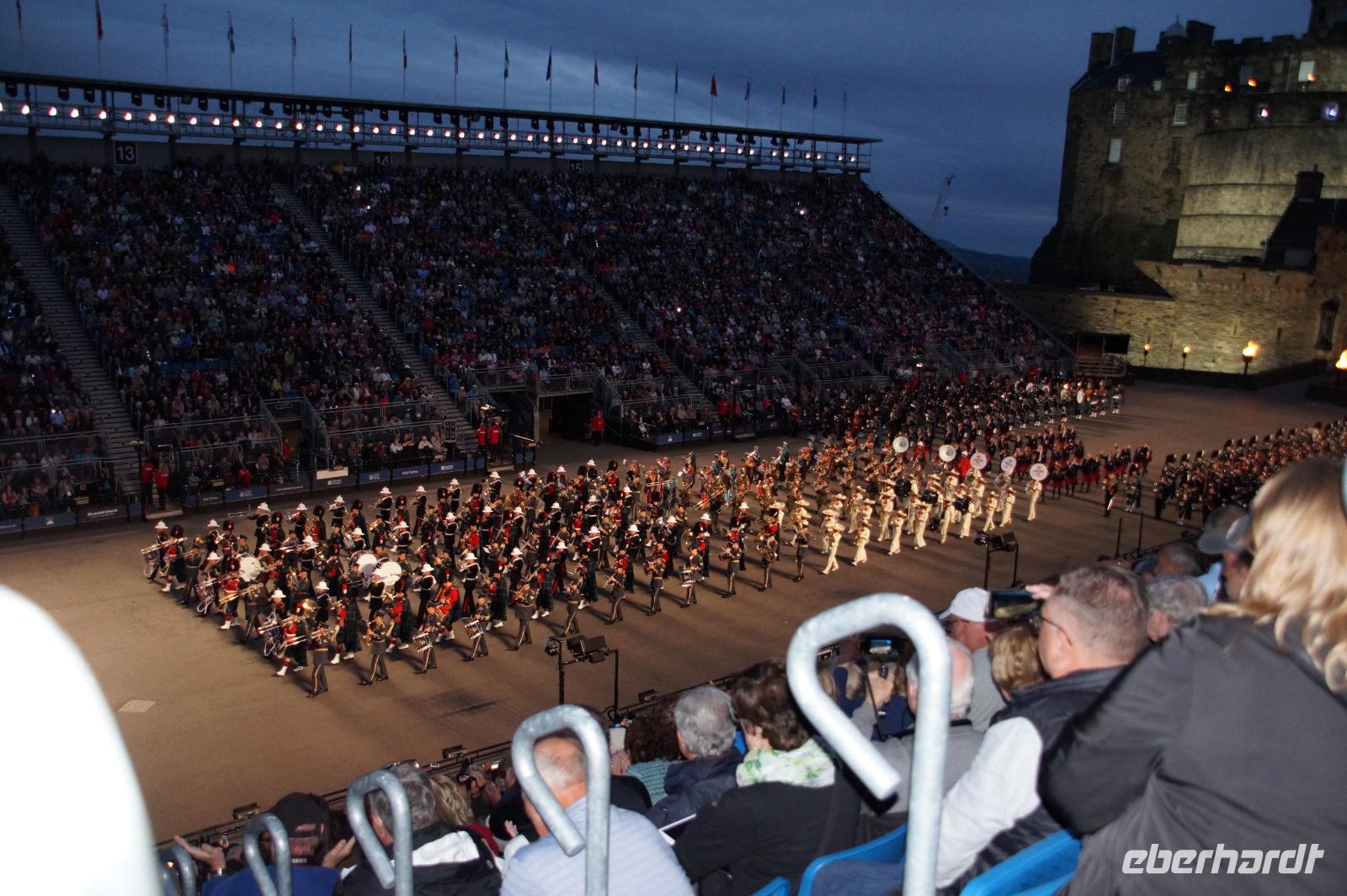 Das Royal Military Tattoo stand in diesem Jahr ganz im Zeichen des einhundertjährigen Bestehens der Royal Air Force und es kann und will seinen militärischen Charakter nicht verhehlen, wenn auch heute durchaus im Rahmen der Völkerverständigung. So waren neben einer malawischen Jugendgruppe, einem Freiwilligenregiment aus Middlesex County (Middlesex County Volunteers Fifes and Drums) auch wieder die Schweizer vom Top Secret Drum Corps dort, eine Militärkapelle aus dem Oman und aztekische Adlerkrieger verbreiteten mit ihrem Sturm auf das Exerzitiengelände Angst und Schrecken, bevor eine Mariachi-Band und eine Blaskapelle die Spannung mit Despacito auflösten. Äußerste Disziplin zeigte das Wachregiment der amerikanischen Luftwaffe. Am meisten Eindruck machten natürlich die verschiedenen Highlandregimenter mit ihren Bagpipes und Dudelsäcken, wegen denen kommt man in erster Linie zum Royal Military Tattoo nach Edinburgh. In der Endvorstellung tanzten schottische Tänzerinnen mit tschechischen, mexikanischen und malawischen Tänzerinnen und Tänzern zum Abschlussfeuerwerk. Danach zogen alle Mitwirkenden gemeinsam aus.
