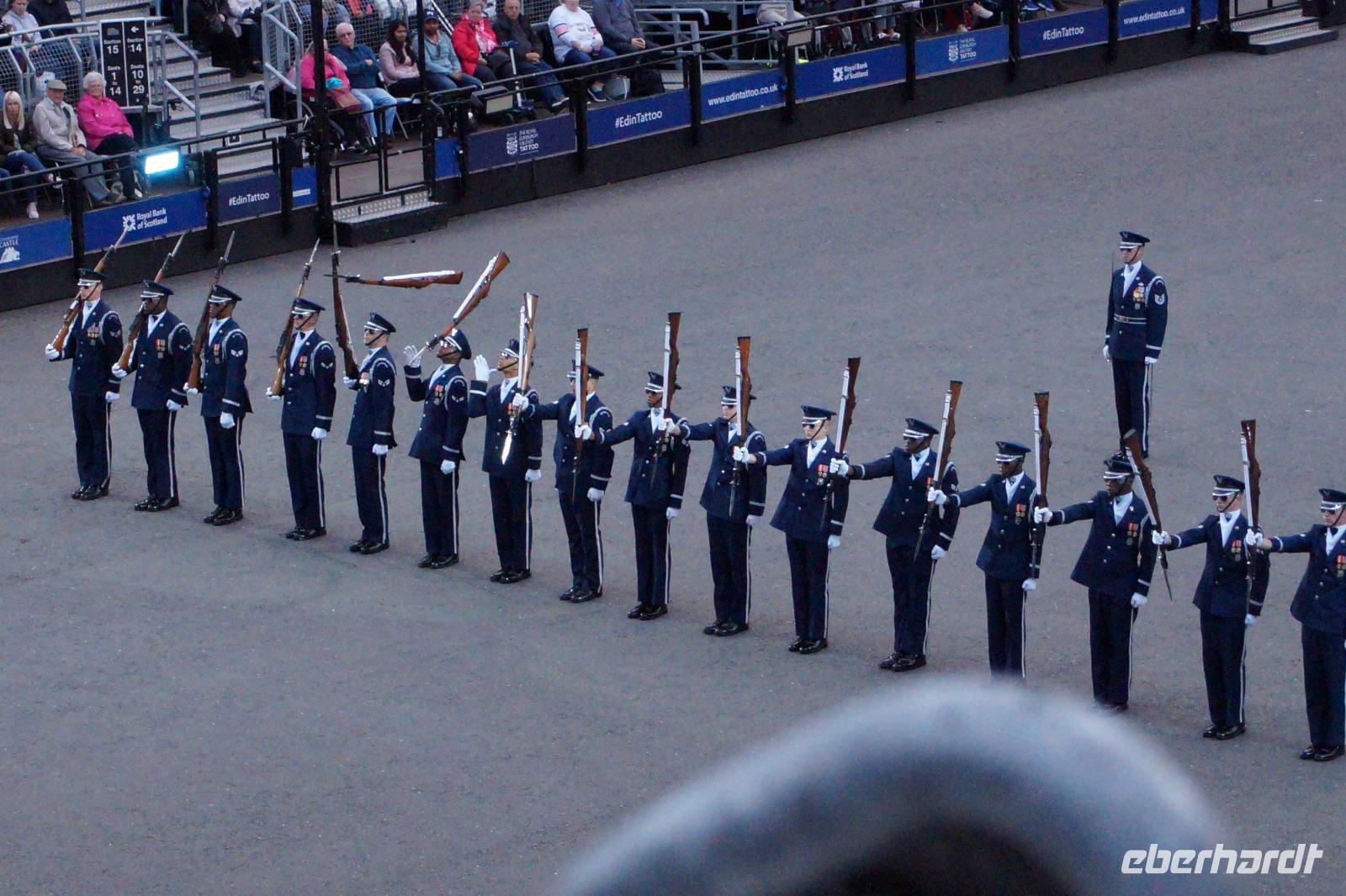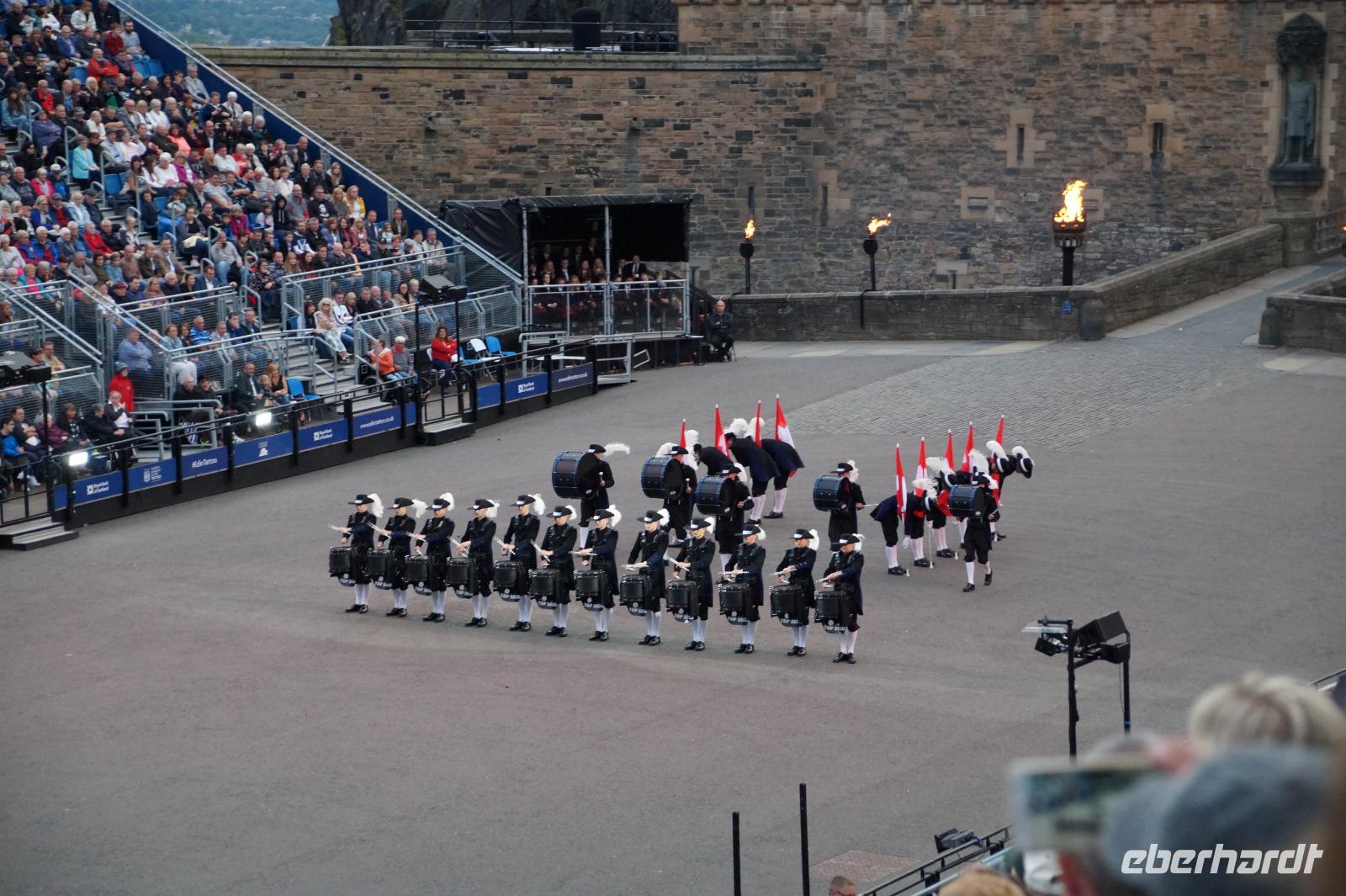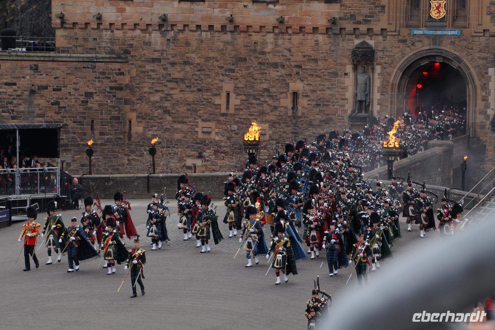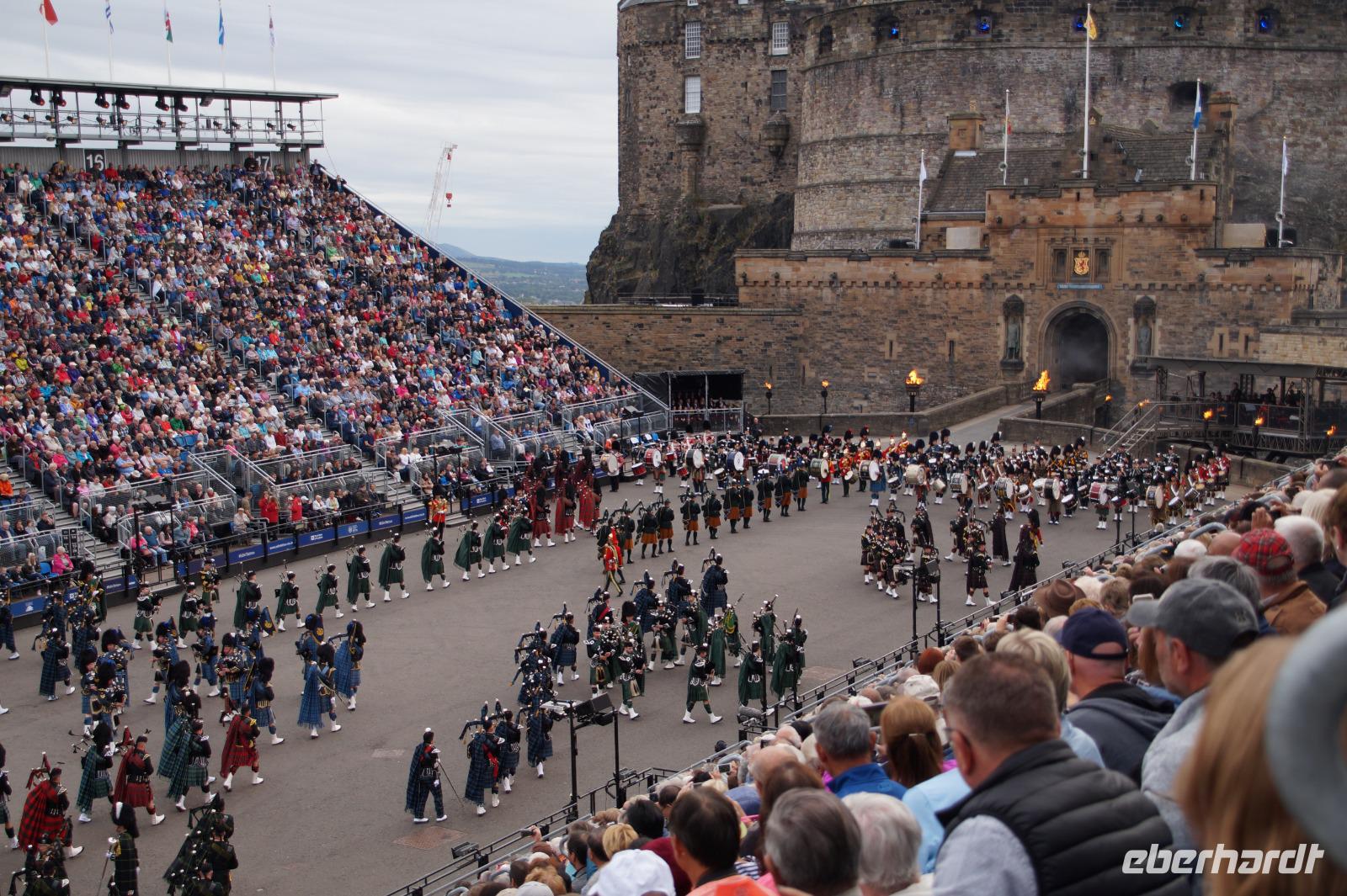 Das Royal Military Tattoo stand in diesem Jahr ganz im Zeichen des einhundertjährigen Bestehens der Royal Air Force und es kann und will seinen militärischen Charakter nicht verhehlen, wenn auch heute durchaus im Rahmen der Völkerverständigung. So waren neben einer malawischen Jugendgruppe, einem Freiwilligenregiment aus Middlesex County (Middlesex County Volunteers Fifes and Drums) auch wieder die Schweizer vom Top Secret Drum Corps dort, eine Militärkapelle aus dem Oman und aztekische Adlerkrieger verbreiteten mit ihrem Sturm auf das Exerzitiengelände Angst und Schrecken, bevor eine Mariachi-Band und eine Blaskapelle die Spannung mit Despacito auflösten. Äußerste Disziplin zeigte das Wachregiment der amerikanischen Luftwaffe. Am meisten Eindruck machten natürlich die verschiedenen Highlandregimenter mit ihren Bagpipes und Dudelsäcken, wegen denen kommt man in erster Linie zum Royal Military Tattoo nach Edinburgh. In der Endvorstellung tanzten schottische Tänzerinnen mit tschechischen, mexikanischen und malawischen Tänzerinnen und Tänzern zum Abschlussfeuerwerk. Danach zogen alle Mitwirkenden gemeinsam aus.