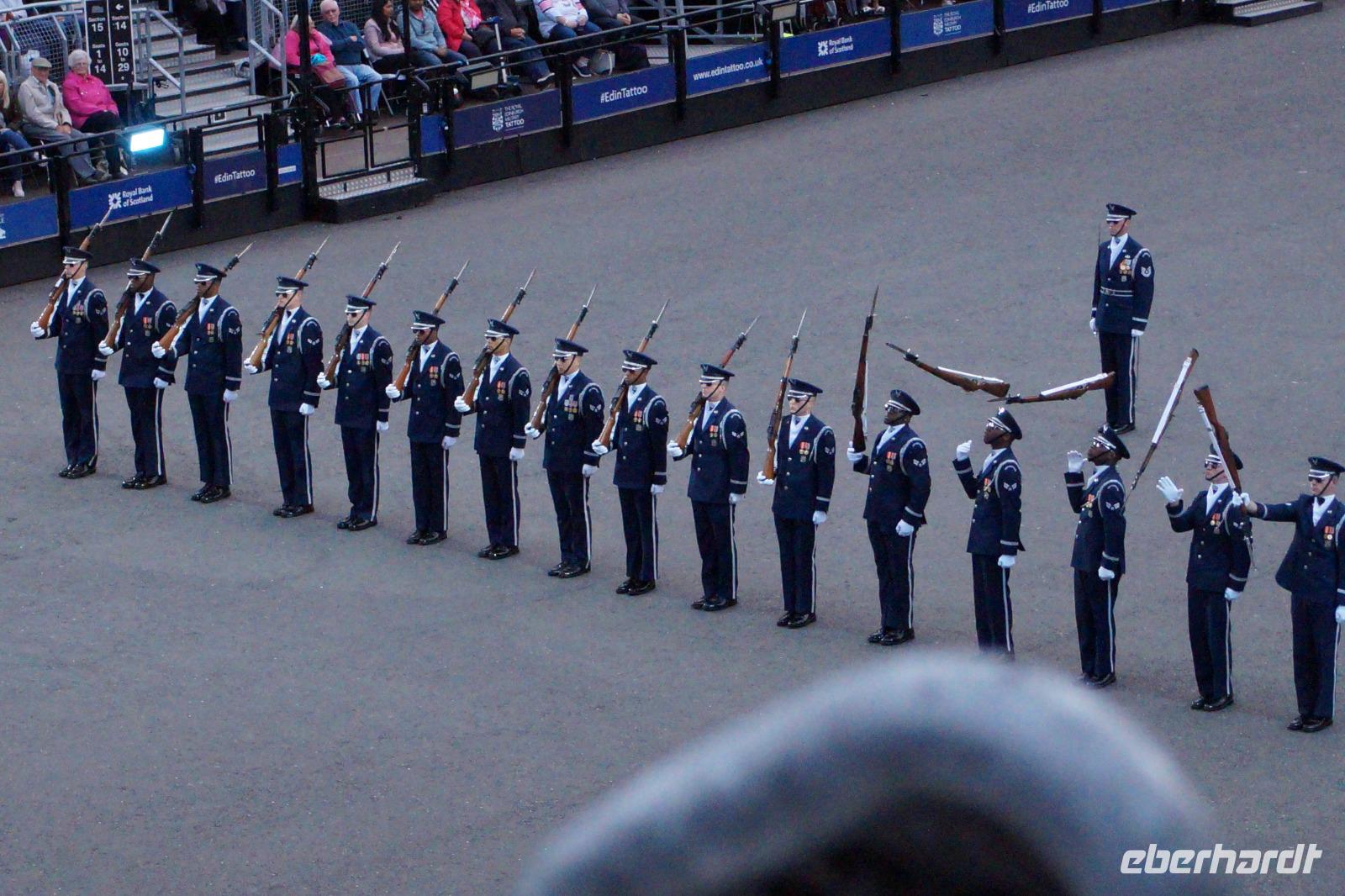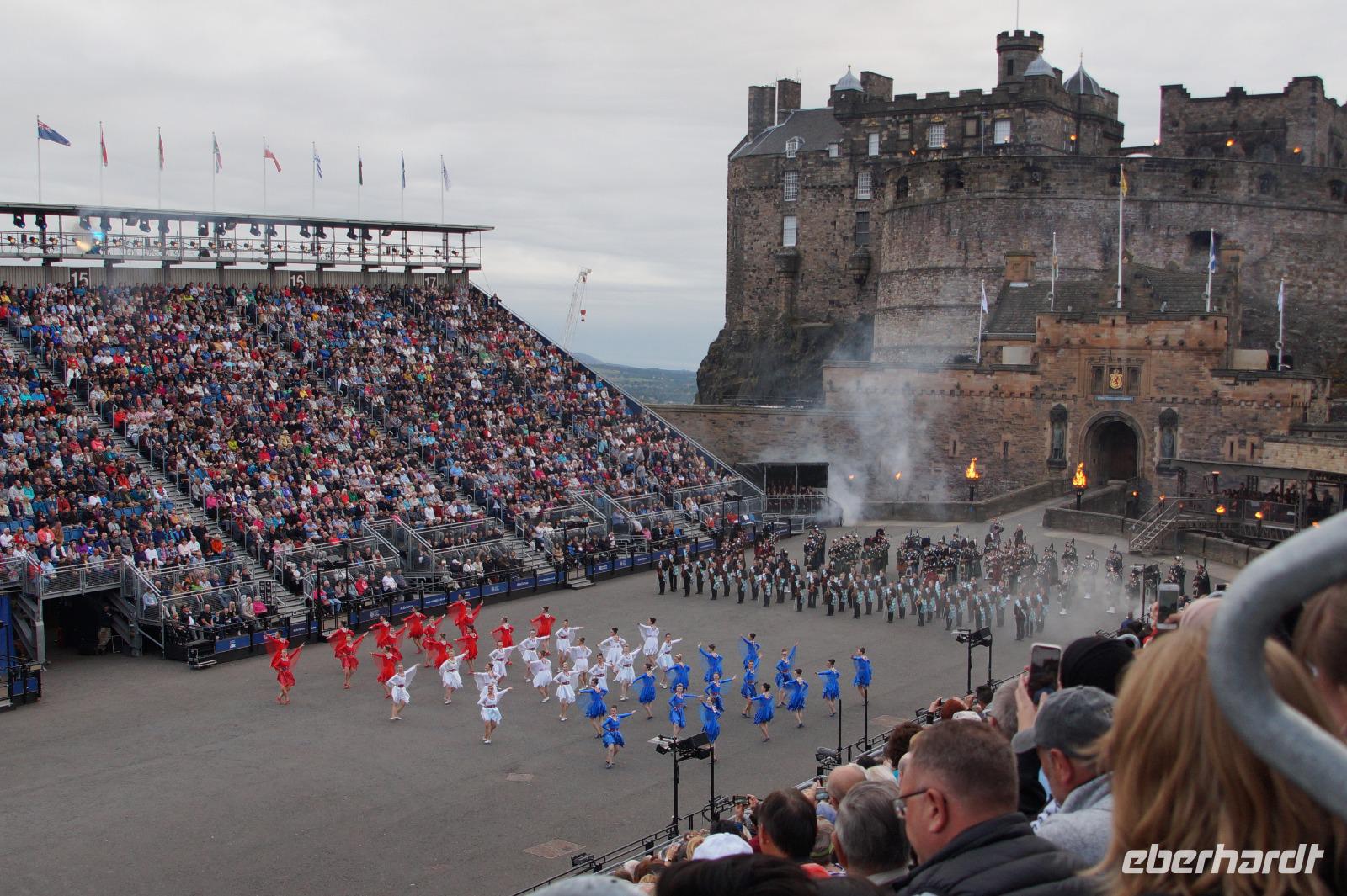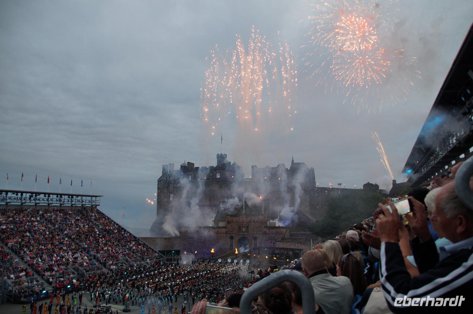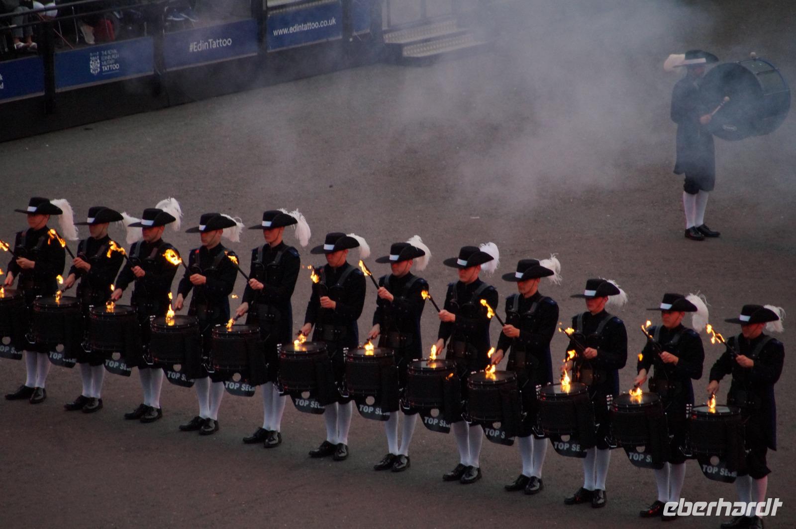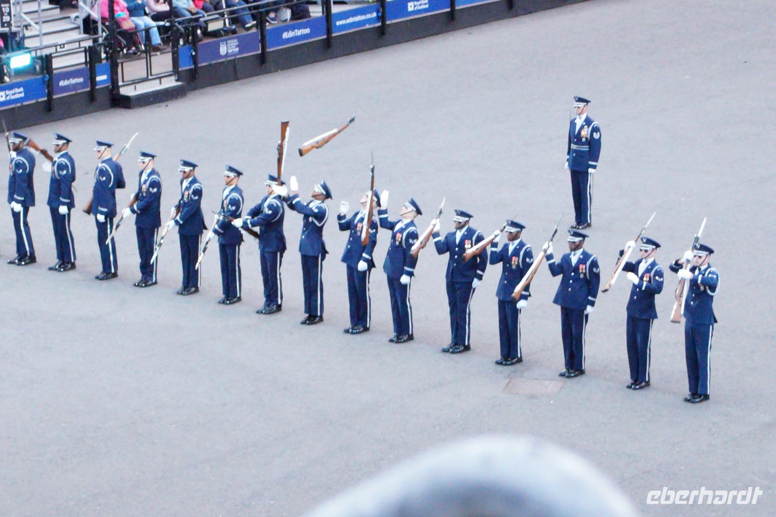 Das Royal Military Tattoo stand in diesem Jahr ganz im Zeichen des einhundertjährigen Bestehens der Royal Air Force und es kann und will seinen militärischen Charakter nicht verhehlen, wenn auch heute durchaus im Rahmen der Völkerverständigung. So waren neben einer malawischen Jugendgruppe, einem Freiwilligenregiment aus Middlesex County (Middlesex County Volunteers Fifes and Drums) auch wieder die Schweizer vom Top Secret Drum Corps dort, eine Militärkapelle aus dem Oman und aztekische Adlerkrieger verbreiteten mit ihrem Sturm auf das Exerzitiengelände Angst und Schrecken, bevor eine Mariachi-Band und eine Blaskapelle die Spannung mit Despacito auflösten. Äußerste Disziplin zeigte das Wachregiment der amerikanischen Luftwaffe. Am meisten Eindruck machten natürlich die verschiedenen Highlandregimenter mit ihren Bagpipes und Dudelsäcken, wegen denen kommt man in erster Linie zum Royal Military Tattoo nach Edinburgh. In der Endvorstellung tanzten schottische Tänzerinnen mit tschechischen, mexikanischen und malawischen Tänzerinnen und Tänzern zum Abschlussfeuerwerk. Danach zogen alle Mitwirkenden gemeinsam aus.