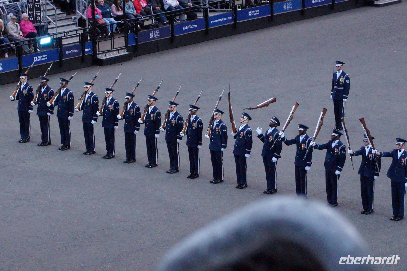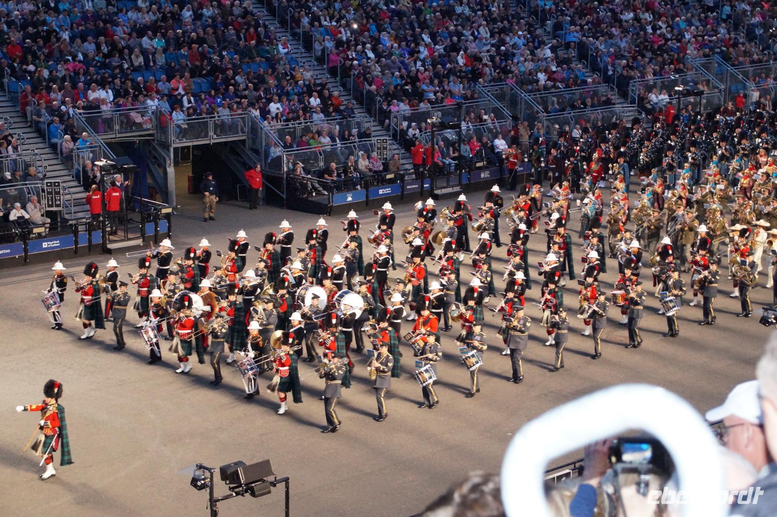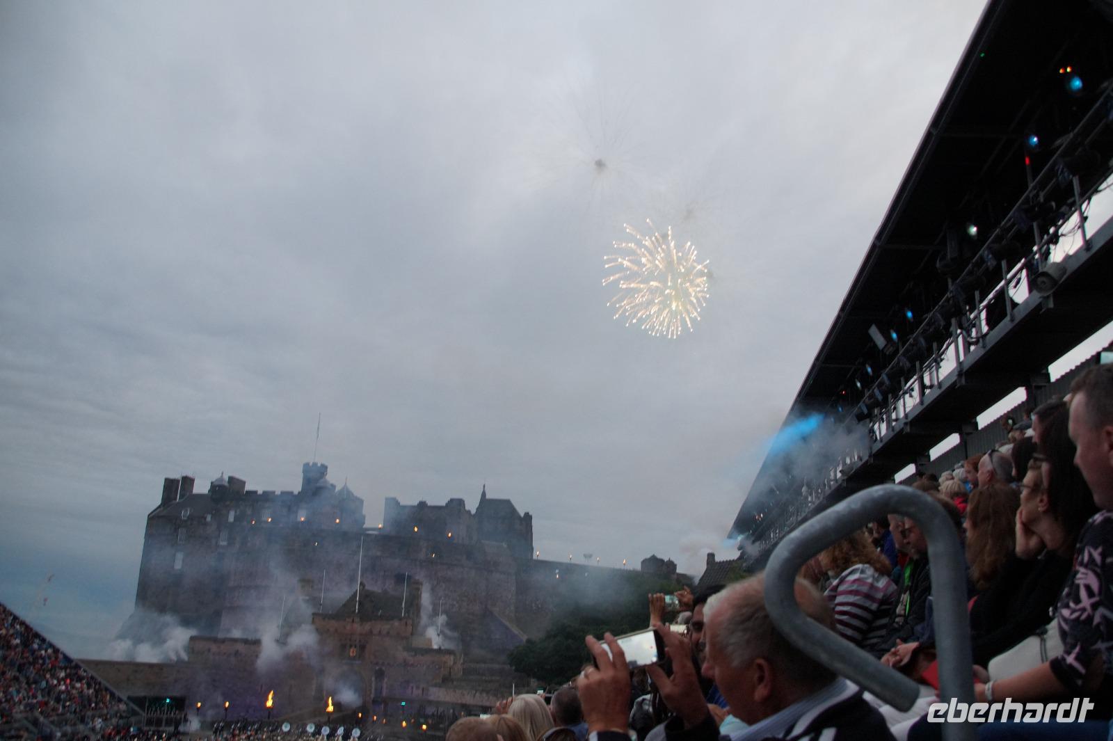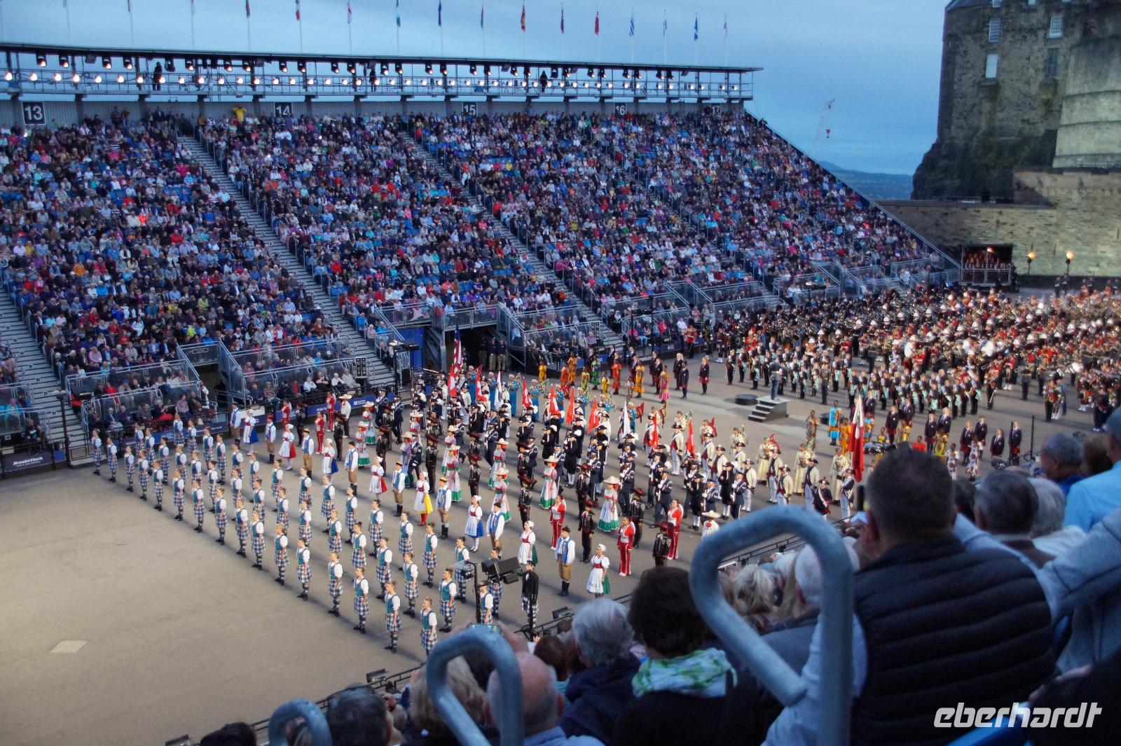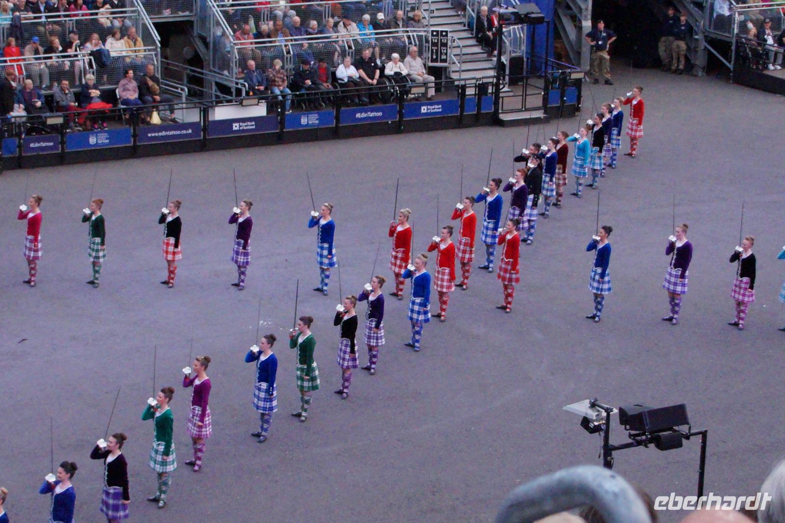 Das Royal Military Tattoo stand in diesem Jahr ganz im Zeichen des einhundertjährigen Bestehens der Royal Air Force und es kann und will seinen militärischen Charakter nicht verhehlen, wenn auch heute durchaus im Rahmen der Völkerverständigung. So waren neben einer malawischen Jugendgruppe, einem Freiwilligenregiment aus Middlesex County (Middlesex County Volunteers Fifes and Drums) auch wieder die Schweizer vom Top Secret Drum Corps dort, eine Militärkapelle aus dem Oman und aztekische Adlerkrieger verbreiteten mit ihrem Sturm auf das Exerzitiengelände Angst und Schrecken, bevor eine Mariachi-Band und eine Blaskapelle die Spannung mit Despacito auflösten. Äußerste Disziplin zeigte das Wachregiment der amerikanischen Luftwaffe. Am meisten Eindruck machten natürlich die verschiedenen Highlandregimenter mit ihren Bagpipes und Dudelsäcken, wegen denen kommt man in erster Linie zum Royal Military Tattoo nach Edinburgh. In der Endvorstellung tanzten schottische Tänzerinnen mit tschechischen, mexikanischen und malawischen Tänzerinnen und Tänzern zum Abschlussfeuerwerk. Danach zogen alle Mitwirkenden gemeinsam aus.