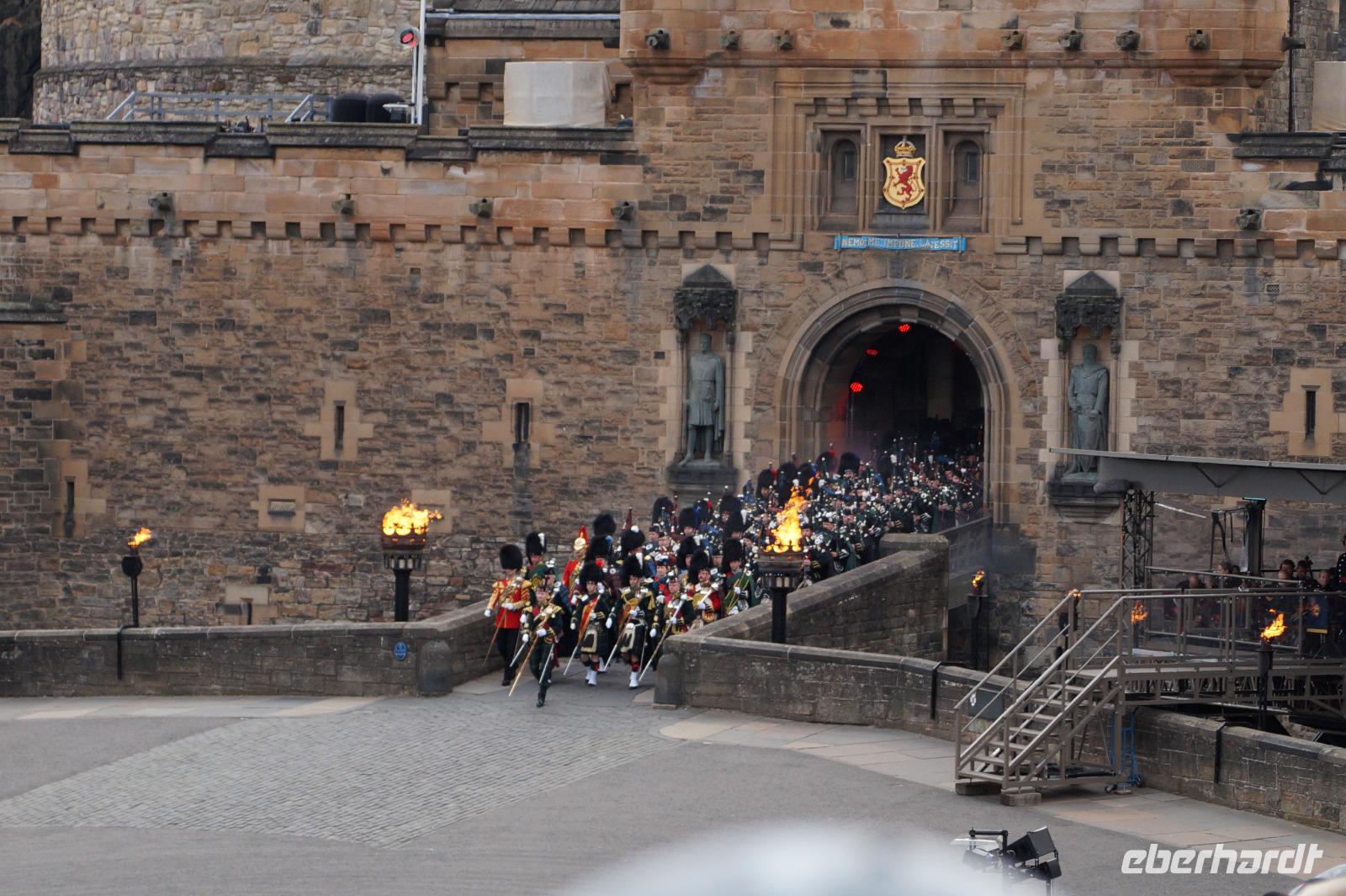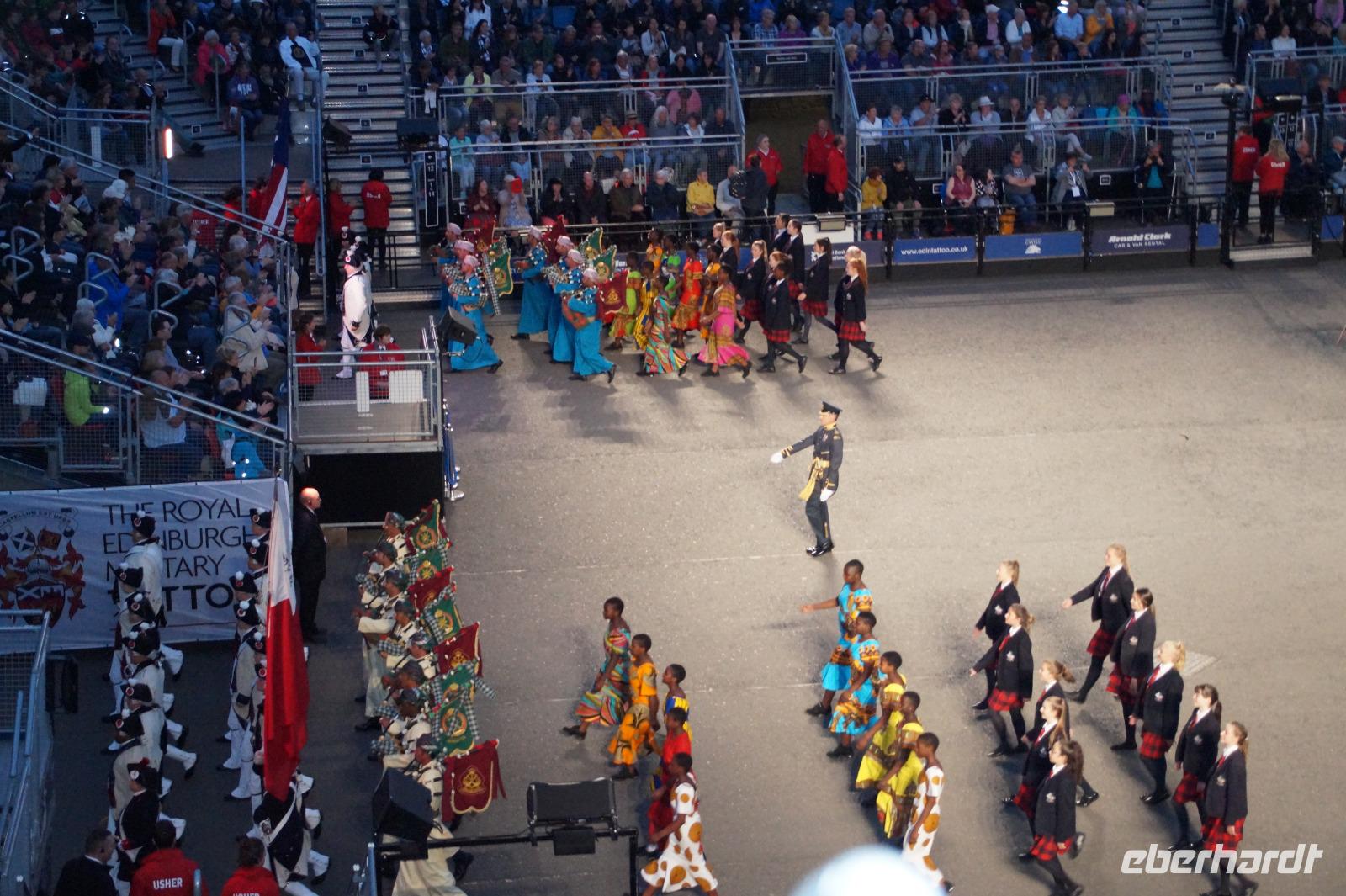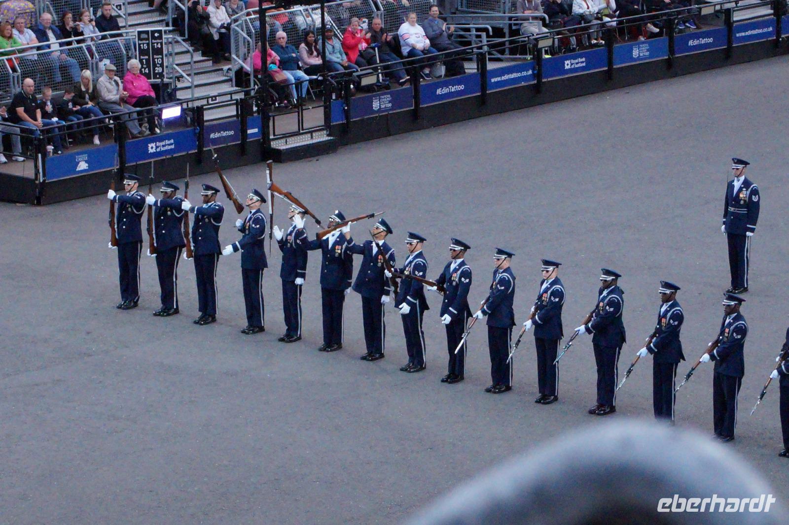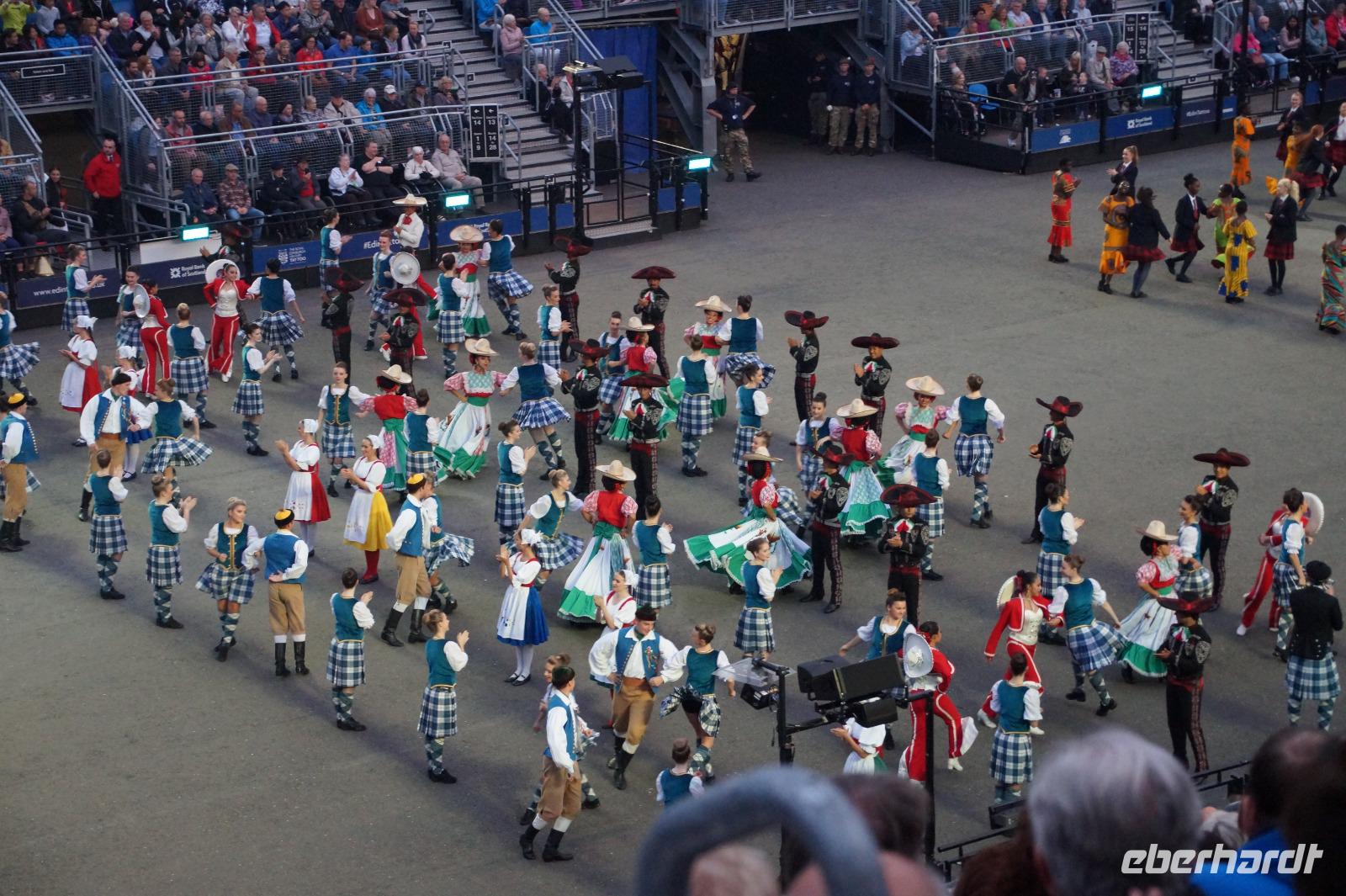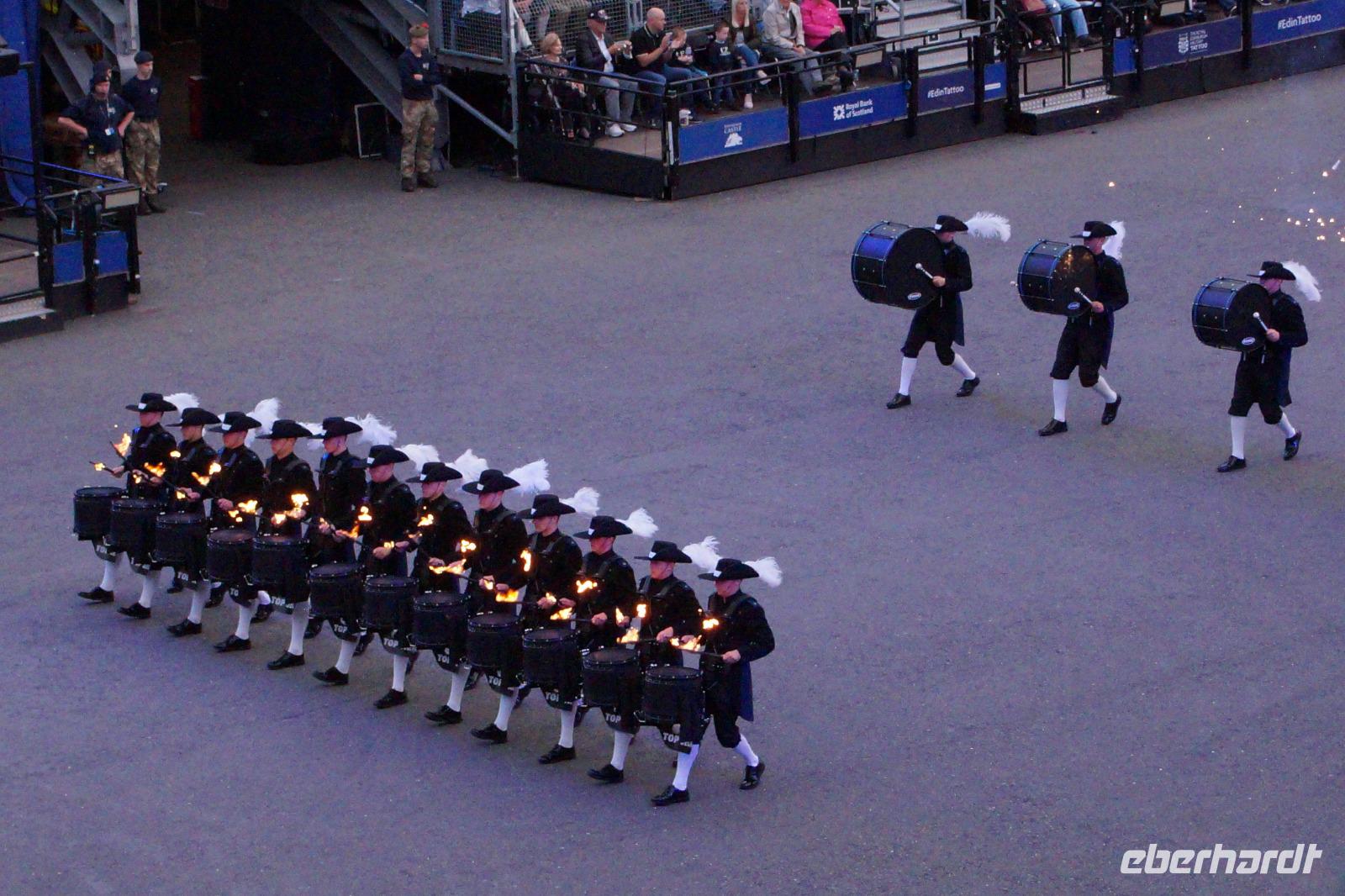 Das Royal Military Tattoo stand in diesem Jahr ganz im Zeichen des einhundertjährigen Bestehens der Royal Air Force und es kann und will seinen militärischen Charakter nicht verhehlen, wenn auch heute durchaus im Rahmen der Völkerverständigung. So waren neben einer malawischen Jugendgruppe, einem Freiwilligenregiment aus Middlesex County (Middlesex County Volunteers Fifes and Drums) auch wieder die Schweizer vom Top Secret Drum Corps dort, eine Militärkapelle aus dem Oman und aztekische Adlerkrieger verbreiteten mit ihrem Sturm auf das Exerzitiengelände Angst und Schrecken, bevor eine Mariachi-Band und eine Blaskapelle die Spannung mit Despacito auflösten. Äußerste Disziplin zeigte das Wachregiment der amerikanischen Luftwaffe. Am meisten Eindruck machten natürlich die verschiedenen Highlandregimenter mit ihren Bagpipes und Dudelsäcken, wegen denen kommt man in erster Linie zum Royal Military Tattoo nach Edinburgh. In der Endvorstellung tanzten schottische Tänzerinnen mit tschechischen, mexikanischen und malawischen Tänzerinnen und Tänzern zum Abschlussfeuerwerk. Danach zogen alle Mitwirkenden gemeinsam aus.