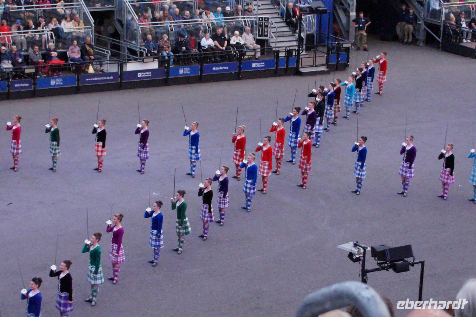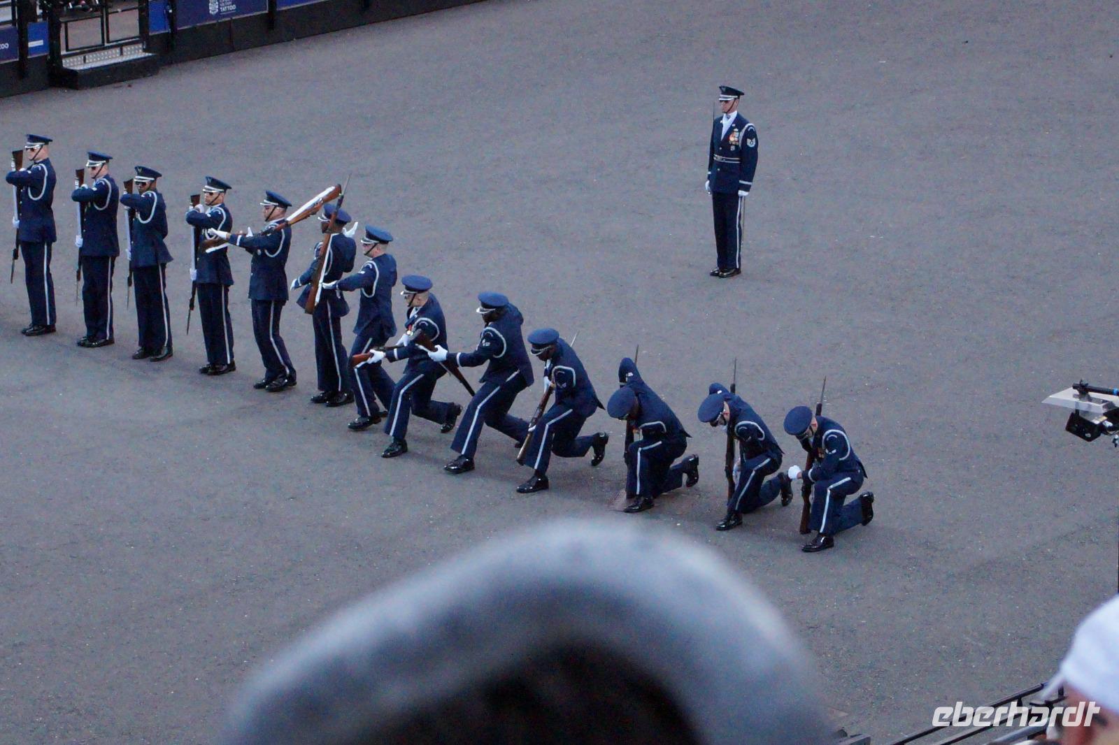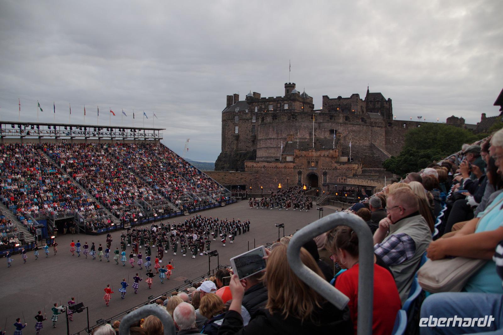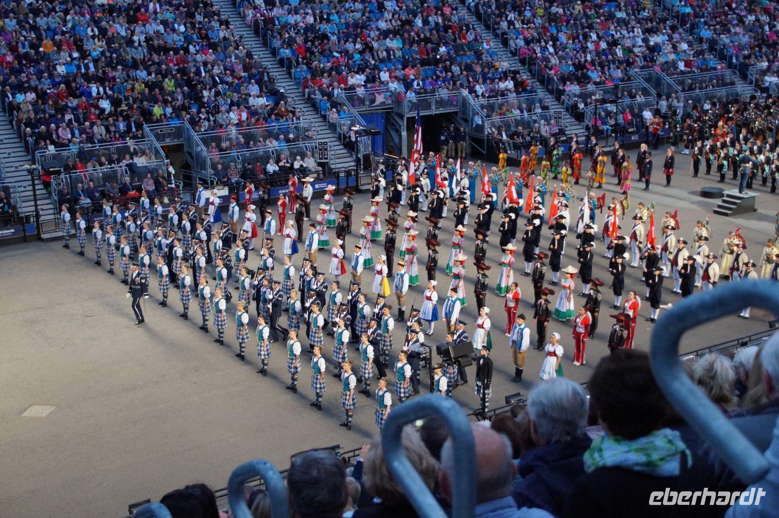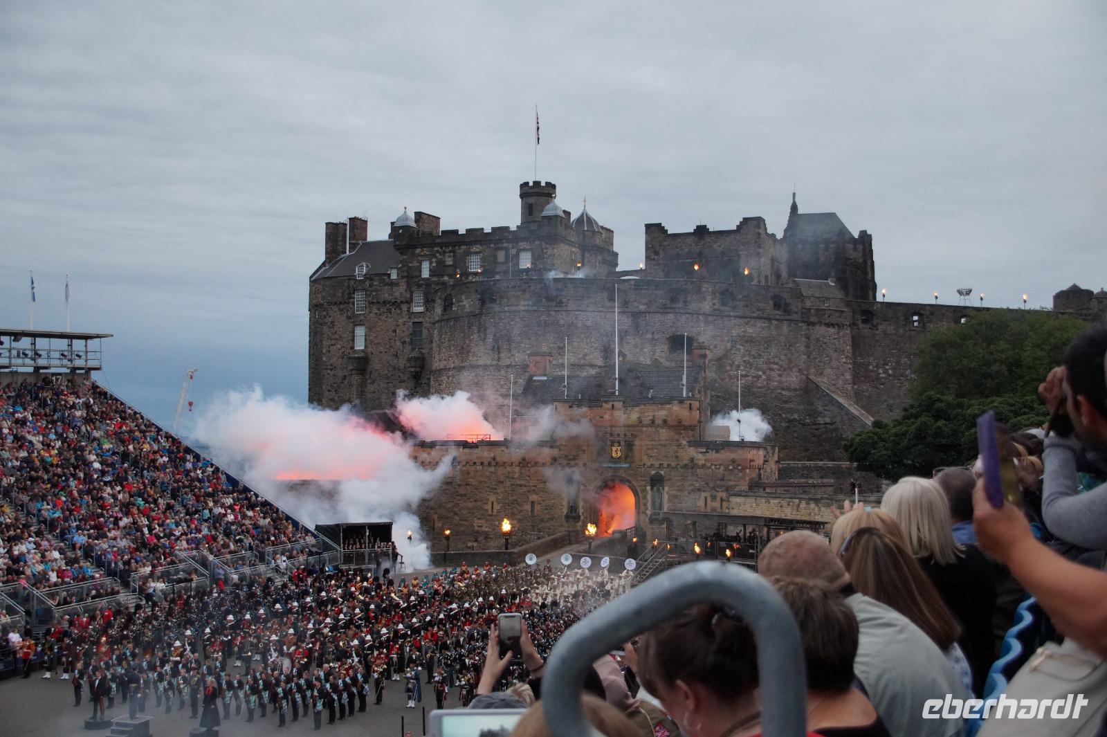 Das Royal Military Tattoo stand in diesem Jahr ganz im Zeichen des einhundertjährigen Bestehens der Royal Air Force und es kann und will seinen militärischen Charakter nicht verhehlen, wenn auch heute durchaus im Rahmen der Völkerverständigung. So waren neben einer malawischen Jugendgruppe, einem Freiwilligenregiment aus Middlesex County (Middlesex County Volunteers Fifes and Drums) auch wieder die Schweizer vom Top Secret Drum Corps dort, eine Militärkapelle aus dem Oman und aztekische Adlerkrieger verbreiteten mit ihrem Sturm auf das Exerzitiengelände Angst und Schrecken, bevor eine Mariachi-Band und eine Blaskapelle die Spannung mit Despacito auflösten. Äußerste Disziplin zeigte das Wachregiment der amerikanischen Luftwaffe. Am meisten Eindruck machten natürlich die verschiedenen Highlandregimenter mit ihren Bagpipes und Dudelsäcken, wegen denen kommt man in erster Linie zum Royal Military Tattoo nach Edinburgh. In der Endvorstellung tanzten schottische Tänzerinnen mit tschechischen, mexikanischen und malawischen Tänzerinnen und Tänzern zum Abschlussfeuerwerk. Danach zogen alle Mitwirkenden gemeinsam aus.