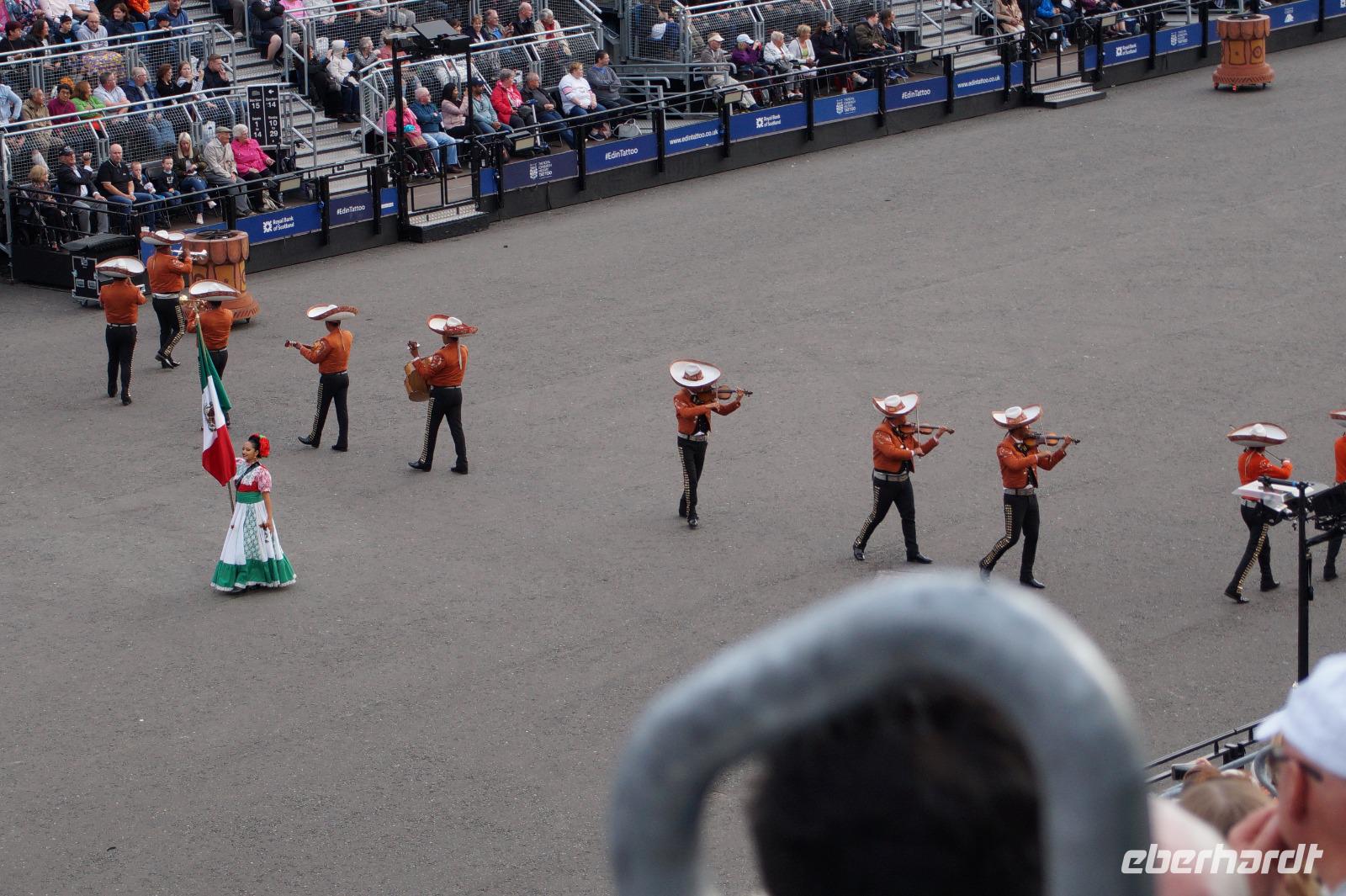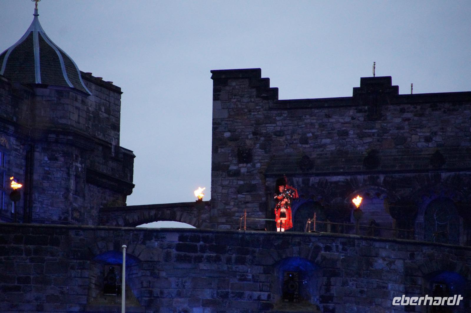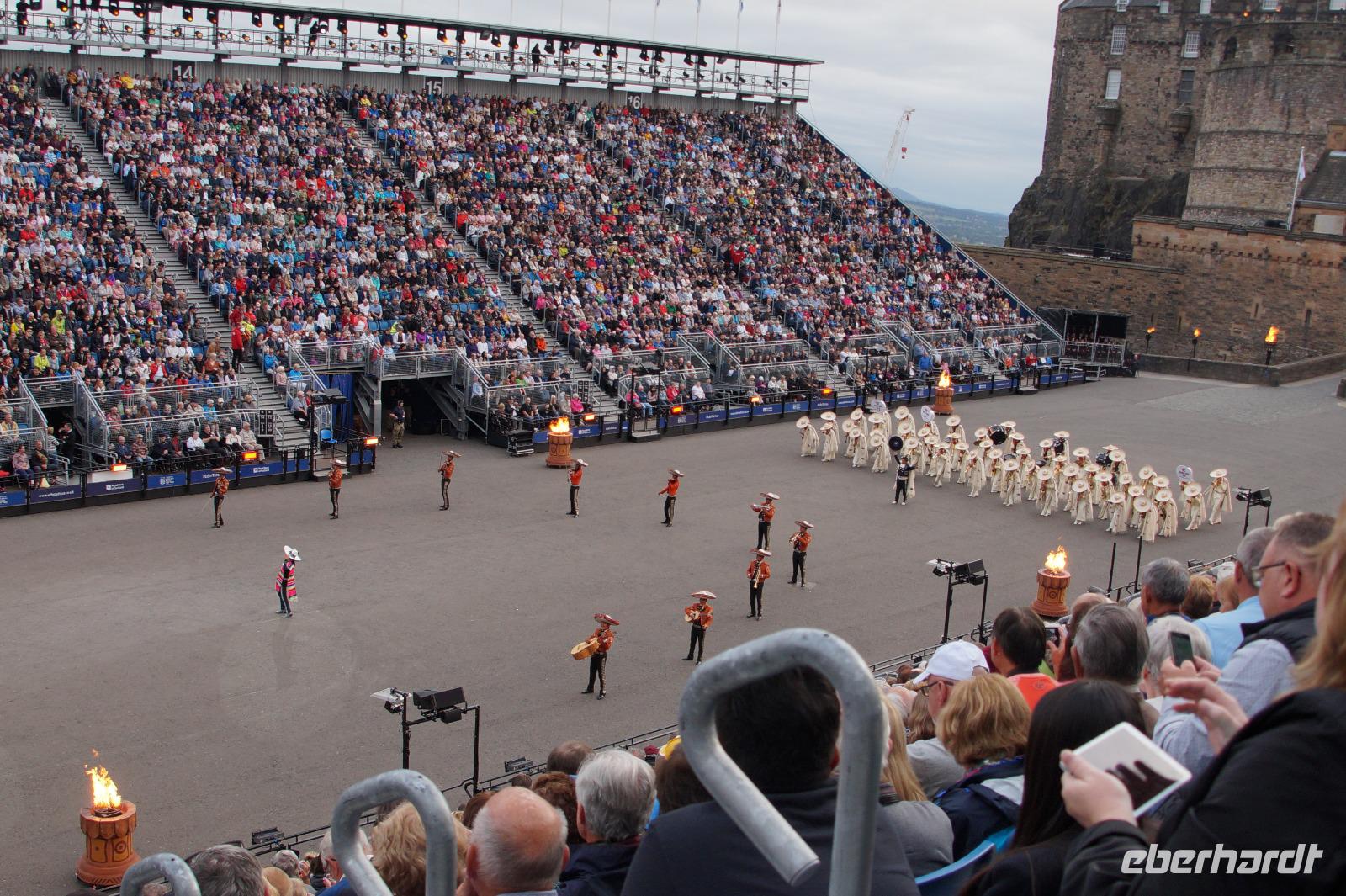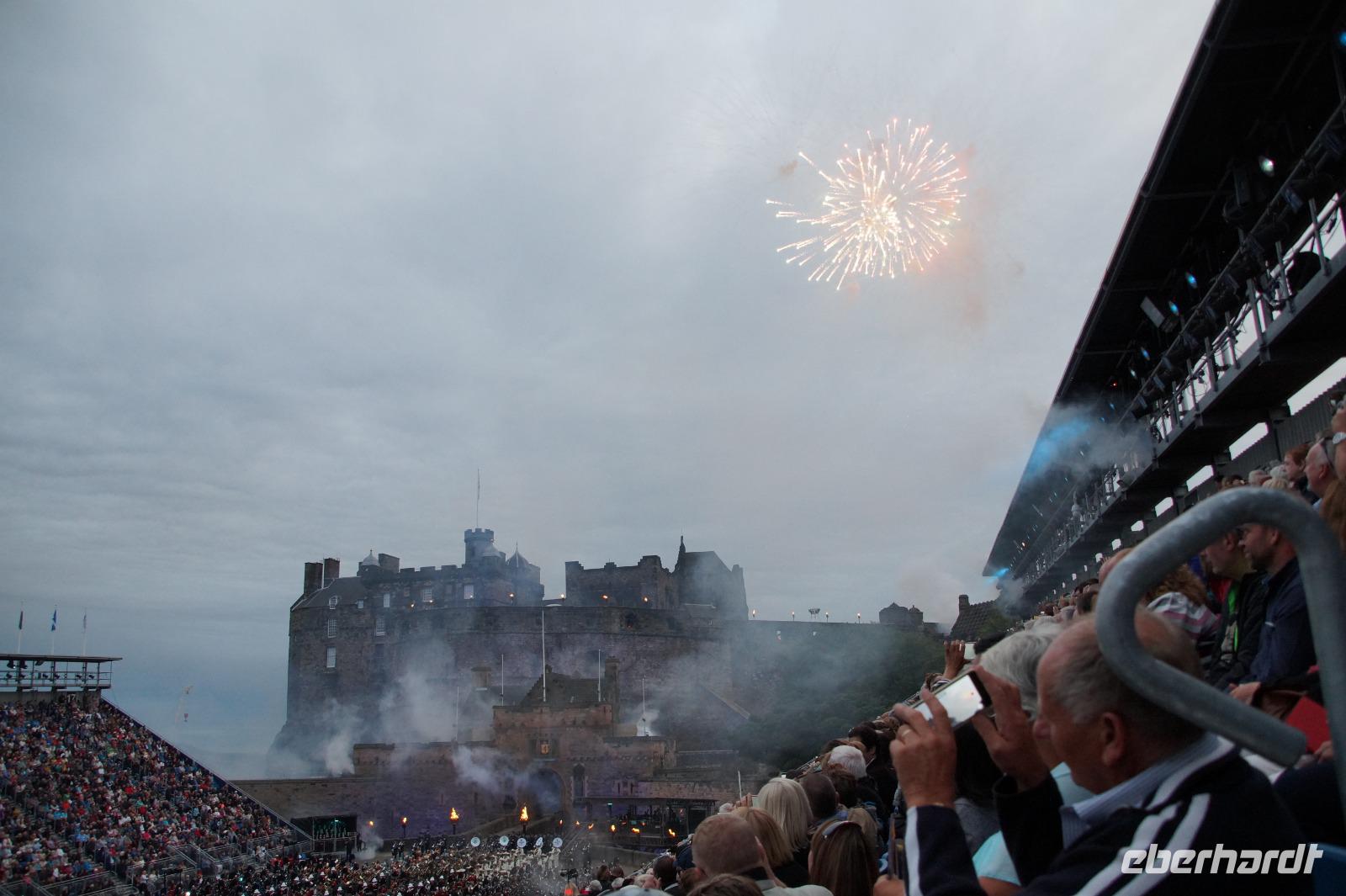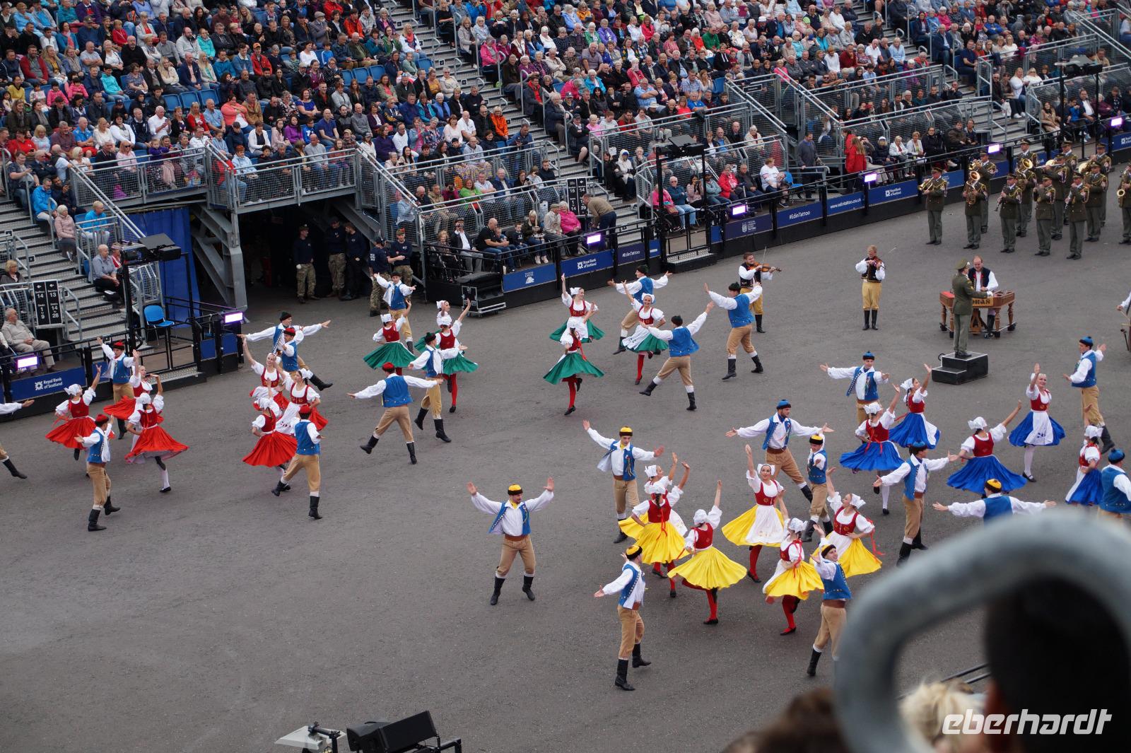 Das Royal Military Tattoo stand in diesem Jahr ganz im Zeichen des einhundertjährigen Bestehens der Royal Air Force und es kann und will seinen militärischen Charakter nicht verhehlen, wenn auch heute durchaus im Rahmen der Völkerverständigung. So waren neben einer malawischen Jugendgruppe, einem Freiwilligenregiment aus Middlesex County (Middlesex County Volunteers Fifes and Drums) auch wieder die Schweizer vom Top Secret Drum Corps dort, eine Militärkapelle aus dem Oman und aztekische Adlerkrieger verbreiteten mit ihrem Sturm auf das Exerzitiengelände Angst und Schrecken, bevor eine Mariachi-Band und eine Blaskapelle die Spannung mit Despacito auflösten. Äußerste Disziplin zeigte das Wachregiment der amerikanischen Luftwaffe. Am meisten Eindruck machten natürlich die verschiedenen Highlandregimenter mit ihren Bagpipes und Dudelsäcken, wegen denen kommt man in erster Linie zum Royal Military Tattoo nach Edinburgh. In der Endvorstellung tanzten schottische Tänzerinnen mit tschechischen, mexikanischen und malawischen Tänzerinnen und Tänzern zum Abschlussfeuerwerk. Danach zogen alle Mitwirkenden gemeinsam aus.