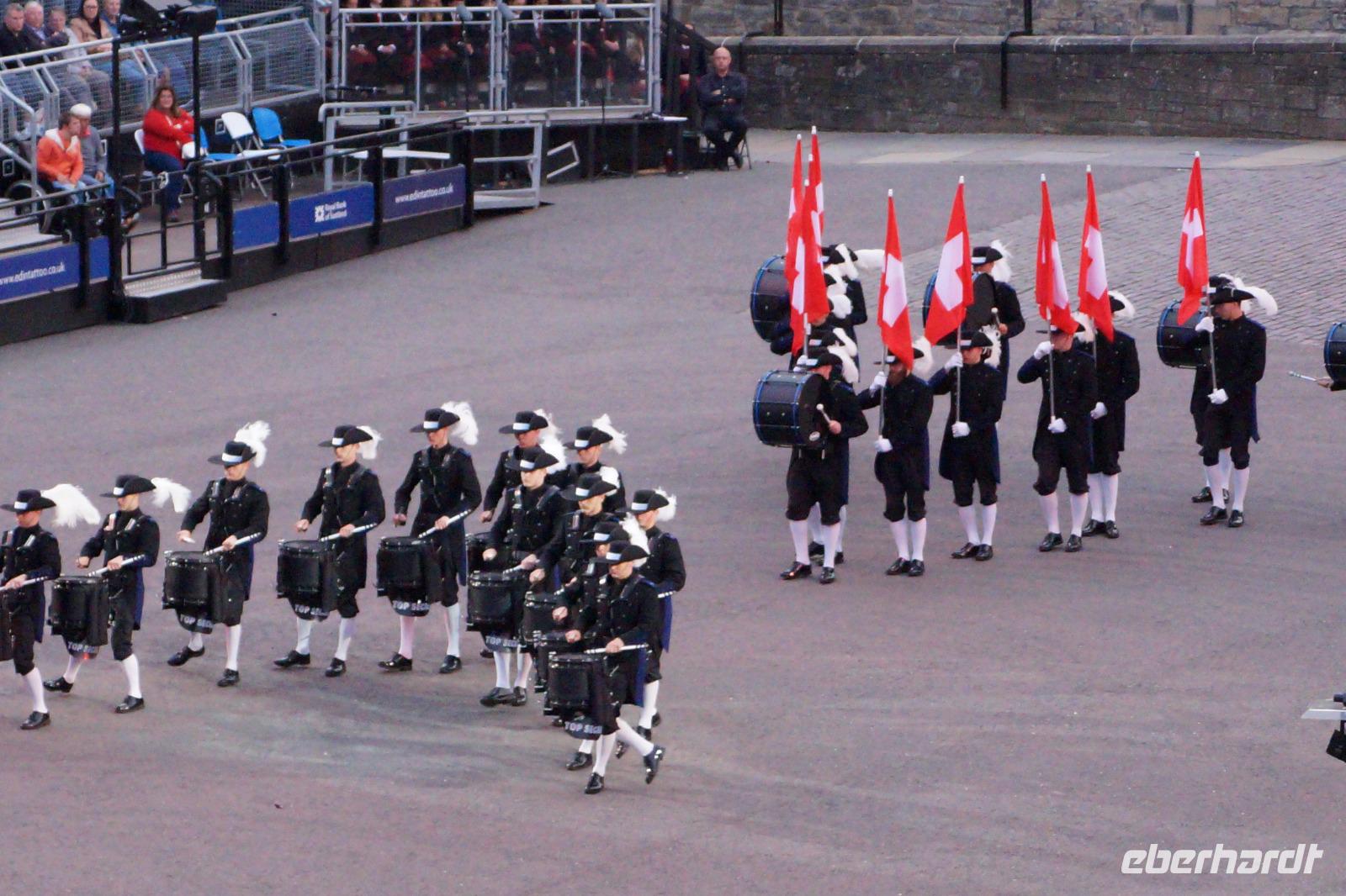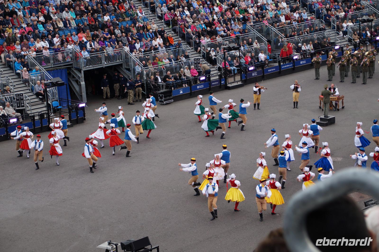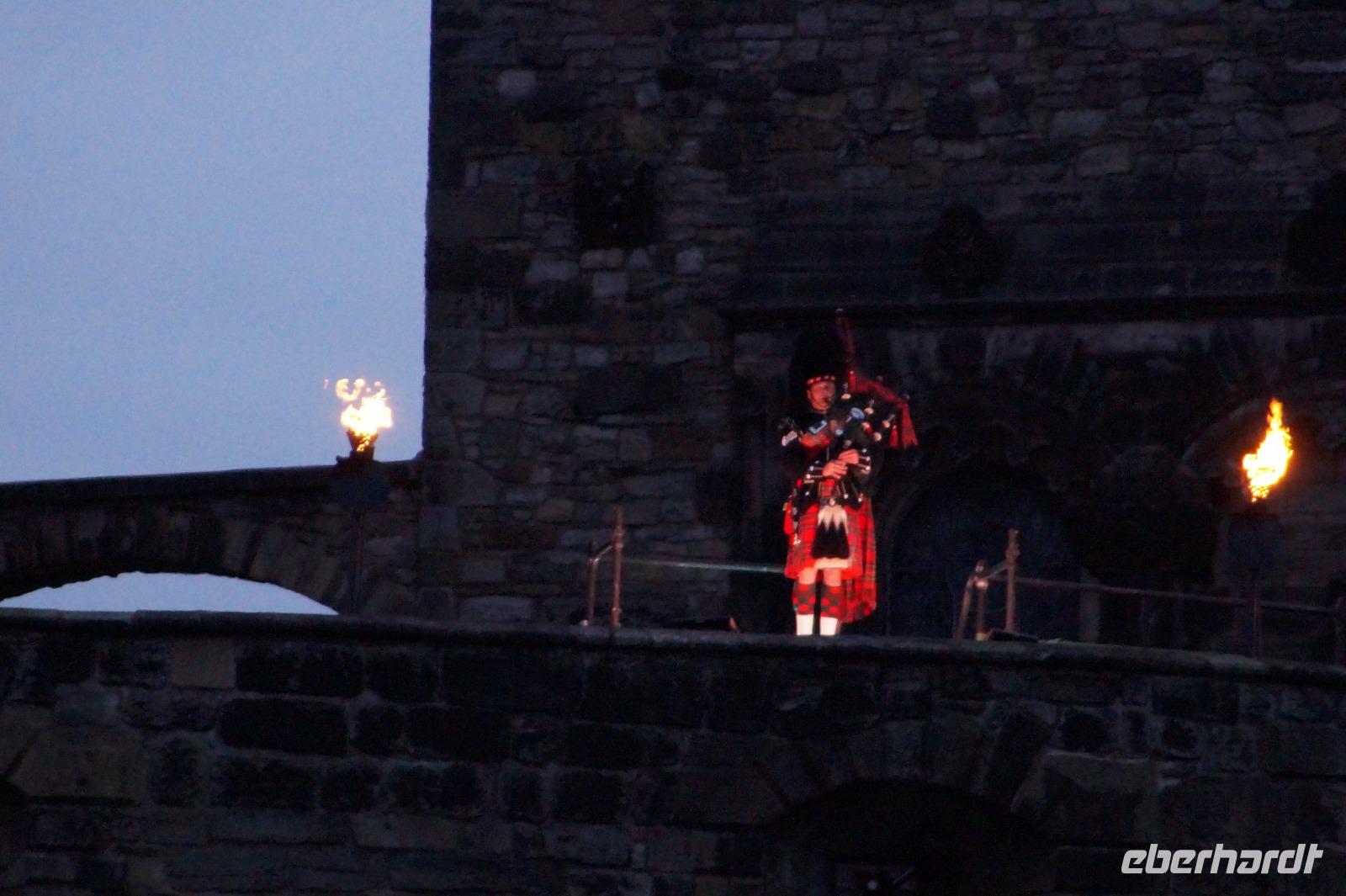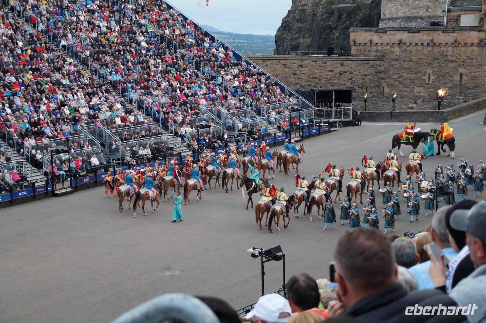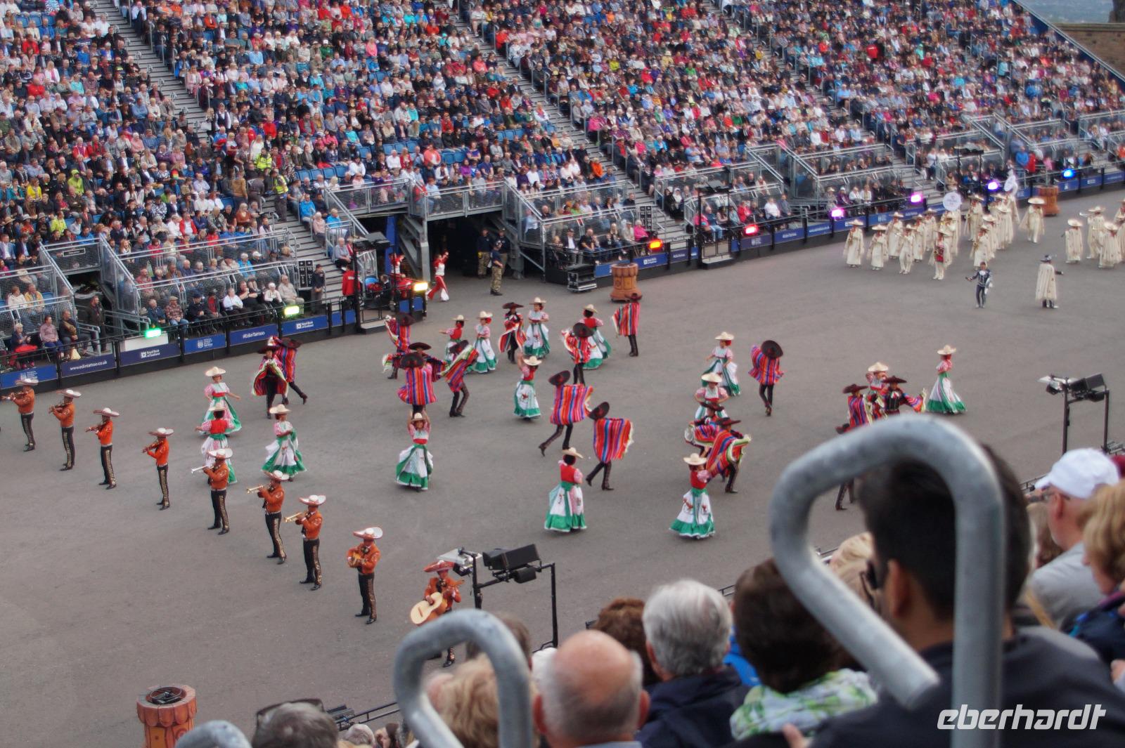 Das Royal Military Tattoo stand in diesem Jahr ganz im Zeichen des einhundertjährigen Bestehens der Royal Air Force und es kann und will seinen militärischen Charakter nicht verhehlen, wenn auch heute durchaus im Rahmen der Völkerverständigung. So waren neben einer malawischen Jugendgruppe, einem Freiwilligenregiment aus Middlesex County (Middlesex County Volunteers Fifes and Drums) auch wieder die Schweizer vom Top Secret Drum Corps dort, eine Militärkapelle aus dem Oman und aztekische Adlerkrieger verbreiteten mit ihrem Sturm auf das Exerzitiengelände Angst und Schrecken, bevor eine Mariachi-Band und eine Blaskapelle die Spannung mit Despacito auflösten. Äußerste Disziplin zeigte das Wachregiment der amerikanischen Luftwaffe. Am meisten Eindruck machten natürlich die verschiedenen Highlandregimenter mit ihren Bagpipes und Dudelsäcken, wegen denen kommt man in erster Linie zum Royal Military Tattoo nach Edinburgh. In der Endvorstellung tanzten schottische Tänzerinnen mit tschechischen, mexikanischen und malawischen Tänzerinnen und Tänzern zum Abschlussfeuerwerk. Danach zogen alle Mitwirkenden gemeinsam aus.