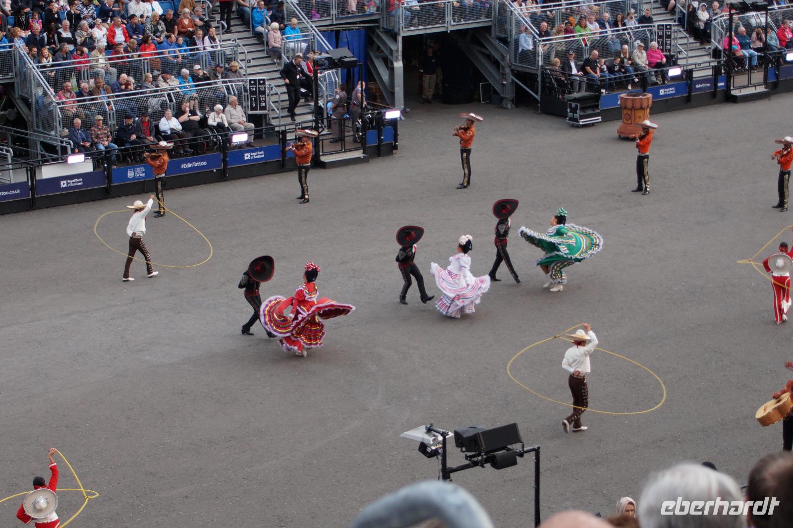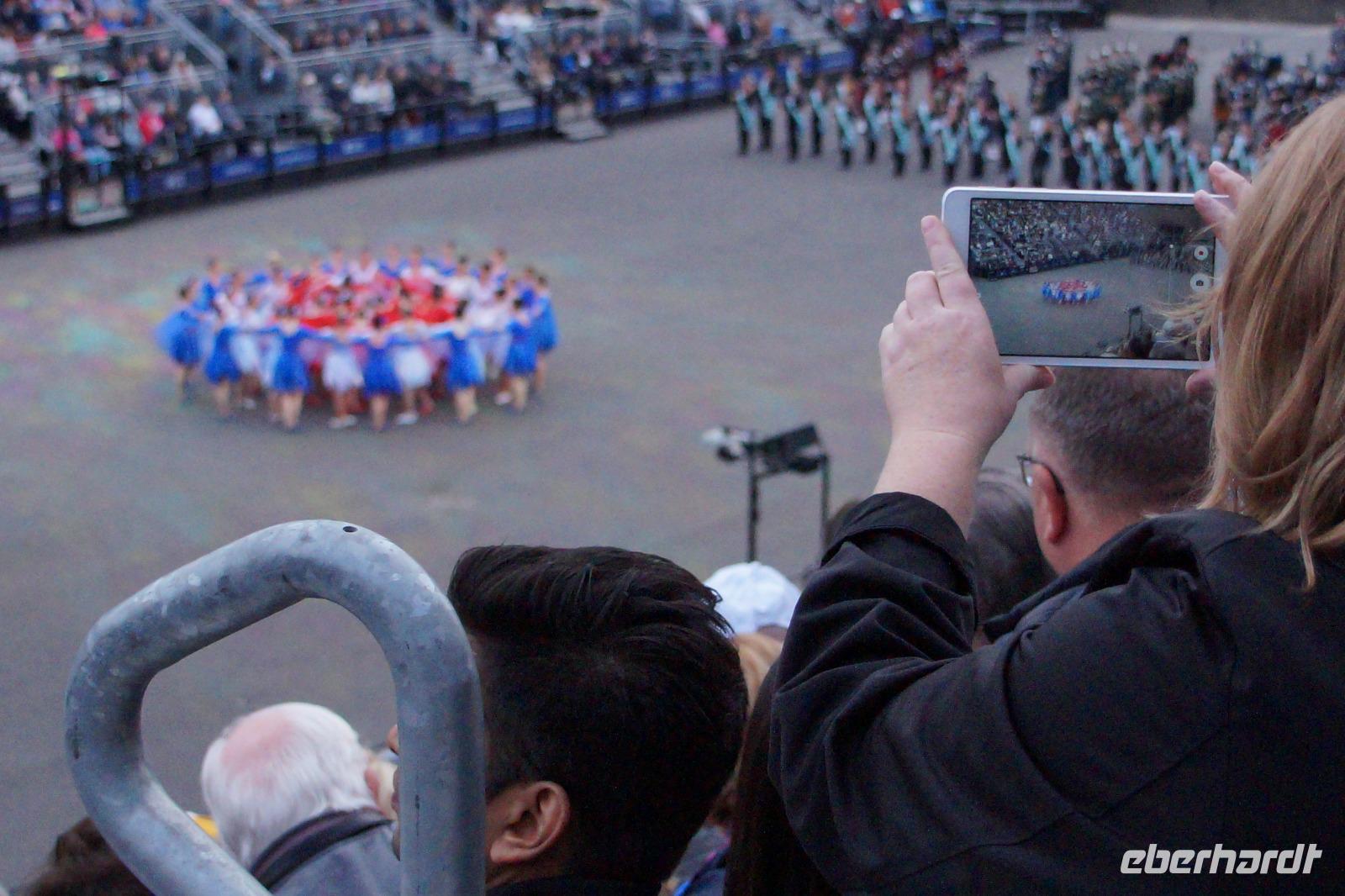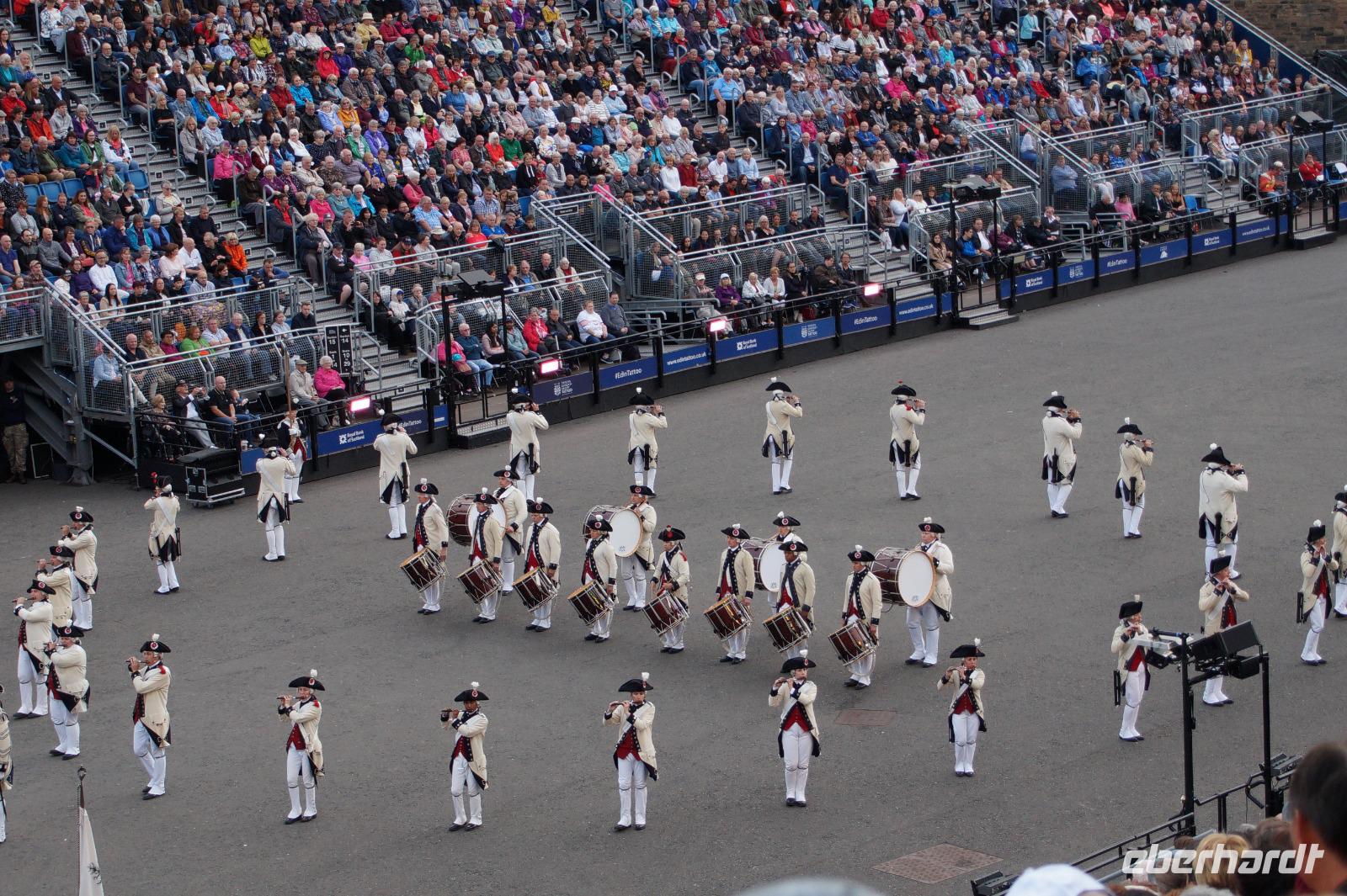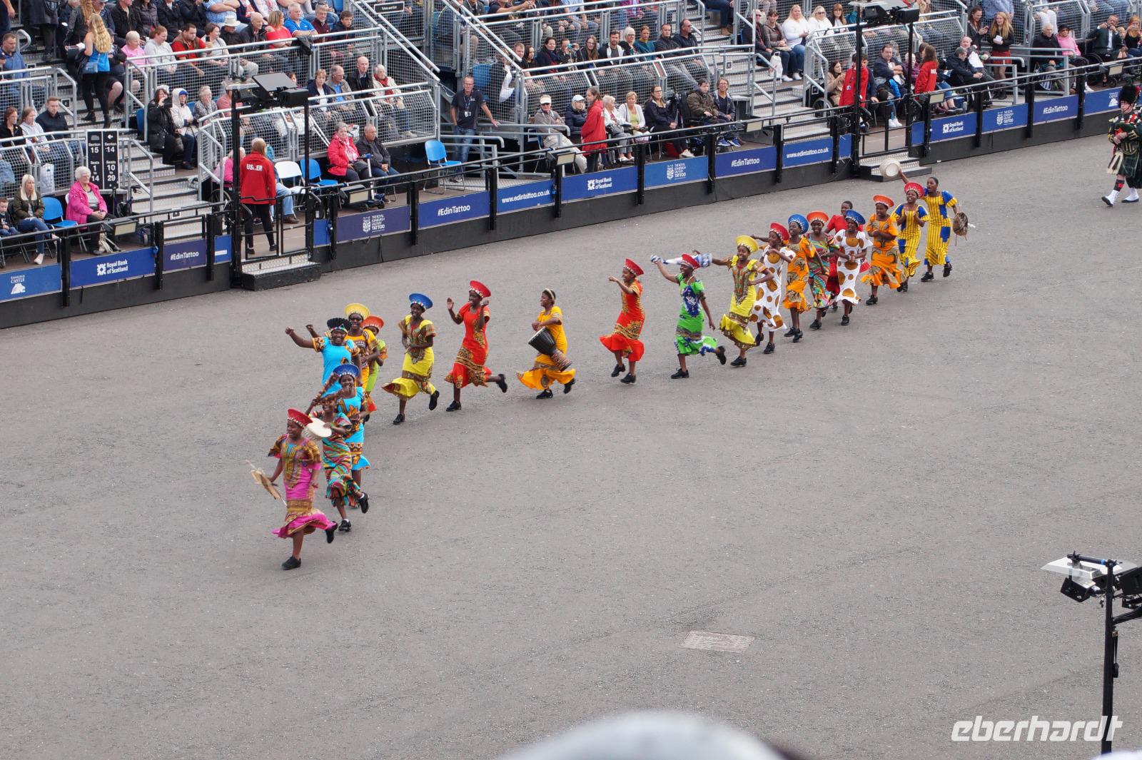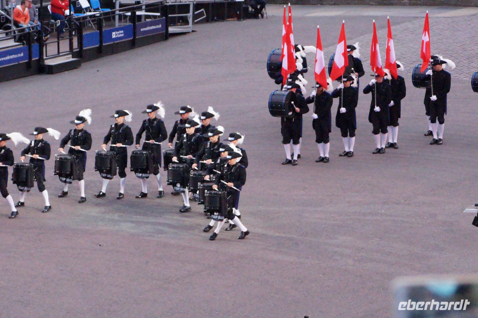 Das Royal Military Tattoo stand in diesem Jahr ganz im Zeichen des einhundertjährigen Bestehens der Royal Air Force und es kann und will seinen militärischen Charakter nicht verhehlen, wenn auch heute durchaus im Rahmen der Völkerverständigung. So waren neben einer malawischen Jugendgruppe, einem Freiwilligenregiment aus Middlesex County (Middlesex County Volunteers Fifes and Drums) auch wieder die Schweizer vom Top Secret Drum Corps dort, eine Militärkapelle aus dem Oman und aztekische Adlerkrieger verbreiteten mit ihrem Sturm auf das Exerzitiengelände Angst und Schrecken, bevor eine Mariachi-Band und eine Blaskapelle die Spannung mit Despacito auflösten. Äußerste Disziplin zeigte das Wachregiment der amerikanischen Luftwaffe. Am meisten Eindruck machten natürlich die verschiedenen Highlandregimenter mit ihren Bagpipes und Dudelsäcken, wegen denen kommt man in erster Linie zum Royal Military Tattoo nach Edinburgh. In der Endvorstellung tanzten schottische Tänzerinnen mit tschechischen, mexikanischen und malawischen Tänzerinnen und Tänzern zum Abschlussfeuerwerk. Danach zogen alle Mitwirkenden gemeinsam aus.