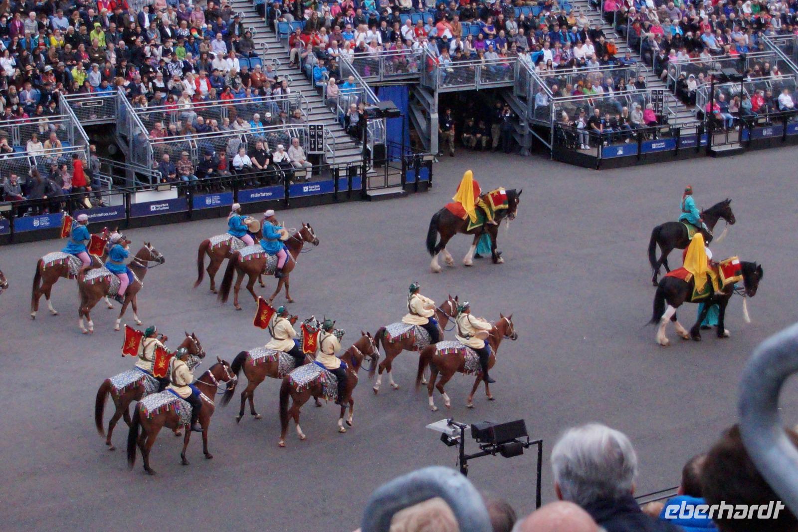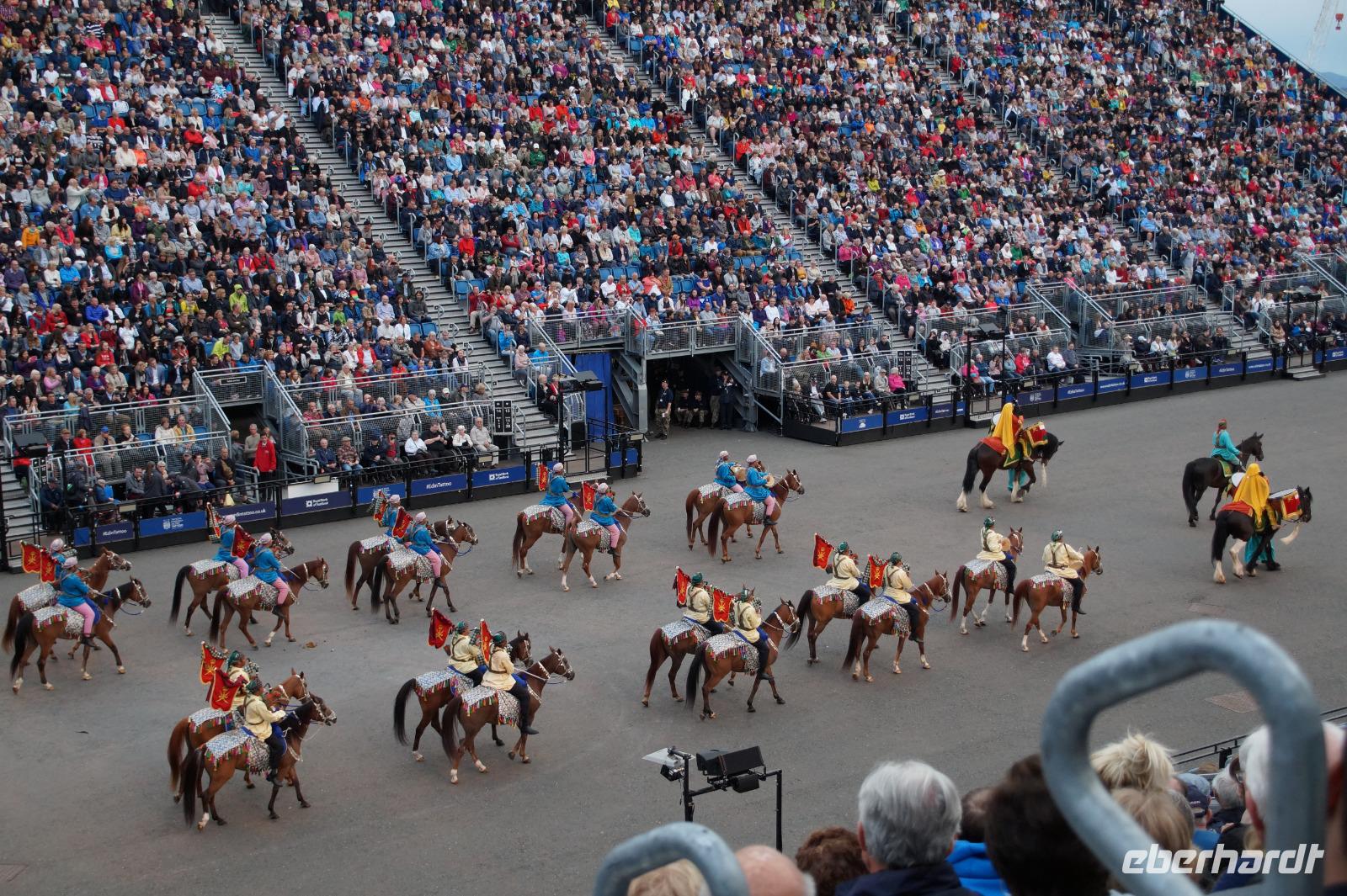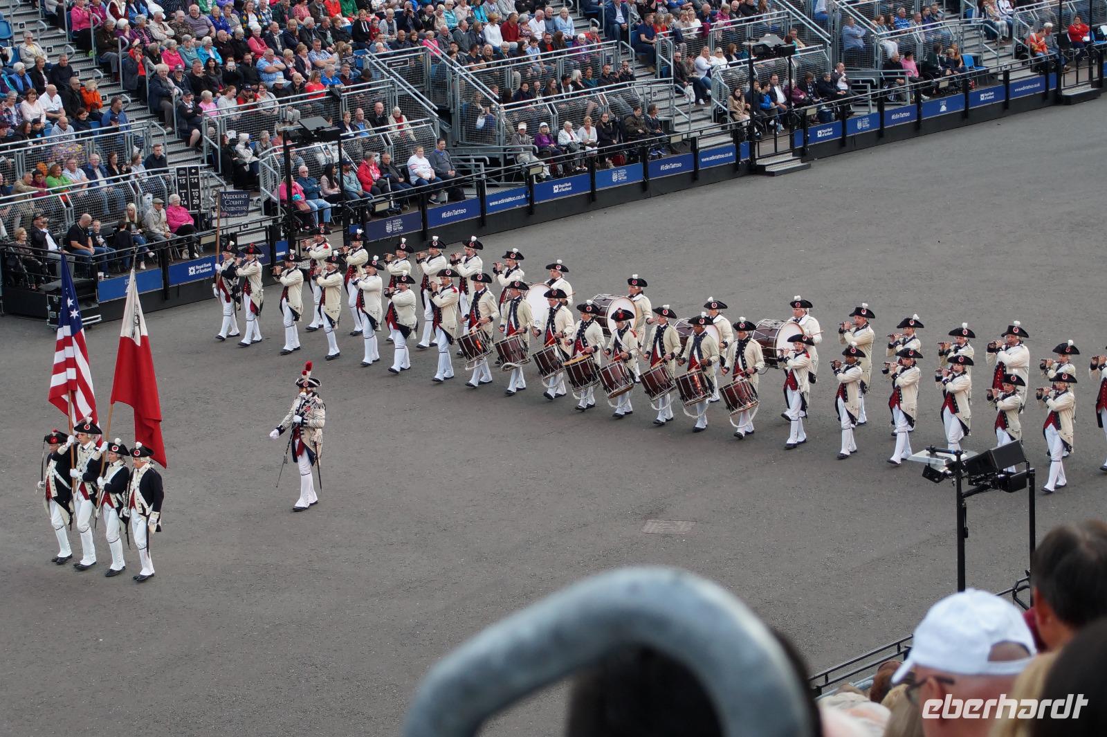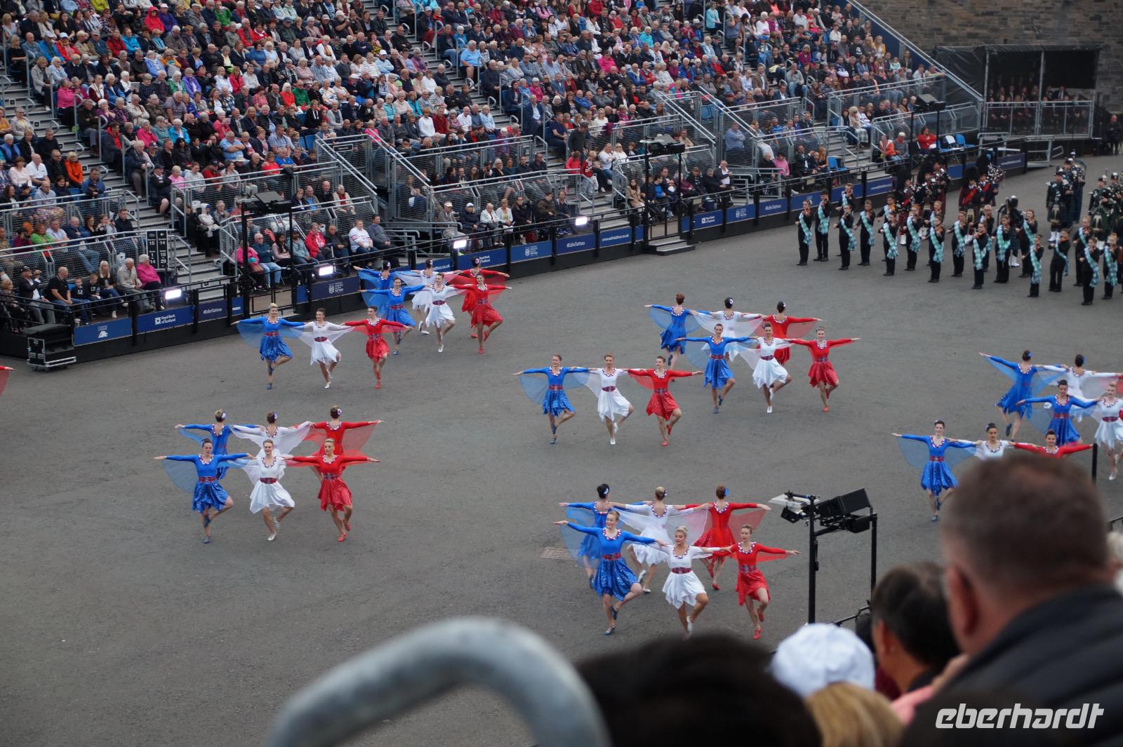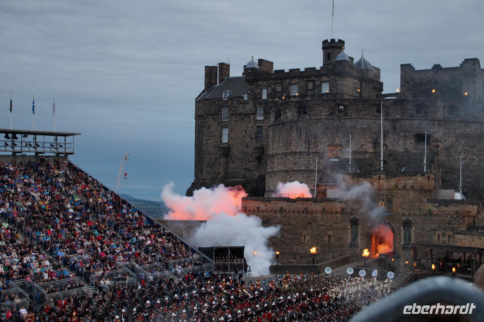 Das Royal Military Tattoo stand in diesem Jahr ganz im Zeichen des einhundertjährigen Bestehens der Royal Air Force und es kann und will seinen militärischen Charakter nicht verhehlen, wenn auch heute durchaus im Rahmen der Völkerverständigung. So waren neben einer malawischen Jugendgruppe, einem Freiwilligenregiment aus Middlesex County (Middlesex County Volunteers Fifes and Drums) auch wieder die Schweizer vom Top Secret Drum Corps dort, eine Militärkapelle aus dem Oman und aztekische Adlerkrieger verbreiteten mit ihrem Sturm auf das Exerzitiengelände Angst und Schrecken, bevor eine Mariachi-Band und eine Blaskapelle die Spannung mit Despacito auflösten. Äußerste Disziplin zeigte das Wachregiment der amerikanischen Luftwaffe. Am meisten Eindruck machten natürlich die verschiedenen Highlandregimenter mit ihren Bagpipes und Dudelsäcken, wegen denen kommt man in erster Linie zum Royal Military Tattoo nach Edinburgh. In der Endvorstellung tanzten schottische Tänzerinnen mit tschechischen, mexikanischen und malawischen Tänzerinnen und Tänzern zum Abschlussfeuerwerk. Danach zogen alle Mitwirkenden gemeinsam aus.