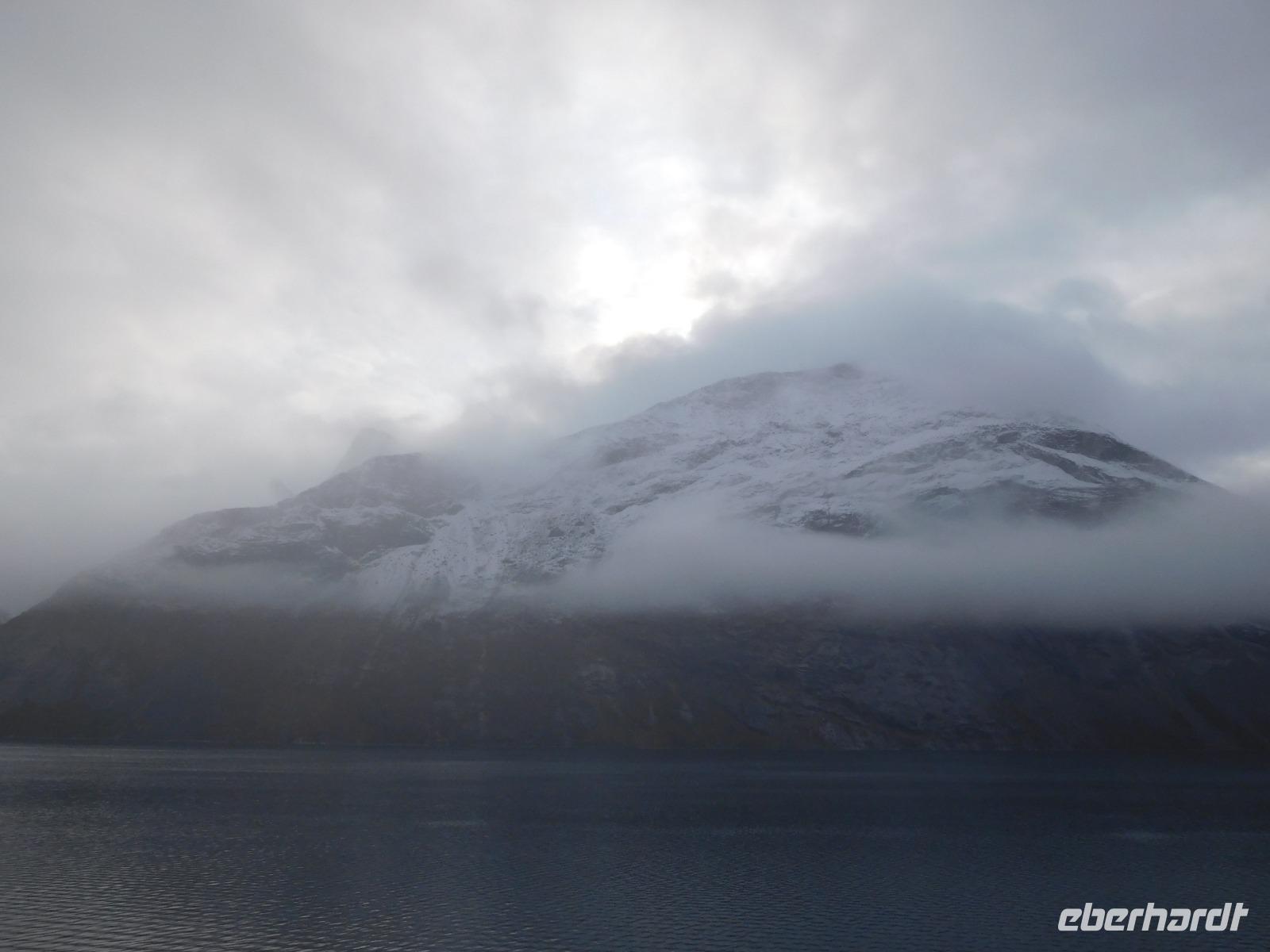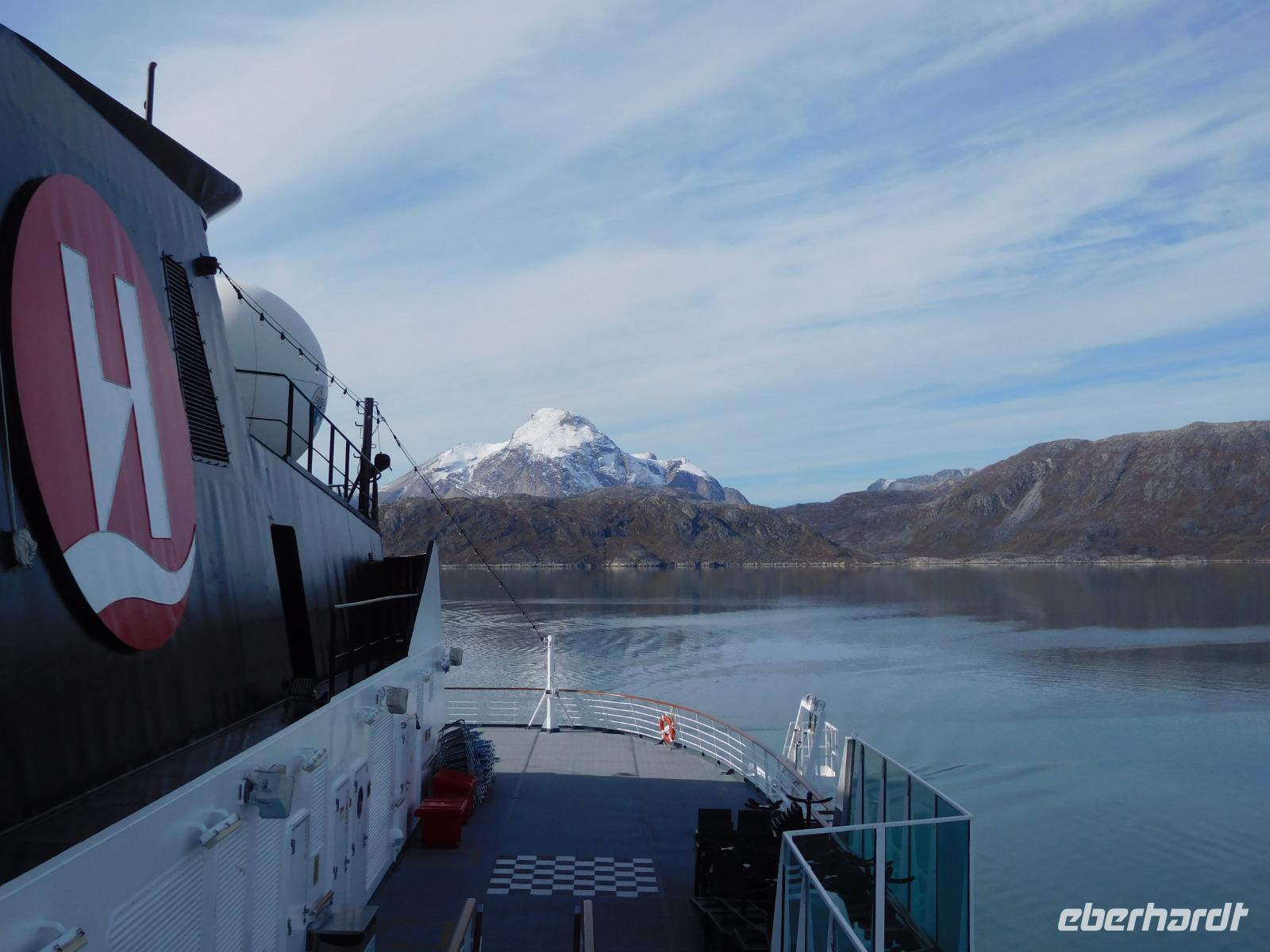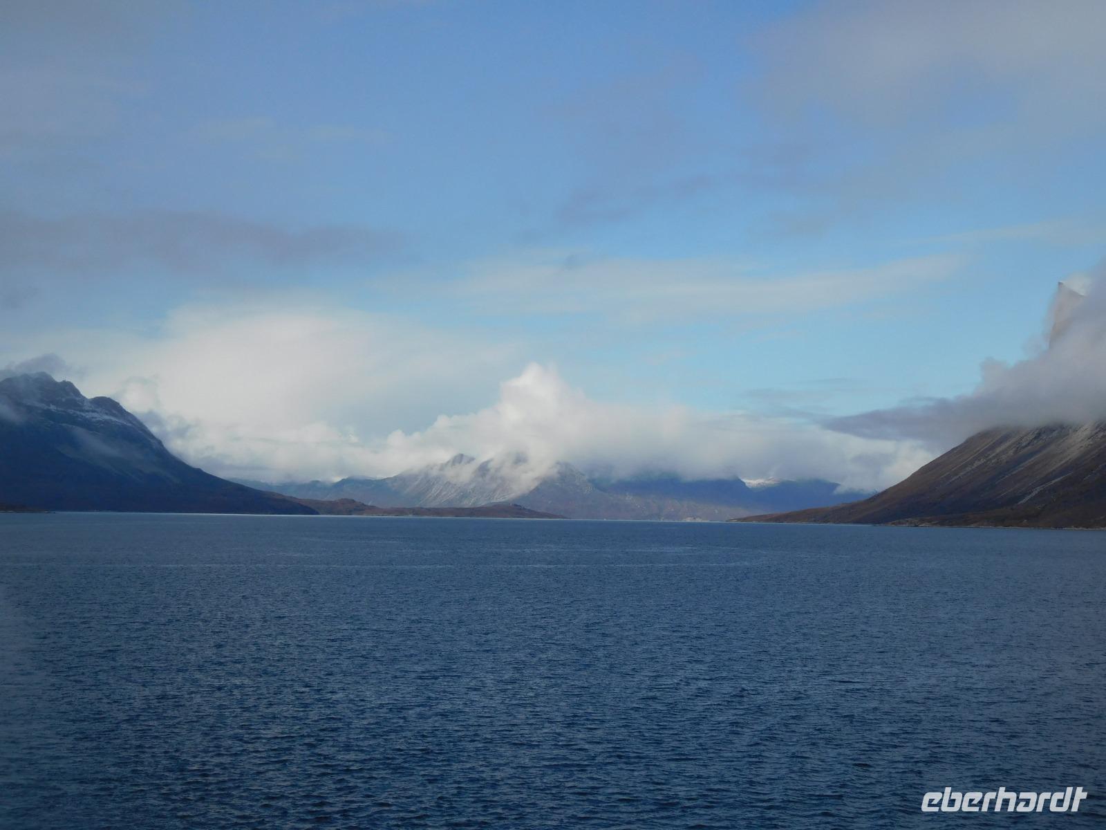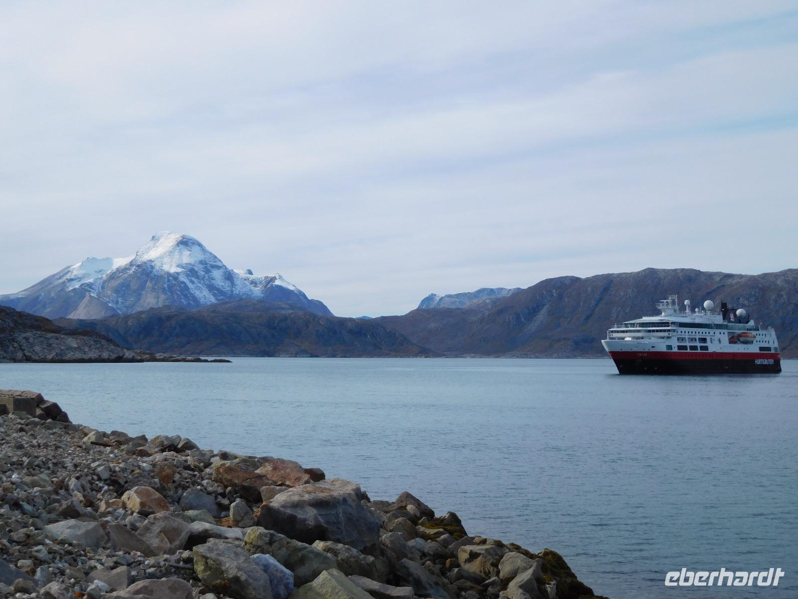 Trotz Schlafmangels sind wir alle ziemlich zeitig wieder munter und voller Spannung, was uns der Tag bringen wird. Wir treffen uns beim Frühstück und genießen den Panoramablick auf die umliegenden Berge. Felsketten umrahmen in mystischem Licht den Fjord von Kangerlussuaq, den wir am Vormittag verlassen und erstmals in die offene arktische See einfahren. Zur wichtigsten Lektüre an Bord gehört das Tagesmagazin, in dem jegliche wichtige Informationen und Aktivitäten vermerkt sind. Den heutigen Tag verbringen wir an Bord, auch um uns umschauen zu können. Jeder hat also Zeit für sich, aber am Anfang einer jeden Kreuzfahrt stehen natürlich auch Pflichtveranstaltungen wie die obligatorische Seenot-Rettungsübung oder - hier in der Arktis Pflicht - die Belehrung zum Verhalten in den Regionen um den 60. Breitengrad. Apropos... leider haben wir alle die Überquerung des Polarkreises verschlafen, die in der Nacht gegen 03.40 Uhr stattfand. Unser Expeditions-Team stellt sich uns vor: ein sehr humorvolles Team mit einem italienischen Expeditionsleiter und Mitgliedern und Wissenschaftlern aus Deutschland, Kanada, den USA, Chile, Schottland, Norwegen, Dänemark und natürlich Grönland. Wir nutzen den heutigen Tag, um das Schiff kennen zu lernen und natürlich auch die kulinarischen Künste der Crew schon einmal zu testen. Und so hangeln wir uns von Frühstück über Mittagsbuffet zur Teezeit und zum abendlichen Willkommens-Buffet. Zwischendurch nimmt uns aber die überwältigende Natur in ihren Bann. Wir fahren heute in den Sermilinguaq-Fjord ein und von den bis zu 1000 Meter hohen Felswänden schlängeln sich die Gletscherzungen bis zum Fjord und unzählige kleine Wasserfälle Beim Blick am Fels nach oben lässt sich auch der Eispanzer Grönlands vermuten, denn Gletscherfelder decken die Kuppen der Berge ab. Und es gab bereits den ersten Neuschnee für dieses Jahr. Wir sind ja hier im Herbst unterwegs, das heißt die Gletscherschmelze hört auf und es bildet sich, hoffentlich sehr viel, neues Eis. Nur die Wolken könnten heute ein wenig höher hängen, wobei die arktische Landschaft auch bei ein paar Schneeflocken und tief hängenden Wolken nichts von ihrer Faszination verliert. Ein wenig schade ist, dass die meisten Seevögel nicht ganz so wetterresistent sind wie die Gäste an Bord und bereits ihren Weg in den Süden angetreten haben. Im Übrigen kann unser Expeditionsschiff 278 Personen mit auf Reise nehmen, wir sind gar nicht so böse, dass es inklusive unserer kleinen Gruppe nur 144 geworden sind. So findet jeder in der herrlich gemütlichen Panorama-Lounge auch ein Plätzchen mit Aussicht. Sobald wir den Fjord wieder aufs offene Meer verlassen haben, bekommen wir sanft, aber doch merklich die Kraft des Ozeans zu spüren. Erste Wellen schlagen tatsächlich hoch am Bug und im Verlauf des Abends gibt es schon die eine oder andere Situation, bei der man nicht mehr gerade durch die Gänge laufen kann... Nach unserem Abendessen treffen wir uns noch kurz, um die neuesten Informationen für den kommenden Tag in den Vorlesungsräumen zu erfahren und dann erwartet uns noch der Kapitäns-Empfang. Im Gegensatz zu den sonst so opulenten Empfängen auf anderen Schiffen, stellt uns auf Hurtigruten der Kapitän ganz bescheiden seine Crew kurz vor und schon ist er wieder verschwunden und die Gäste genießen Entertainment à la Hurtigruten - feine Gitarrenmusik von Michael, einem Mitglied des Expeditionsteams. Dazu genießen wir einen Drink von der Bar und freuen uns auf die ersten Anlandungen am nächsten Tag in der Region Kapisillit.