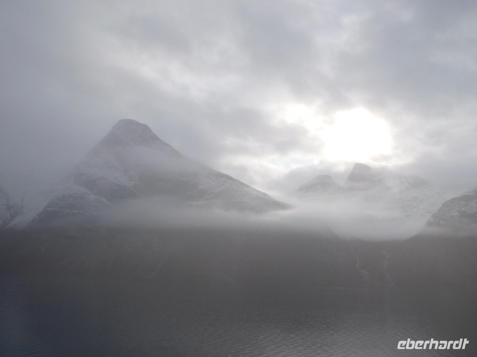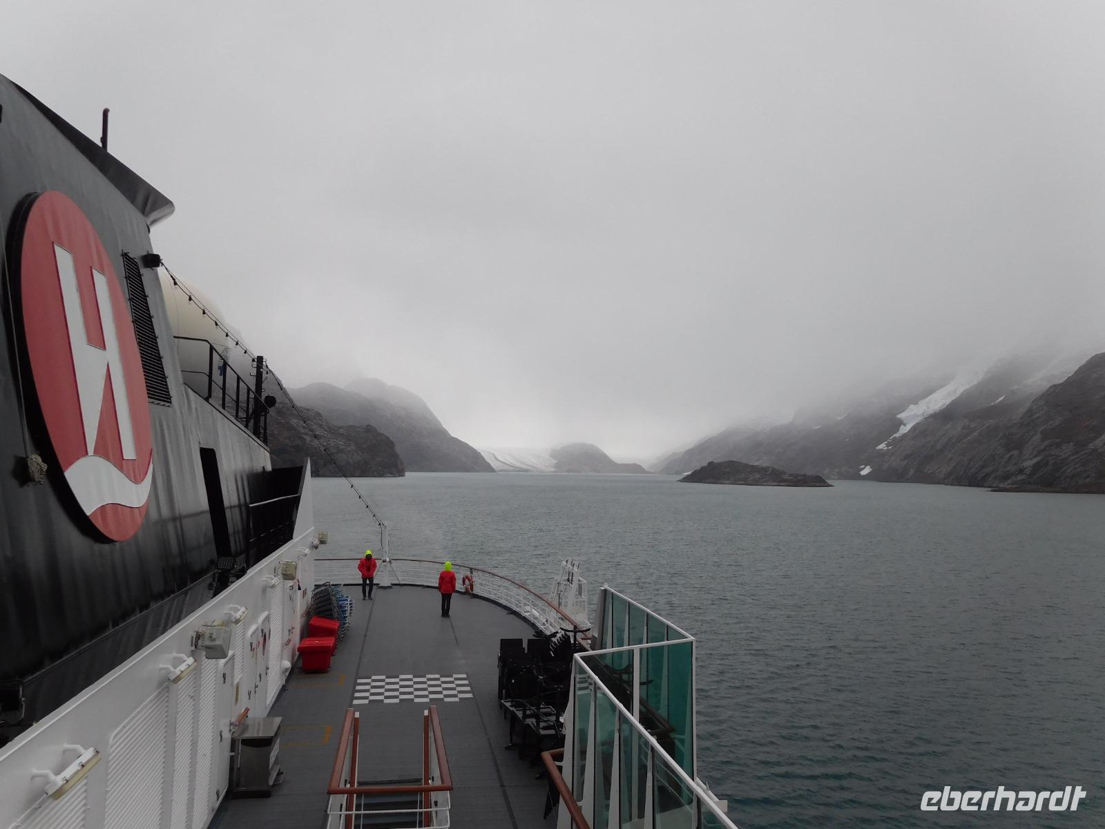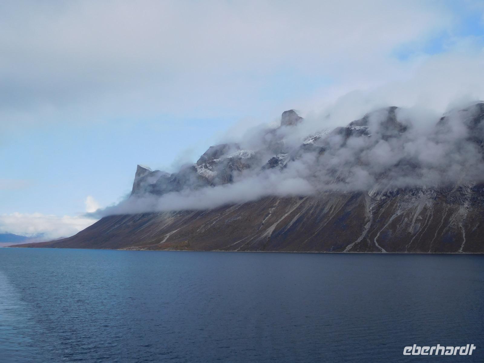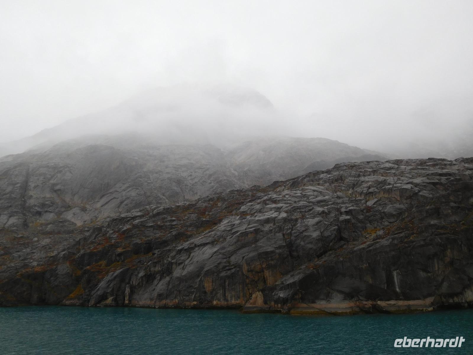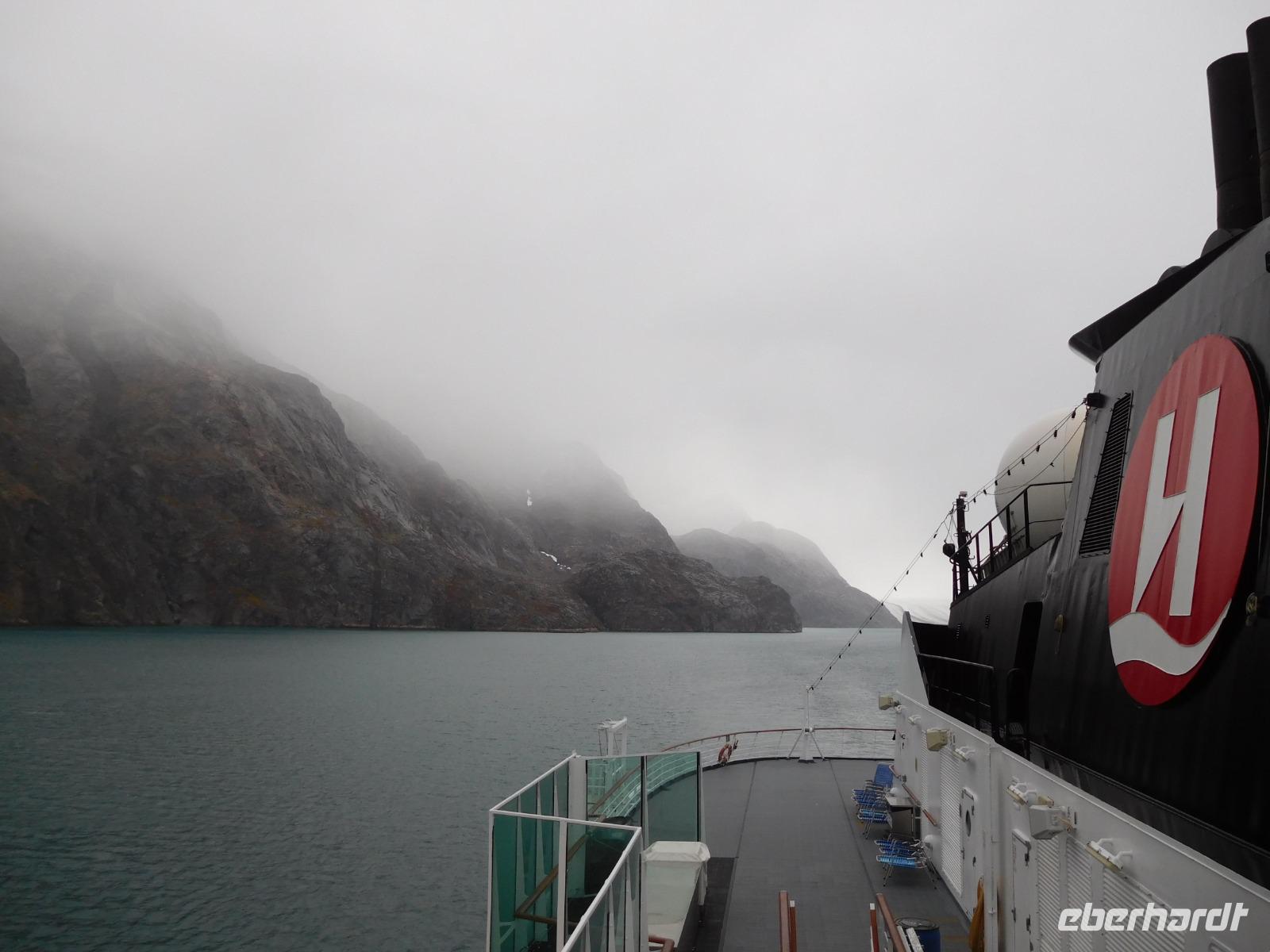 Trotz Schlafmangels sind wir alle ziemlich zeitig wieder munter und voller Spannung, was uns der Tag bringen wird. Wir treffen uns beim Frühstück und genießen den Panoramablick auf die umliegenden Berge. Felsketten umrahmen in mystischem Licht den Fjord von Kangerlussuaq, den wir am Vormittag verlassen und erstmals in die offene arktische See einfahren. Zur wichtigsten Lektüre an Bord gehört das Tagesmagazin, in dem jegliche wichtige Informationen und Aktivitäten vermerkt sind. Den heutigen Tag verbringen wir an Bord, auch um uns umschauen zu können. Jeder hat also Zeit für sich, aber am Anfang einer jeden Kreuzfahrt stehen natürlich auch Pflichtveranstaltungen wie die obligatorische Seenot-Rettungsübung oder - hier in der Arktis Pflicht - die Belehrung zum Verhalten in den Regionen um den 60. Breitengrad. Apropos... leider haben wir alle die Überquerung des Polarkreises verschlafen, die in der Nacht gegen 03.40 Uhr stattfand. Unser Expeditions-Team stellt sich uns vor: ein sehr humorvolles Team mit einem italienischen Expeditionsleiter und Mitgliedern und Wissenschaftlern aus Deutschland, Kanada, den USA, Chile, Schottland, Norwegen, Dänemark und natürlich Grönland. Wir nutzen den heutigen Tag, um das Schiff kennen zu lernen und natürlich auch die kulinarischen Künste der Crew schon einmal zu testen. Und so hangeln wir uns von Frühstück über Mittagsbuffet zur Teezeit und zum abendlichen Willkommens-Buffet. Zwischendurch nimmt uns aber die überwältigende Natur in ihren Bann. Wir fahren heute in den Sermilinguaq-Fjord ein und von den bis zu 1000 Meter hohen Felswänden schlängeln sich die Gletscherzungen bis zum Fjord und unzählige kleine Wasserfälle Beim Blick am Fels nach oben lässt sich auch der Eispanzer Grönlands vermuten, denn Gletscherfelder decken die Kuppen der Berge ab. Und es gab bereits den ersten Neuschnee für dieses Jahr. Wir sind ja hier im Herbst unterwegs, das heißt die Gletscherschmelze hört auf und es bildet sich, hoffentlich sehr viel, neues Eis. Nur die Wolken könnten heute ein wenig höher hängen, wobei die arktische Landschaft auch bei ein paar Schneeflocken und tief hängenden Wolken nichts von ihrer Faszination verliert. Ein wenig schade ist, dass die meisten Seevögel nicht ganz so wetterresistent sind wie die Gäste an Bord und bereits ihren Weg in den Süden angetreten haben. Im Übrigen kann unser Expeditionsschiff 278 Personen mit auf Reise nehmen, wir sind gar nicht so böse, dass es inklusive unserer kleinen Gruppe nur 144 geworden sind. So findet jeder in der herrlich gemütlichen Panorama-Lounge auch ein Plätzchen mit Aussicht. Sobald wir den Fjord wieder aufs offene Meer verlassen haben, bekommen wir sanft, aber doch merklich die Kraft des Ozeans zu spüren. Erste Wellen schlagen tatsächlich hoch am Bug und im Verlauf des Abends gibt es schon die eine oder andere Situation, bei der man nicht mehr gerade durch die Gänge laufen kann... Nach unserem Abendessen treffen wir uns noch kurz, um die neuesten Informationen für den kommenden Tag in den Vorlesungsräumen zu erfahren und dann erwartet uns noch der Kapitäns-Empfang. Im Gegensatz zu den sonst so opulenten Empfängen auf anderen Schiffen, stellt uns auf Hurtigruten der Kapitän ganz bescheiden seine Crew kurz vor und schon ist er wieder verschwunden und die Gäste genießen Entertainment à la Hurtigruten - feine Gitarrenmusik von Michael, einem Mitglied des Expeditionsteams. Dazu genießen wir einen Drink von der Bar und freuen uns auf die ersten Anlandungen am nächsten Tag in der Region Kapisillit.