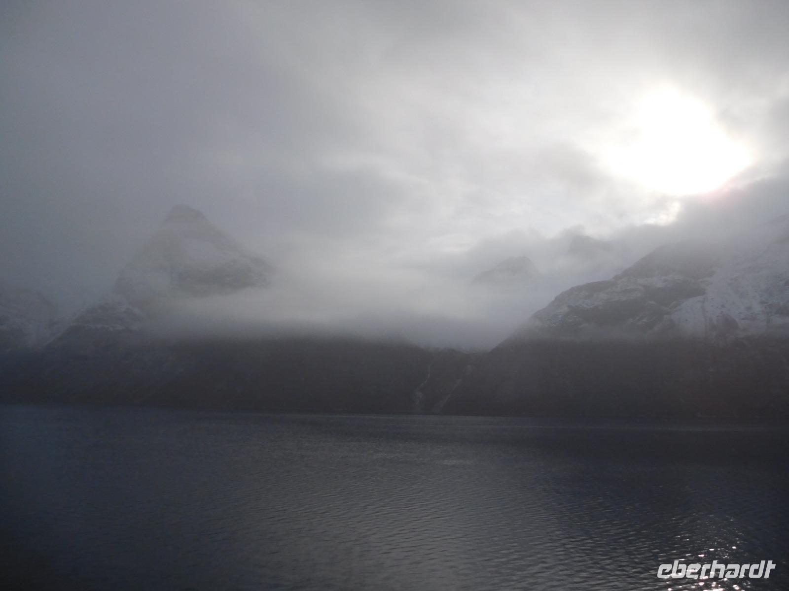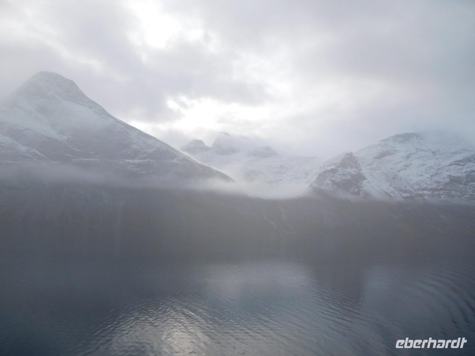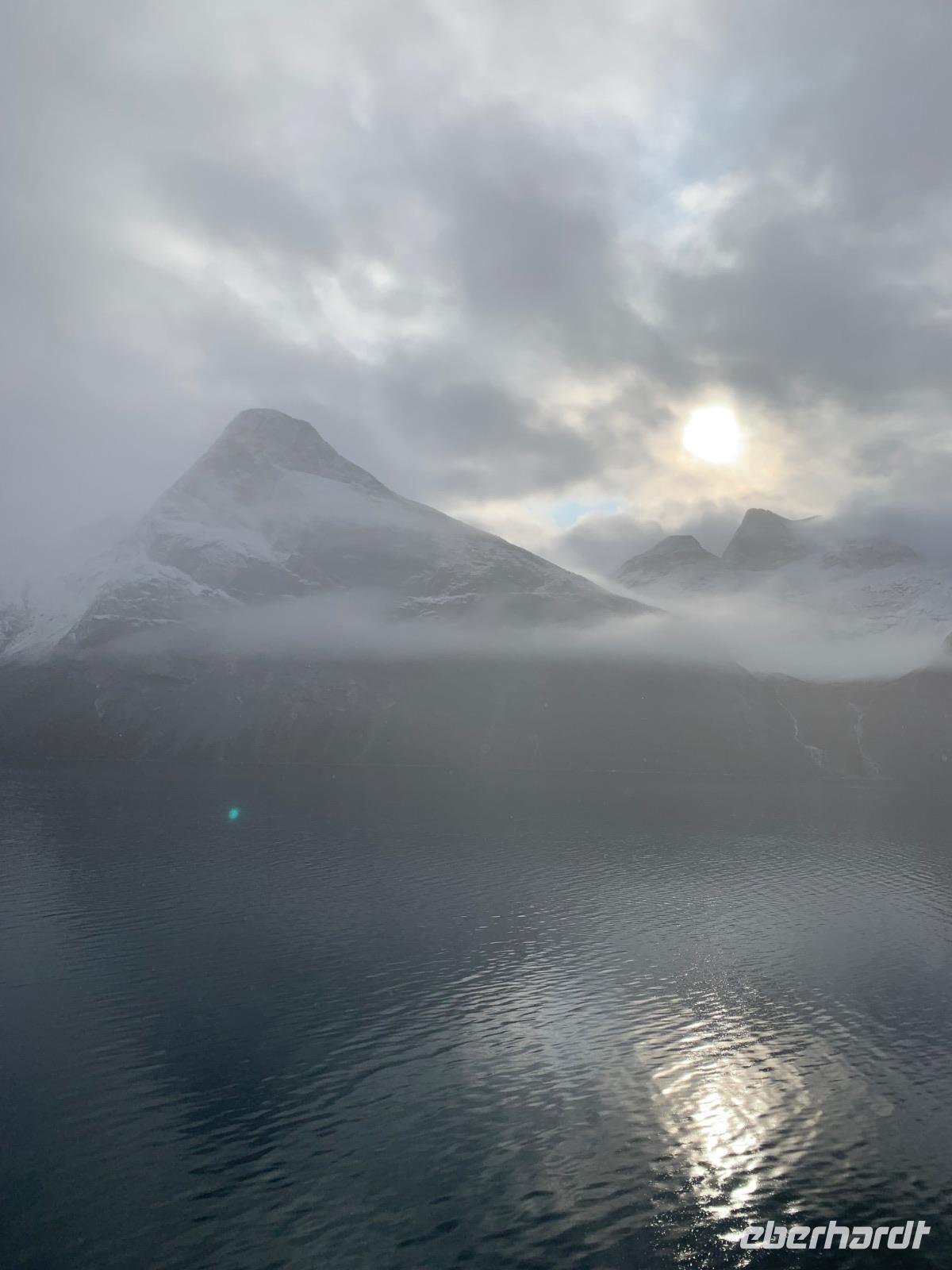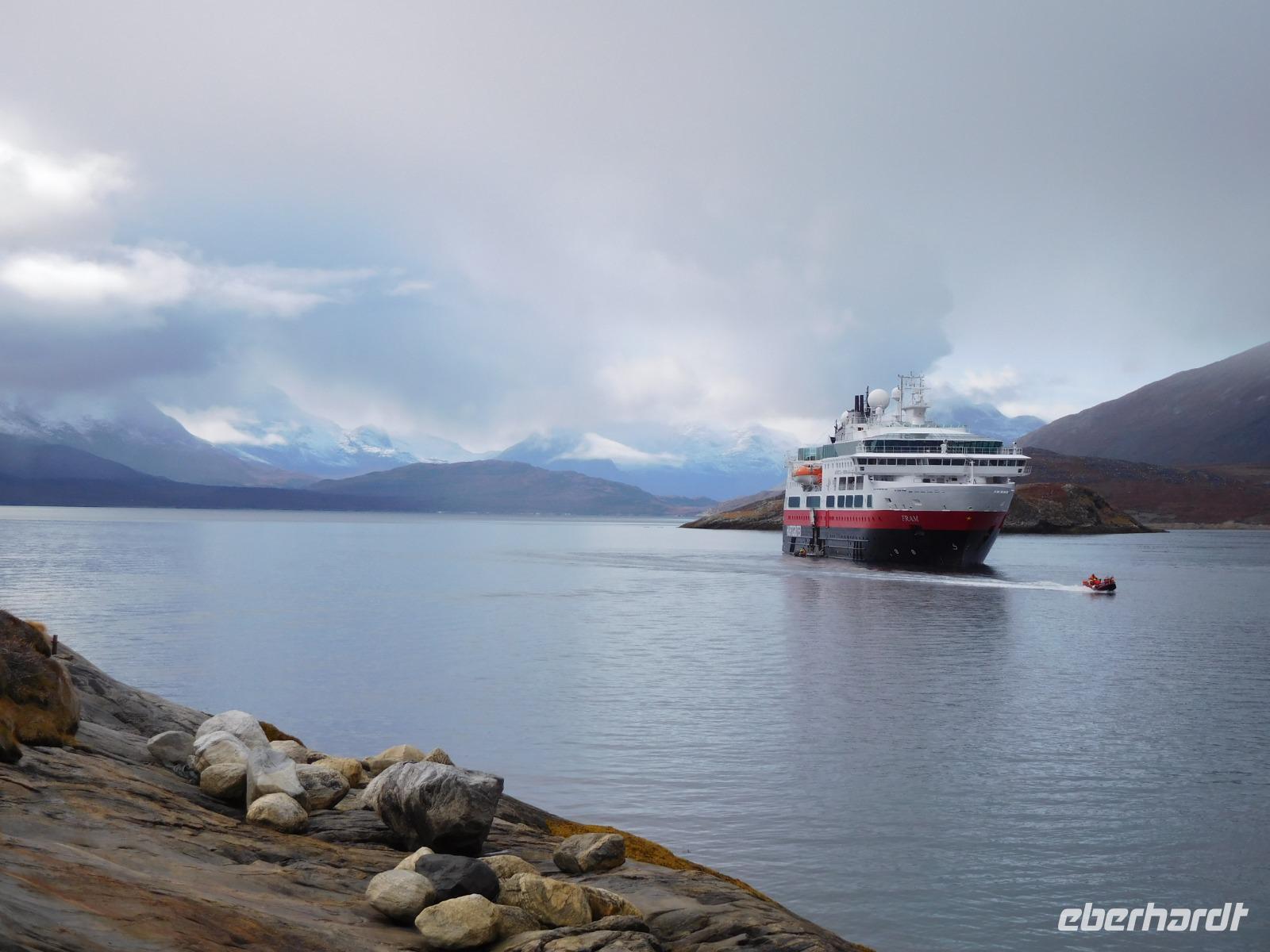 Trotz Schlafmangels sind wir alle ziemlich zeitig wieder munter und voller Spannung, was uns der Tag bringen wird. Wir treffen uns beim Frühstück und genießen den Panoramablick auf die umliegenden Berge. Felsketten umrahmen in mystischem Licht den Fjord von Kangerlussuaq, den wir am Vormittag verlassen und erstmals in die offene arktische See einfahren. Zur wichtigsten Lektüre an Bord gehört das Tagesmagazin, in dem jegliche wichtige Informationen und Aktivitäten vermerkt sind. Den heutigen Tag verbringen wir an Bord, auch um uns umschauen zu können. Jeder hat also Zeit für sich, aber am Anfang einer jeden Kreuzfahrt stehen natürlich auch Pflichtveranstaltungen wie die obligatorische Seenot-Rettungsübung oder - hier in der Arktis Pflicht - die Belehrung zum Verhalten in den Regionen um den 60. Breitengrad. Apropos... leider haben wir alle die Überquerung des Polarkreises verschlafen, die in der Nacht gegen 03.40 Uhr stattfand. Unser Expeditions-Team stellt sich uns vor: ein sehr humorvolles Team mit einem italienischen Expeditionsleiter und Mitgliedern und Wissenschaftlern aus Deutschland, Kanada, den USA, Chile, Schottland, Norwegen, Dänemark und natürlich Grönland. Wir nutzen den heutigen Tag, um das Schiff kennen zu lernen und natürlich auch die kulinarischen Künste der Crew schon einmal zu testen. Und so hangeln wir uns von Frühstück über Mittagsbuffet zur Teezeit und zum abendlichen Willkommens-Buffet. Zwischendurch nimmt uns aber die überwältigende Natur in ihren Bann. Wir fahren heute in den Sermilinguaq-Fjord ein und von den bis zu 1000 Meter hohen Felswänden schlängeln sich die Gletscherzungen bis zum Fjord und unzählige kleine Wasserfälle Beim Blick am Fels nach oben lässt sich auch der Eispanzer Grönlands vermuten, denn Gletscherfelder decken die Kuppen der Berge ab. Und es gab bereits den ersten Neuschnee für dieses Jahr. Wir sind ja hier im Herbst unterwegs, das heißt die Gletscherschmelze hört auf und es bildet sich, hoffentlich sehr viel, neues Eis. Nur die Wolken könnten heute ein wenig höher hängen, wobei die arktische Landschaft auch bei ein paar Schneeflocken und tief hängenden Wolken nichts von ihrer Faszination verliert. Ein wenig schade ist, dass die meisten Seevögel nicht ganz so wetterresistent sind wie die Gäste an Bord und bereits ihren Weg in den Süden angetreten haben. Im Übrigen kann unser Expeditionsschiff 278 Personen mit auf Reise nehmen, wir sind gar nicht so böse, dass es inklusive unserer kleinen Gruppe nur 144 geworden sind. So findet jeder in der herrlich gemütlichen Panorama-Lounge auch ein Plätzchen mit Aussicht. Sobald wir den Fjord wieder aufs offene Meer verlassen haben, bekommen wir sanft, aber doch merklich die Kraft des Ozeans zu spüren. Erste Wellen schlagen tatsächlich hoch am Bug und im Verlauf des Abends gibt es schon die eine oder andere Situation, bei der man nicht mehr gerade durch die Gänge laufen kann... Nach unserem Abendessen treffen wir uns noch kurz, um die neuesten Informationen für den kommenden Tag in den Vorlesungsräumen zu erfahren und dann erwartet uns noch der Kapitäns-Empfang. Im Gegensatz zu den sonst so opulenten Empfängen auf anderen Schiffen, stellt uns auf Hurtigruten der Kapitän ganz bescheiden seine Crew kurz vor und schon ist er wieder verschwunden und die Gäste genießen Entertainment à la Hurtigruten - feine Gitarrenmusik von Michael, einem Mitglied des Expeditionsteams. Dazu genießen wir einen Drink von der Bar und freuen uns auf die ersten Anlandungen am nächsten Tag in der Region Kapisillit.