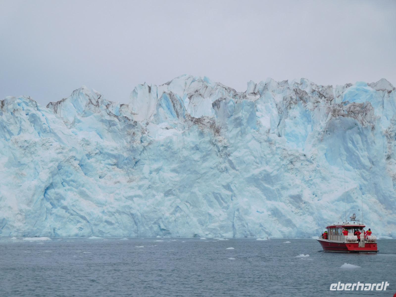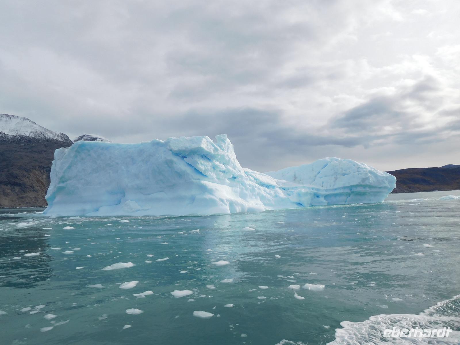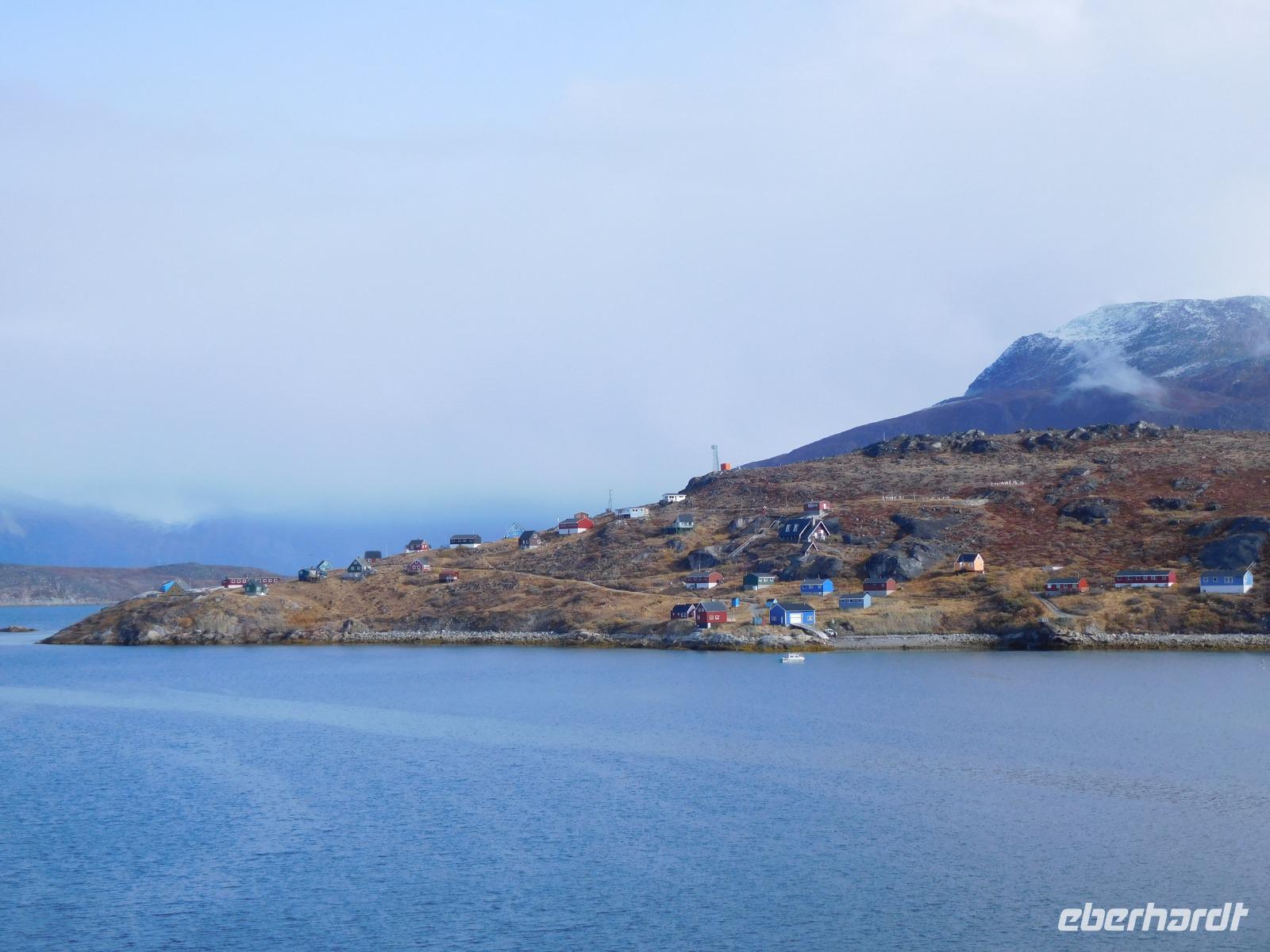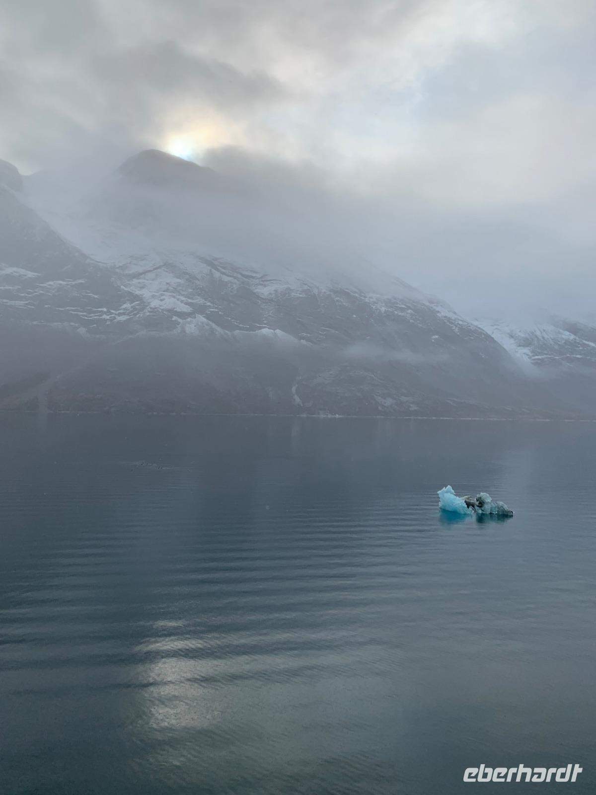 Wir liegen heute ganztags in Qassiarsuk auf Reede und beginnen darum früh mit unserem Programm. Zeitiges Aufstehen, zeitiges Frühstück, die Gäste, die Kajak fahren wollen fertig zum Briefing, Klamotten raussuchen, sortieren, anziehen... STOPP! Eine Borddurchsage: Leider ist unsere geplante Anlandung in Qassiarsuk NICHT möglich. Aufgrund des starken Windes und der Wellen ist es nicht möglich sicher an Land zu gelangen. Wir melden uns später wieder mit Informationen zum Programmablauf. Na super, wir hatten doch unseren Tag durchgetaktet... Okay dann warten wir auf weitere Informationen. Kajak fällt aus. Später erfahren wir, dass die komplette Anlandung in Qassiarsuk ausfallen muss und somit auch diverse Wanderungen und auch der Besuch der Weltkulturerbestätte Brattahlid, die Siedlungsstelle Erik des Roten. Hier kann man die Ruinen der ersten Kirche auf grönländischem Boden besichtigen, ebenso wie die Ruinen eines nordmännischen Langhauses. Auch der erste Thingplatz befindet sich hier. Aber um dies zu sehen, müssen wir nochmal wiederkommen. Der Schiffsbesatzung gelingt es - nachdem sich auch der Wind etwas gebessert hat - auf der gegenüberliegenden Seite, im nicht unbedeutenden Ort Narsarsuaq eine Anlandung zu organisieren. Da sich das Wetter tatsächlich etwas bessert, kann nun auch die Freude auf ein Highlight der Reise steigen, die Fahrt in den Qootoq Eisfjord. Wir liegen den ganzen Tag vor Ort und je nach Abfahrtszeit für das Boot zum Fjord, bleibt auch Zeit den kleinen Ort zu erkunden. Ein 30 minütiger Fußweg führt vom Hafen nach Narsarsuaq, welches tatsächlich einen internationalen Flughafen besitzt. Da sich hier von 1941-1958 eine Air Base der US Army befand, wurde der vorhandene Flughafen danach von Dänemark übernommen und bietet heute auch Verbindungen nach Kopenhagen und Reykjavik. Auch während wir da sind landen bzw. starten 4 Maschinen, allerdings alle kleineren Formats. Der Ort verfügt neben dem Flughafen über ein recht großes Hotel, eine Tankstelle, mehrere Cafés und ein tolles kleines Museum. Dieses besuchen wir auch und bewundern die zweigeteilte Ausstellung. Zum einen geht es um die Siedlungsgeschichte der Nordmänner, die allgegenwärtig ist. Zum anderen gibt es eine Ausstellung über die Zeit Narsarsuaqs als Militärbasis mit Hospital. Nun sind wir aber alle ganz gespannt auf unseren Ausflug in den Eisfjord. Mit kleinen Booten für bis zu 12 Gästen rasen wir mit den einheimischen Kapitänen in Richtung Fjord und bereits am Eingang können wir die ersten Eisberge sehen. In 1000 Formen und fast immer zumindest mit einem blauen Schimmer werden es immer mehr und unsere Bootsfahrer müssen genau darauf achten, wo sie lang fahren. Ganz erfahren bringen sie uns aber problemlos bis in die Nähe der Gletscherzunge des Qootoq-Gletschers. Dort werden die Motoren ausgestellt damit wir die Ruhe am Eis genießen können. Und tatsächlich hören wir es mehrfach im Inneren des gewaltigen Gletschers krachen. Wir lassen uns entlang der Gletschermauer treiben und genießen dabei einen leckeren Weißwein inklusive echtem Gletschereis. Ein wirklich beeindruckendes Erlebnis, so nah an der Gletscherwand zu sein. Anschließend geht es rasant durch die Eisberge und -schollen zurück mit ein paar gigantischen Eisbergen am Schluss der Tour. Ich denke alle sind von der Gewaltigkeit des Eises positiv überwältigt. Es bleibt noch Zeit in Narsarsuaq für diejenigen, die den Ort noch nicht besucht haben. Zum Abendessen sind dann alle zurück an Bord und es heißt Leinen los! Für die nächsten Tage hoffen wir alle auf gutes Wetter, denn die Überfahrt auf den Spuren von Leifur Eriksson nach Neufundland steht an...