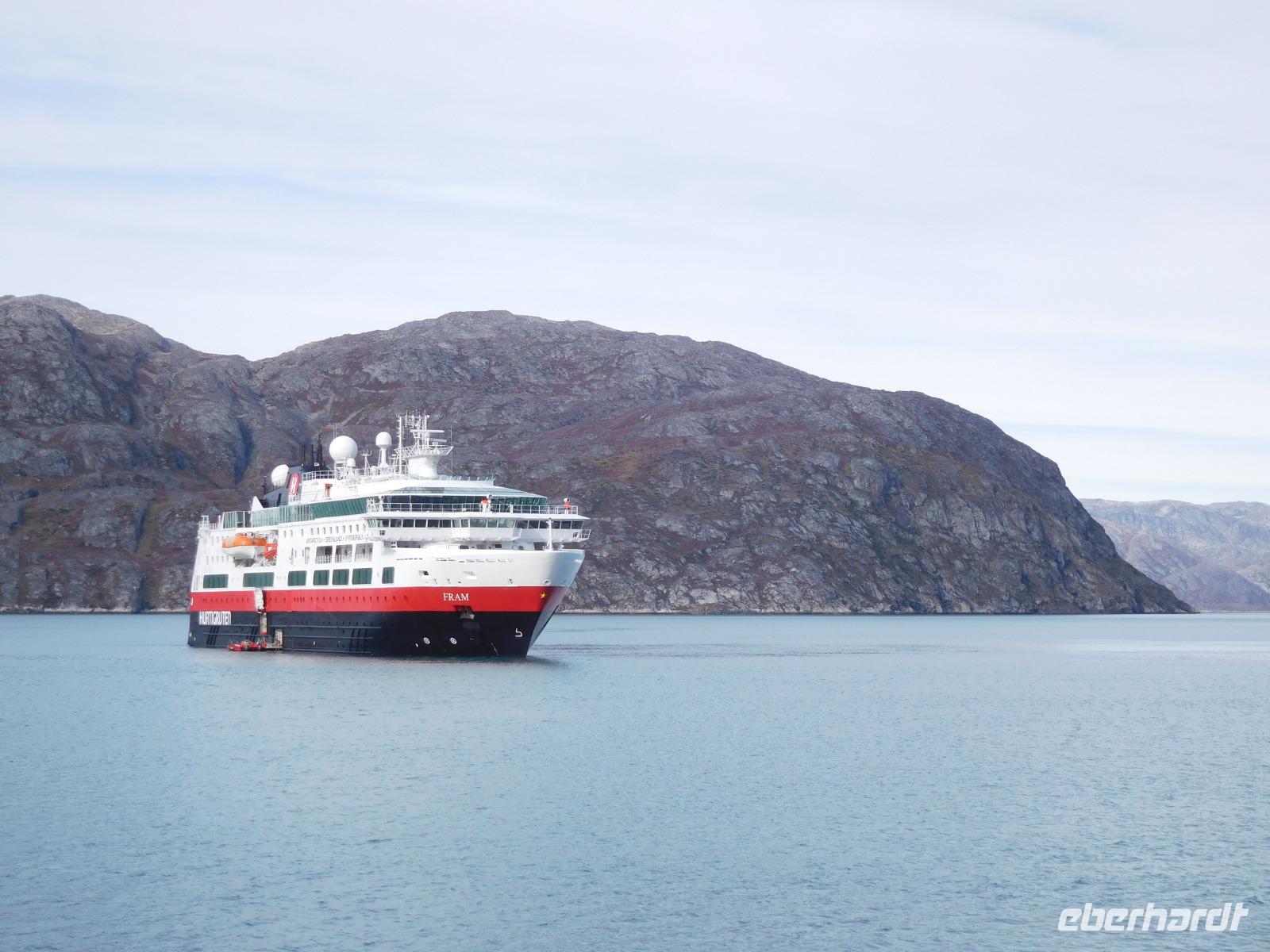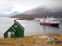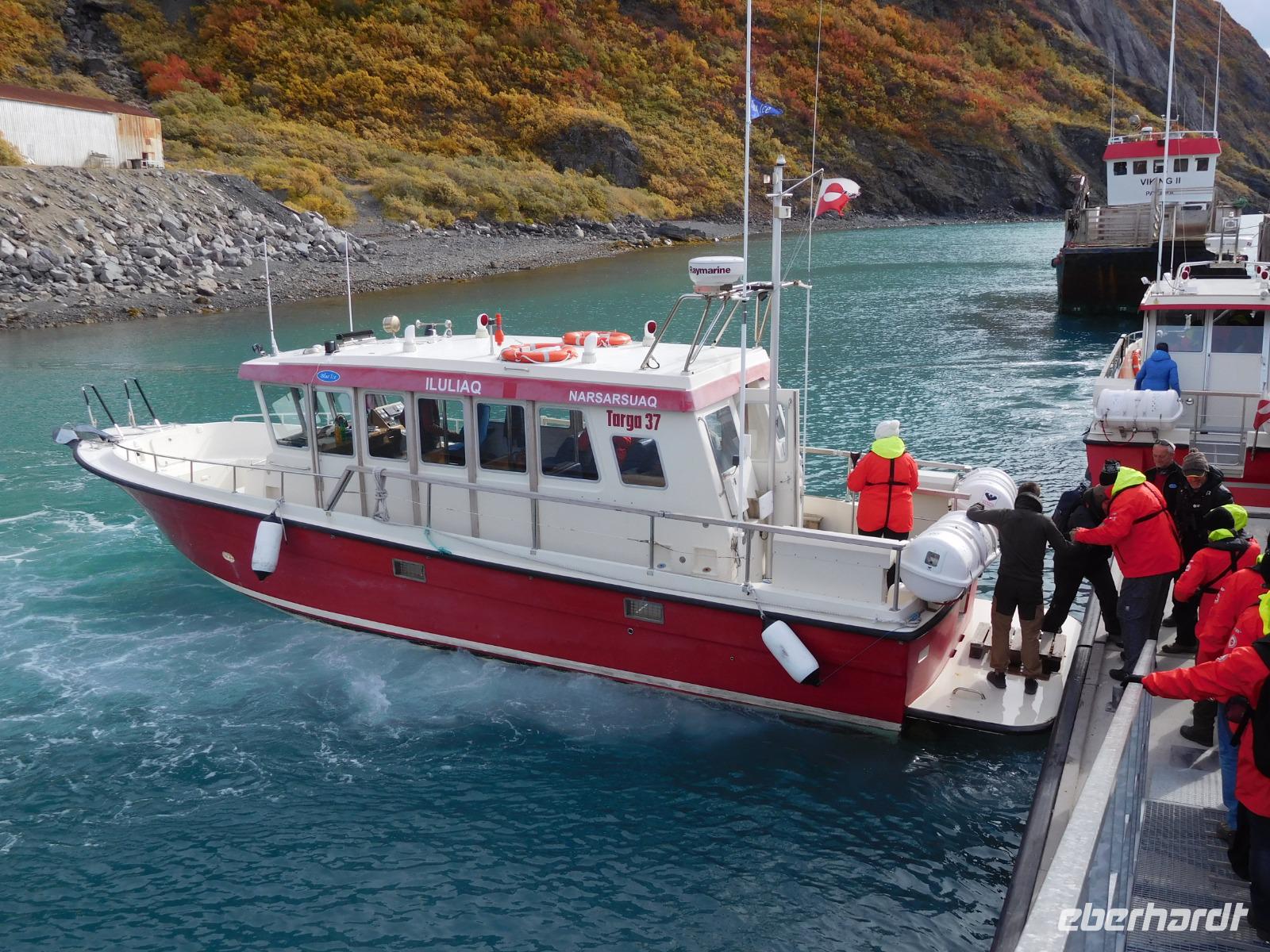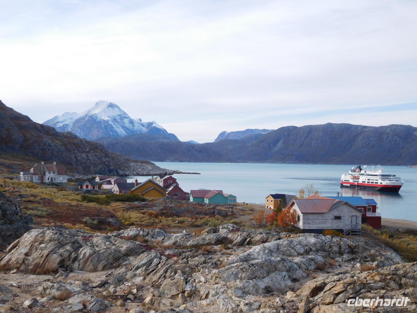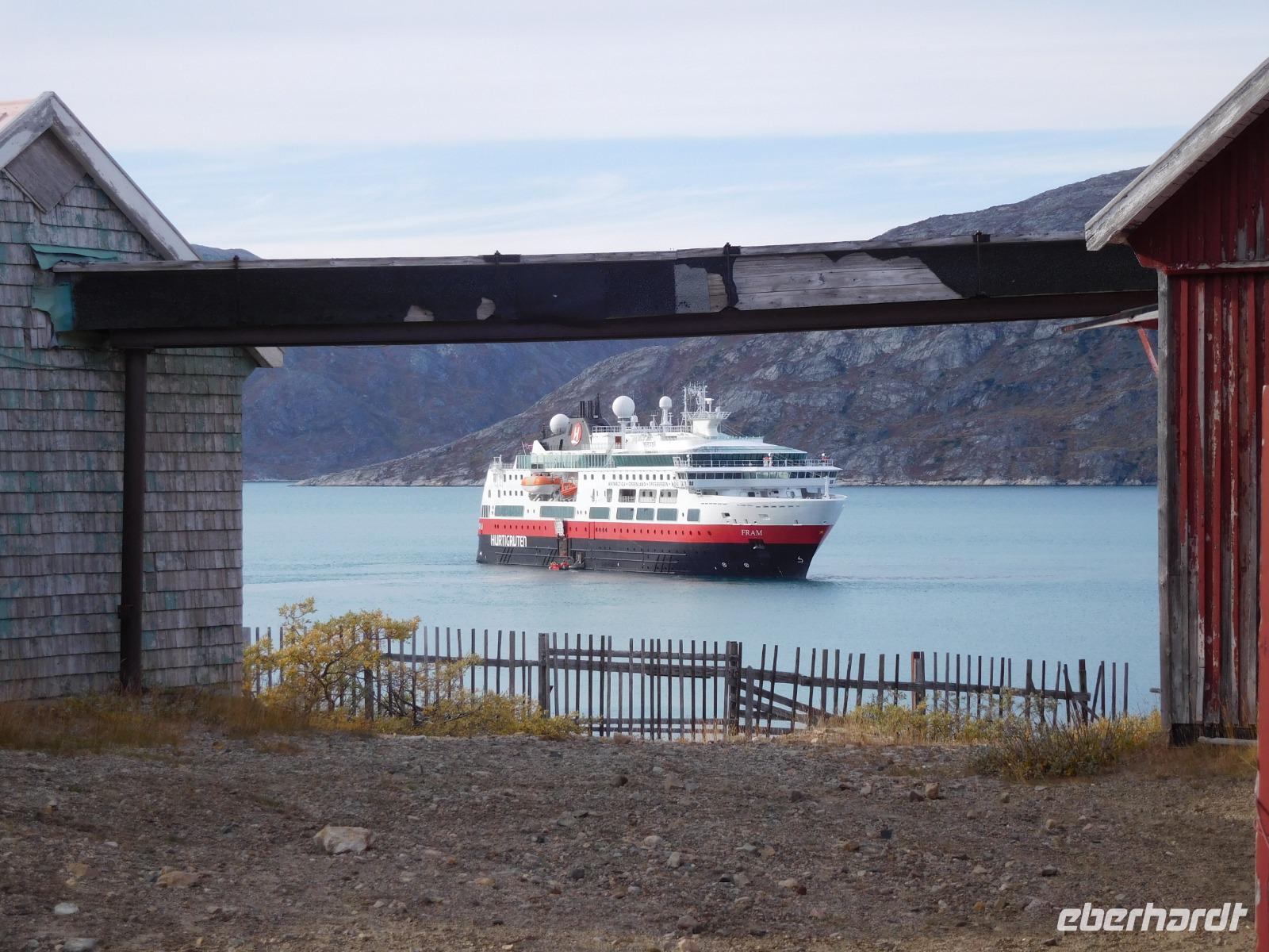 Ausschlafen gibt es auf unserer Reise nicht, denn gegen 08.00 Uhr erwartet uns unser erster richtiger Kontakt mit Kalaallit Nunaat - wie Grönland von den Einheimischen genannt wird. Am Vormittag bleibt erst noch Zeit, die wundervolle Durchfahrt durch den NUUK-Fjord zu genießen und einem Vortrag von Sabine zur Geschichte Grönlands zu lauschen, bevor die MS FRAM ankern wird wir anlanden dürfen. Das Wetter zeigt sich in seiner Wechselhaftigkeit von der schönsten Seite - tief hängende Wolken im Fjord, alles grau in grau wechseln sich mit durchbrechender Sonne und später einem aufgezogenen Himmel ab. Ganz behutsam nähern wir uns mit unserem großen Schiff der kleinen Kommune Kapisallit mit seinen 60 Einwohnern. Die Ortschaft dient als Wochenend- Zielgebiet für die Menschen aus Nuuk und liegt in einer idyllischen Bucht. Wir werden nach dem Mitttagessen in den doch komfortablen Polarcirkel-Booten an Land getendert. Wir sind voll ausgerüstet, denn die meisten wollen nach so langer Zeit an Bord vor allem eins: sich bewegen. Also nehmen wir zahlreich an dem angebotenen „Explorer Hike" - einer Entdeckungswanderung - teil. Wichtigste Überlegung ist in dem Fall die Kleiderwahl, denn das Wetter bleibt sehr wechselhaft. So nehmen wir in jedem Fall die uns von Hurtigruten geschenkte Wind- und Regenjacke mit und die meisten nehmen auch die uns leihweise zur Verfügung stehenden Gummistiefel, denn es ist eine Wanderung abseits der Pfade mit großer Nässegefahr. Nach dem Tendern haben wir noch etwas Zeit für erste Erkundungen, zum Beispiel zum Besuch der kleinen, feinen Kirche des Ortes oder um ein paar spannende Fotos mit der MS FRAM im Fjord liegend zu schießen. Einige Gäste bleiben noch im Ort oder tendern zurück ans Schiff, während der größere Rest zur 2.5-stündigen Wanderung auf einem der Felder ohne erkennbare Wege aufbricht. Durch eine herbstliche Art Heidelandschaft wandern wir mit dem Expeditionsteam. Feuchte Wiesen und tundraartige Felder voller in allen Farben des Herbstes schillernden Pflanzen betonen das Bild. Wir wandern heute auf dem ältesten weltweit nachgewiesenen Gesteinen. Wir entdecken unterwegs allerhand Kleinode und es bietet sich ein fantastisches Panorama während der Tour. Nach 5 Kilometern über Stock und Stein kommen wir ziemlich geschafft im Ortszentrum an und tendern direkt zurück zum Schiff. Es gibt auch gleich Abendessen. Es folgt der obligatorische Vortrag von Sabine über die Abläufe des kommenden Tages. Doch das Beste kommt erst noch. Einige Gäste sitzen noch nichtsahnend in der Bar, während andere schon auf die Kabine gegangen sind, als plötzlich noch eine sehr späte Durchsage erfolgt: Es gibt eine Nordlicht-Sichtung im Heckbereich des Schiffes. Wir lassen alle Getränke stehen bzw. werfen uns noch in vielleicht bereits ausgezogene warme Bekleidung und stürmen das Heck des Schiffes. Ein sensationell breiter Bogen überspannt das Schiff. Für das ungeübte Auge mag es vielleicht wie ein Wolkenstreifen aussehen, doch spätestens als eine Grünfärbung mit dem bloßen Auge erkennbar wird, sind alle gebannt. Dann klicken die Kameras wie verrückt und viele sind erstaunt wie toll die Grünfärbung auf den Bildern erkennbar ist. Dazu gibt es einen mystischen Vollmond und treibende kleine Eisberge im Wasser - so endet ein toller Tag adrenalingeladen und abenteuerlich.