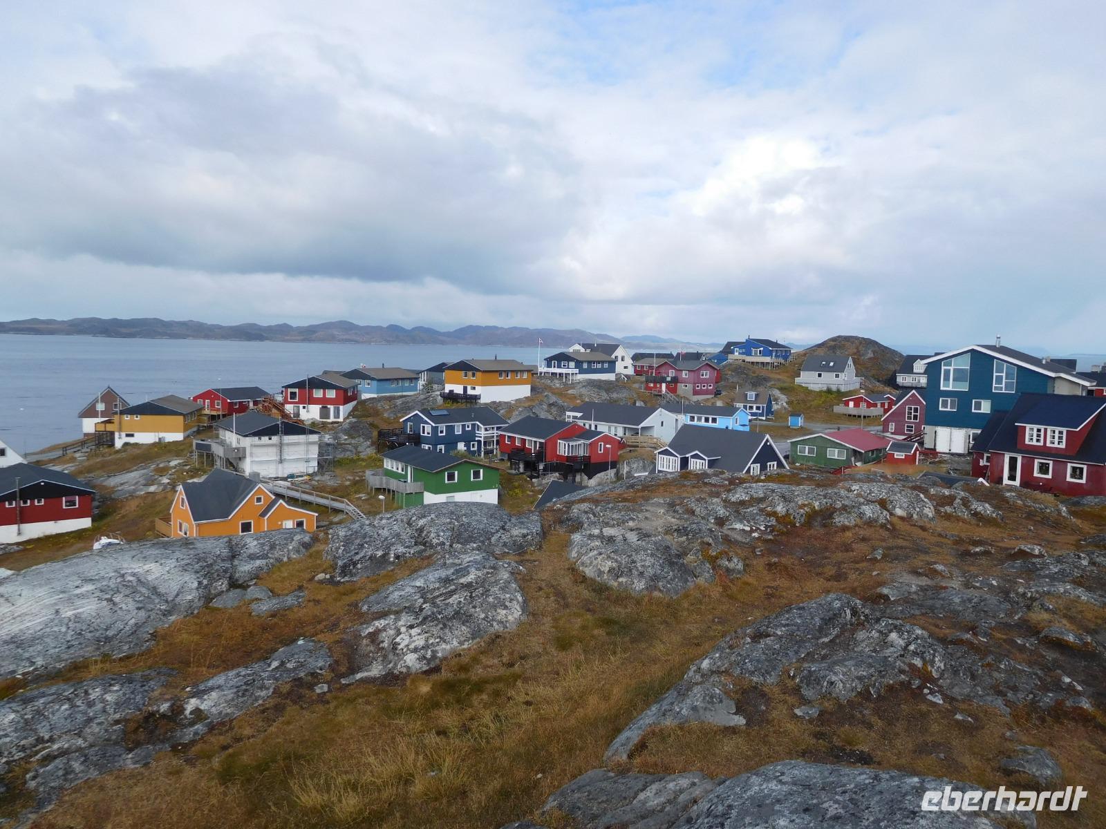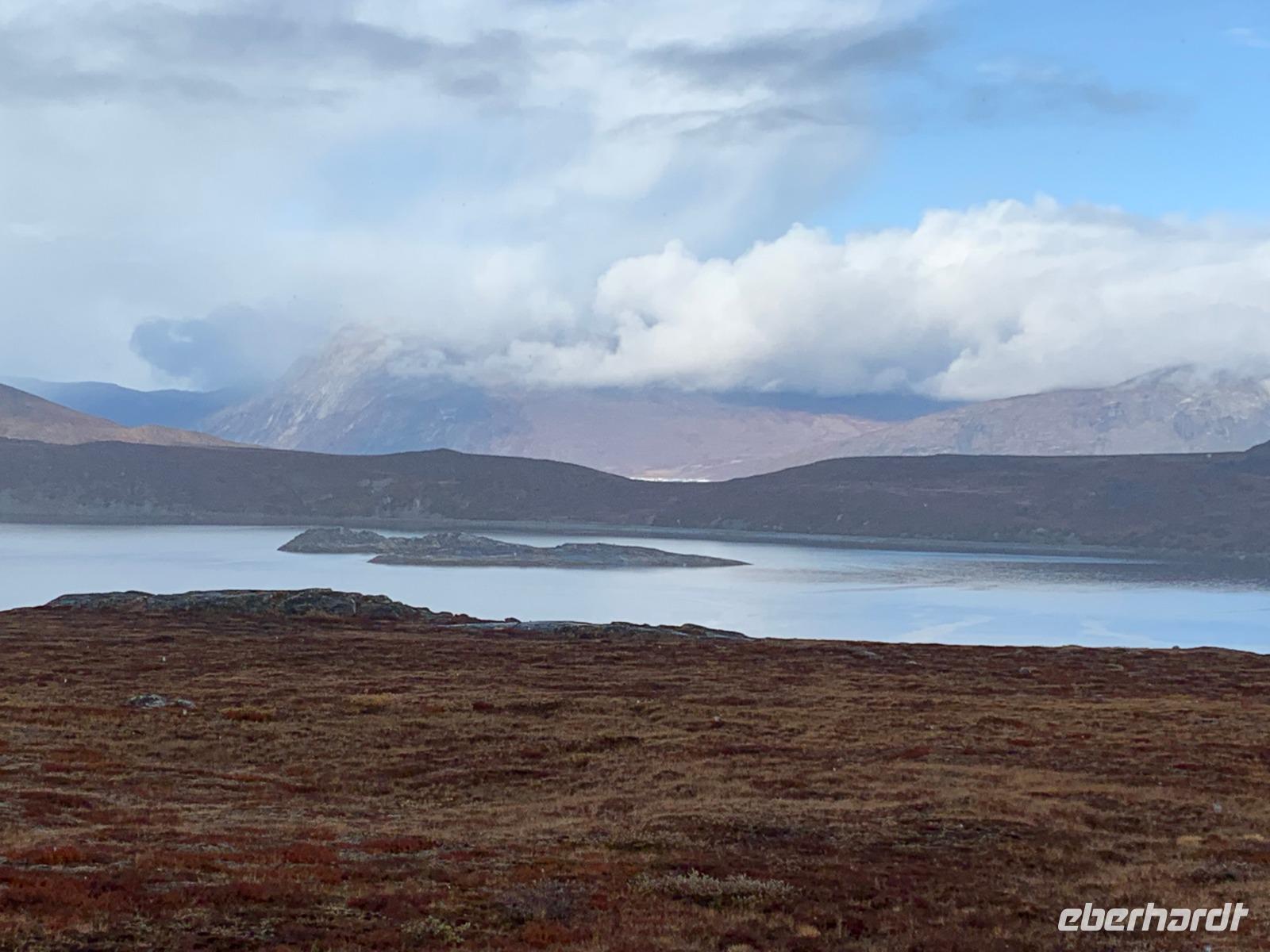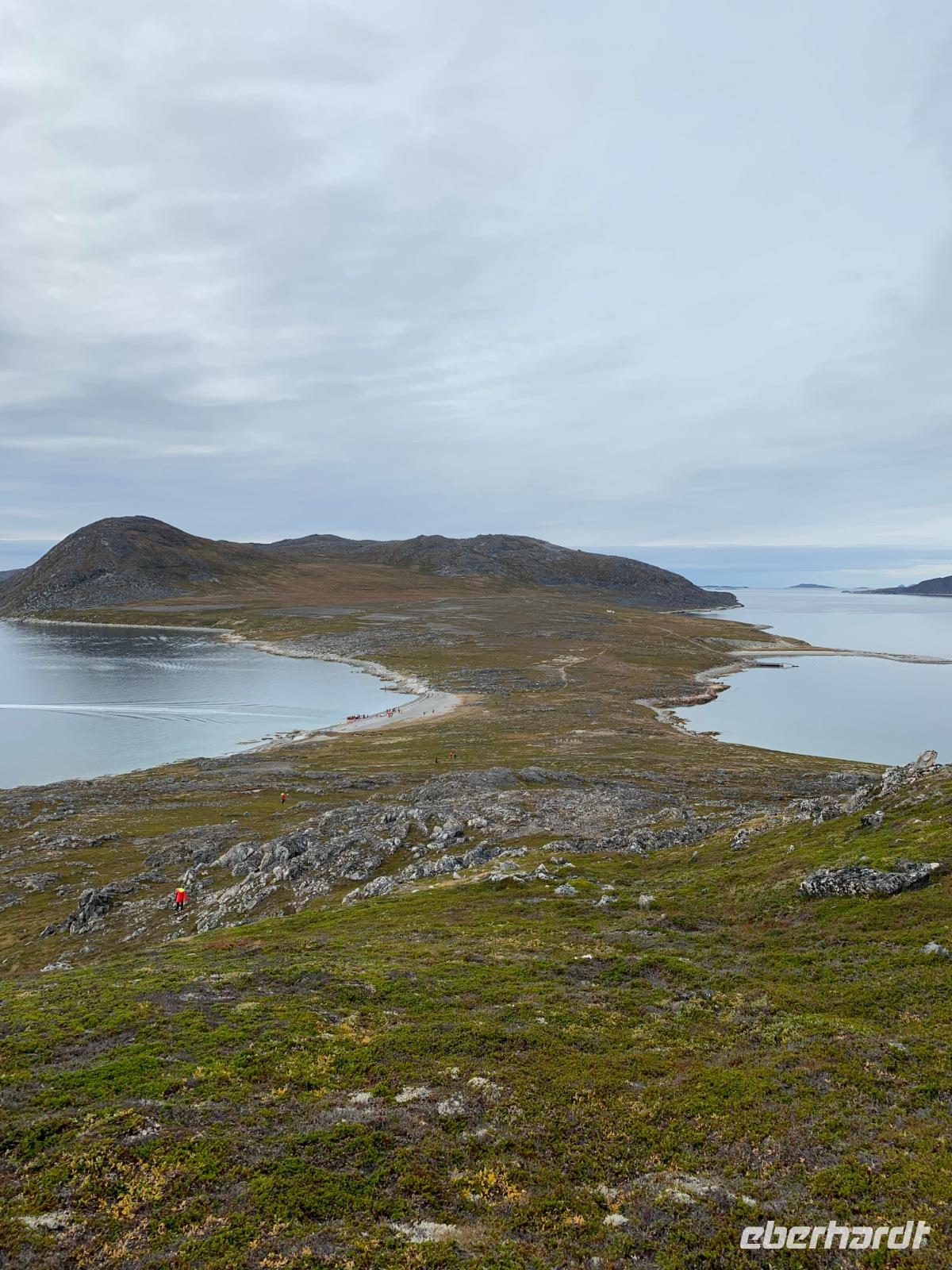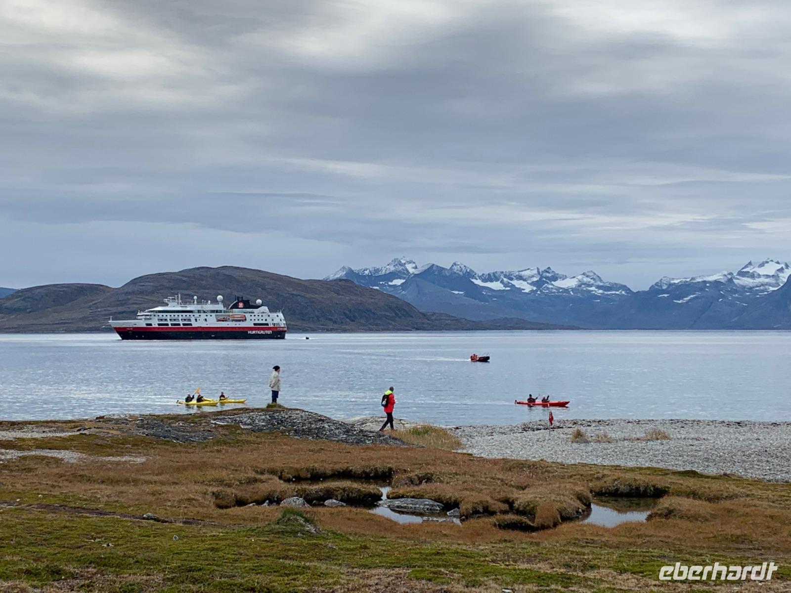 Ausschlafen gibt es auf unserer Reise nicht, denn gegen 08.00 Uhr erwartet uns unser erster richtiger Kontakt mit Kalaallit Nunaat - wie Grönland von den Einheimischen genannt wird. Am Vormittag bleibt erst noch Zeit, die wundervolle Durchfahrt durch den NUUK-Fjord zu genießen und einem Vortrag von Sabine zur Geschichte Grönlands zu lauschen, bevor die MS FRAM ankern wird wir anlanden dürfen. Das Wetter zeigt sich in seiner Wechselhaftigkeit von der schönsten Seite - tief hängende Wolken im Fjord, alles grau in grau wechseln sich mit durchbrechender Sonne und später einem aufgezogenen Himmel ab. Ganz behutsam nähern wir uns mit unserem großen Schiff der kleinen Kommune Kapisallit mit seinen 60 Einwohnern. Die Ortschaft dient als Wochenend- Zielgebiet für die Menschen aus Nuuk und liegt in einer idyllischen Bucht. Wir werden nach dem Mitttagessen in den doch komfortablen Polarcirkel-Booten an Land getendert. Wir sind voll ausgerüstet, denn die meisten wollen nach so langer Zeit an Bord vor allem eins: sich bewegen. Also nehmen wir zahlreich an dem angebotenen „Explorer Hike" - einer Entdeckungswanderung - teil. Wichtigste Überlegung ist in dem Fall die Kleiderwahl, denn das Wetter bleibt sehr wechselhaft. So nehmen wir in jedem Fall die uns von Hurtigruten geschenkte Wind- und Regenjacke mit und die meisten nehmen auch die uns leihweise zur Verfügung stehenden Gummistiefel, denn es ist eine Wanderung abseits der Pfade mit großer Nässegefahr. Nach dem Tendern haben wir noch etwas Zeit für erste Erkundungen, zum Beispiel zum Besuch der kleinen, feinen Kirche des Ortes oder um ein paar spannende Fotos mit der MS FRAM im Fjord liegend zu schießen. Einige Gäste bleiben noch im Ort oder tendern zurück ans Schiff, während der größere Rest zur 2.5-stündigen Wanderung auf einem der Felder ohne erkennbare Wege aufbricht. Durch eine herbstliche Art Heidelandschaft wandern wir mit dem Expeditionsteam. Feuchte Wiesen und tundraartige Felder voller in allen Farben des Herbstes schillernden Pflanzen betonen das Bild. Wir wandern heute auf dem ältesten weltweit nachgewiesenen Gesteinen. Wir entdecken unterwegs allerhand Kleinode und es bietet sich ein fantastisches Panorama während der Tour. Nach 5 Kilometern über Stock und Stein kommen wir ziemlich geschafft im Ortszentrum an und tendern direkt zurück zum Schiff. Es gibt auch gleich Abendessen. Es folgt der obligatorische Vortrag von Sabine über die Abläufe des kommenden Tages. Doch das Beste kommt erst noch. Einige Gäste sitzen noch nichtsahnend in der Bar, während andere schon auf die Kabine gegangen sind, als plötzlich noch eine sehr späte Durchsage erfolgt: Es gibt eine Nordlicht-Sichtung im Heckbereich des Schiffes. Wir lassen alle Getränke stehen bzw. werfen uns noch in vielleicht bereits ausgezogene warme Bekleidung und stürmen das Heck des Schiffes. Ein sensationell breiter Bogen überspannt das Schiff. Für das ungeübte Auge mag es vielleicht wie ein Wolkenstreifen aussehen, doch spätestens als eine Grünfärbung mit dem bloßen Auge erkennbar wird, sind alle gebannt. Dann klicken die Kameras wie verrückt und viele sind erstaunt wie toll die Grünfärbung auf den Bildern erkennbar ist. Dazu gibt es einen mystischen Vollmond und treibende kleine Eisberge im Wasser - so endet ein toller Tag adrenalingeladen und abenteuerlich.