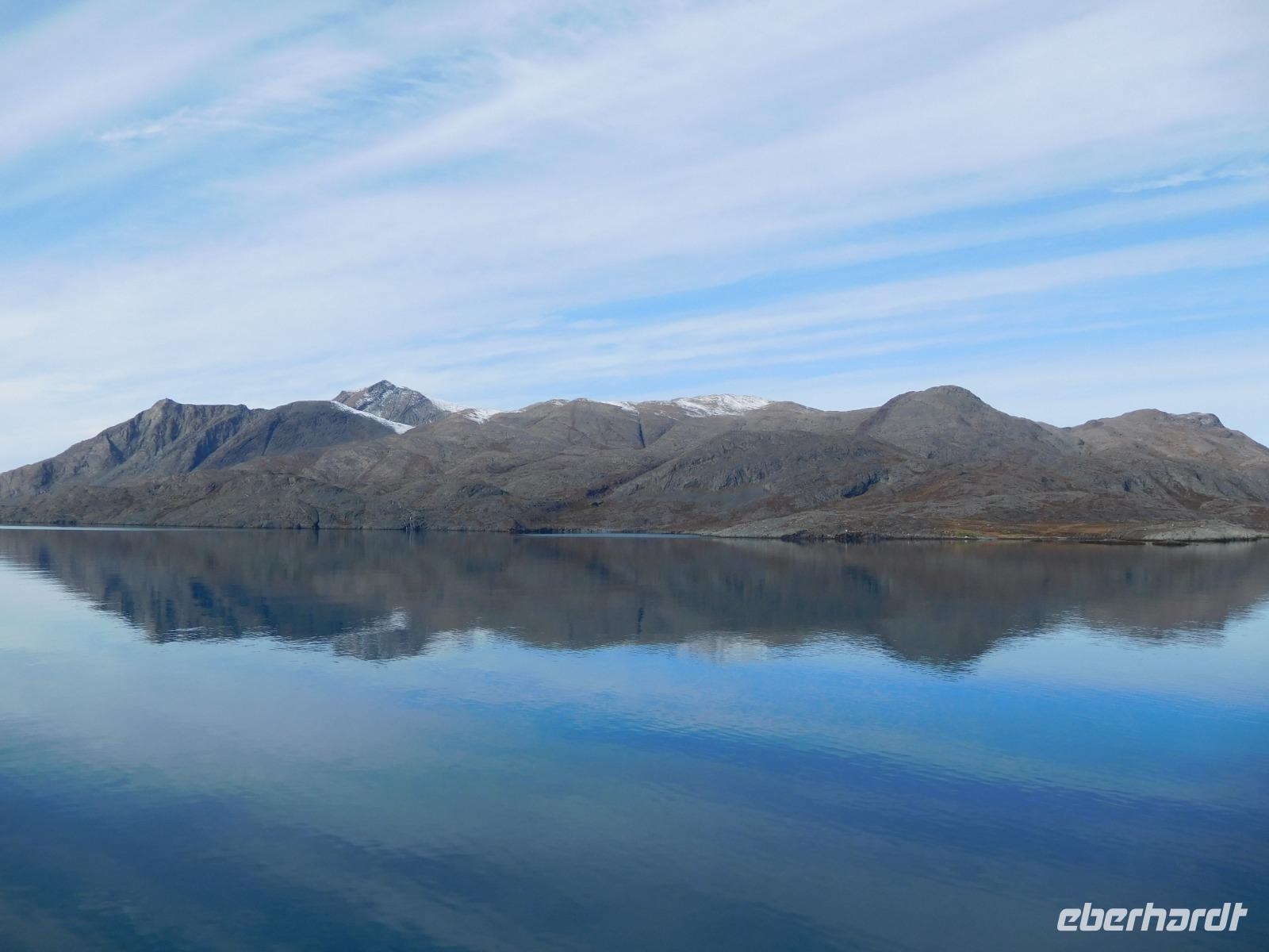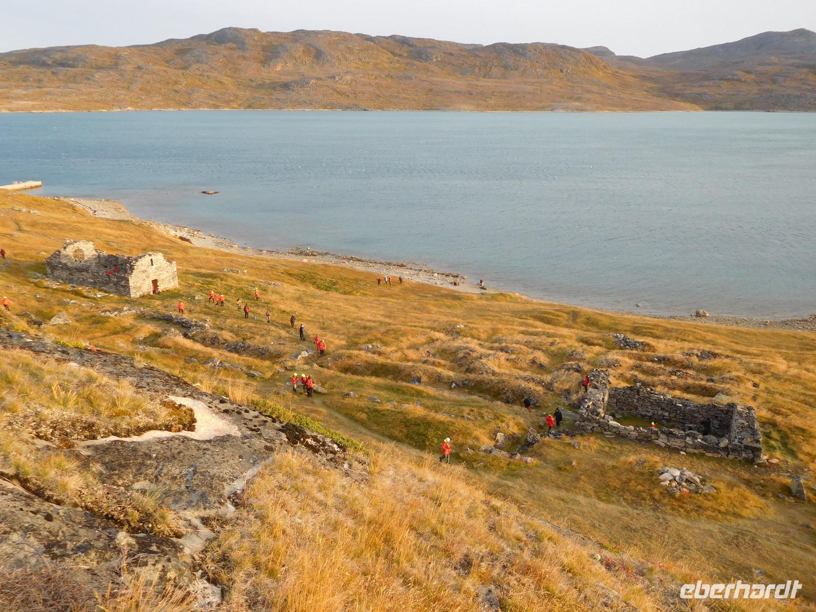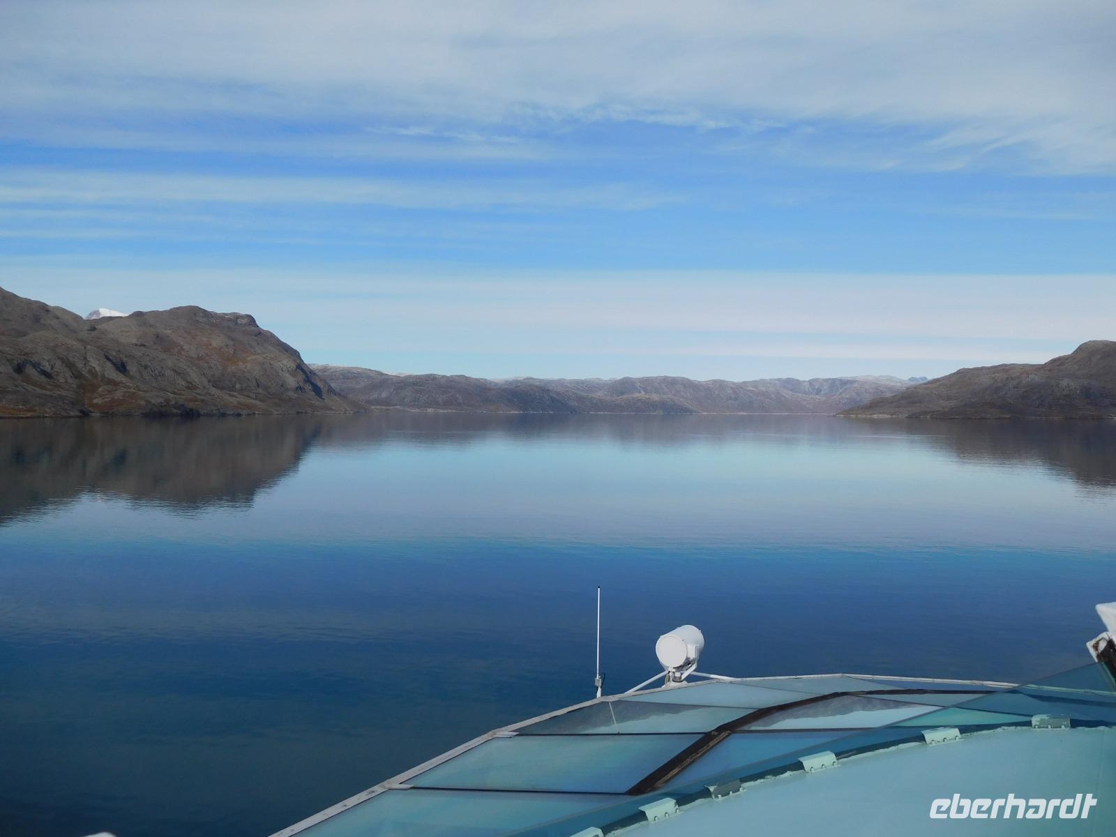 Heute bewegen wir uns entlang der Westküste weiter in Richtung Süden. Wie jeden Morgen werden wir zuerst über Schiffsposition, Wettervorhersage und das angetsrebte Programm informiert. Danach bleibt Zeit für interessante Vorträge. Sabine klärt uns über die moderne Geschichte Grönlands auf und die Schiffs-Ornithologin Holly erklärt uns, worauf man bei der Beobachtung von Seevögeln achten muss. Wir fahren heute ganz gemächlich in den Arsuk-Fjord ein und da wir trockenes sonniges Wetter haben, wird die Befahrung des Fjords zu einem wirklichen Erlebnis. Immer wieder ragen Felsketten aus dem Wasser mit fast alpinen Zügen. Hinter jeder Biegung bietet sich ein neuerliches Naturspektakel und vor allem die Spiegelungen entzücken die Fotografen regelrecht. Während des Mittagessens erreichen wir dann Ivittuut und nach unserer Stärkung beginnen wir die Anlandung. Es heißt also rein in die geliehenen Gummistiefel und wetterfeste Kleidung und dann wird in vorgegebenen Gruppen ganz entspannt und sortiert in den Polarcirkel-Booten nach Ivittuut getendert. Die heutige Geisterstadt war früher ein wichtiges Wirtschaftszentrum für Grönland. Hier wurden Anfang des 19. Jahrhunderts Kryolith-Vorkommen entdeckt und sobald man die technischen Möglichkeiten hatte, wurde der wertvolle Stoff abgebaut. 1987 war die Mine endgültig erschöpft und wurde geschlossen. Seit dieser Zeit verfällt der ehemalgie Hauptort der Region. Heutzutage kann man den Ort und seine Gebäude besichtigen, auch wenn man die Gebäude nicht mehr betreten darf. Der ehemalige Kryolith-Bruch ist heute als 80 Meter tiefe, Wasser gefüllte Grube zu sehen. Beim Spaziergang zwischen den Häusern und dem Blick hinein, fühlt man sich 40 Jahre zurückversetzt und kann sich gut vorstellen wie das Leden dort lief. Nben der Siedlung ist Ivittuut auch dafür bekannt, dass sich Moschusochsen aus dem nahen Grönnedal in der Nähe herumtreiben. Auch wir haben mehr oder weniger Glück. Nachdem unser Expeditions-Team die Umgebung erkundet hat und die Außengrenzen mit Gewehren bewaffnet absichert, könnne wir uns ohne Gefahr bewegen. Die äußerst wuchtigen Tiere können auch für den Menschen gefährlich werden und so ist es gut, dass wir ein paar Exemplare vom Schiff aus gesehen und auch an Land mit dem Feldstecher bewaffnet, 2 Tiere beobachten können, die gemütlich liegend auf einer Wiese grasen. Nach ca. 3 Stunden Aufenthalt haben dann auch die letzten Gäste das Schiff wieder erreicht und wir können auslaufen. Das Abendbuffet hat heute "Einen Touch von Asia". Nech dem Essen stimmt uns Sabine auf den nächsten Tag ein und anschließend gibt es eine Präsentation des Küchen- und Service-Teams in der Panorama-Lounge. Neben dem Schnitzen einer Eisskulptur und der fachmännischen Vorführung zur Frucht- und Gemüsegestaltung können wir ebenso beim Entstehen einer Torte zuschauen und wie aus Textilservietten zauberhafte Kunstwerke entstehen. Da es heute wegen Wolkendecke keine Nordlichter gibt, entschließen wir uns alle, heute früher als sonst zu Bett zu gehen.