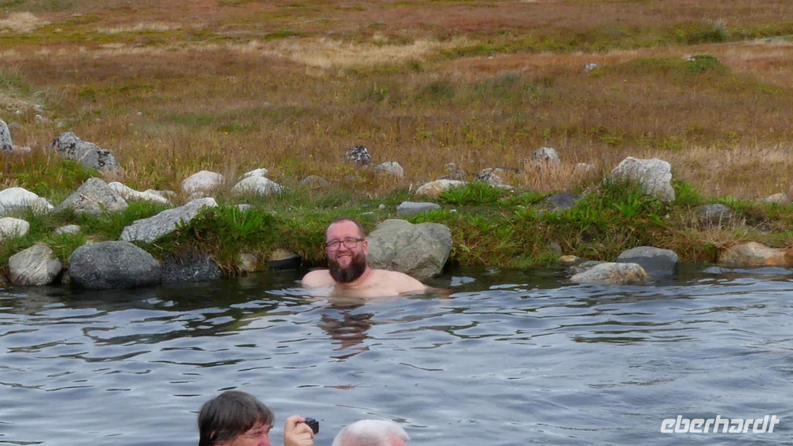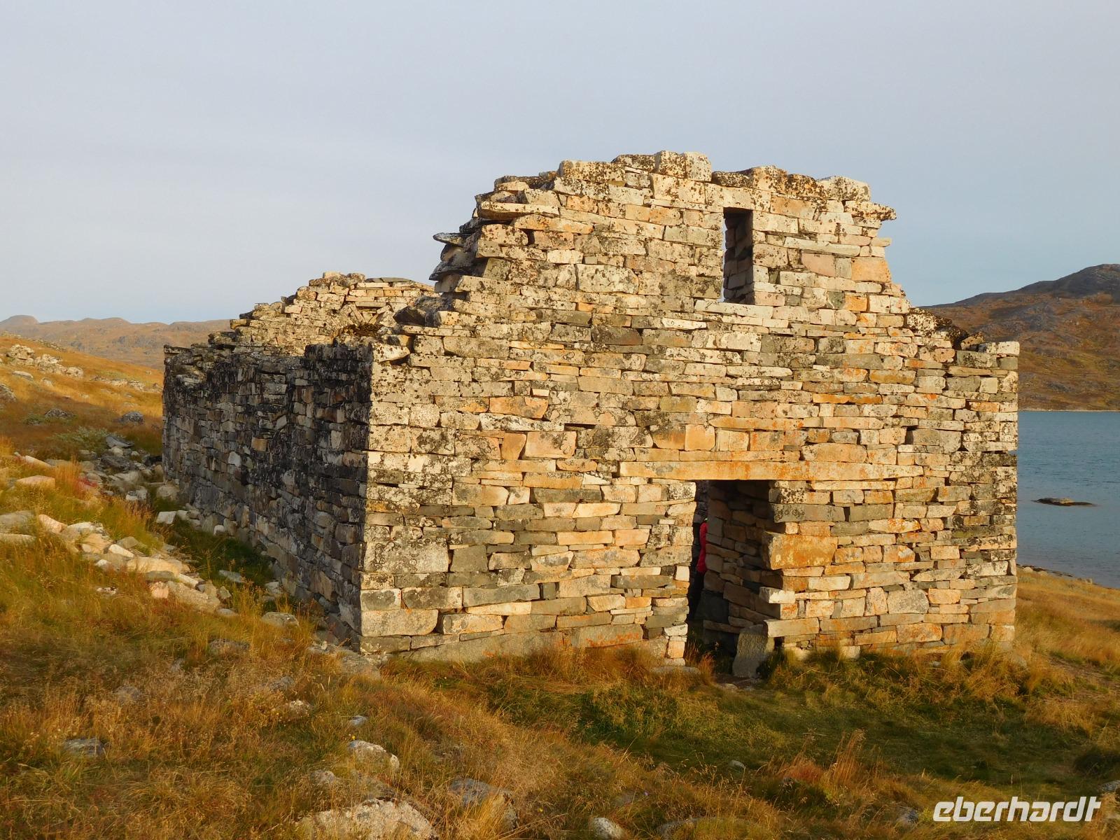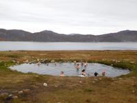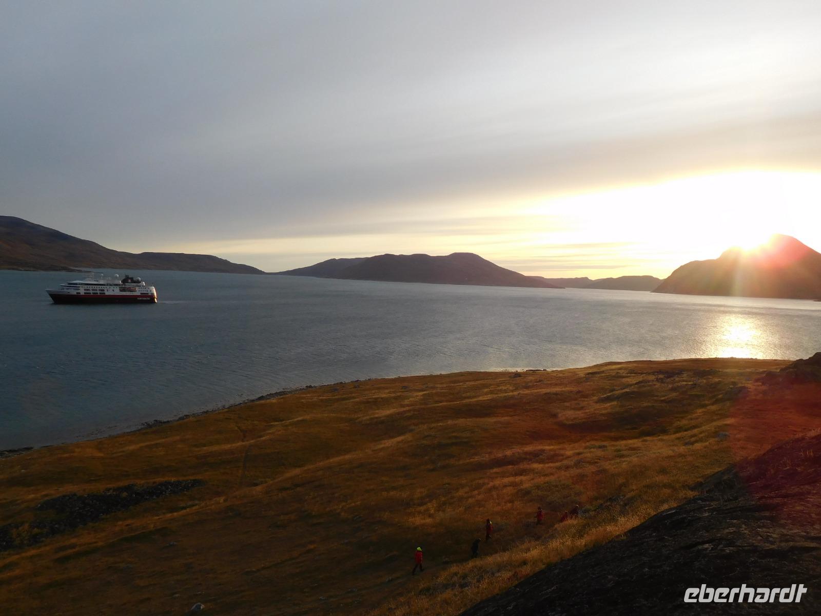 Wir frühstücken dann doch zu normalen Zeiten, obwohl MS FRAM bereits gegen 8 vor der Insel Uunartoq zur Ruhe kommt. Das Expeditionsteam muss bei diesen Anlandungen immer alles an Land vorbereiten, was meist mindestens eine Stunde in Anspruch nimmt. Ab 9 Uhr beginnt dann also das Tendern und wir als Bootsgruppe 1 heute die Vorletzten. Angelandet wird auch heute wieder „nass" obwohl alles trocken bleibt. „Nass" bedeutet in dem Fall allerdings nur, dass wir an einem Strand anlanden und über einen Tritt aussteigen - dabei könnte natürlich der Fuß auch mal nass werden. Nachdem wir den Fuß auf die Insel Uunartoq gesetzt haben, gibt es noch ein kurzes Briefing. Wir entscheiden uns dafür, zuerst zu den heißen Quellen zu laufen. Dabei handelt es sich um ein natürlich erhitztes Wasserloch, welches natürlich gern zum Baden genutzt wird. Auch wir sind vorbereitet und genießen ein paar Minuten das ca. 32 Grad warme Wasser. Anschließend erwartet uns noch ein Berganstieg, um einen Blick in den benachbarten Fjord werfen zu können. Auf dem Weg dahin kommen wir an einem wunderschönen kleinen Strand vorbei... Sprach die Crew nicht von einer Art Mutprobe, dem sogenannten Polar Plunch? Das hieße Probe des eiskalten Wassers. Dafür würde sich doch ein Strand total eignen.. Kurz überlegt und dann geht es auf zur zweiten Baderunde - diesmal reden wir von 6-7 Grad. Egal, ausziehen und los. Ich renne ins Wasser und schon nach einigen Metern habe ich das Gefühl das meine Beine abfrieren. Noch kurz ein paar Posen für den Fotoapparat und dann nichts wie raus. Nicht weit weg gibt es andere Mutige aus unserer Gruppe, aber insgesamt hält sich der Mut in Grenzen... Zum Warmwerden erklimmen wir noch den Berg in Nähe der Anlandungsstelle und genießen den Blick in die Ferne. Über endlose Krähenbeer-Felder geht es zurück zum Tenderboot und dann auf MS FRAM. Wir starten zur Mittagszeit, denn wir haben heute noch ein Ziel: Hvalsey. Hier finden sich die Ruinen einer Kirche aus der Besiedlungszeit durch die Nordmänner. Die letzte historisch belegte Trauung fand hier 1483 statt. Heute gehören die Ruinen zum UNESCO-Weltkulturerbe, da sie noch sehr gut erhalten sind. Auf dem Weg dahin füllen die Lektoren an Bord die Zeit wieder interessanten Vorträgen, heute zum Thema Fotografie mit Camille, die übrigens viele Arbeiten für den National Geographic durchführt, und zur Biogeografie von Grönland. Auch die Tierwelt meint es gut mit uns und so vermeldet der eine oder andere sogar eine Walsichtung. Am späten Nachmittag erfahren wir dann, dass es mit der Anlandung in Hvalsey doch noch klappt. So streifen wir nochmals die Gummistiefel über, denn dieses Mal müssen wir tatsächlich die letzten beiden Schritte im Wasser absolvieren. Dann ahben wir Zeit, vor Ort zwischen den Ruinen der Kirche und weiterer zerfallenen Gebäude zu spazieren. Zusätzlich genießen wir den Sonnenuntergang. Danach wird es recht kühl und wir kehren zum Schiff zurück. Nach einem leckeren Buffet heißt es tatsächlich wieder Nordlicht-Alarm, dieses Mal sind sie nicht ganz so intensiv, dafür können wir dieses Mal rote und blaue Nordlichter entdecken. Dann heißt es ab ins Bett denn morgen erwartet uns ein voll gepackter Tag.