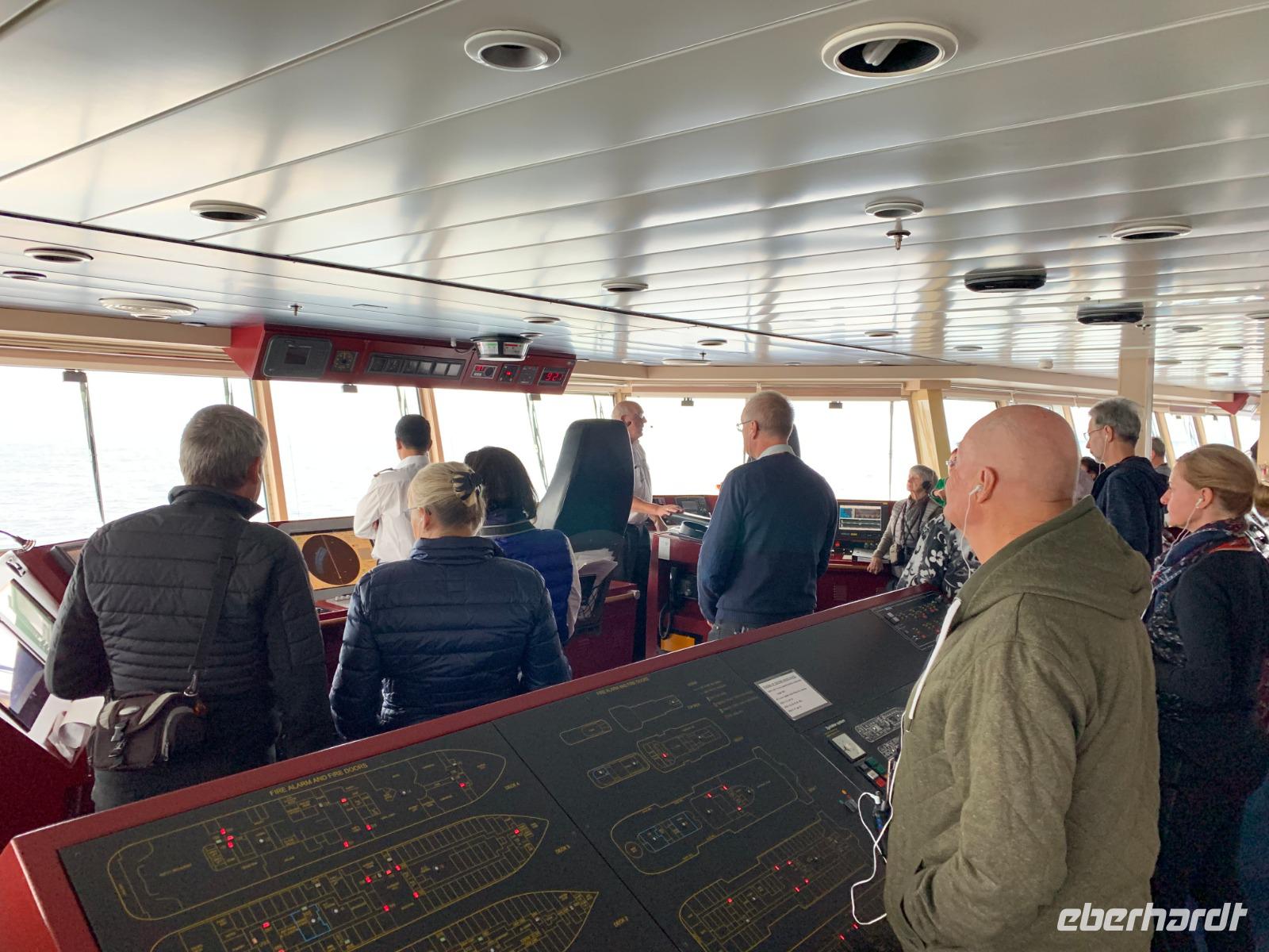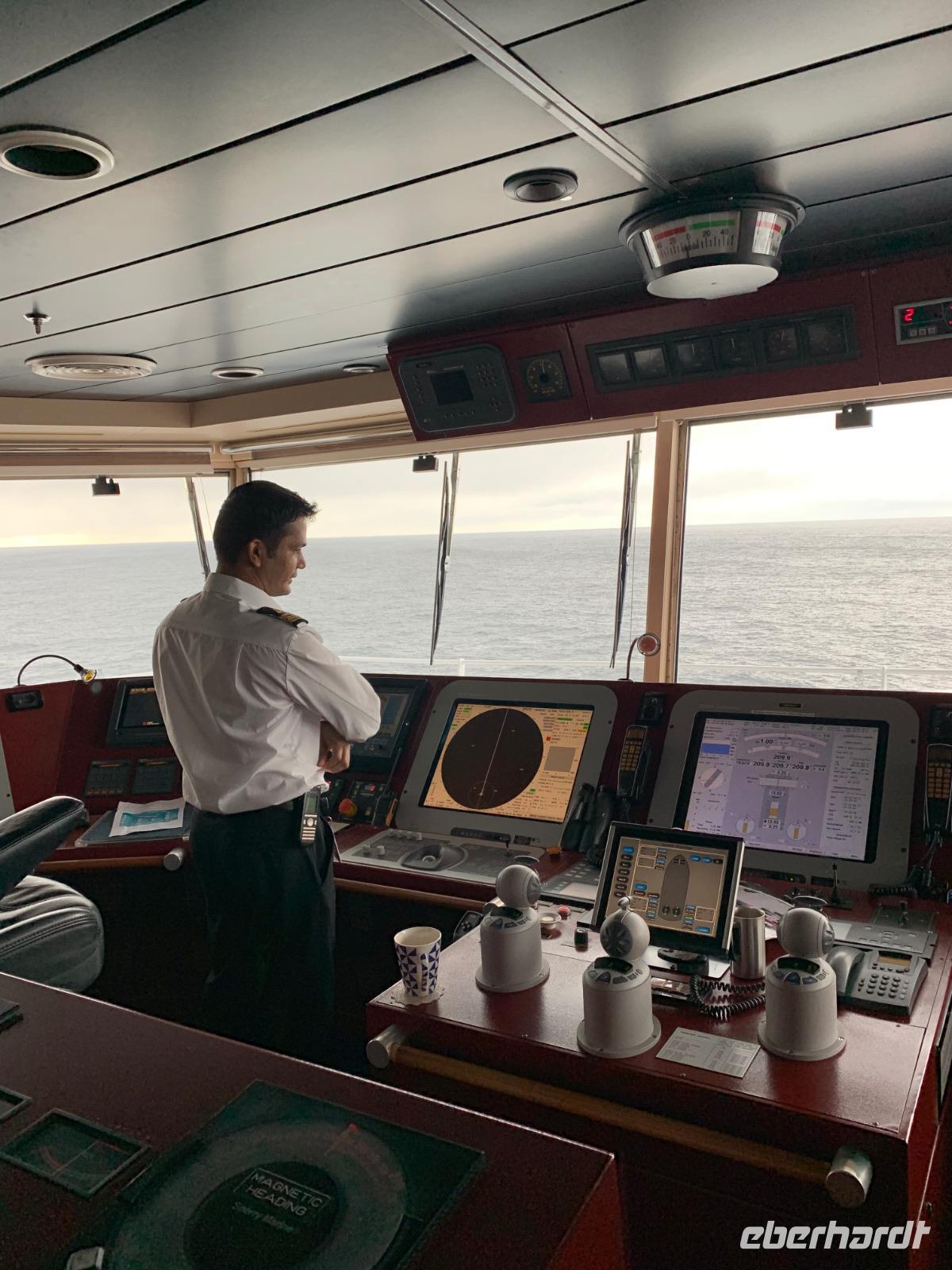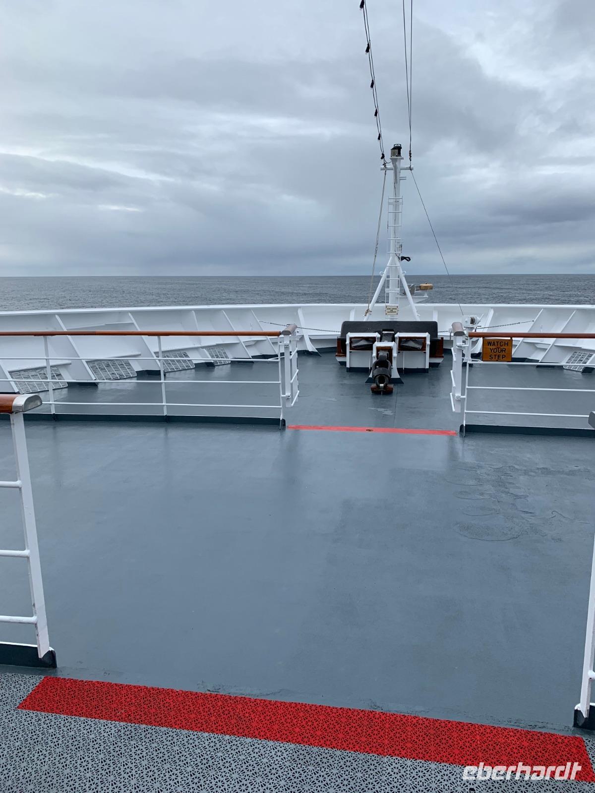 Die kommenden beiden Tage verbringen wir auf dem Ozean. Wir überqueren die Labrador-See von Südwest-Grönland nach Neufundland. Neben der Hoffnung auf einigermaßen ruhige See, überlegen wir vor allem auch, wie wir die Zeit an Bord verbringen werden. Doch unser Expeditionsteam hat uns ein abwechslungsreiches Programm zusammengestellt: Vorträge, Filme, Aktivitäten. Wir haben die Möglichkeit das Experten-Team zu treffen und unsere Fragen direkt beantwortet zu bekommen. Wir dürfen sogar die Brücke besuchen, natürlich ein Höhepunkt. Der Kapitän nimmt uns mit einem Navigator in Empfang und erklärt uns die Abläufe und jegliche Gerätschaften auf der Brücke. Wir erfahren technische Details zum Antrieb von MS FRAM und auch zur Routenbestimmung. Aus dem Mund des Kapitäns hören wir, dass das Wetter ziemlich passabel bleiben soll und alle atmen schon ein wenig durch. Unser Tagesablauf wird nun noch etwas entschleunigt und jeder kann seinen Tag gestalten wie er möchte. Heute stehen ein Film über die Arktis auf dem Programm, Vorträge von Sabine über „Die Siedlung der Nordmänner im Norden", von Rudolf zur „Pflanzenwelt Grönlands" und von Kristian zur „Geschichte des Kajaks und die Migration der Inuit". Am Abend präsentiert uns die Crew bei einer kleinen Modenschau Outdoor-Mode und es erwartet uns ein arktisches 5-Gänge-Menü. So sieht ein typischer Seetag aus... Damit man einen Eindruck bekommt, wie so ein