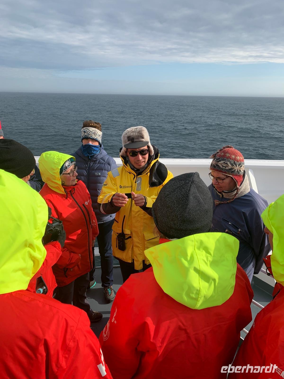 Nach ausnahmsweise ziemlich viel Schlaf beginnt unser neuer Seetag, wie immer Kräfte sammelnd mit einem leckeren Frühstück. Auch heute gibt es ein abwechslungsreiches Programm für uns, u.a. einen Vortrag unseres Ozeanologen zu Meeresströmungen und einen Vortrag von Herb zur Plattentektonik. Eine wirklich witzige und abwechslungreiche Form ist die Speaker's Corner. An Deck stehen uns 4 Experten zu 4 Themen zur Verfügung und per Schlag der Schiffsglocke der MS FRAM wird, ähnlich wie beim Speeddating, aller 10 Minuten der Dozent gewechselt. Am Abend erwartet uns dann wieder ein leckeres 5-Gänge-Menü.