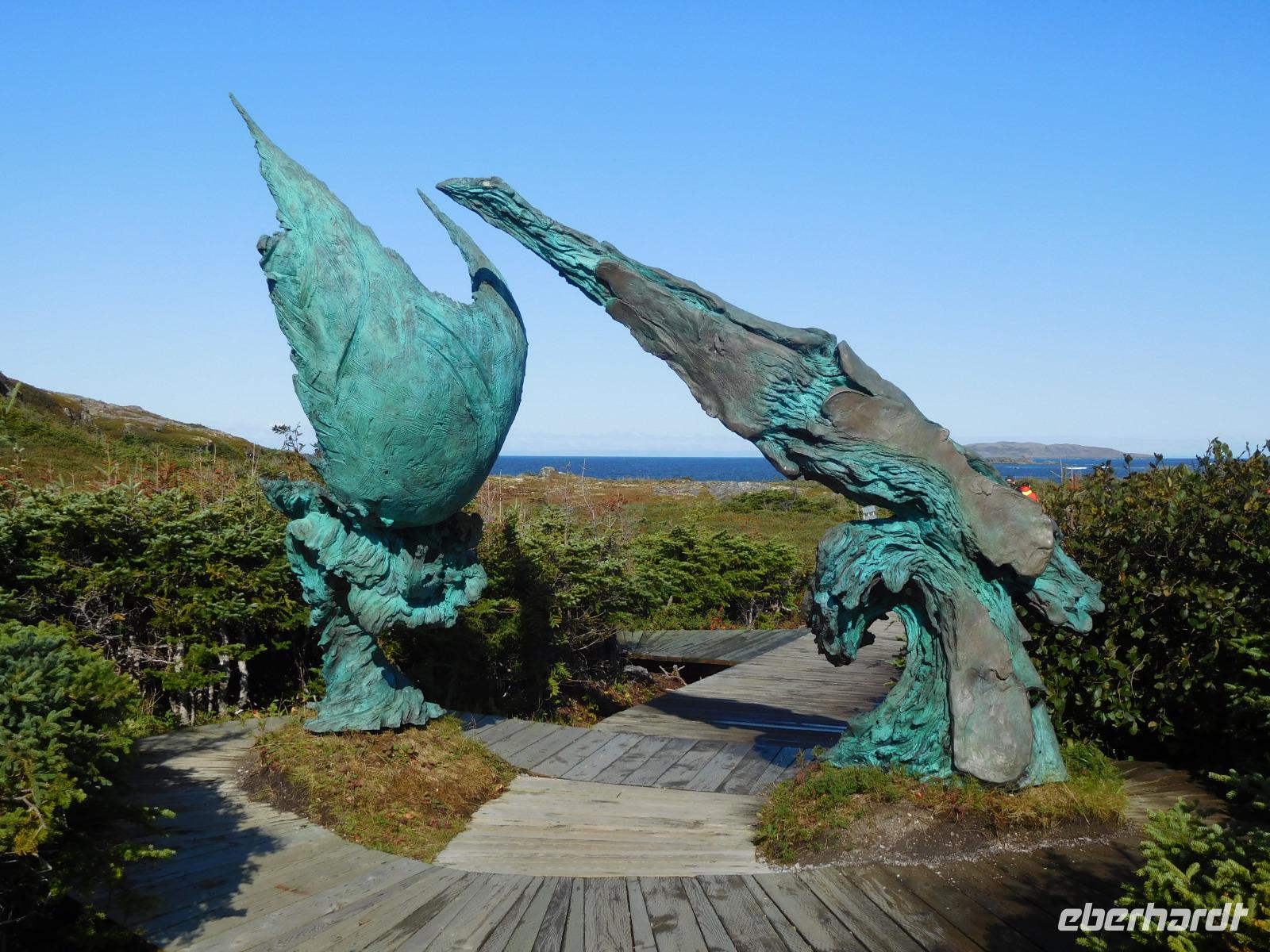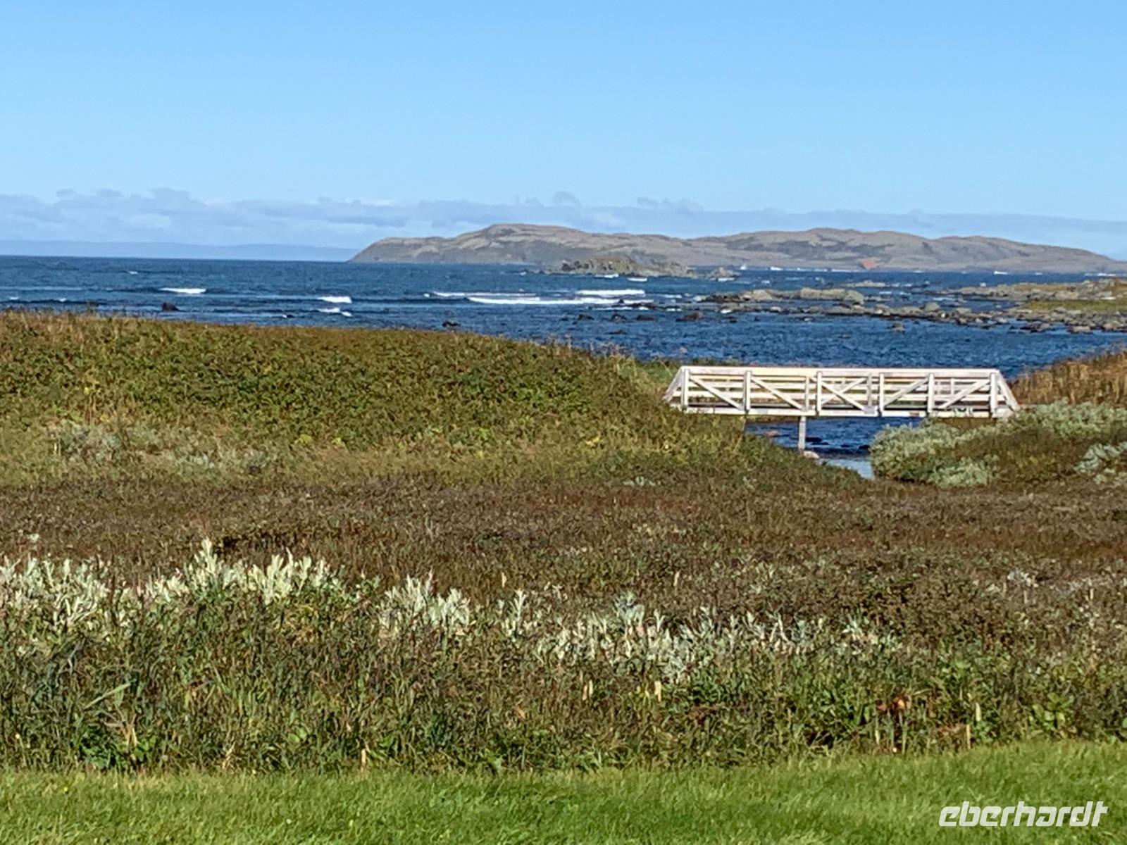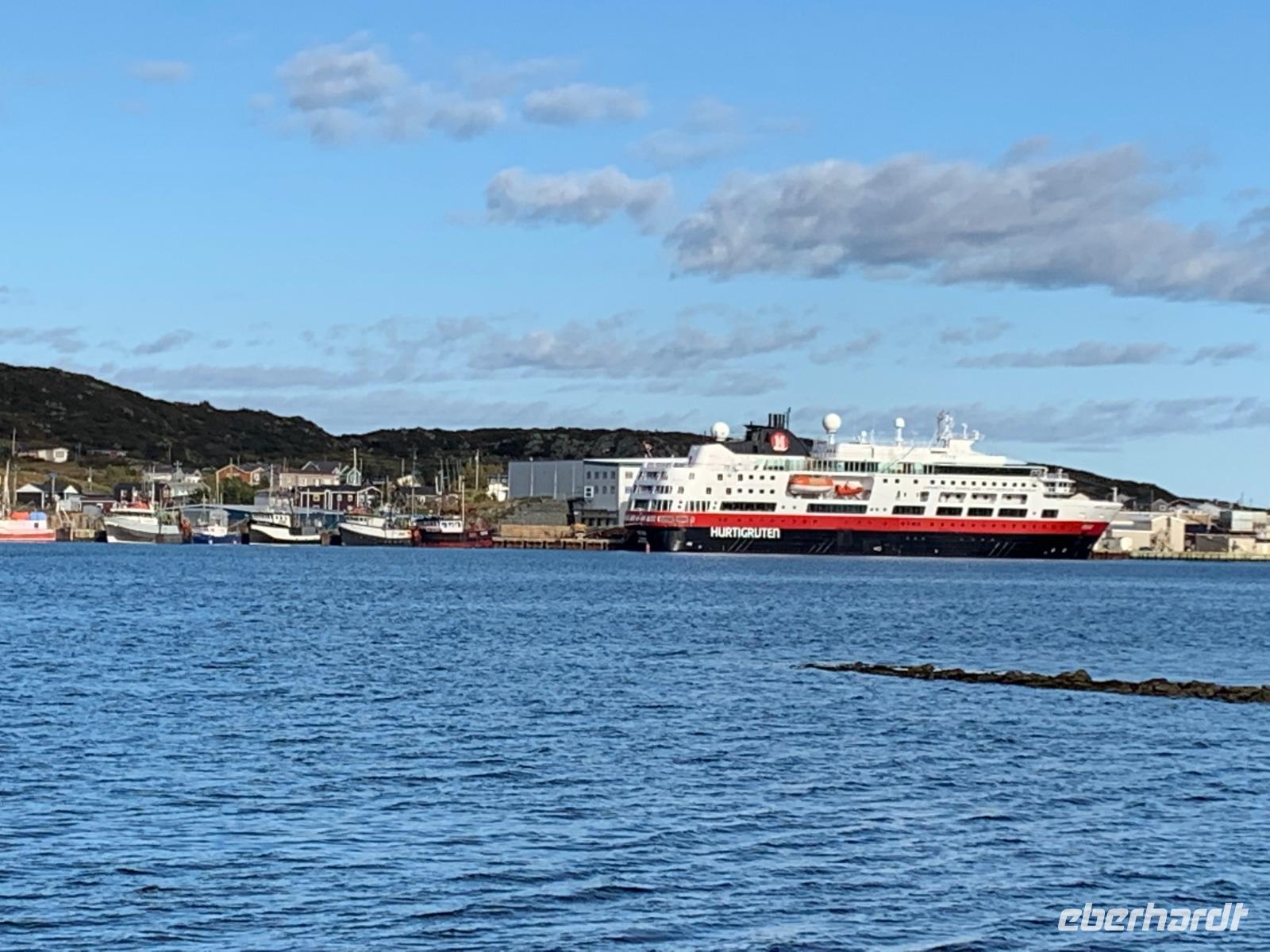 Am Morgen erreichen wir St. Anthony in Neufundland und somit reisen wir heute nach Kanada ein. Da wir nach zweit Seetagen endlich wieder an Land wollen, müssen allerdings auch die entsprechenden Einreiseformalitäten eingehalten werden. Während des Frühstücks kommt also der Zoll an Bord, um die von uns ausgefüllten Einreisekarten und die an der Rezeption hinterlegten Reisepässe zu kontrollieren. Das Schiff wird dann frei gegeben und wir können zu unserem Ausflug starten. Alle, die keinen Ausflug gebucht haben, können die 2.200 Einwohner zählende Metropole auf eigene Faust erkunden. Wir als Besucher vom Schiff werden von den Einheimischen äußerst gastfreundlich empfangen. Wir starten bei strahlendem Sonnenschein und blauem Himmel in Schulbussen - unserer ist Baujahr 2001 - zu unserem Ausflug nach Norden, in das Weltkulturerbe-Zentrum L'ans aux Meadows . Die Fahrt dauert ca. 45 Minuten und wir erkunden die erste nachweisbare Siedlung Leifur Eriksons mit unserer Führerin Dale und Sabines Übersetzungen. Das Gelände der Ausgrabungen ist sehr weitläufig und am Anfang vermittelt ein sehr schönes, interaktives Museum viel Wissenswertes zum Leben der Nordmänner und zu den Ausgrabungen vor Ort. Es gibt vor Ort die Nachbildung einer Schmiede und eines Langhauses, in welchem Schauspieler Einblick in das früherer Leben geben. Nach diesem Besuch fahren wir weiter nach Norstead - hier befinden sich die Replika der Häuser aus der Zeit Leifur Eriksons. Ein Langhaus, eine Kirche und die Nordmänner-Knoerre Snorri kann man besichtigen. Auch hier lernt man über nordische Kulinarik, die Arbeit der Frauen und das Schmiedewesen mit lebenden Museumsmitarbeitern. Leider neigt sich der Ausflug schon dem Ende zu und mitten durch ein Elch-Jagd-Gebiet kehren wir zurück zum Schiff. Da wir heute am Pier anlegen, kann jeder jederzeit raus. Wir nehmen ein leichtes Mittagessen ein und wollen dann mit dem von Hurtigruten eingerichteten Shuttle-Service die Stadt noch erkunden. Der Shuttle hält an verschiedenen Haltestellen, wir entscheiden uns nach kurzfristiger Überlegung, am entferntesten Punkt auszusteigen. Über gut ausgebaute Küstenwanderwege können wir einige Aussichtspunkte erklimmen und die Landschaft des Fishing Point Municipal Parks genießen. Anschließend laufen wir zurück in die Stadt und besichtigen noch das Hospital, welches durch den bekanntesten Gönner der Stadt, Sir Wilfred Grenfell, und seine Stiftung entstehen konnte. Im Foyer befindet sich ein wunderbares Relief. Mit dem Namen Sir Grenfells kommt man zwangsweise in der Stadt in Berührung, denn nach ihm sind einige Straßen, die Grundschule, das Hospital und noch vieles mehr benannt. Auch sein Wohnhaus steht noch und kann gern angeschaut werden. Es ist ein kleines Museum und rund um das Haus führt ein ca. 30-minütiger Wanderpfad mitten durch den Wald. Natürlich wandern wir den Weg auch noch ab, aber dann ist es wirklich auch Zeit auf den Bus zum Schiff zu warten. Wir stärken uns am Buffet und dann erzählt uns Rudolf noch schnell das Wichtigste zum Folgetag. Ganz so lange sitzen wir heute nicht an der Bar, denn wir gehören zu den ersten morgen, die das Schiff verlassen werden...