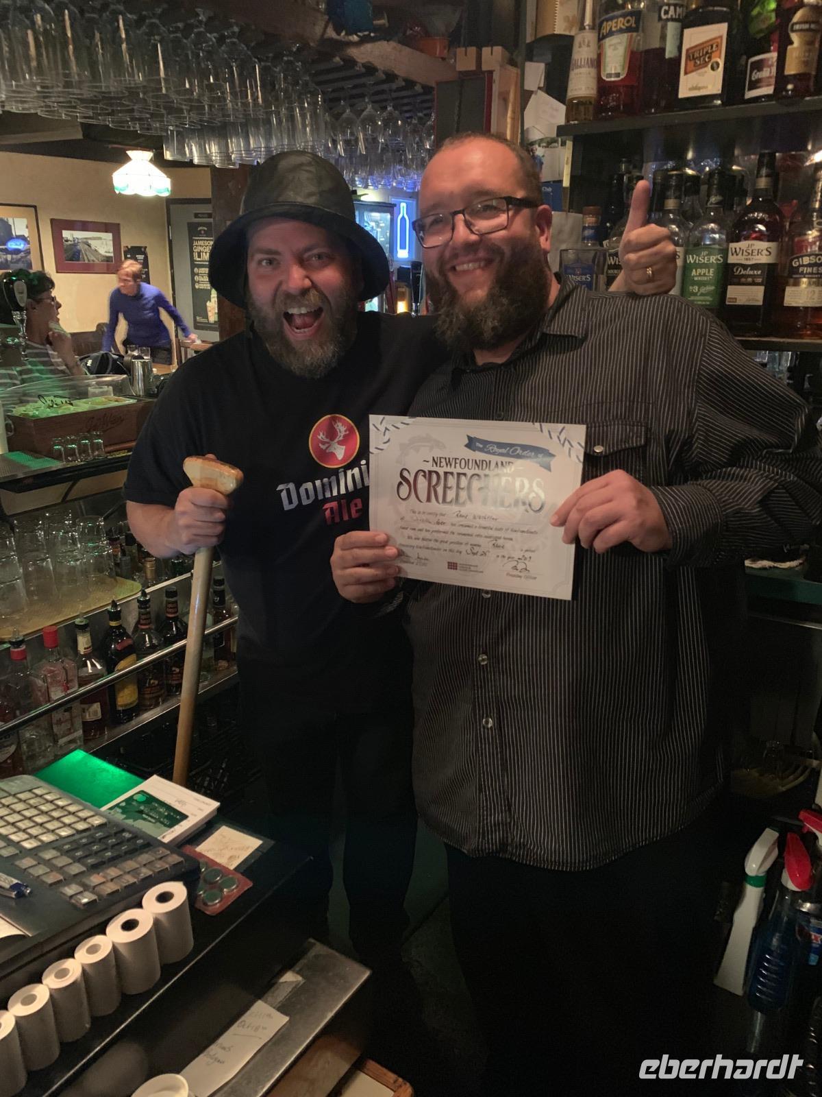 Nun bricht er also an, unser letzter Tag in St. Anthony, unser letzter tag an Bord MS FRAM. Die Passagiere sind in zwei Gruppen aufgeteilt, wir gehören komplett zur Gruppe 1, was für uns bedeutet, dass wir mit der ersten gecharterten Maschine von St. Anthony nach St. John's ausgeflogen werden. Also Koffer aufgeben auf dem Schiff, frühstücken und dann Abschied nehmen von der MS FRAM und seiner Crew. Der Weg zum Flughafen dauert 45 Minuten und der Flughafen ist wie erwartet sehr klein. Die Abwicklung ist auch dementsprechend einfach gehalten, wir fahren einfach mit dem Transferbus direkt zum Flieger, zeigen unseren Pass und steigen ein. Eine knappe Stunde später landen wir in der 200.000 Einwohner zählenden Region von St. John's. Wir sind alle im Hotel in Flughafennähe untergebracht. Logistisch nicht so toll, um die Stadt zu erkunden, aber es ist nur noch die eine Nacht. Im Hotel bekommen wir Mittagessen und dann bleibt die Möglichkeit das Stadtzentrum per Taxi zu erreichen. Da einige Gepäckstücke tatsächlich noch eine extra Runde drehen und erst mit der zweiten Chartermaschine endgültig im Hotel ankommen, fahren wir inzwischen nach Downtown. Wir werfen einen Blick in die Basilika und weil es wie aus Eimern schüttet, entscheiden wir uns für einen Besuch in Christians Pub. Die Stimmung ist toll und wir lassen uns alle "SCREECHEN" - eine Zeremonie für die der Pub bekannt ist. Dabei müssen wir einen Schnaps trinken, einen gefrorenen Kabeljau küssen und einen neufundländischen Satz aufsagen. Dann gibt es ein Diplom. Alle bestehen. Da der Regen nicht nachlässt, beschließen wir, den Abend im Pub bis zum Abendessen im Hotel ausklingen zu lassen.