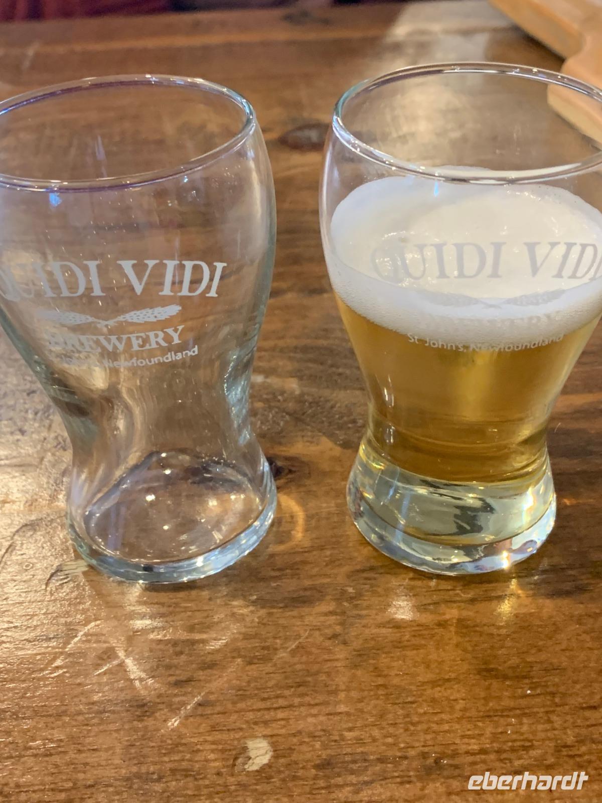Heute beginnt die Heimreise nach Deutschland. Wir beginnen den Tag mit einem typisch nordamerikanischen Frühstück: warm, gehaltvoll und auf Bestellung. Leider dauert die Abwicklung recht lange, so dass es knapp wird... denn Eberhardt hat noch ein Spezialprogramm gestrickt. Nach dem Frühstück treffen wir uns mit unseren Koffern in der Lobby und starten zu einer Stadtrundfahrt mit deutschsprachiger Reiseleiterin durch St. John's, damit wir noch etwas zu sehen bekommen. Lisa, eine Künstlerin aus St. John's mit deutschem Ex-Mann und 19-jähriger Vergangenheit in Lübeck, nimmt uns mit auf die Reise durch die Hauptstadt Neufundlands. Das Wetter zeigt sich dabei leider von seiner neufundländisch typischen Seite: neblig und regnerisch, nur kühl ist es nicht. Wir fahren zuerst zum Signal Hill hinauf, von dem man ein fantastsiche Sicht auf die Stadt hat... Nur eben heute nicht, denn es herrscht dichter Nebel udn wir sehen gar nichts. Also spazieren wir eine Runde um den Cabot Tower und dann geht es im Bus gemütlich durch die farbigen Straßenzüge St. John's. An der Basilika halten wir für ein paar Fotos - ein sehr beeindruckendes Bauwerk. Mit allerlei Geschichten aus dem Leben führt uns Lisa dann am Hafen und am Terry-Fox-Park vorbei nach Quidi Vidi, ein kleines ursprüngliches Fischerdorf am Rande der Stadt. Hier haben wir noch eine Überraschung parat: Auch wenn es Vormittag ist, erwartet uns in der kleinen Brauerei des Stadtteils eine Bierverkostung! Bei dem Wetter eine gelungene Abwechslung. Wir kosten 4 Biere (Iceberg, Fogtown, Bog&Barrens und Dayboil) und erfahren Einiges zur Herstellung u.a. mit Eisbergwasser oder der Verwendung von Koriander und Meeressalz... Nach der Verkostung bringt uns dann der Bus zum Flughafen und über Toronto fliegen wir nach Berlin.