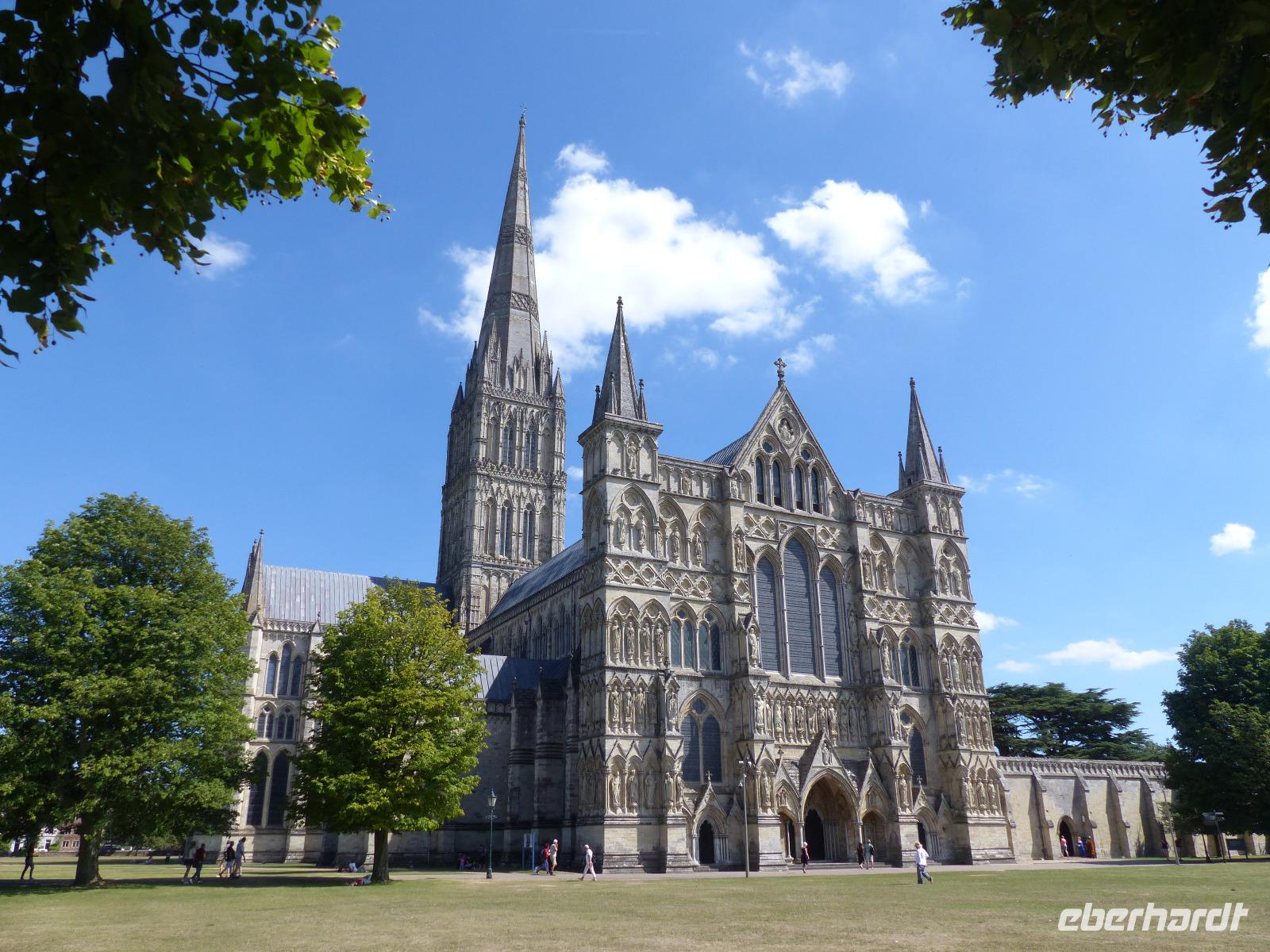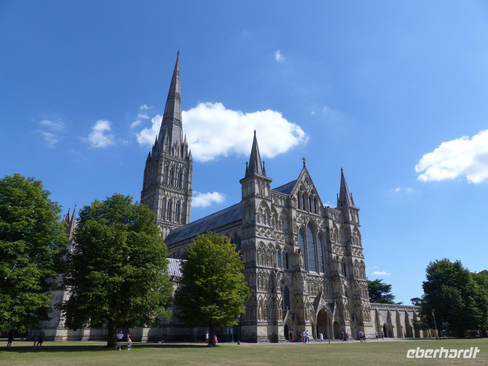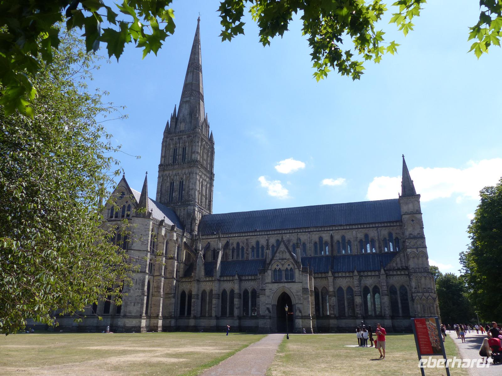 Ein herrlicher Sommertag erwartete uns. Es war warm, aber zum Glück nicht soo warm wie daheim. Tony I., der sich mal wieder eine etwas außergewöhnliche Fahrtroute ausgesucht hatte, brachte uns nach Stonehenge. Bei strahlendem Sonnenschein besichtigten wir die alte Kultstätte aus der Megalithkultur. Alleine waren wir dabei natürlich nicht, denn der alte Steinkreis zieht Menschen aus aller Welt in Scharen an. Auch das nahe gelegene Museum erweckte unser Interesse. Danach ging's weiter nach Salisbury zu einer längeren Pause. Jeder konnte diese Zeit so verbringen wie er es wünschte. Wir bummelten zunächst noch gemeinsam zum Close, der Domfreiheit, die die bekannte Kathedrale der Stadt umgibt. Auf dieser großen Wiese mit schattigen Bäumen trennten wir uns. Wer wollte konnte nach rund 50 Minuten, die für die Besichtigung der Kathedrale und Picknick auf der Wiese genutzt werden konnten, sich wieder mit mir treffen und an einem Spaziergang teilnehmen, der allerdings etwas umgeplant werden musste, denn das Avontal war wegen der Novitschockfunde nach wie vor gesperrt. Also spazierten wir an alten Wehren und am Geflügelmarktkreuz vorbei zum Marktplatz und machten uns dann auf den Weg zum Parkplatz. Alle hatten nun wieder Kraft getankt für die nun folgende Busfahrt nach Plymouth, das wir im strahlenden Abendlicht erreichten. Da Tony I. uns nun wieder einen Teil seiner Heimat zeigte, der eigentlich nicht auf unserem Programm stand und wir mehrheitlich direkte Anfahrten den verschlungenen vorzogen bemühte ich mich darum, einen Ersatz für ihn zu finden, was sich am übernächsten Tag auch einrichten ließ. Aber zuvor standen uns noch einige Abenteuer ins Haus. Den Abend verbrachten wir nach einem weiteren sehr leckeren Essen im neuen ebenfalls zentrumsnahen Hotel in Plymouth nun in dessen Altstadt, die uns auch sehr gut gefiel.