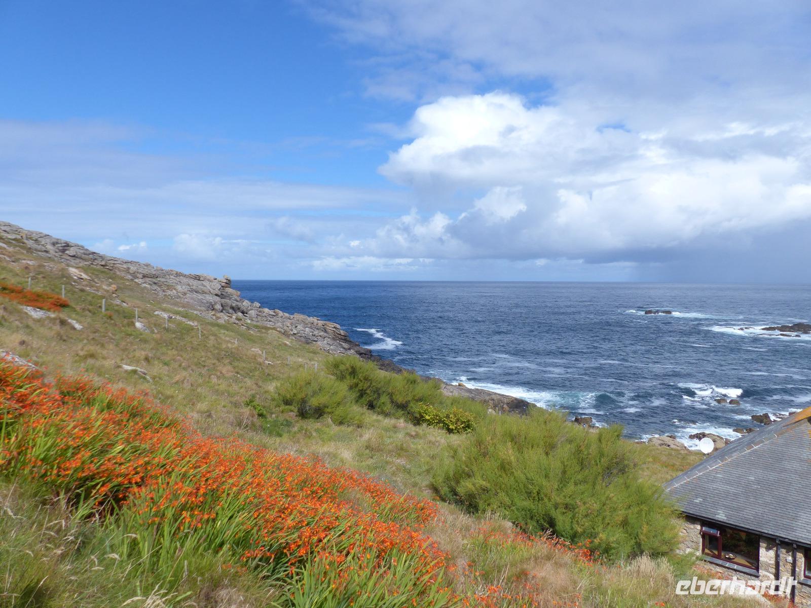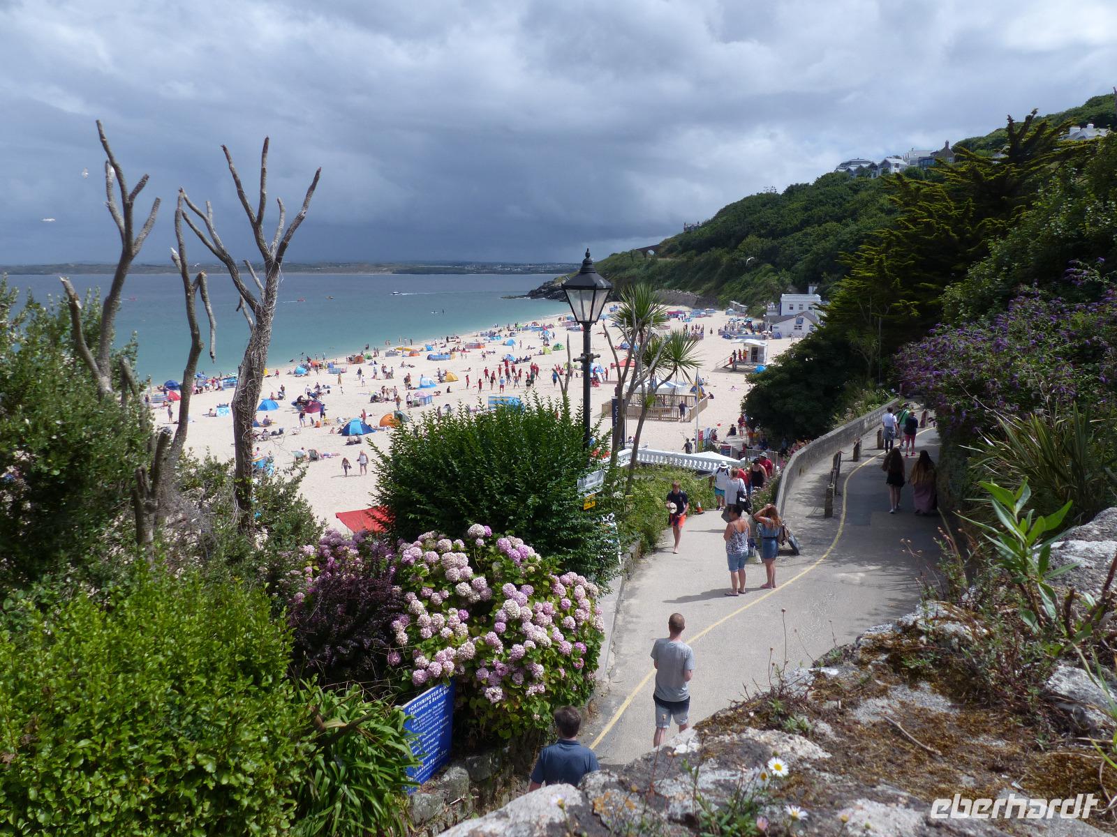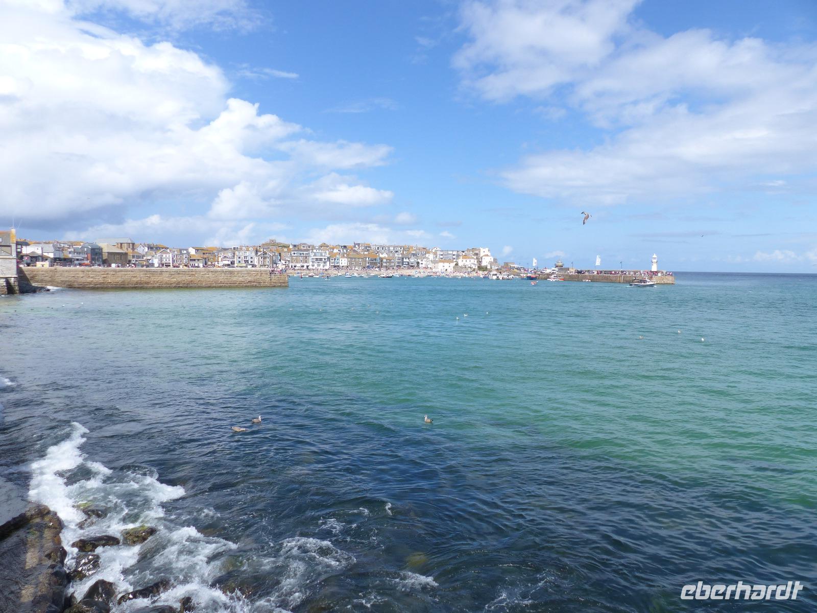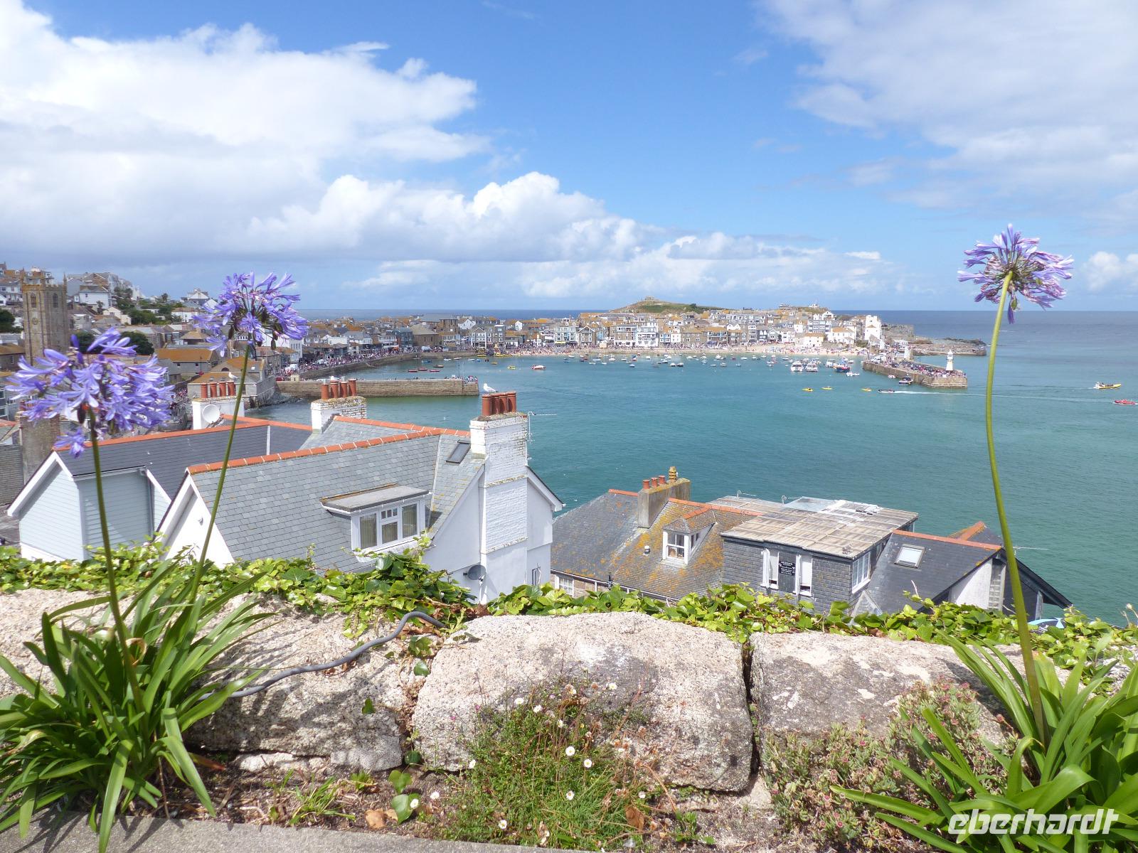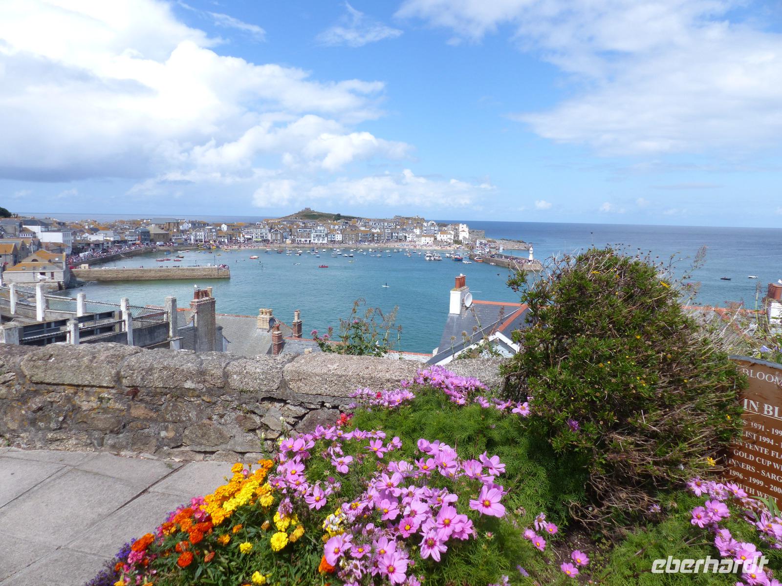 Nun also waren wir in Cornwall. Und wir machten uns sogleich auf den Weg zum äußersten westlichen Ende. Bei herrlichem Wetter durchwanderten wir Hänge voller Montbretien, einem rötlich blühenden Schwertliliengewächs, das die Hänge bei Sennen Cove überzog. Ein paar Gäste glaubten einen Wal gesehen zu haben, der sich dann aber bei näherer Betrachtung in ein Felsenriff verwandelte. Wir wanderten an Lands End vorüber zu einem malerischen Felsentor und genossen die wunderschöne Aussicht. Tony II. brachte uns anschließend zum Bahnhof St. Earth. Hier waren schon deutsche Filmteams gewesen, die Rosamunde Pilchers Bücher auf die Leinwand brachten. Uns interessierten derweil die Wolken, die sich bedenklich über uns zusammenschoben, viel mehr. Kaum waren wir im Zug, da schauerte es. Als wir aber die Eisenbahn in St. Ives wieder verließen, war der Regen bereits vorüber. Auch hier konnte jeder die Zeit so verbringen wie er es wünschte. Wir bummelten zunächst noch gemeinsam vom Bahnhof zum Aussichtspunkt Malakoff und weiter zum Hafen. Dann trennten wir uns. Wer wollte konnte in meiner Begleitung noch die Stadt besichtigen und bis aufs Kap oberhalb des Leuchtturms schlendern. Auf der Rückseite des Kaps kamen wir an der Tate Gallery vorbei. Schließlich landeten wir am Hafen und probierten Cornische Teigtaschen, was uns viel Aufmerksamkeit bei den Möwen einbrachte. Wir trafen uns am Ende des Nachmittags wieder am Bus und kehrten nach Newquay zurück zu einem weiteren leckeren Essen und einem Abend in geselliger Runde.