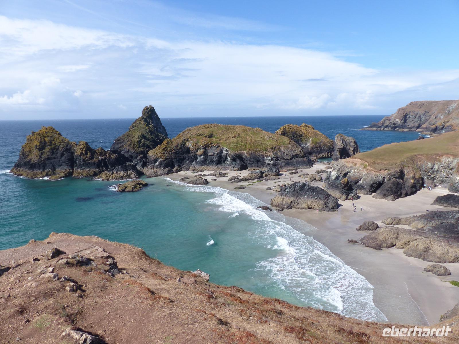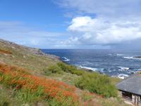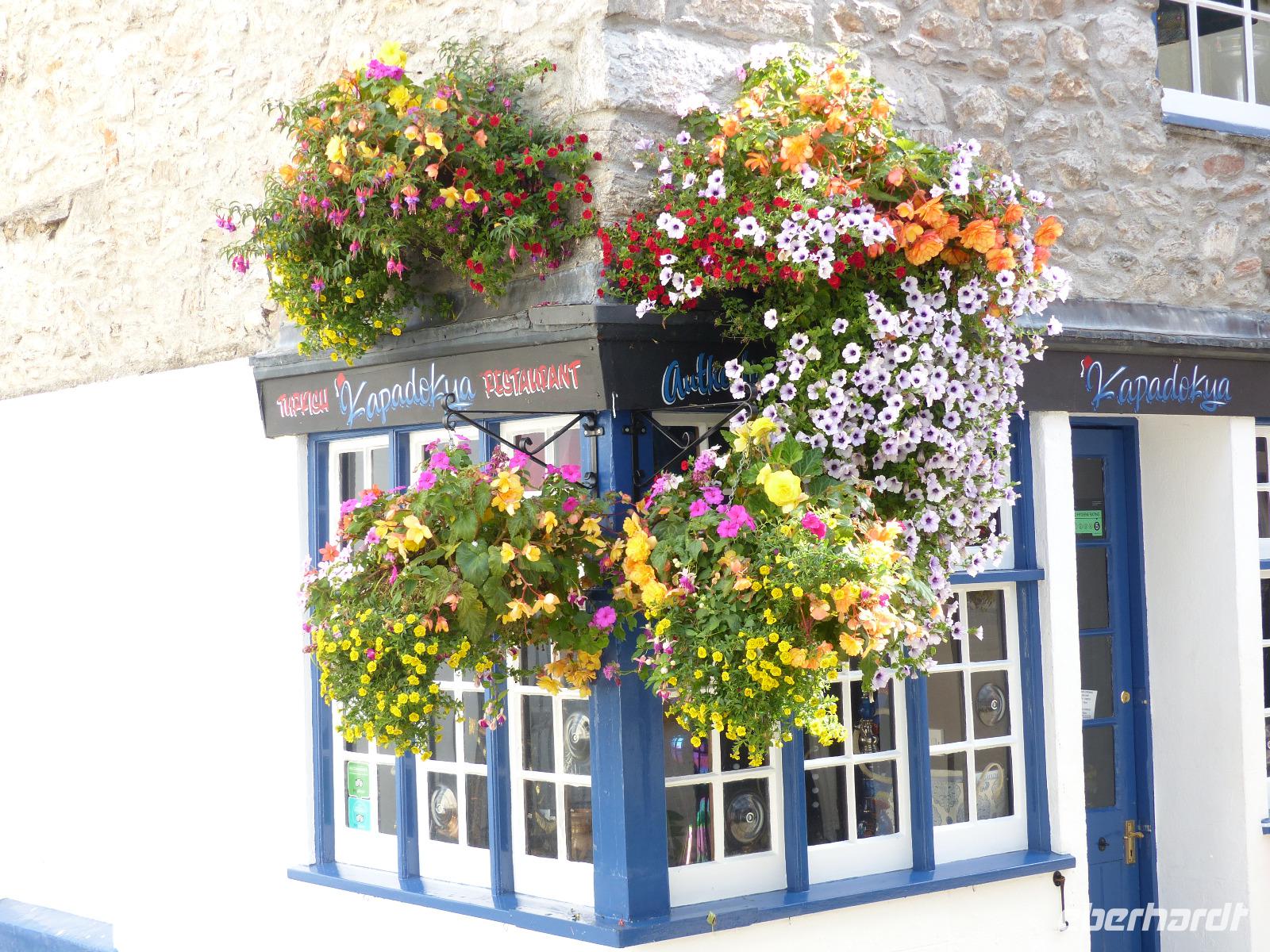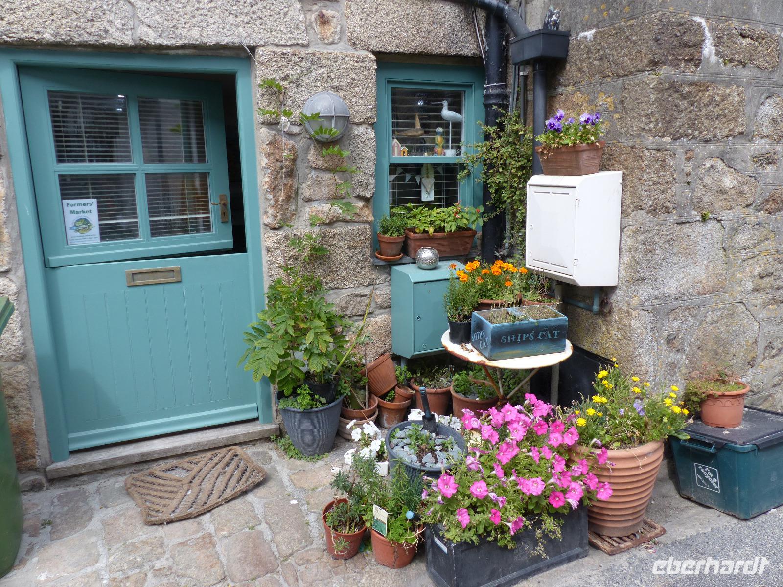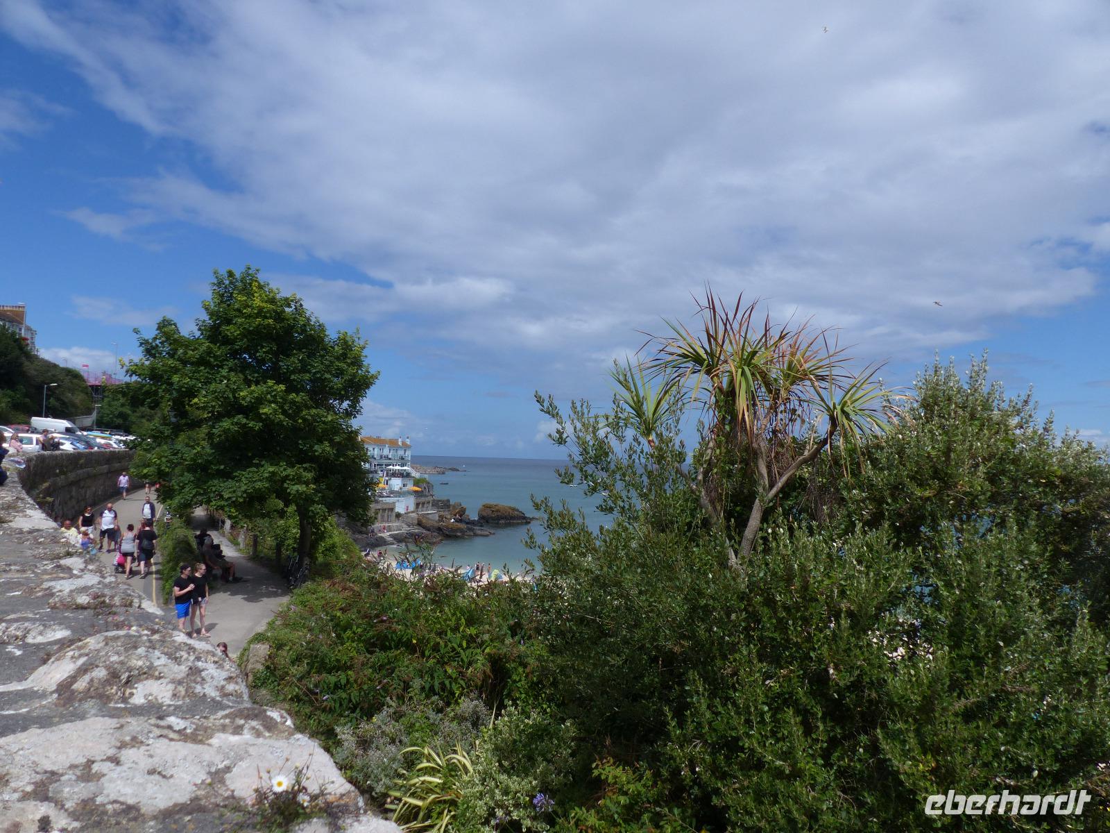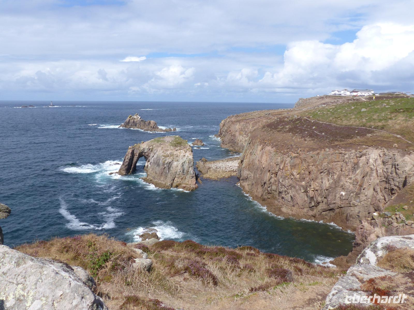 Nun also waren wir in Cornwall. Und wir machten uns sogleich auf den Weg zum äußersten westlichen Ende. Bei herrlichem Wetter durchwanderten wir Hänge voller Montbretien, einem rötlich blühenden Schwertliliengewächs, das die Hänge bei Sennen Cove überzog. Ein paar Gäste glaubten einen Wal gesehen zu haben, der sich dann aber bei näherer Betrachtung in ein Felsenriff verwandelte. Wir wanderten an Lands End vorüber zu einem malerischen Felsentor und genossen die wunderschöne Aussicht. Tony II. brachte uns anschließend zum Bahnhof St. Earth. Hier waren schon deutsche Filmteams gewesen, die Rosamunde Pilchers Bücher auf die Leinwand brachten. Uns interessierten derweil die Wolken, die sich bedenklich über uns zusammenschoben, viel mehr. Kaum waren wir im Zug, da schauerte es. Als wir aber die Eisenbahn in St. Ives wieder verließen, war der Regen bereits vorüber. Auch hier konnte jeder die Zeit so verbringen wie er es wünschte. Wir bummelten zunächst noch gemeinsam vom Bahnhof zum Aussichtspunkt Malakoff und weiter zum Hafen. Dann trennten wir uns. Wer wollte konnte in meiner Begleitung noch die Stadt besichtigen und bis aufs Kap oberhalb des Leuchtturms schlendern. Auf der Rückseite des Kaps kamen wir an der Tate Gallery vorbei. Schließlich landeten wir am Hafen und probierten Cornische Teigtaschen, was uns viel Aufmerksamkeit bei den Möwen einbrachte. Wir trafen uns am Ende des Nachmittags wieder am Bus und kehrten nach Newquay zurück zu einem weiteren leckeren Essen und einem Abend in geselliger Runde.