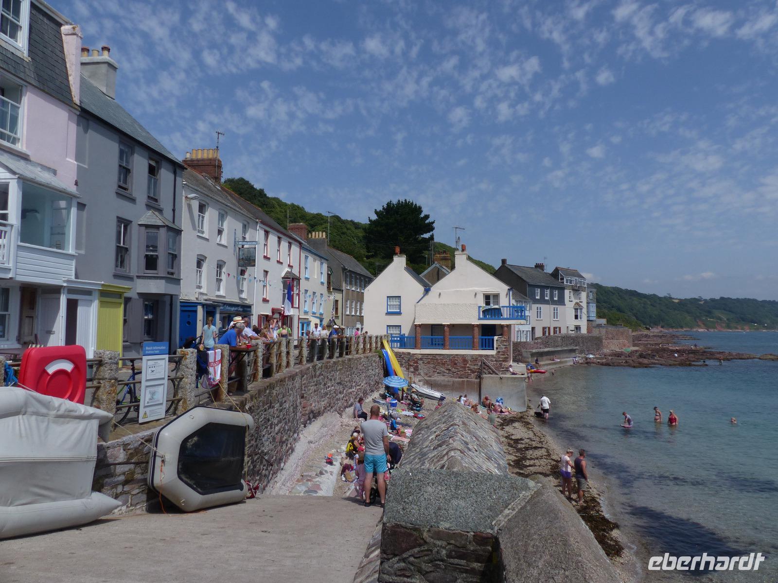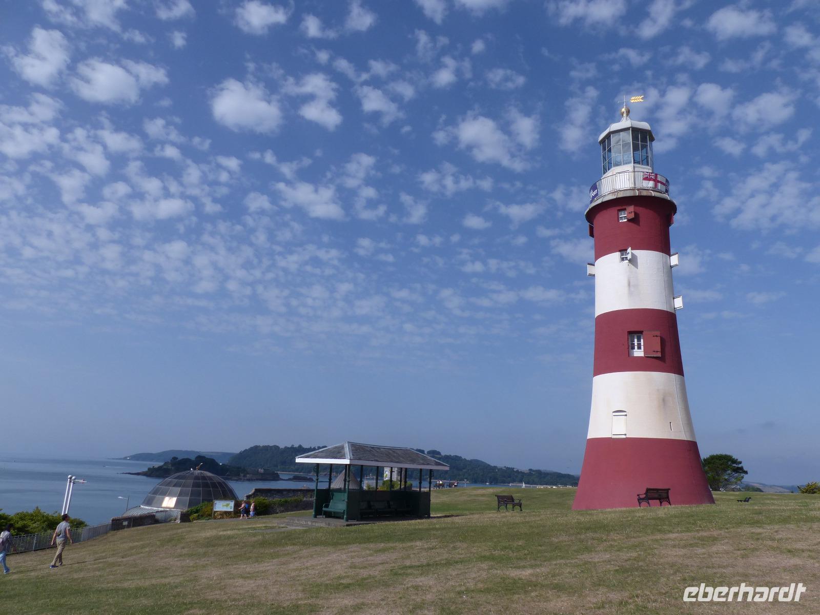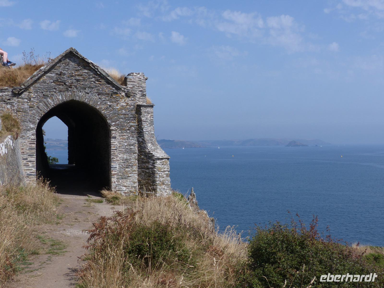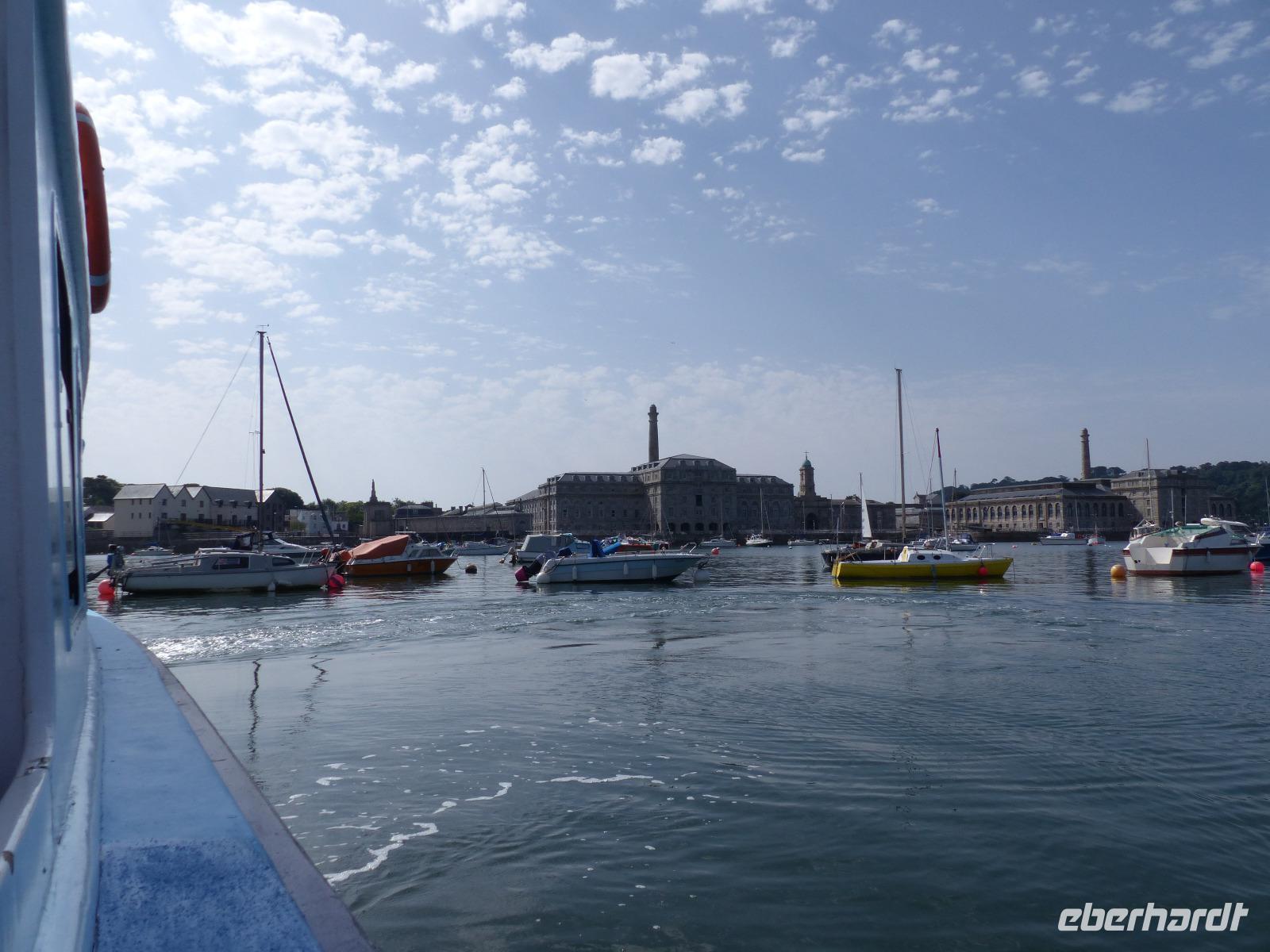 Bei strahlend blauem Himmel verließen wir nach einem leckeren Frühstück unser Hotel und spazierten zu den ruhigen Elizabethan Gardens, dann zu den Mayflower Steps am Sutton Pool, dem alten Hafen unweit der Mündung des River Plym gelegen. Weiter ging's an der Zitadelle vorbei über den Hügel The Hoe am Leuchtturm vorüber. Der Bus brachte uns wenig später am weniger reizvollen Industriehafen vorbei zum Bootssteg der Cremyll Fähre. Eine herrliche kleine Schiffsfahrt folgte. So erreichten wir den Park um das Herrenhaus Mount Edgcumbe, das die Gärten überragte. Wir ergründeten nun einige der herrlichen kleinen Gärten im Renaissance- und Barockstil, durchstrolchten den Neuseeländischen- den Rosen- und den englischen Landschaftsgarten und wanderten vorbei an einem Teich mit Tempelpavillons zur Folly. Folly, die Verrücktheit, ist eine aussichtsreich gelegene Ruine, die nicht verfallen ist im Laufe der Jahre, sondern schon als verfallendes Gebäude geplant und errichtet wurde. Vor uns lag das blaue Meer, das wir auf Schritt und Tritt vor Augen hatten. Wir wanderten durch Wälder hindurch weiter an der Küste entlang zu den Dörfern Kingsand und Cawsand, wo wir uns eine längere Pause gönnten. Nun hatten wir zu Fuß Cornwall erreicht, denn Plymouth liegt noch in Devon. Am Nachmittag ging es weiter zur künstlich angelegten Grotte, die Adelheid von Sachsen-Meiningen gewidmet ist. Sie war die Tante der Queen Victoria und angeheiratete britische Königin um 1830. Danach führten uns Klippenpfade weiter zur Michaelskapelle die auf der 90 m hohen Klippe von Rame liegt. Auf dem Parkplatz in Cawsand erwartete uns Tony I. mit dem Bus, der an jenem Nachmittag ganz besonders abenteuerlustig war. Wenn einer eine Reise tut, dann kann er was erzählen - wir hatten nun wirklich einiges zu erzählen, als wir am Abend wieder in Plymouth ankamen. Auch diesen Abend ließen die meisten von uns wieder in der Altstadt von Plymouth bei herrlichem nicht allzu heißem Sommerwetter am Wasser ausklingen, nachdem wir noch einmal ein sehr leckeres Abendessen bekommen hatten.