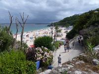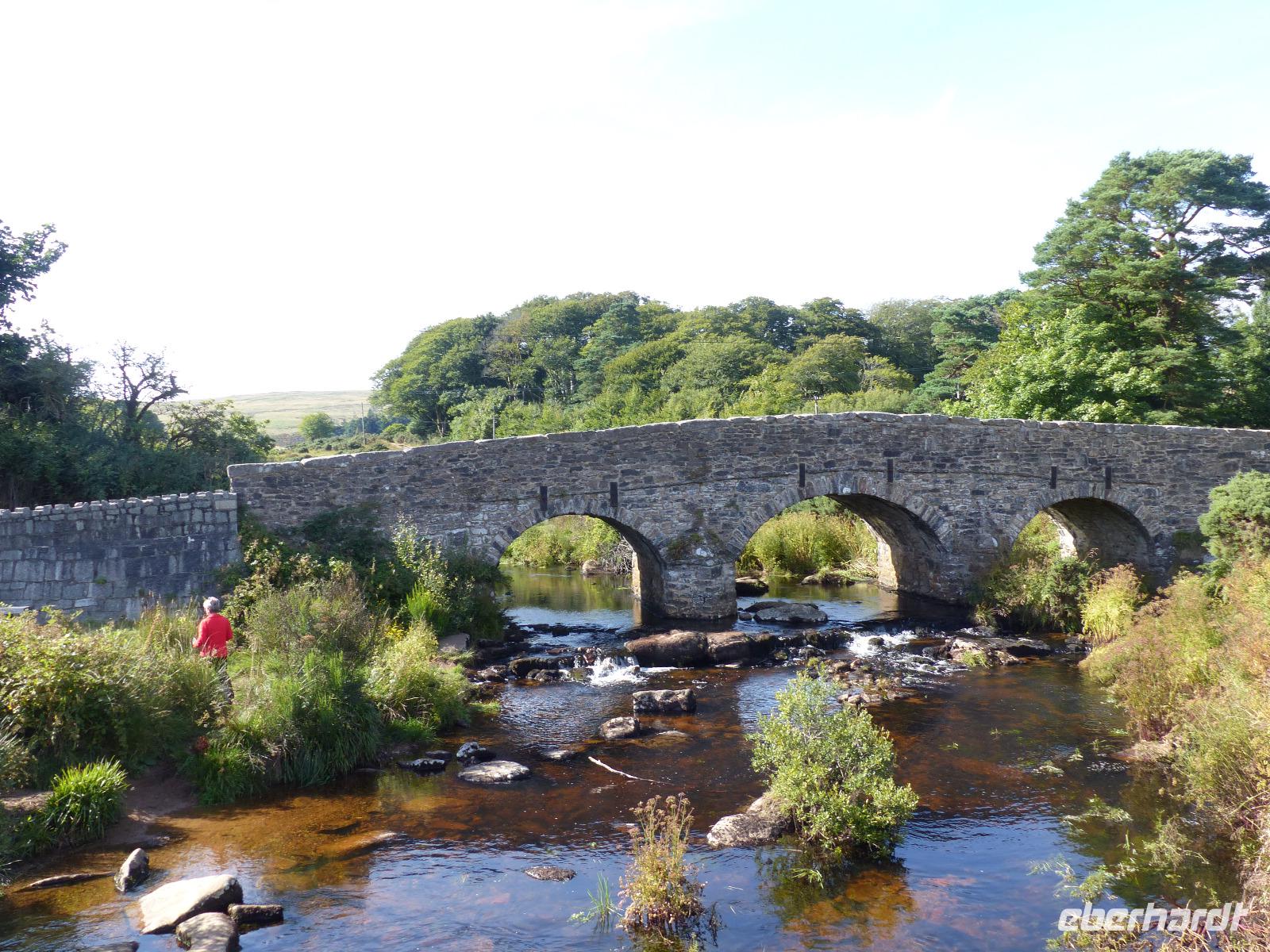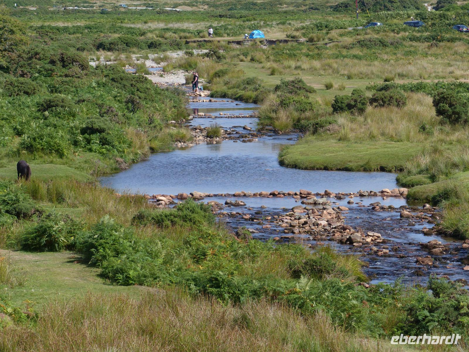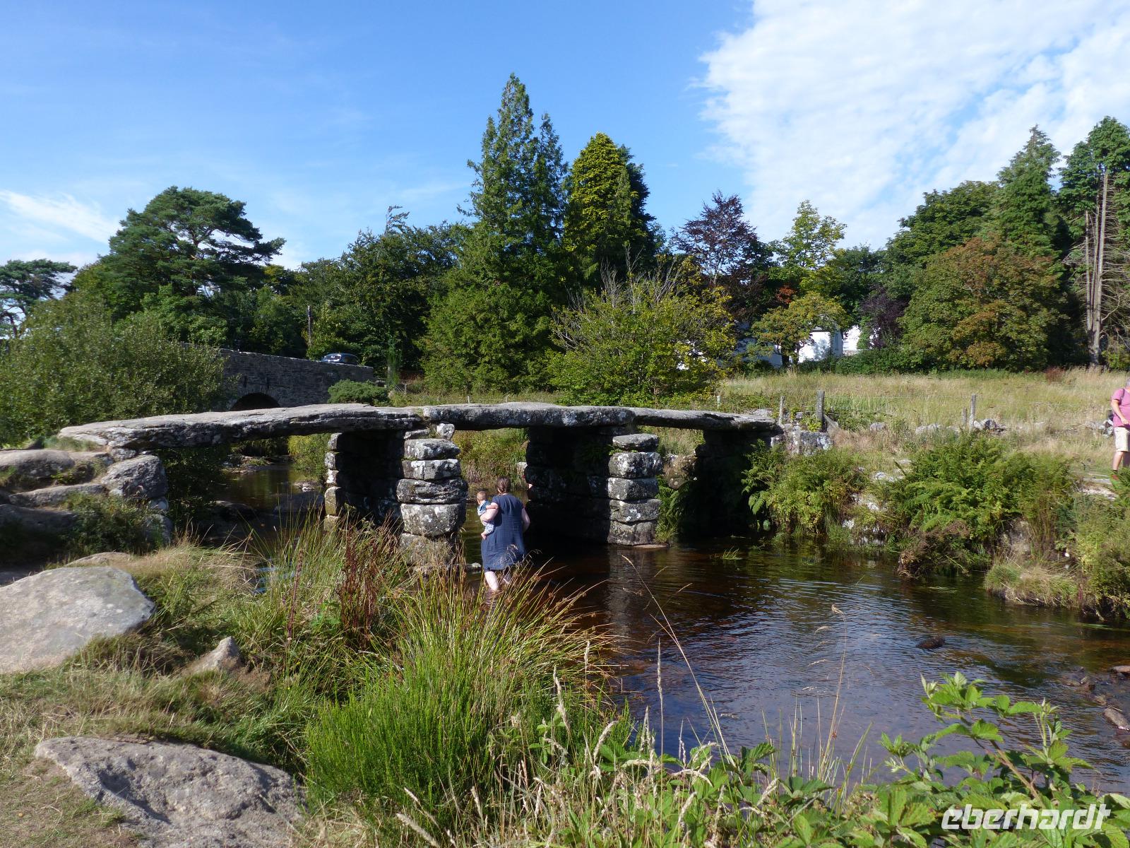 Am folgenden Tag begrüßte uns der charmante Busfahrer Tony II., der uns nun ohne weitere Pirouetten sicher und immer lächelnd zu unseren Zielen brachte. Zuerst brachte er uns auf direktem Weg ins Dartmoor. Ein paar Wolken waren uns vergönnt, was im Dartmoor nicht schaden kann, denn dort finden sich keine schattenspendenden Büsche am Wegesrand. 218 Tage Regen im Jahr, und am der Rest Tage Nebel - so steht es in den Reiseführern. Unsere Regensachen nahmen wir mit, aber der große Regen blieb aus. Der niedrige Wasserstand, den der heiße Sommer auch hier hinterlassen hatte, ermöglichte uns, dass wir ziemlich einfach die Bäche durchqueren konnten, die unseren Weg kreuzten. Schafe, Pferde und Rinder durchstreiften das trockene Moor. An Menhiren und einer alten Siedlung aus der Megalithkultur wanderten wir vorüber hoch zu den Tors, den bizarren natürlichen Felsblöcken, die das Moor überragen. Am Nachmittag besuchten wir noch die Cadover Bridge. Es war nun schon wieder warm und sonnig, so dass einige Gäste kurzerhand den Blick auf die Brücke aus dem Wasser wagten. Danach stand uns noch eine längere abendliche Fahrt bis Newquay bevor. Unsere neue Herberge bereitete uns einen warmen Empfang mit Eistee und Scones. Den langen, ereignisreichen Tag ließen wir bei leckerem Essen in unserem Hotel mit Strandblick ausklingen.