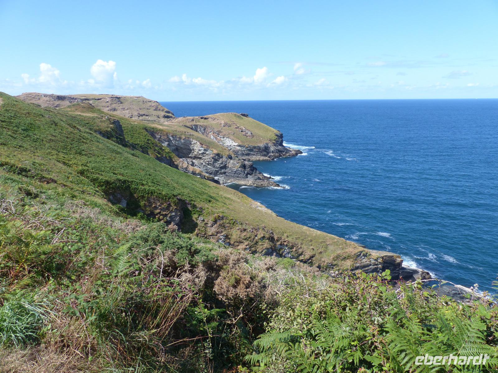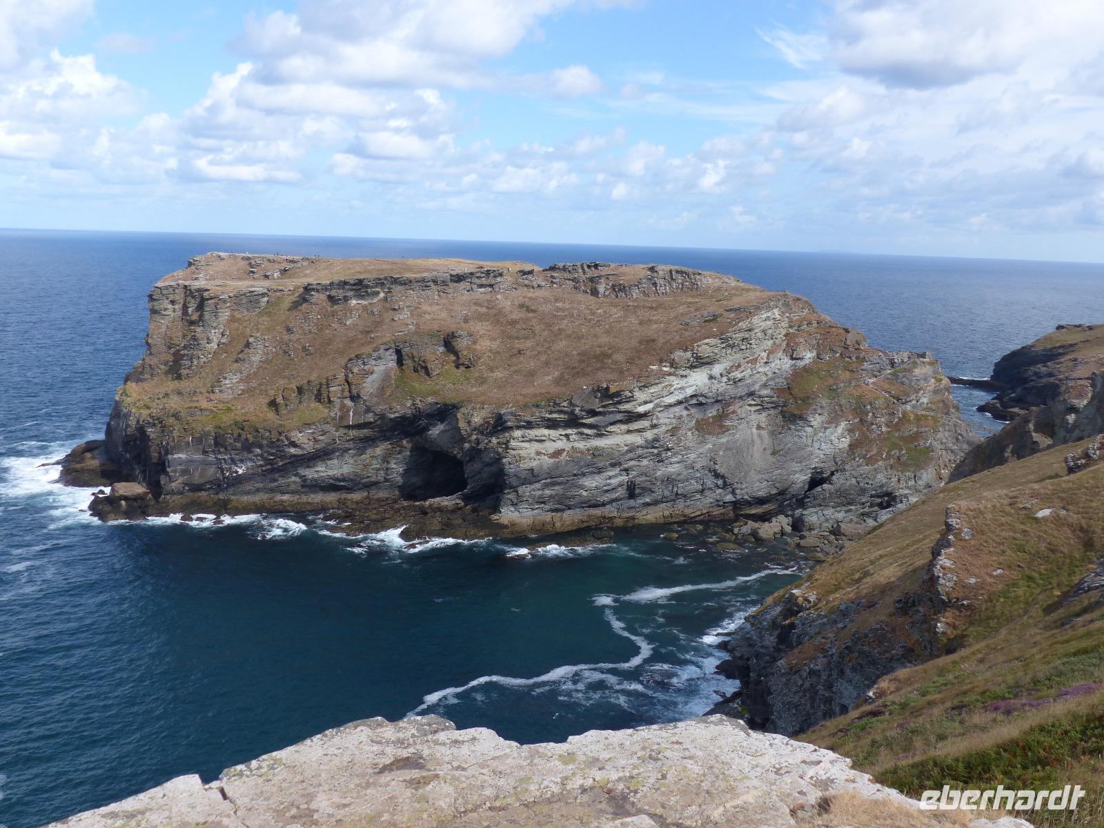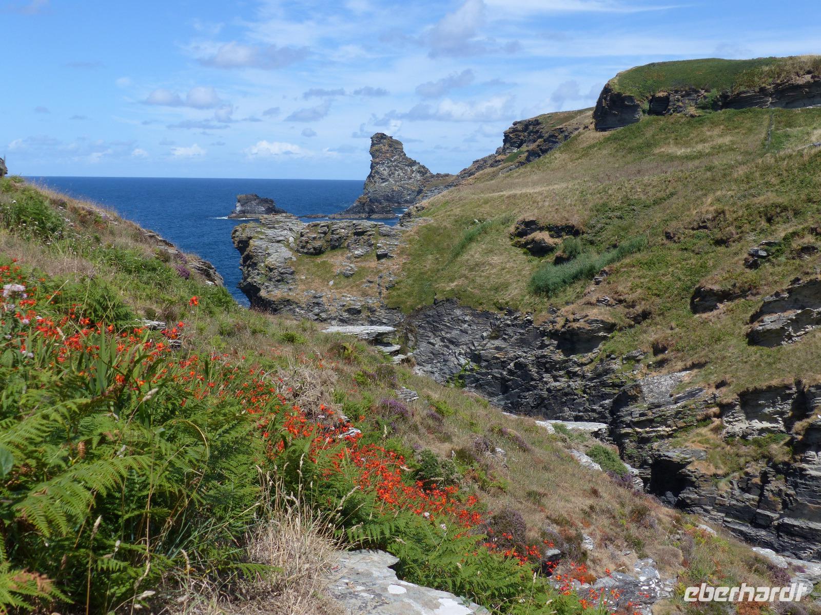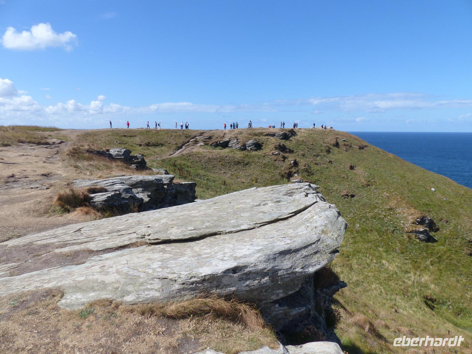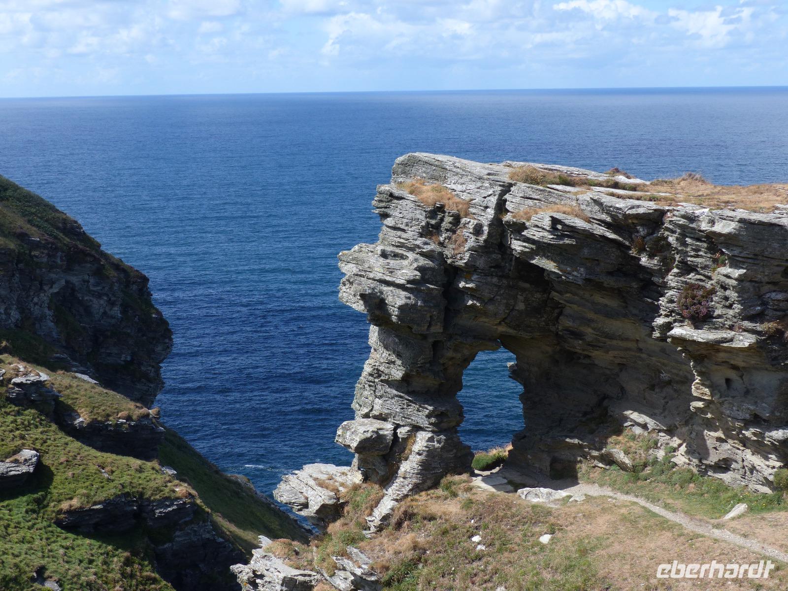 Und wieder ein strahlend blauer Sommertag! Nun stand die Burgruine, in der der legendäre König Artus gelebt haben soll, auf dem Programm. Wir zogen am historischen Postamt vorüber zu einer alten kleinen Landkirche hoch auf den Klippen gelegen, hinter der sich eine herrliche Aussicht auf die begehrte Halbinsel mit den Ruinenresten bot. Bald schon trafen wir auf unsere Artgenossen, und zwar in reichlicher Anzahl, was den Aufstieg zur Burg etwas beschwerlich machte. Danach starteten wir mit unserer Wanderung über den Klippenpfad an der Steilküste entlang. Vorbei an herrlichen Aussichtspunkten mit Blick auf vorgelagerte Inseln, wilde Schluchten und Felsentore wanderten wir auf Boscastle zu. Am Ladies Window, einem hoch über der Küste gelegenen Felsentor, rasteten wir dann alle zusammen und schlossen diese doch etwas anspruchsvollere Wanderung bei einem Eis am Hafen von Boscastle am Nachmittag ab.
