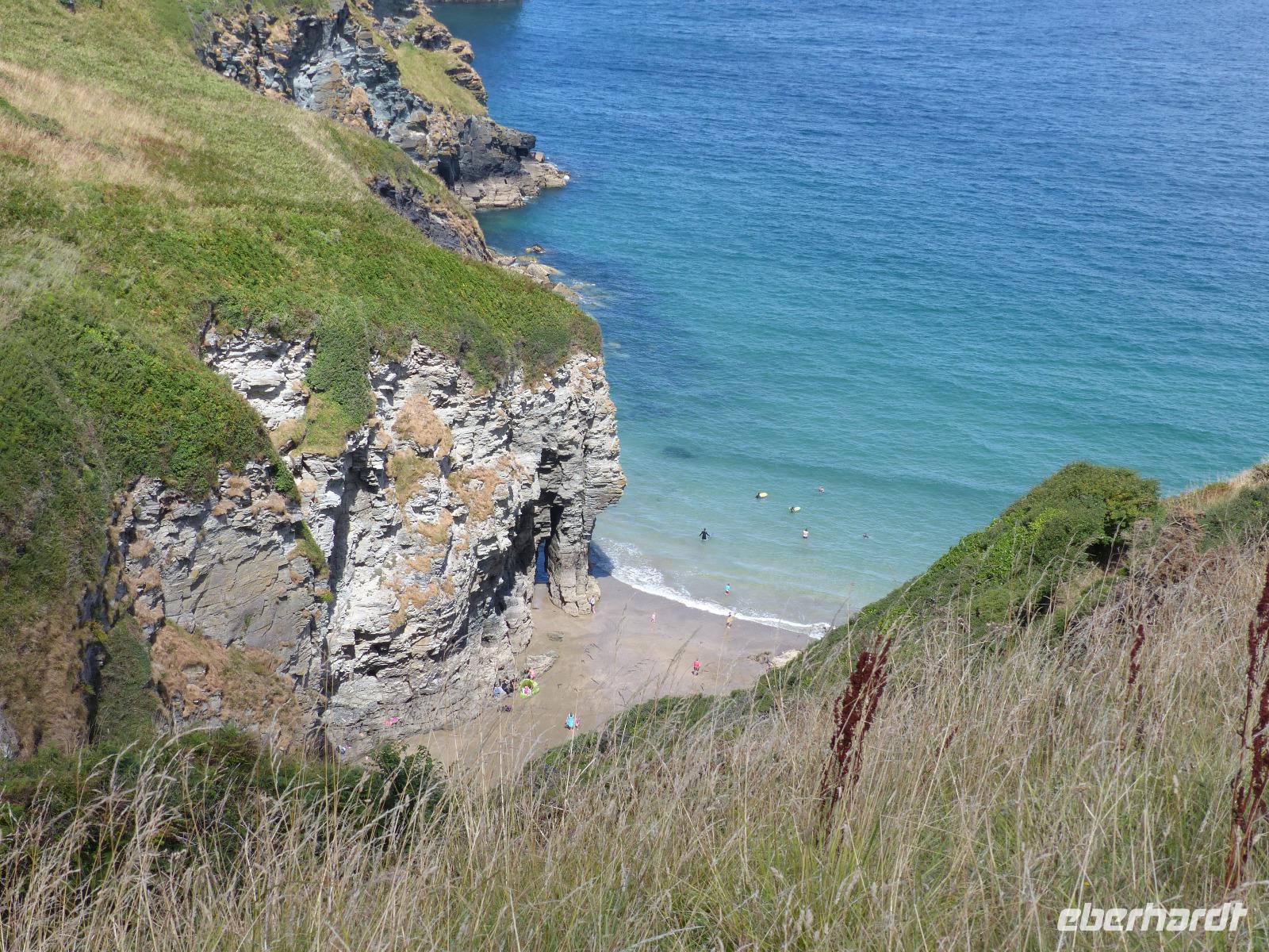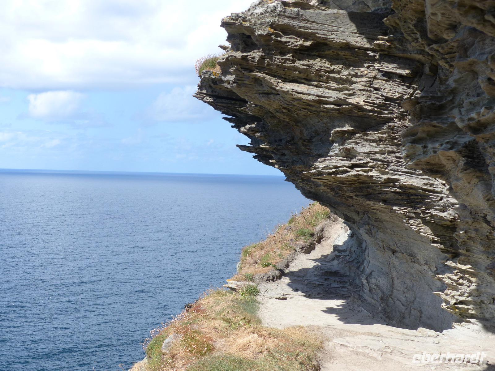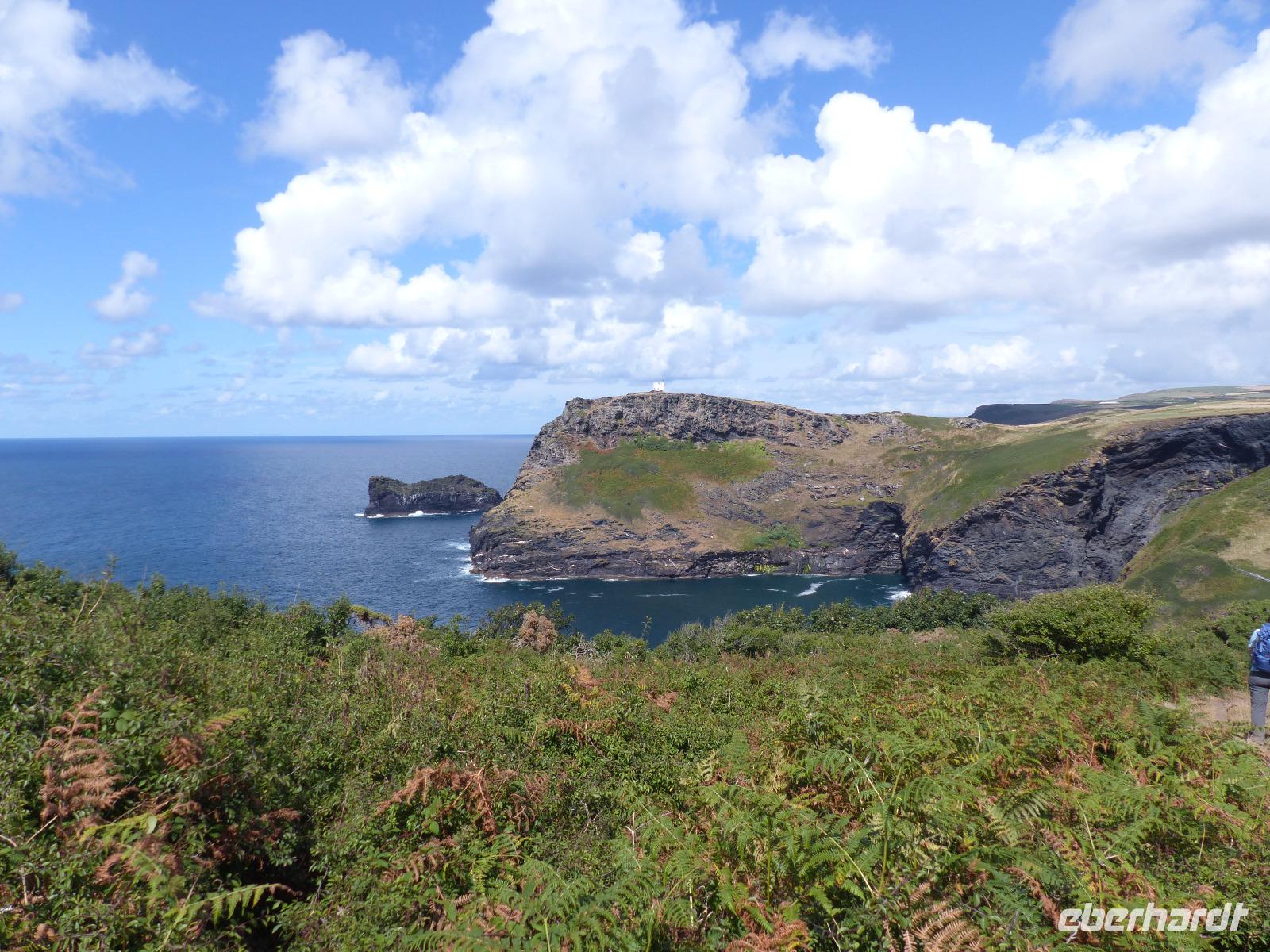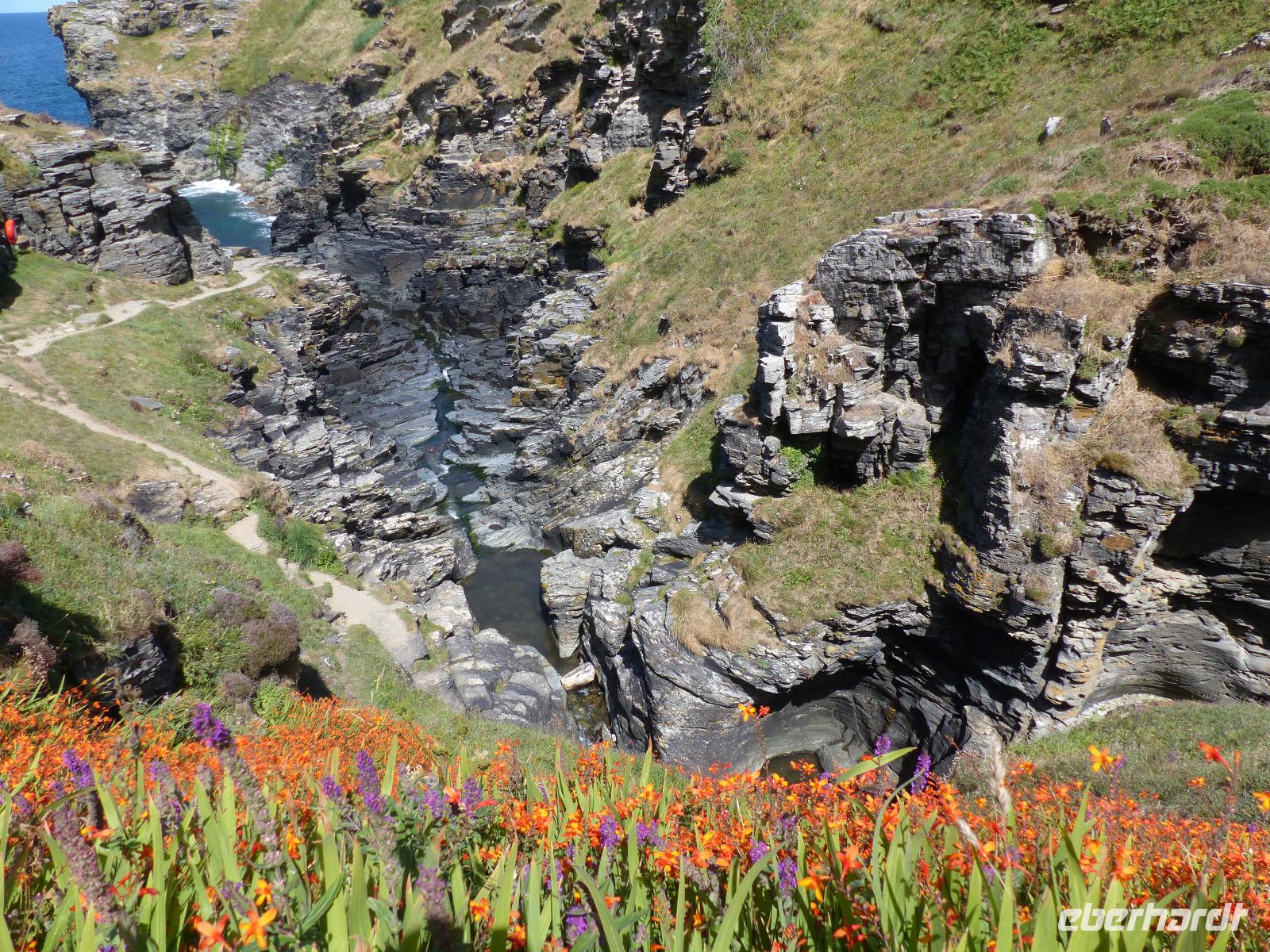 Und wieder ein strahlend blauer Sommertag! Nun stand die Burgruine, in der der legendäre König Artus gelebt haben soll, auf dem Programm. Wir zogen am historischen Postamt vorüber zu einer alten kleinen Landkirche hoch auf den Klippen gelegen, hinter der sich eine herrliche Aussicht auf die begehrte Halbinsel mit den Ruinenresten bot. Bald schon trafen wir auf unsere Artgenossen, und zwar in reichlicher Anzahl, was den Aufstieg zur Burg etwas beschwerlich machte. Danach starteten wir mit unserer Wanderung über den Klippenpfad an der Steilküste entlang. Vorbei an herrlichen Aussichtspunkten mit Blick auf vorgelagerte Inseln, wilde Schluchten und Felsentore wanderten wir auf Boscastle zu. Am Ladies Window, einem hoch über der Küste gelegenen Felsentor, rasteten wir dann alle zusammen und schlossen diese doch etwas anspruchsvollere Wanderung bei einem Eis am Hafen von Boscastle am Nachmittag ab.