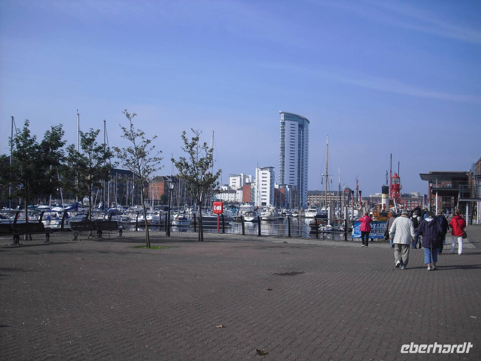 Nach unserem letzten Frühstück in Cardiff starteten wir nach Swansea, der zweitgrößten Stadt in Wales und zugleich Geburtsort des walisischen Poeten Dylan Thomas. Am Hafen, dessen ehemalige Speicherhäuser zu Wohnungen, Pubs und Restaurants umgestaltet wurden, fanden wir die Statue vom großen Sohn der Stadt. An der Promenade konnten wir auch Muschelsucher sehen. Die Cockles sind eine leckere, aber auch teure Spezialität.