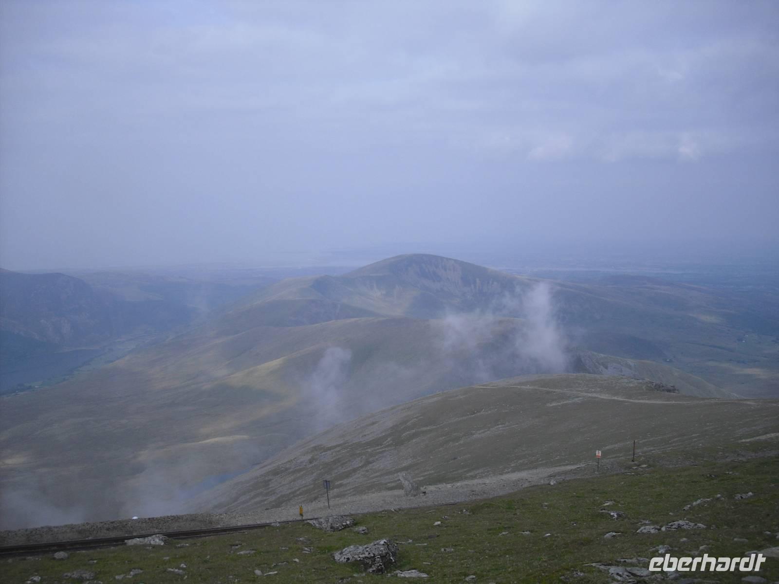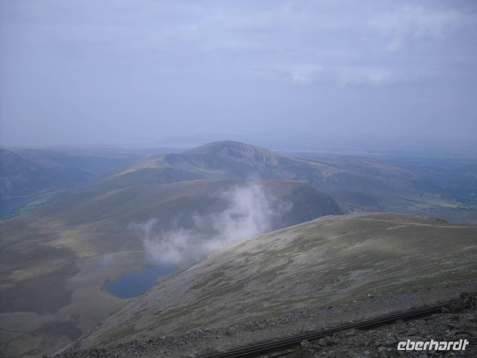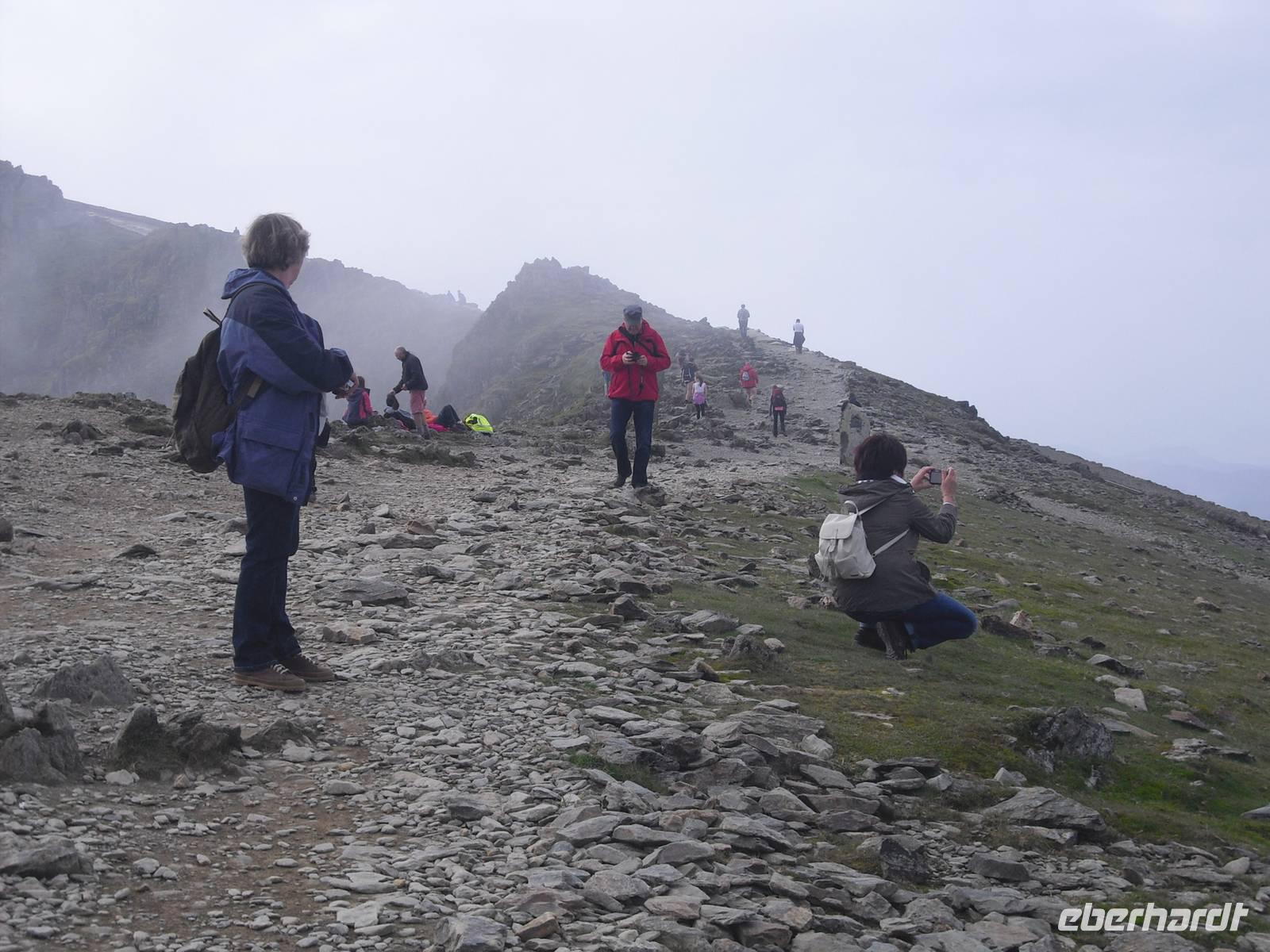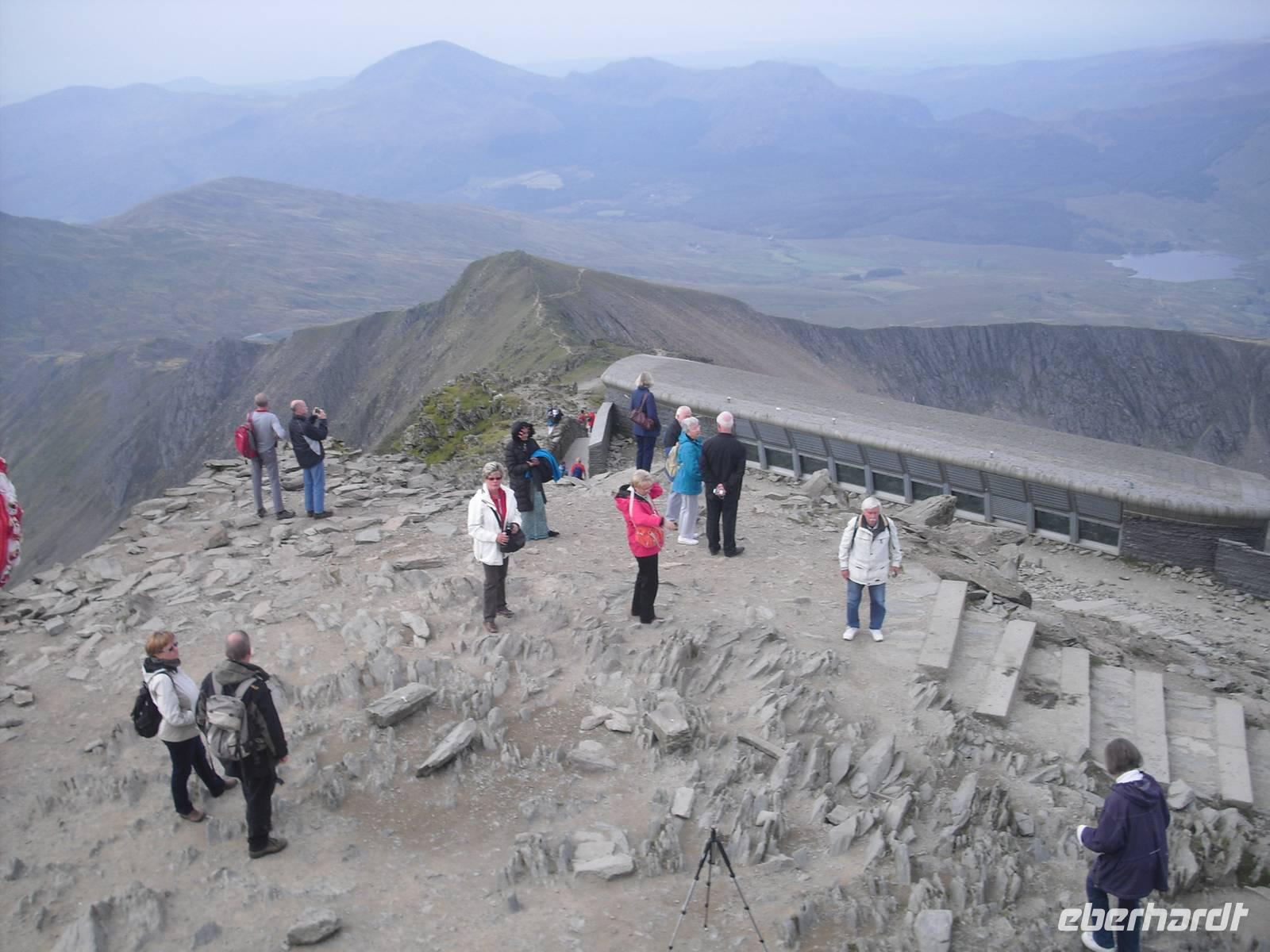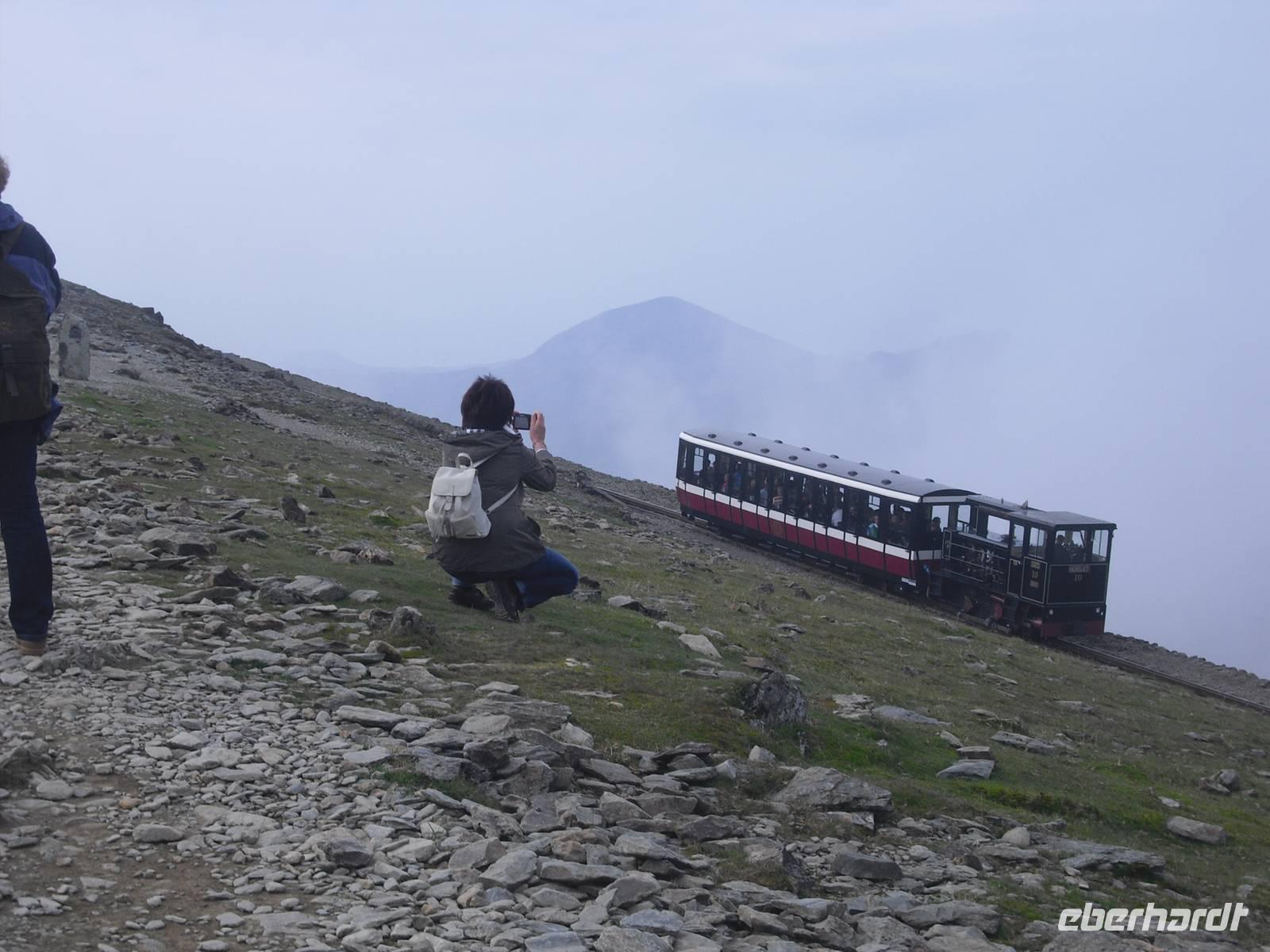 Nach dem walisischem Frühstück fuhren wir nach Llanberis, um den EARLY BIRD TRAIN zum Gipfel des Snowdon zu erreichen. Im Zug sitzend `quälten`wir uns in knapp einer Stunde auf den Gipfel des höchsten Berges von Wales und England ( nur der Ben Nevis in Schottland ist auf der Insel noch höher ) und wurden alle mit einer spektakulären Aussicht belohnt. Es hätte wahrlich auch anders sein können, doch eine privilegierte Reisegruppe war unterwegs. Einige fuhren mit dem Zug wieder abwärts und verbrachten mit vielfältigen touristischen Angeboten in Llanberis die verfügbare Zeit, andere wagten mit dem Reiseleiter den Abstieg. Wohl keiner hat den anspruchsvollen Abstieg bereut.