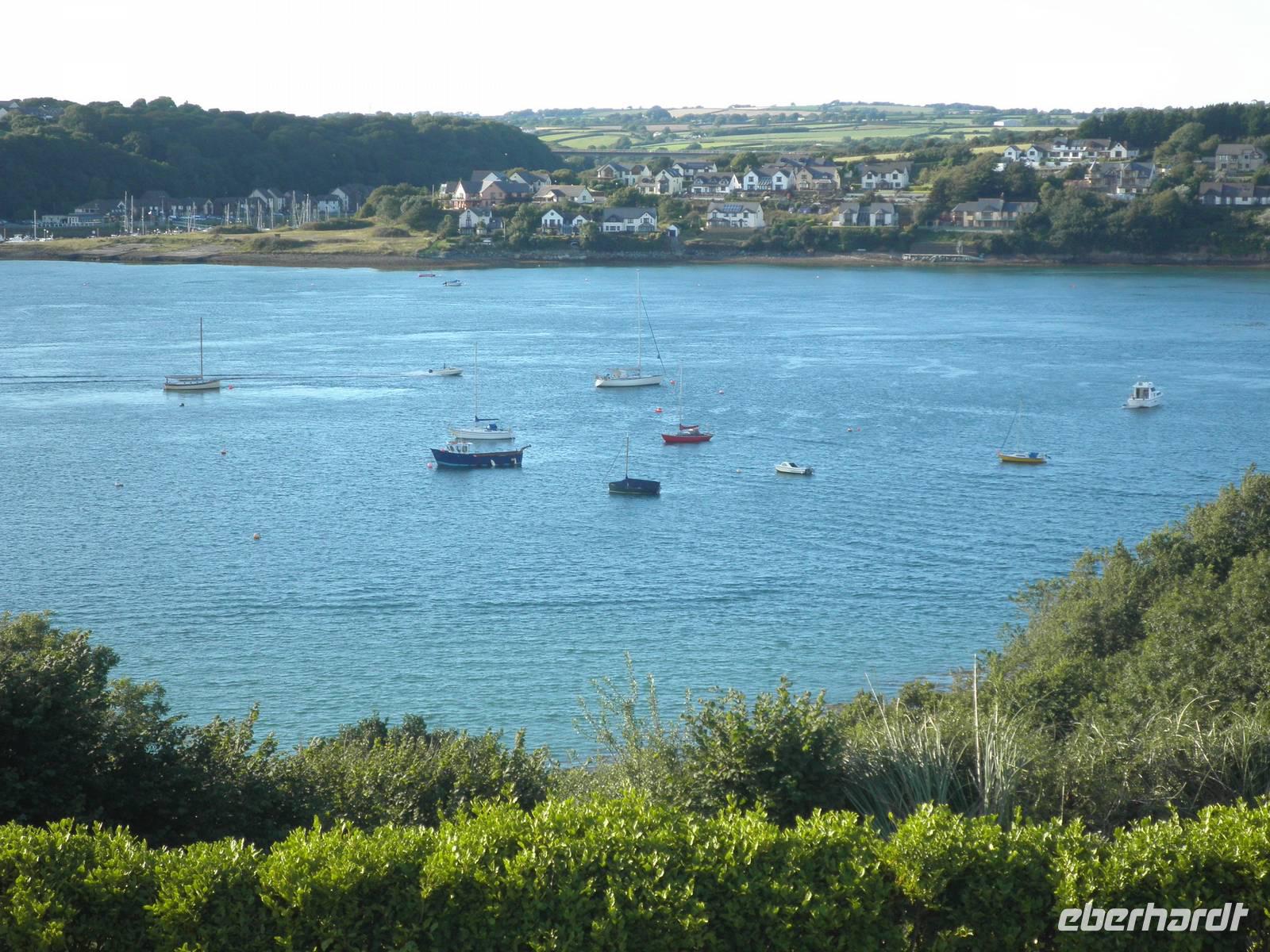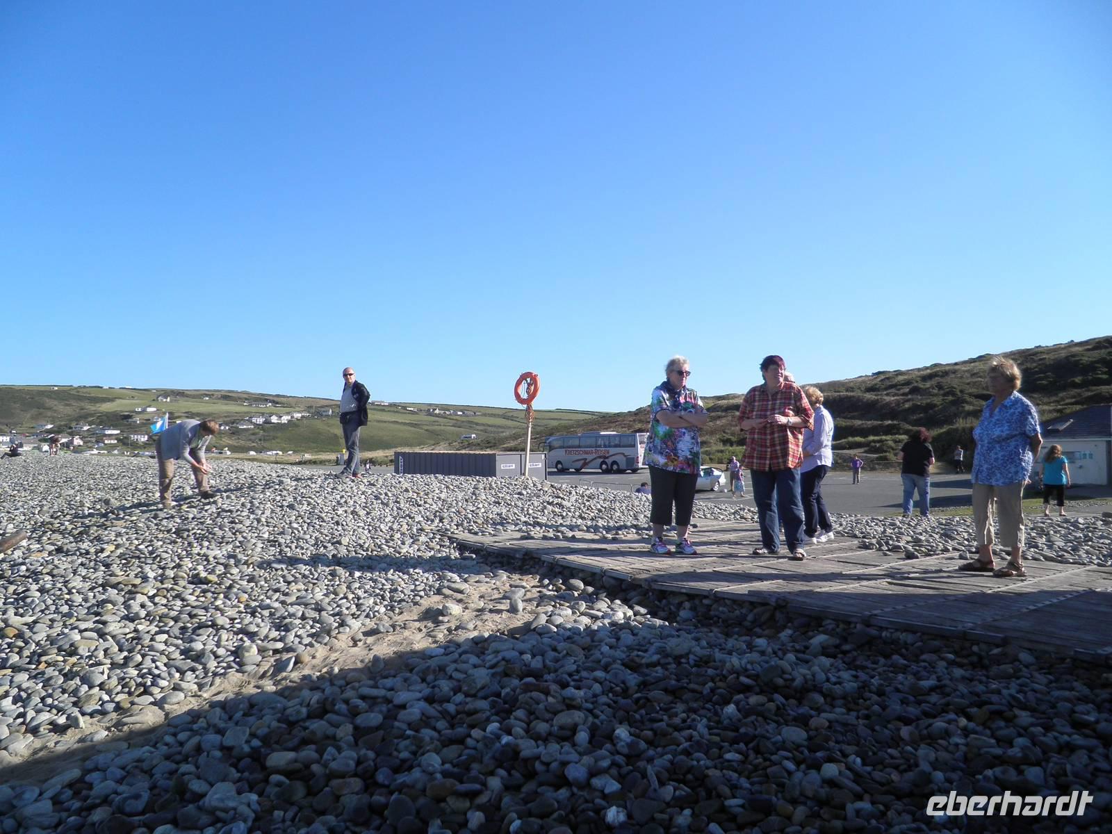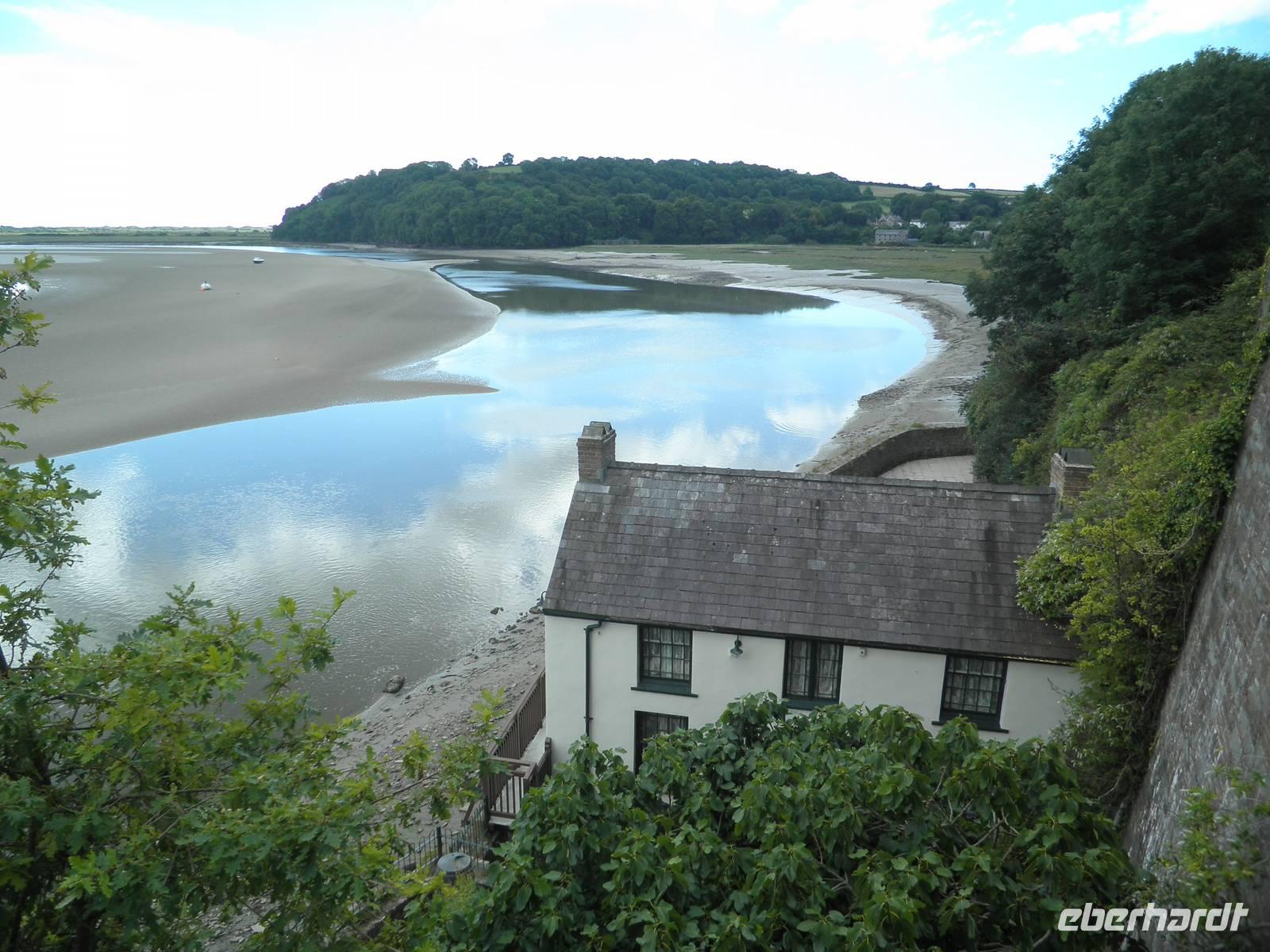 Dieser Morgen empfing uns mit Sonnenschein und so starteten wir in Cardiff. Nach einiger Zeit erreichten wir Swansea, die Stadt an der Südküste von Wales, die gleichzeitig die zweitgrößte walisische Stadt ist. Unser Bus parkte in der Nähe der Marina, und so spazierten wir vorbei an hübschen Segelbooten zur Strandpromenade. Wir suchten Muscheln und genossen den morgendlichen Strand. Hier in diesem Ort war im Jahre 1914 der berühmte walisische Schriftsteller Dylan Thomas geboren worden. In einem Bootshaus über dem Strand von Laugharne verbrachte er die letzten Jahre seines Lebens, das ist ein Dorf nicht weit von Swansea, das auch eine imposante Burgruine zu bieten hat. Hier verbrachten wir unsere Mittagspause. Wir genossen die Wärme der Sommersonne und spazierten am Ufer des Flusses Taff entlang, einige erklommen die Anhöhe bis zum Bootshaus von Dylan Thomas, wo vermutlich große Teile seines Buches "Unter dem Milchald" entstanden sind. Am Nachmittag statteten wir der kleinen Stadt Pembroke einen Besuch ab. Zunächst besichtigten wir das mächtige Castle, hoch über der Hauptstraße des Ortes. Wir bestiegen Rundtürme und sahen eine Höhle, die schon den Normannen im 12. Jahrhundert als Lager und Bootshaus gedient haben soll. Von den Mauern der Burg herab hatten wir einen schönen Blick über die Stadt und die Umgebung. Auf dieser Burg wurde im 15. Jahrhundert der Begründer der Tudor-Dynastie geboren: Heinrich VII.
